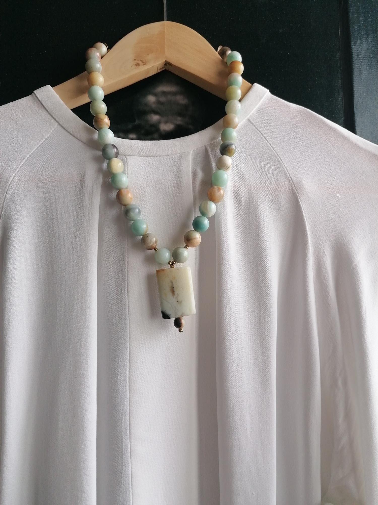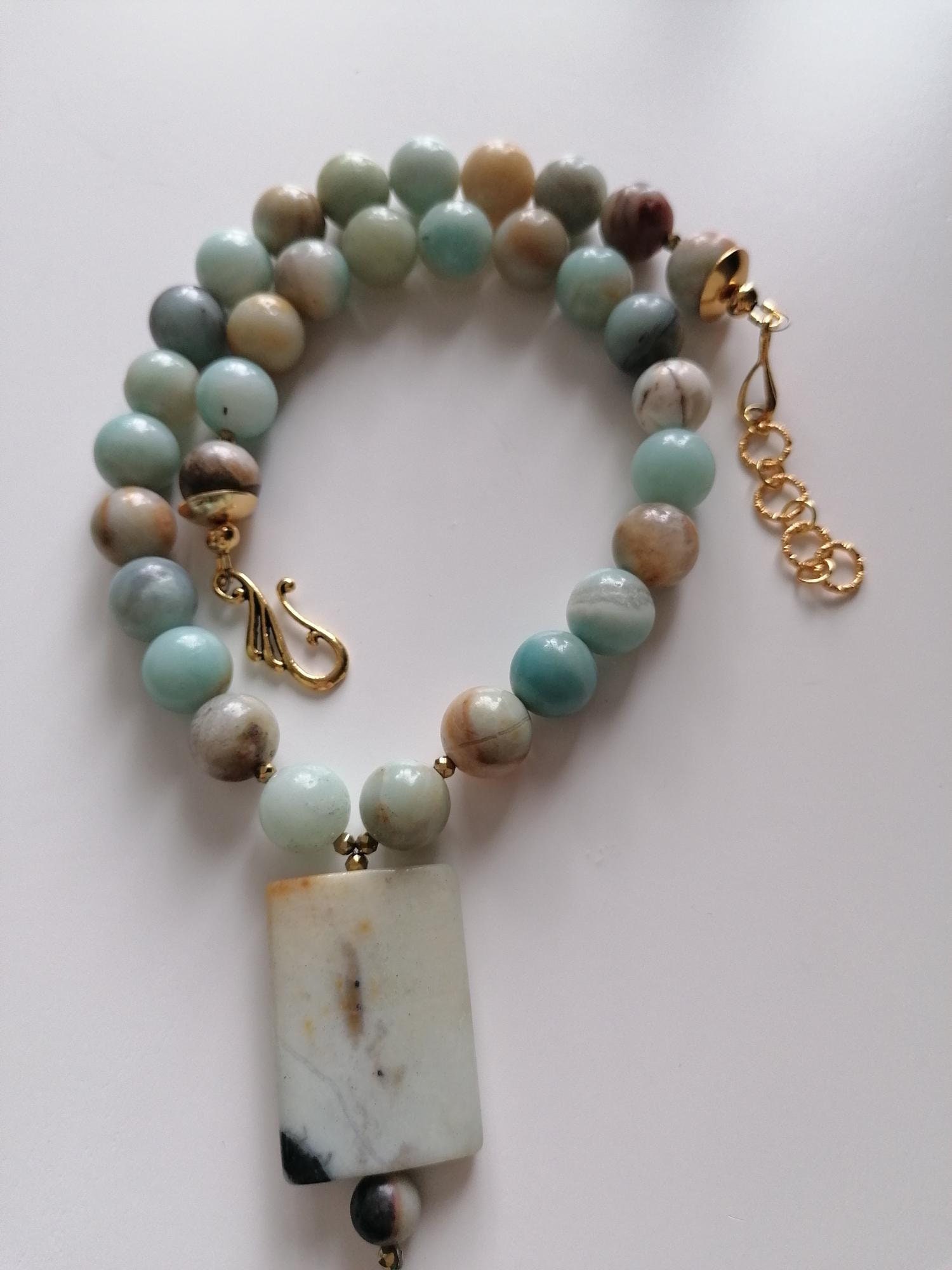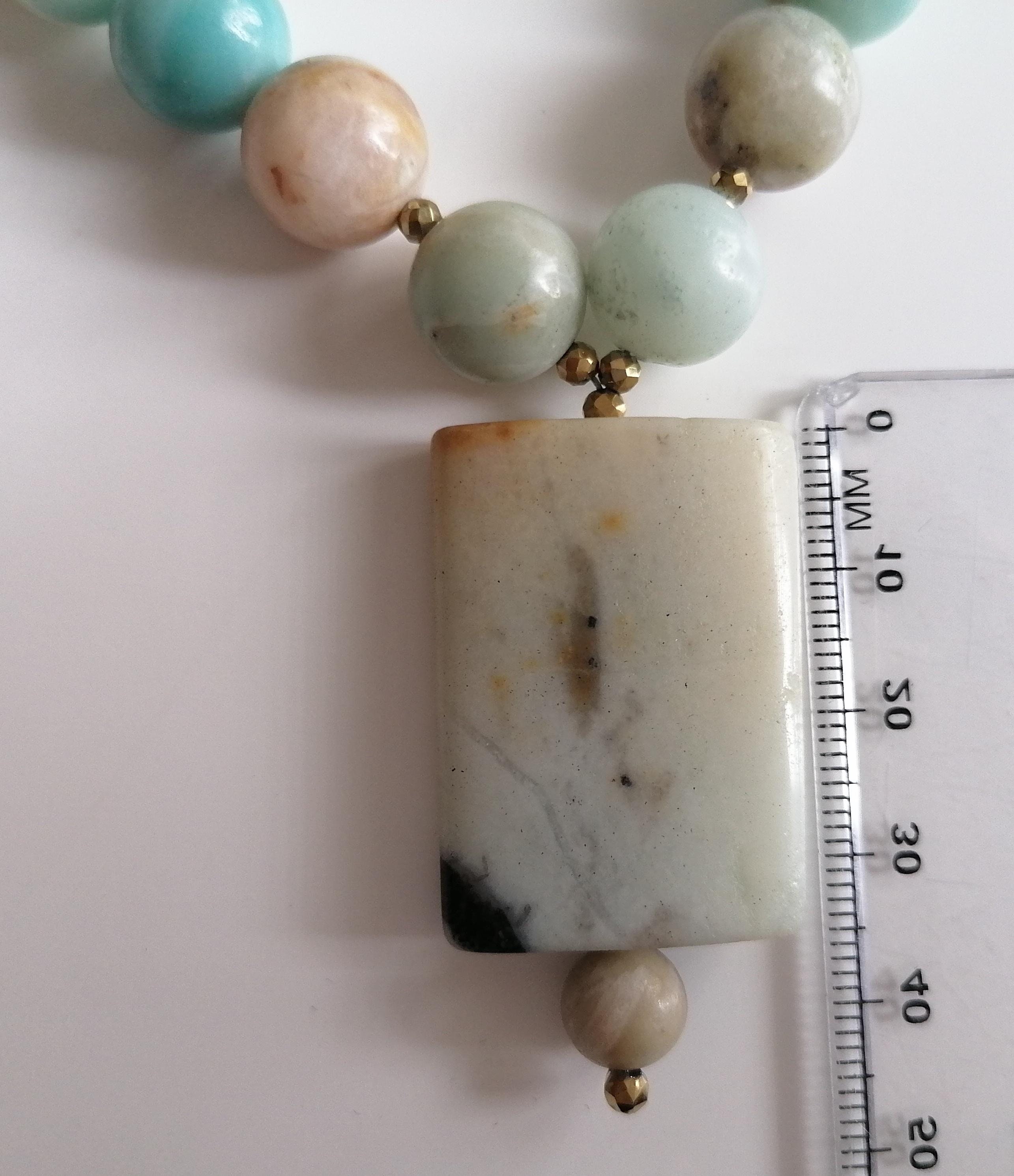 The amazonite necklace comes in light blue, beige, and gray. This statement necklace features a 45 mm rectangular pendant (rectangular bead 35 mm x 25 mm x 13 mm) made from round amazonite beads (12 mm, 8 mm) and round faceted spinel beads in gold (3 mm). The necklace is approximately 46.5 cm long, plus an extension chain. The necklace clasp, bead caps, and extension chain are gold-plated. A lovely gift!