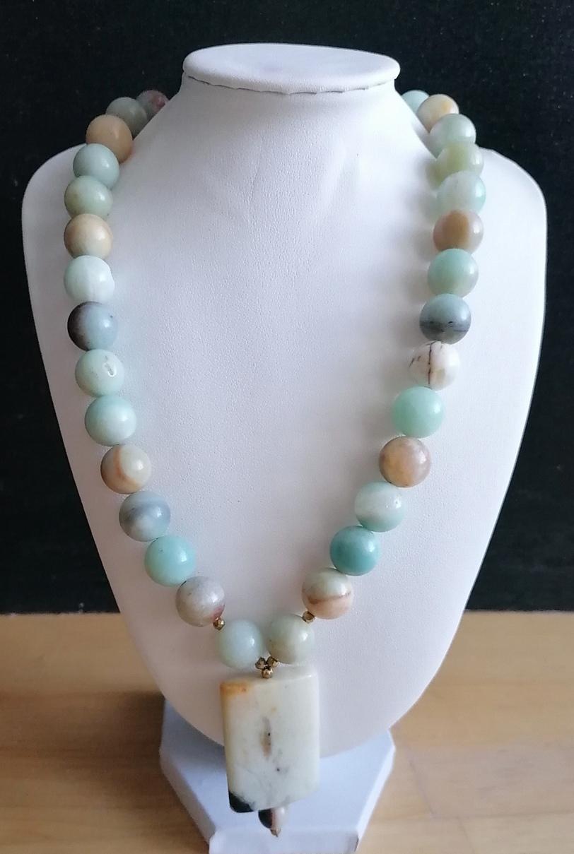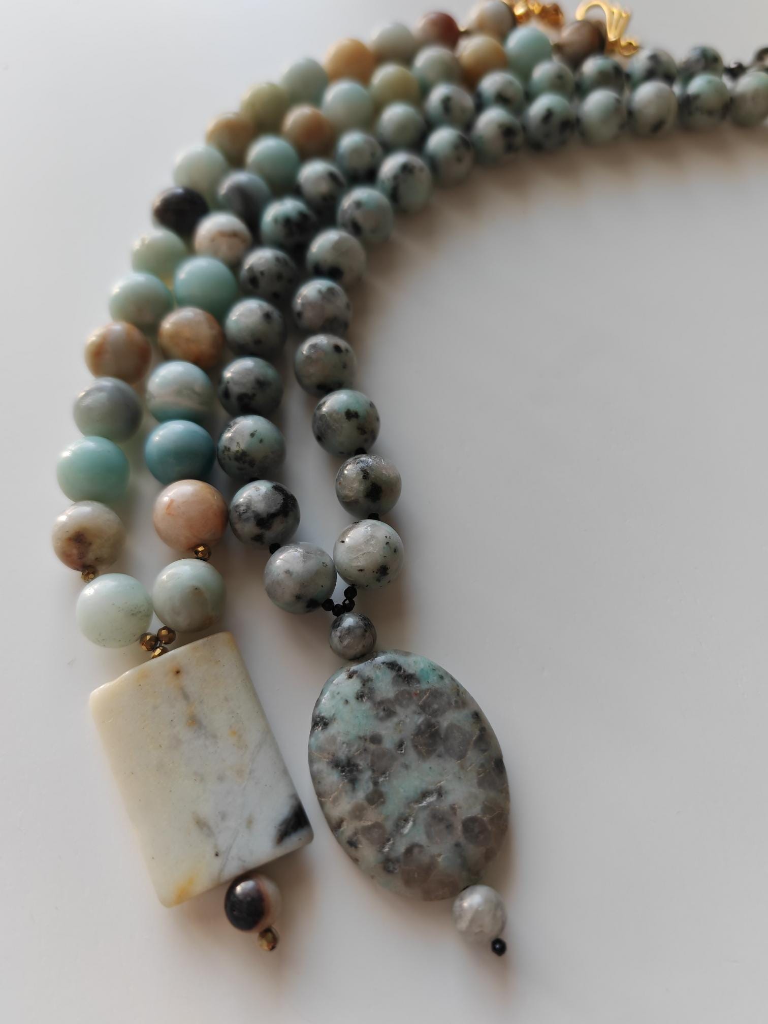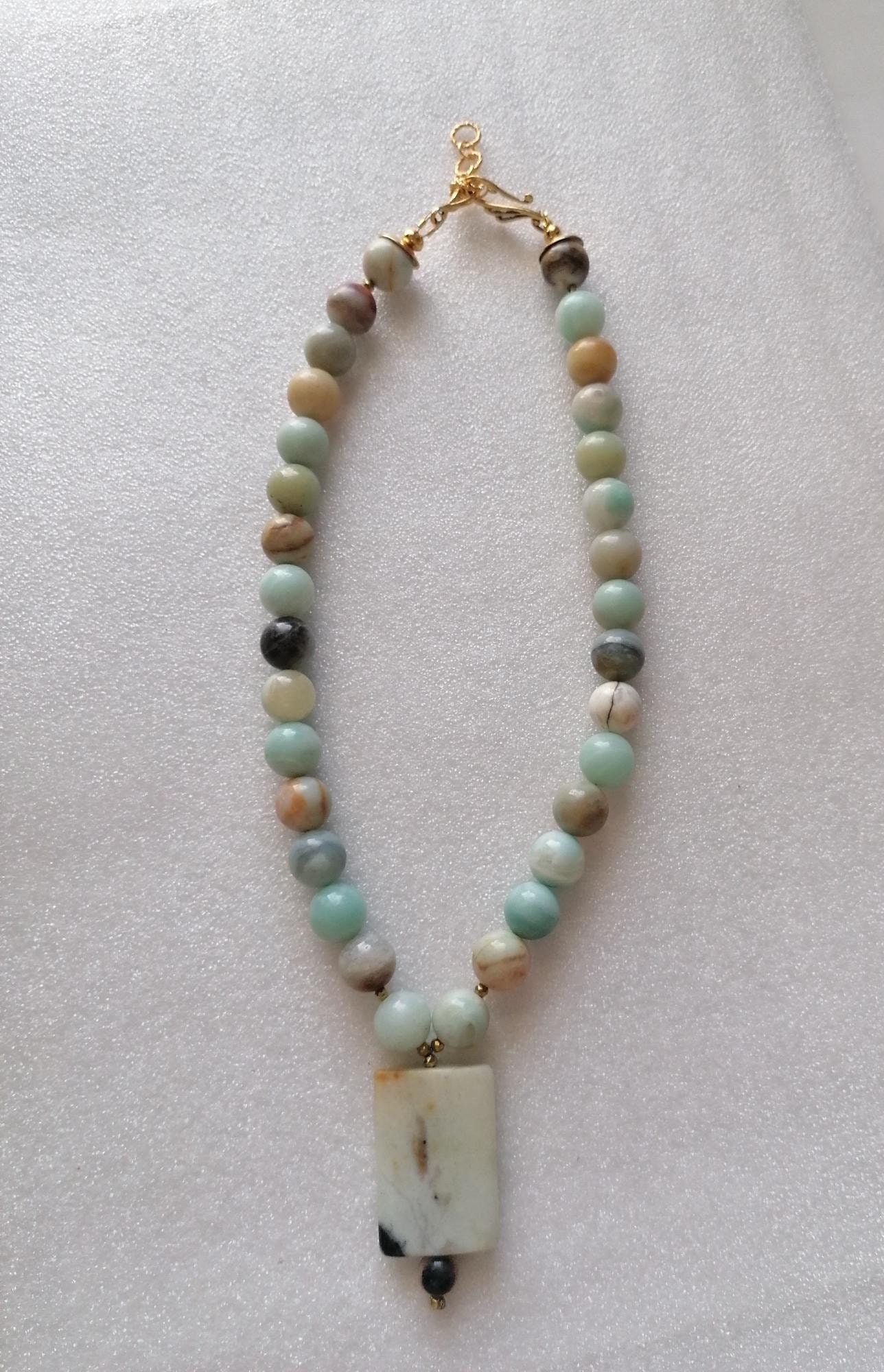 The amazonite necklace comes in light blue, beige, and gray. This statement necklace features a 45 mm rectangular pendant (rectangular bead 35 mm x 25 mm x 13 mm) made from round amazonite beads (12 mm, 8 mm) and round faceted spinel beads in gold (3 mm). The necklace is approximately 46.5 cm long, plus an extension chain. The necklace clasp, bead caps, and extension chain are gold-plated. A lovely gift!