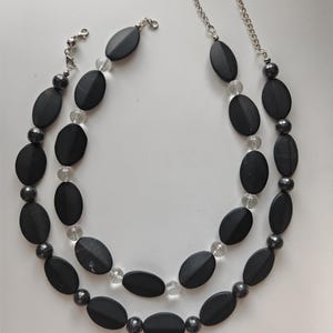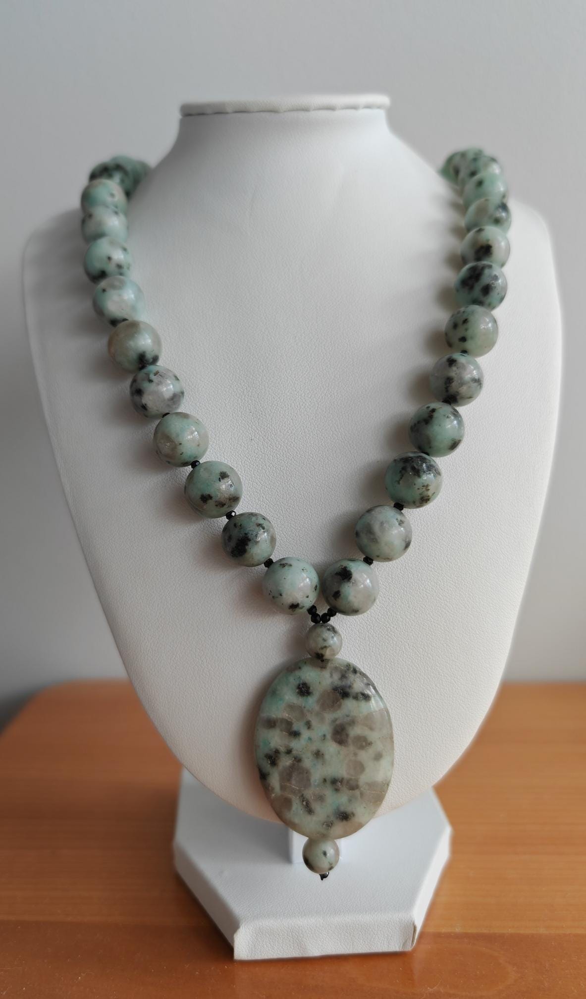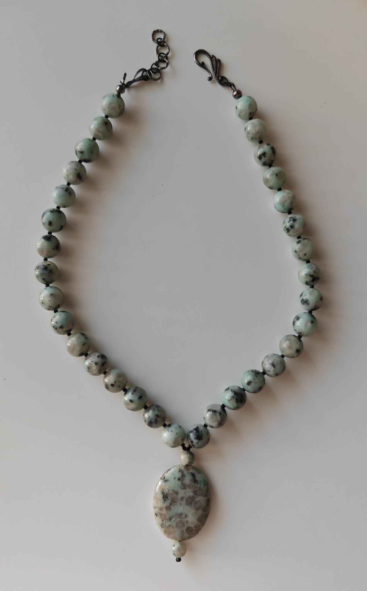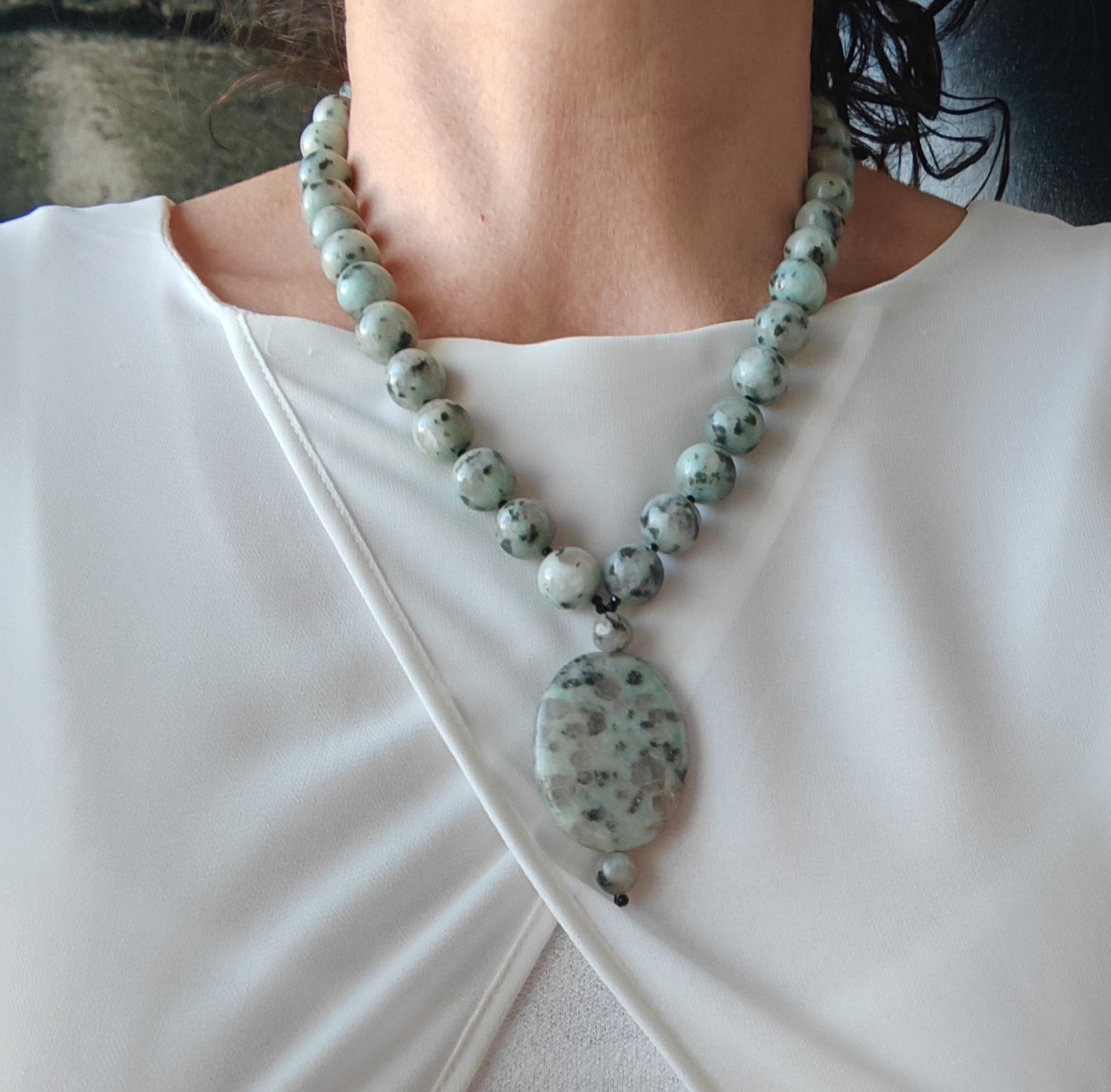 The sesame kiwi jasper necklace is light blue and black. The statement necklace features a 55 mm oval pendant (oval bead 38 mm x 30 mm x 8 mm) and is made of round pearls (12 mm, 8 mm) and round faceted black spinel beads (2 mm). The necklace is approximately 49 cm long, plus an extension chain. The clasp and extension chain are black.