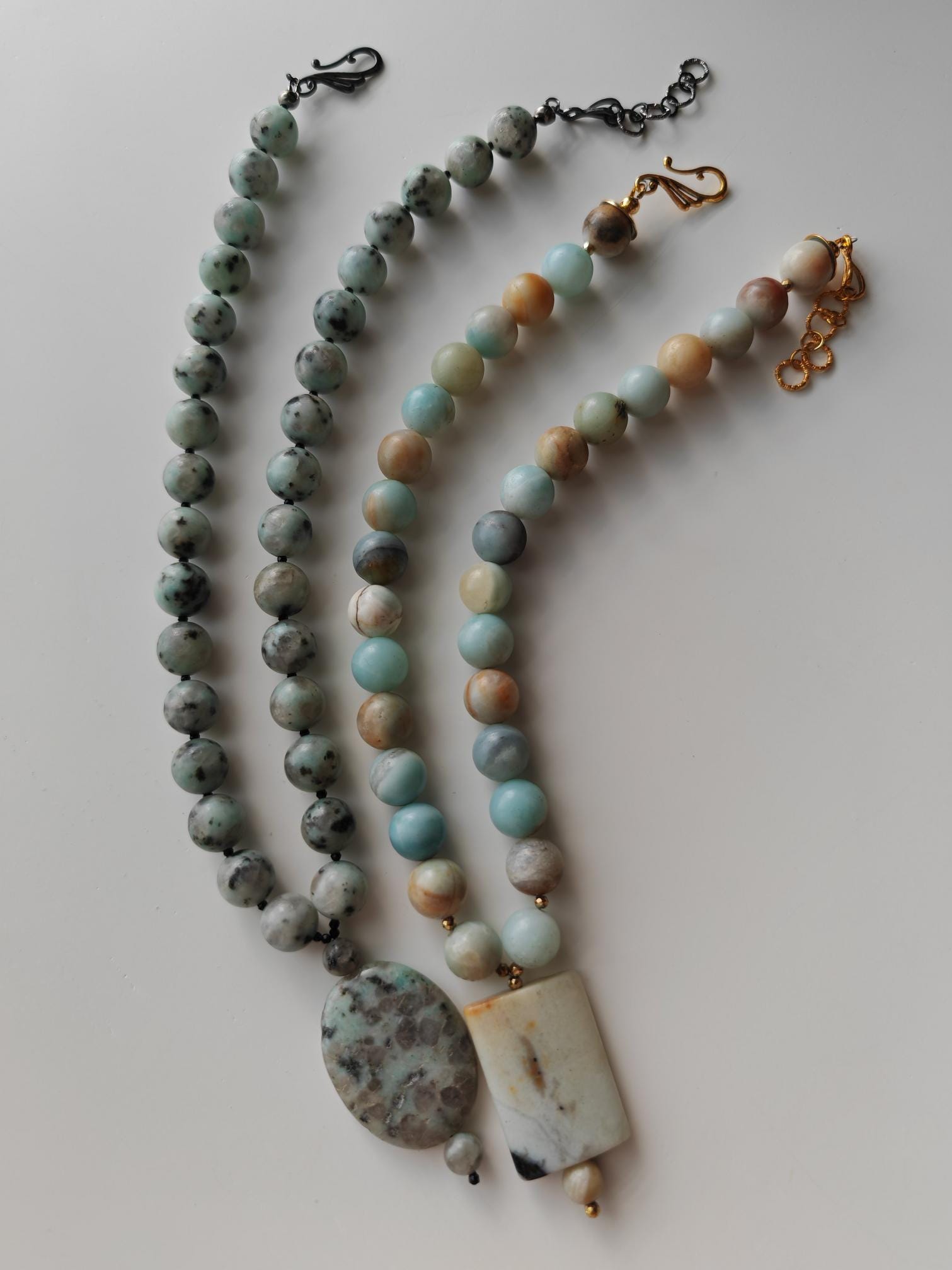 Handmade necklaces with large pendants in light blue. Two chain options available.