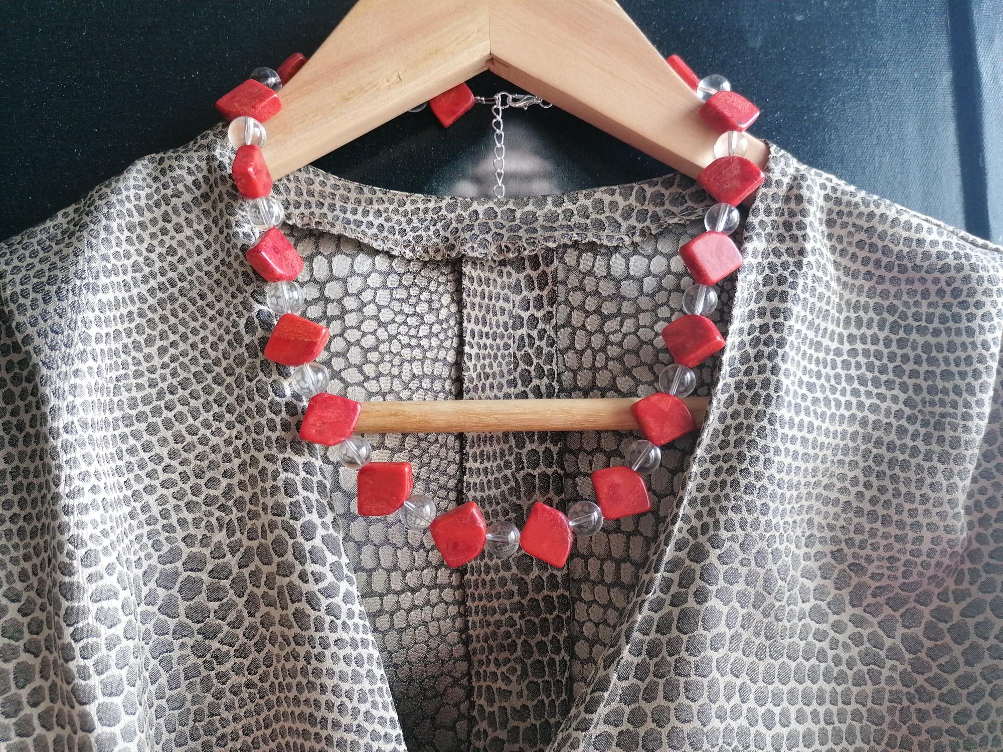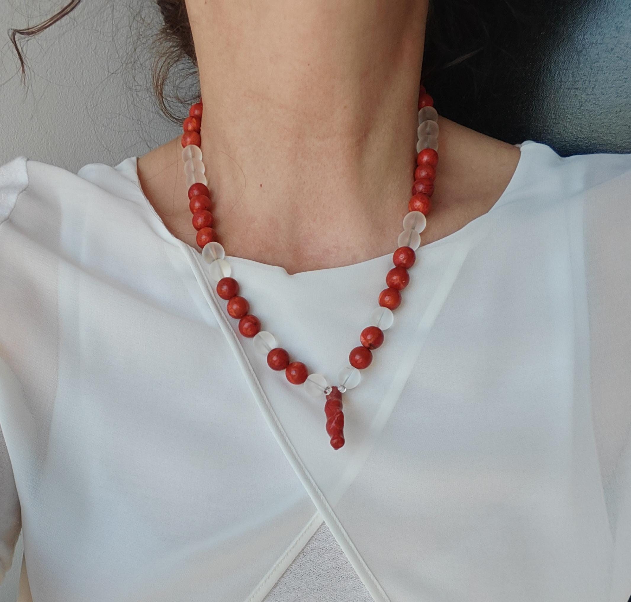 The necklace with coral pendant is 48.5 cm long plus a 5 cm extender. The necklace is made of round foam coral beads and matte rock crystal beads (10 mm). The branch-shaped coral pendant is approximately 40 mm long and approximately 5-11 mm wide. The necklace clasp and extender are silver. A lovely gift.