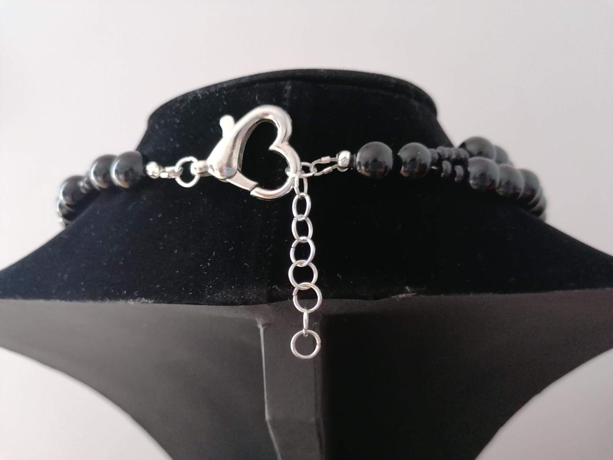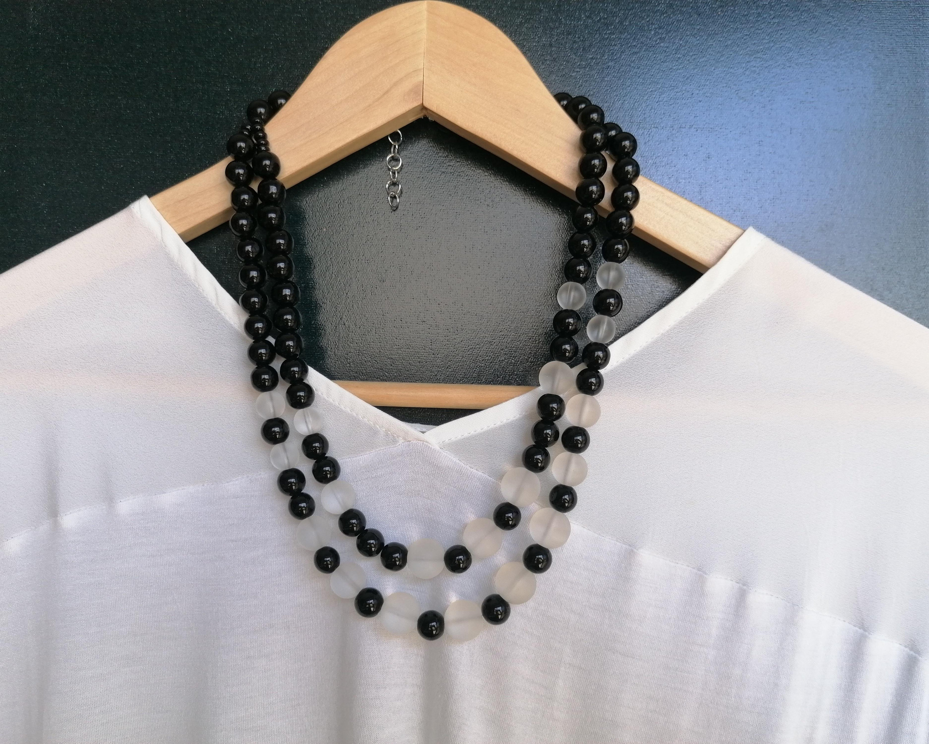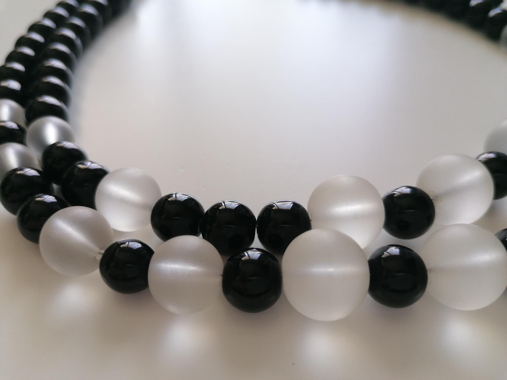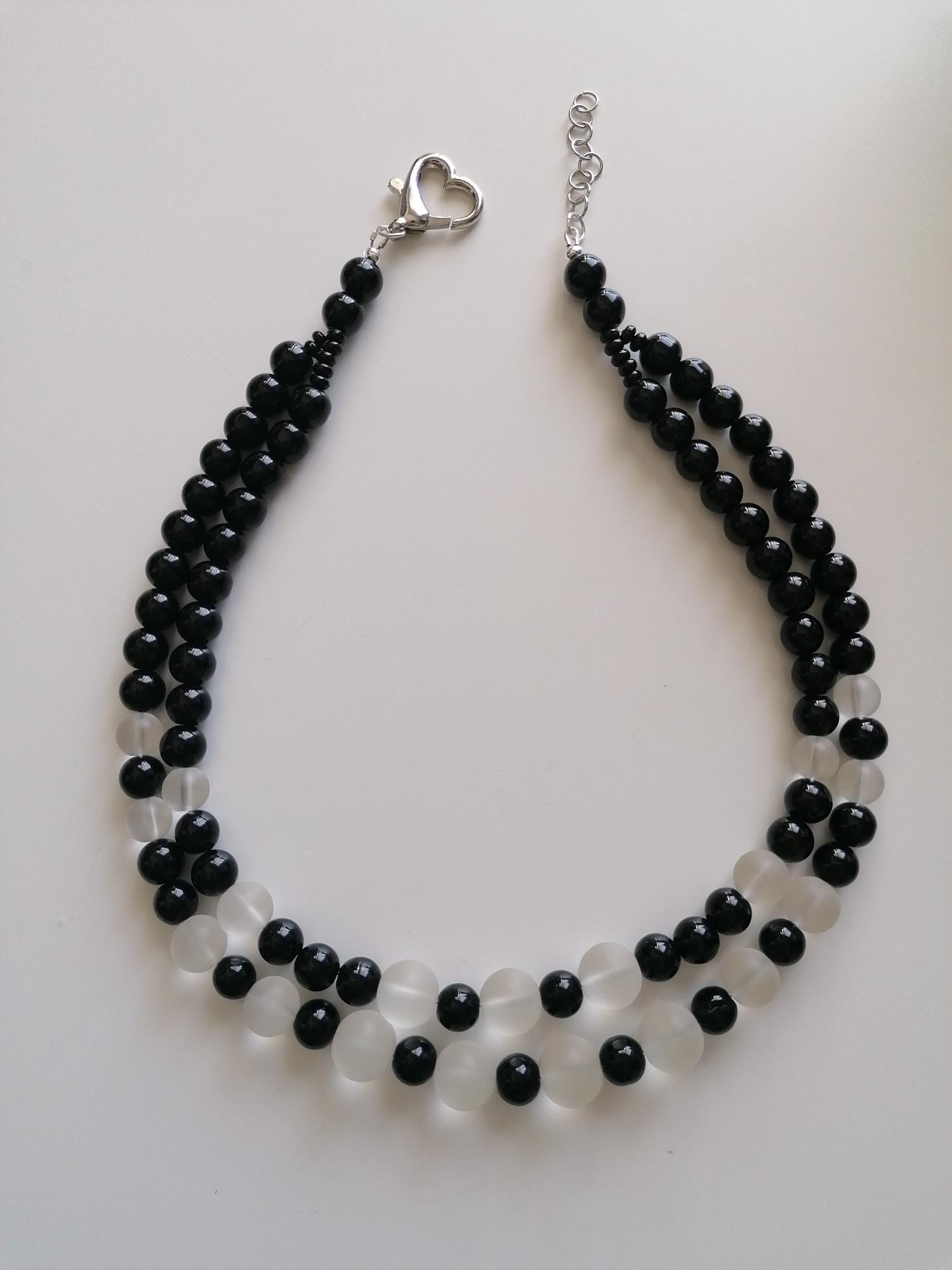 This two-tone necklace made of onyx and rock crystal is approximately 51 cm long, plus an extension chain. The elegant statement necklace is crafted from round, black onyx beads (high-gloss, 10 mm) and matte rock crystal beads (10 mm, 12 mm, 14 mm). It features a large heart-shaped clasp. The clasp and extension chain are silver-colored.