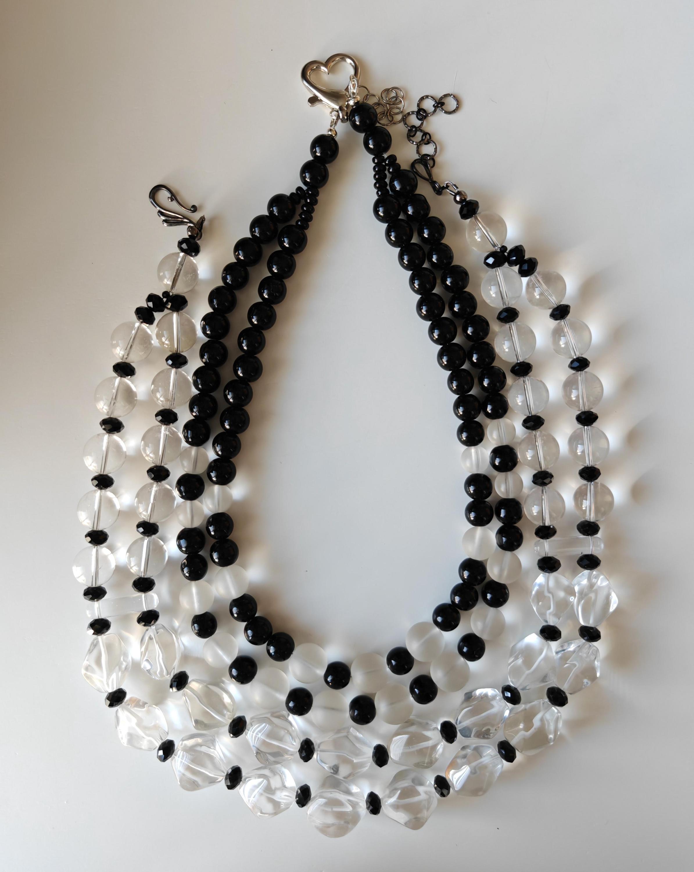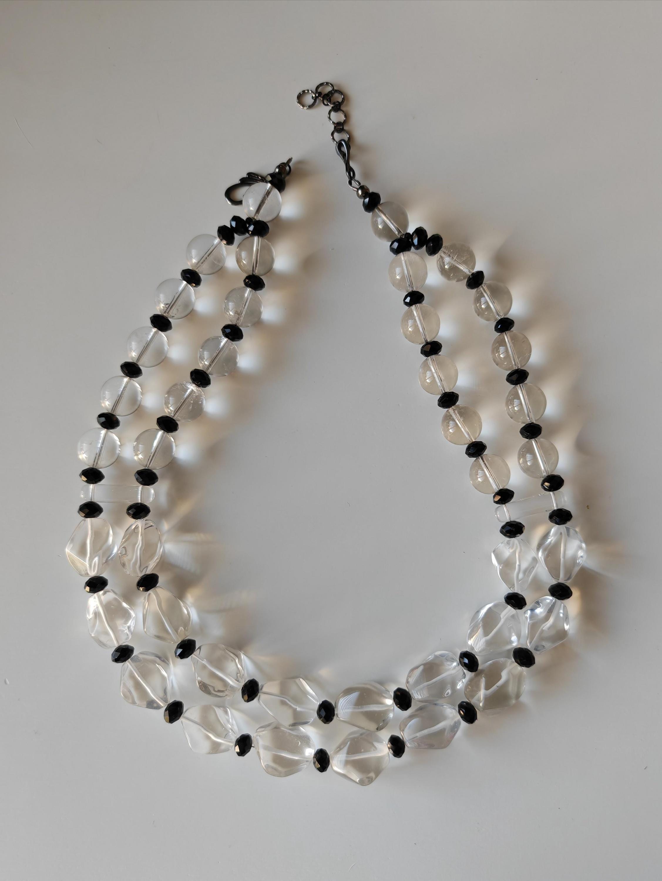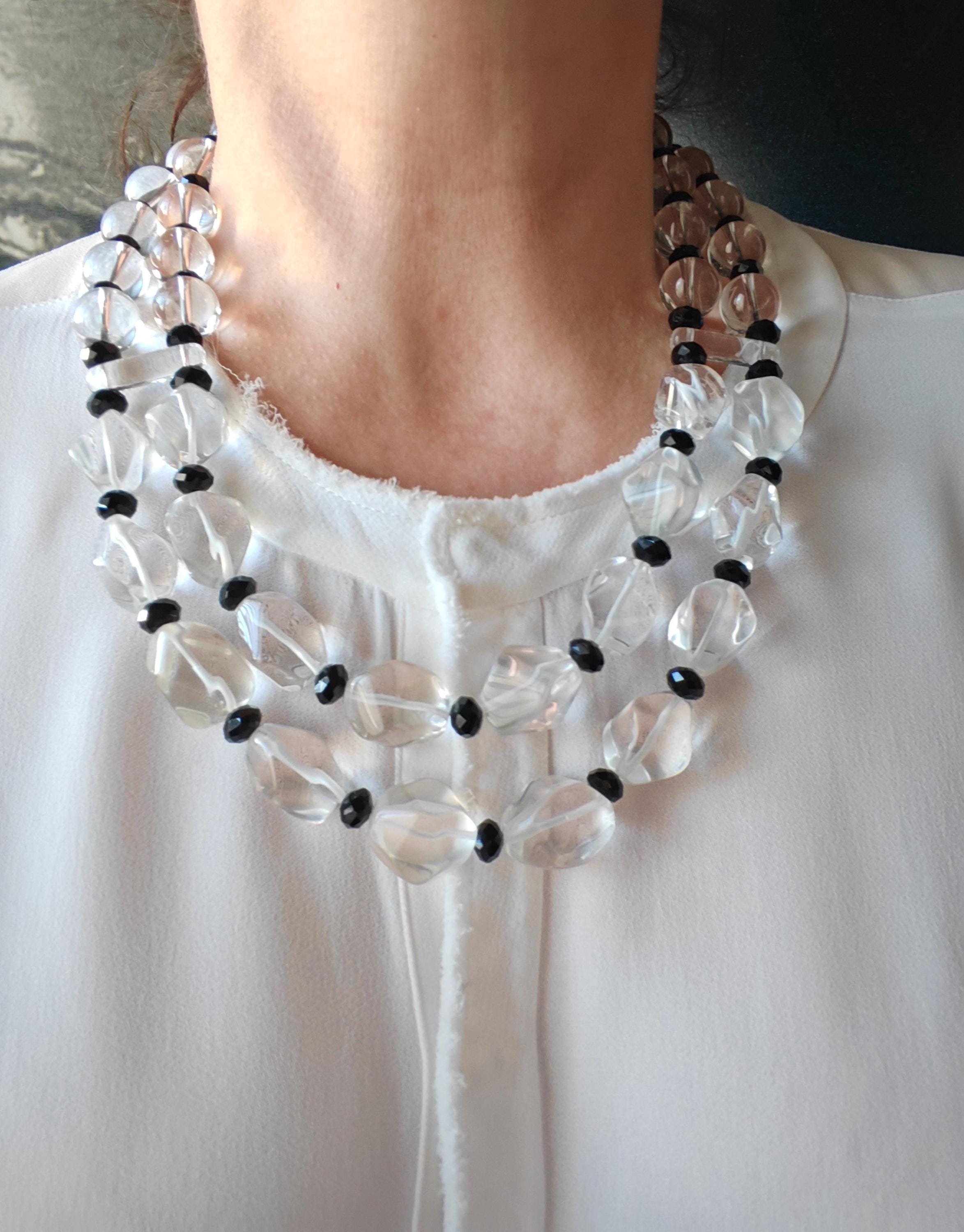 This opulent rock crystal necklace is 54 cm long, plus an extension chain. The statement necklace is crafted from rock crystal beads (faceted polygonal beads 20-23 mm - 16-18 mm and clear round beads 14 mm) and black faceted glass beads (8 mm x 5 mm). The spacers are made of clear glass. The S-shaped clasp and chain are black. Elegant and timeless. Great gift.