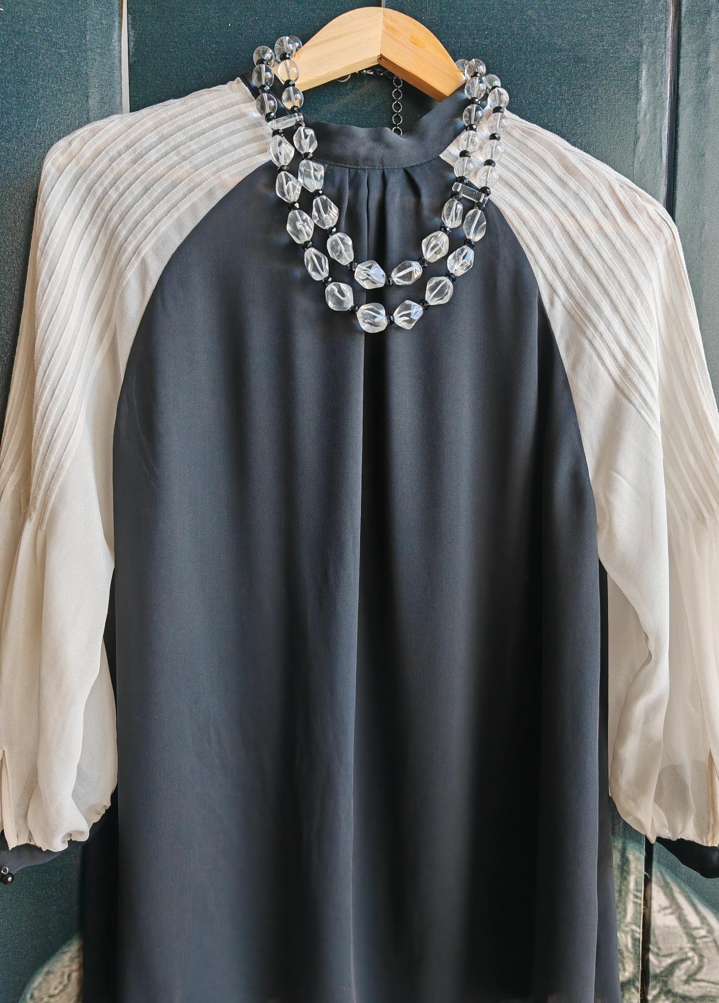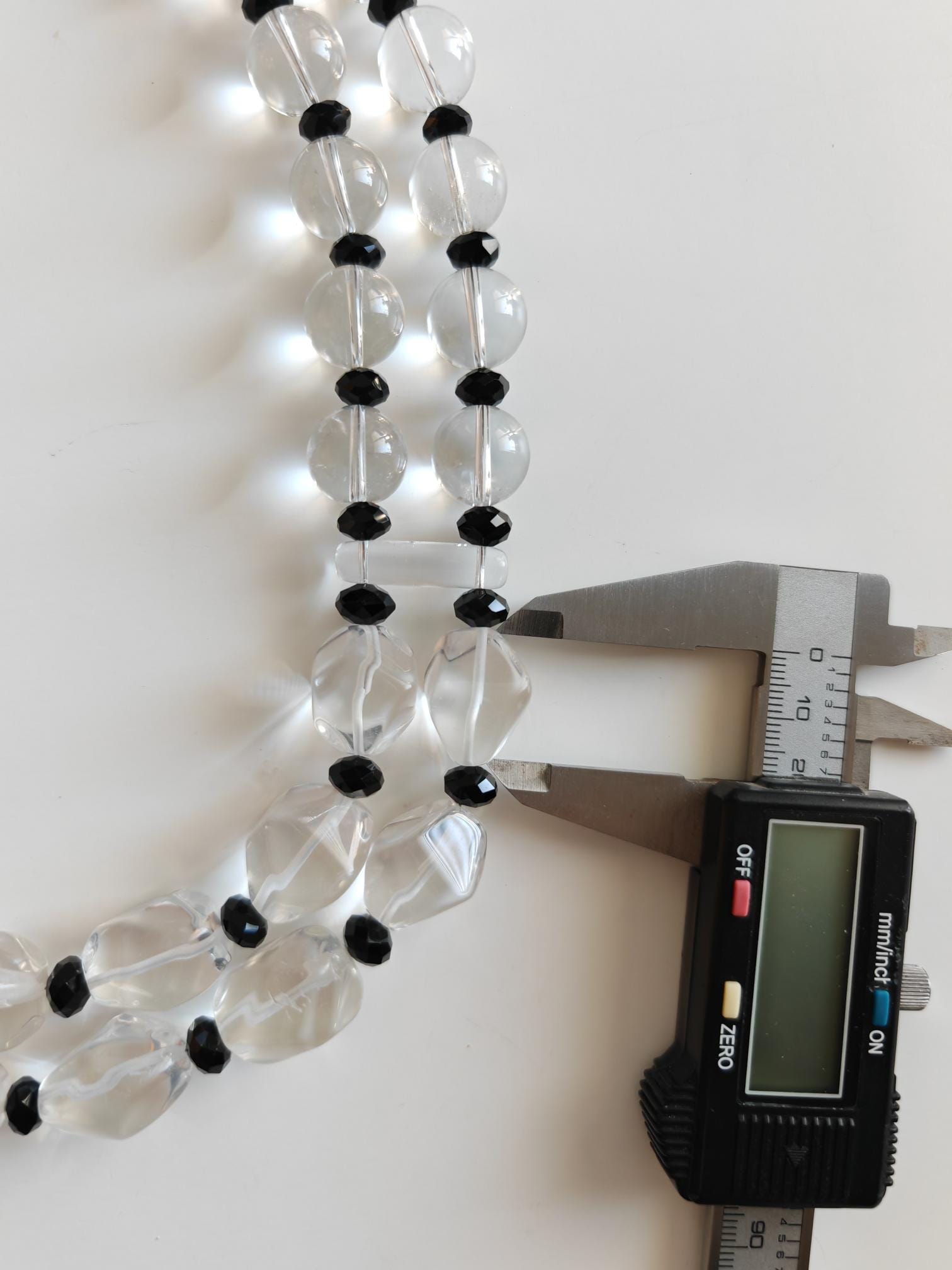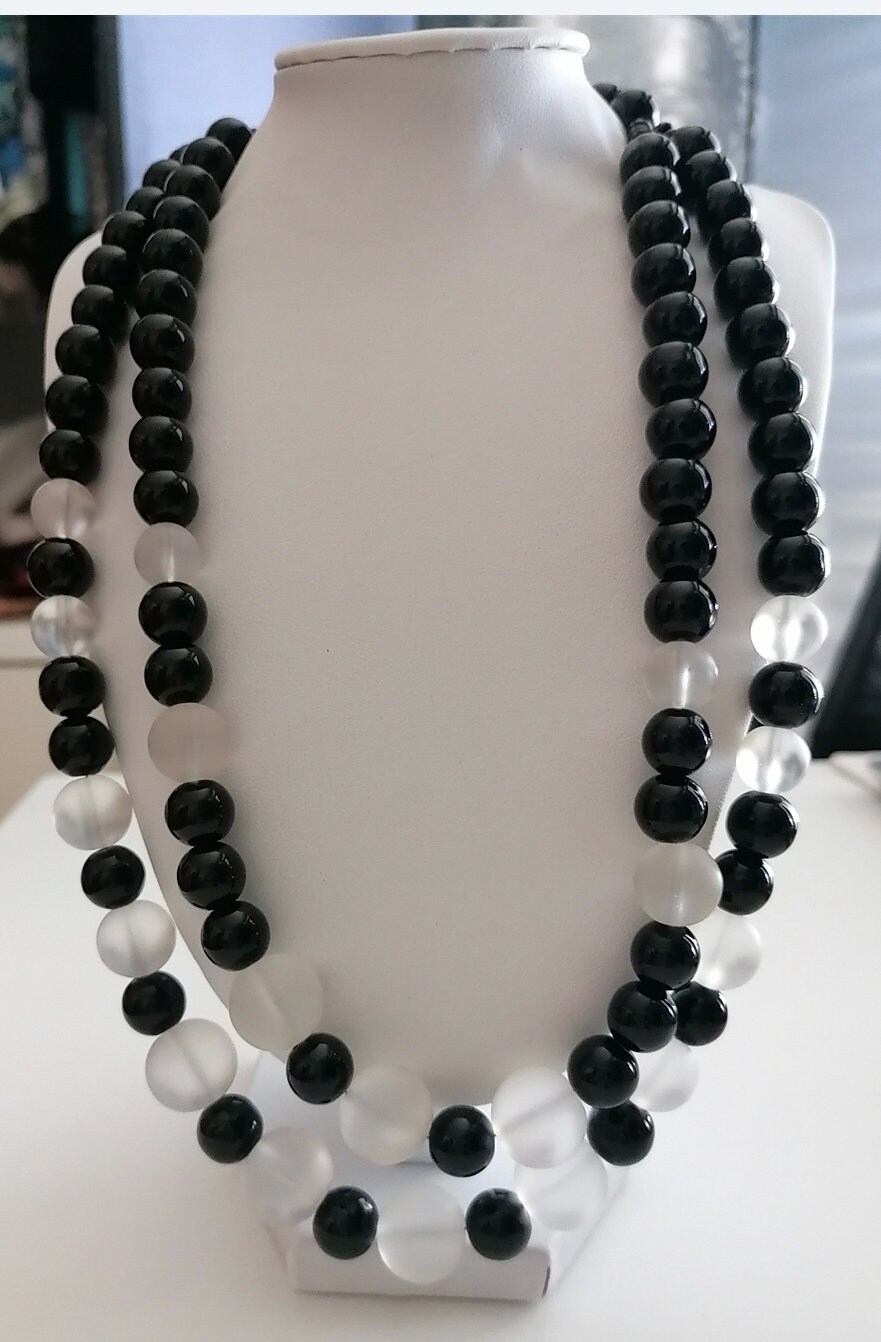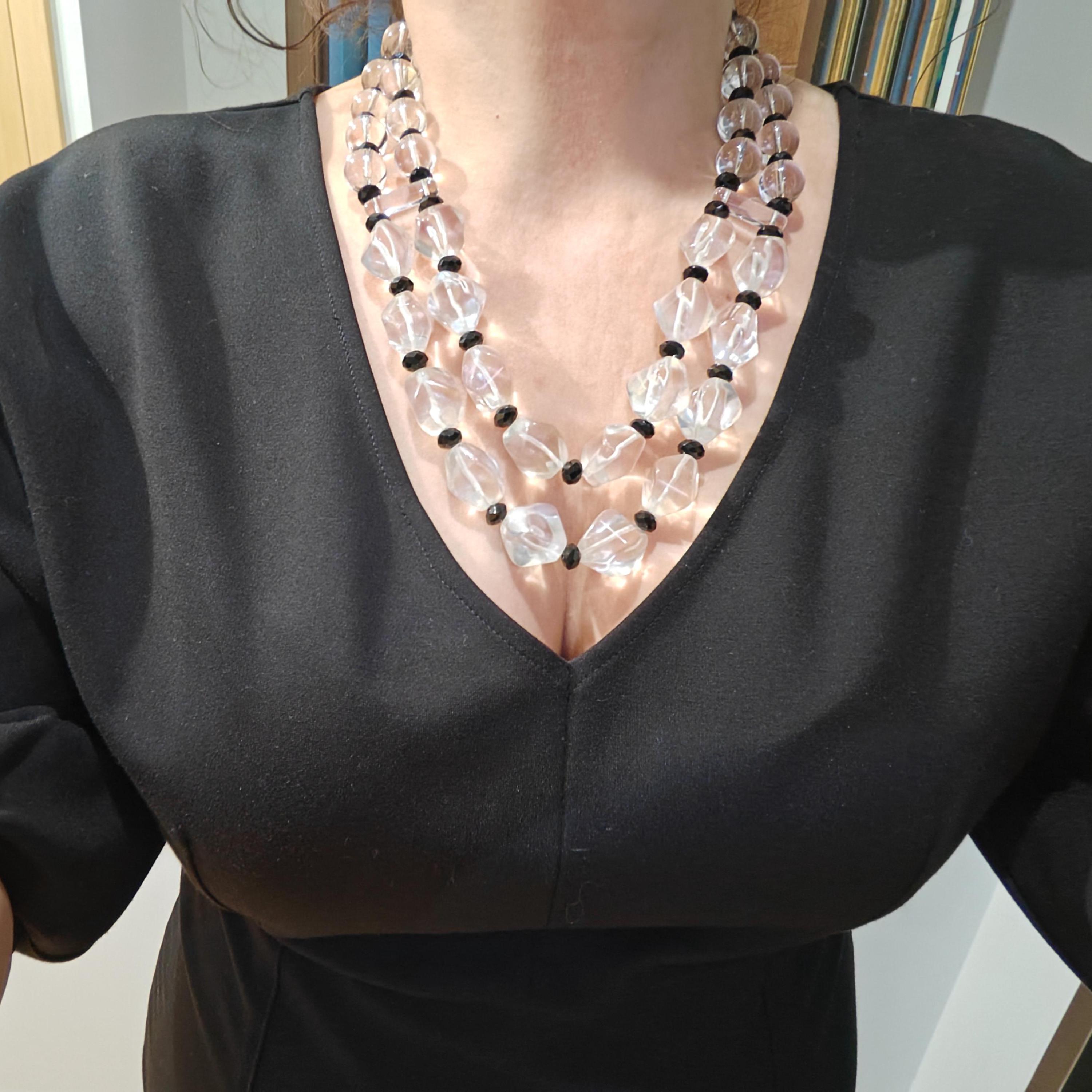 This opulent rock crystal necklace is 54 cm long, plus an extension chain. The statement necklace is crafted from rock crystal beads (faceted polygonal beads 20-23 mm - 16-18 mm and clear round beads 14 mm) and black faceted glass beads (8 mm x 5 mm). The spacers are made of clear glass. The S-shaped clasp and chain are black. Elegant and timeless. Great gift.