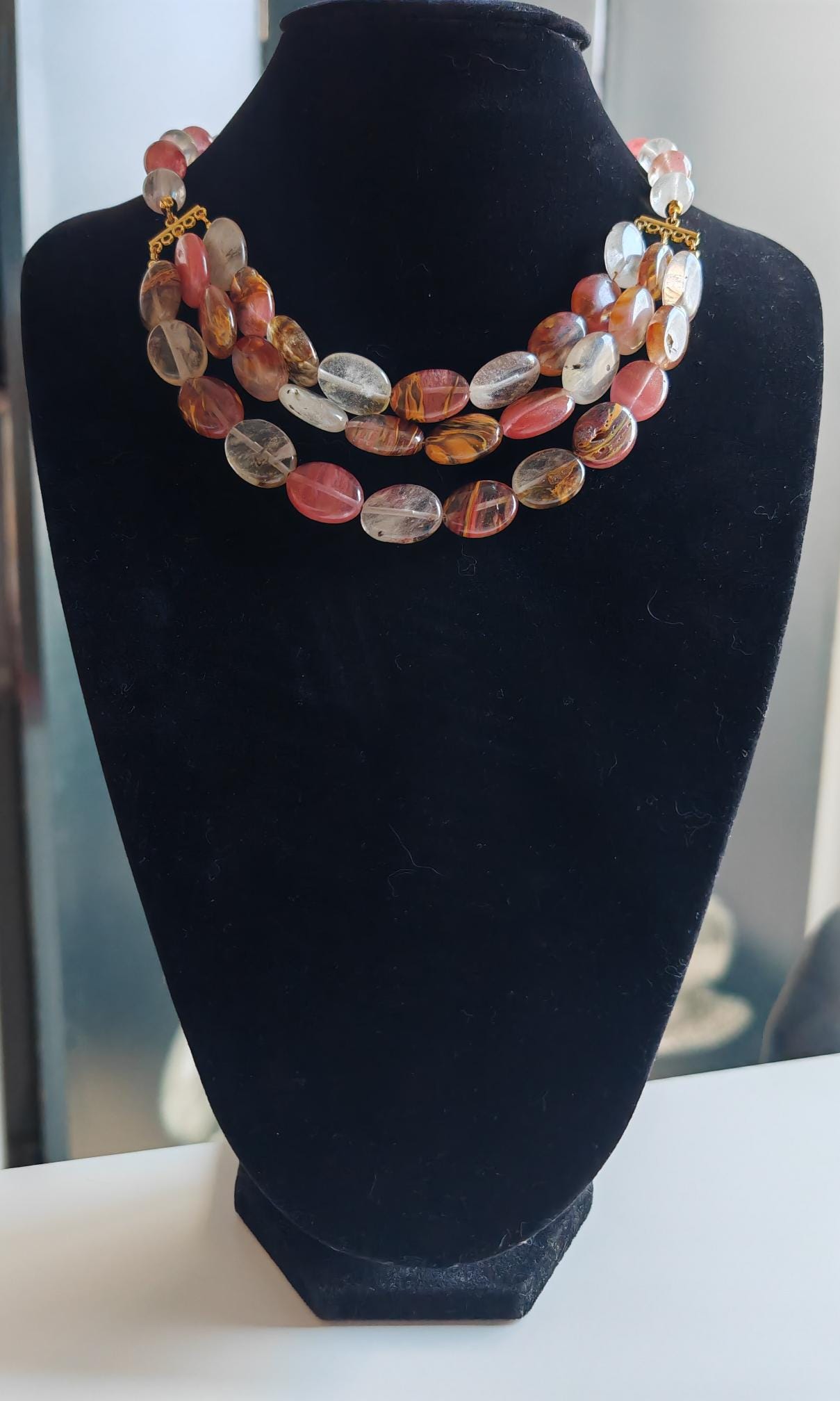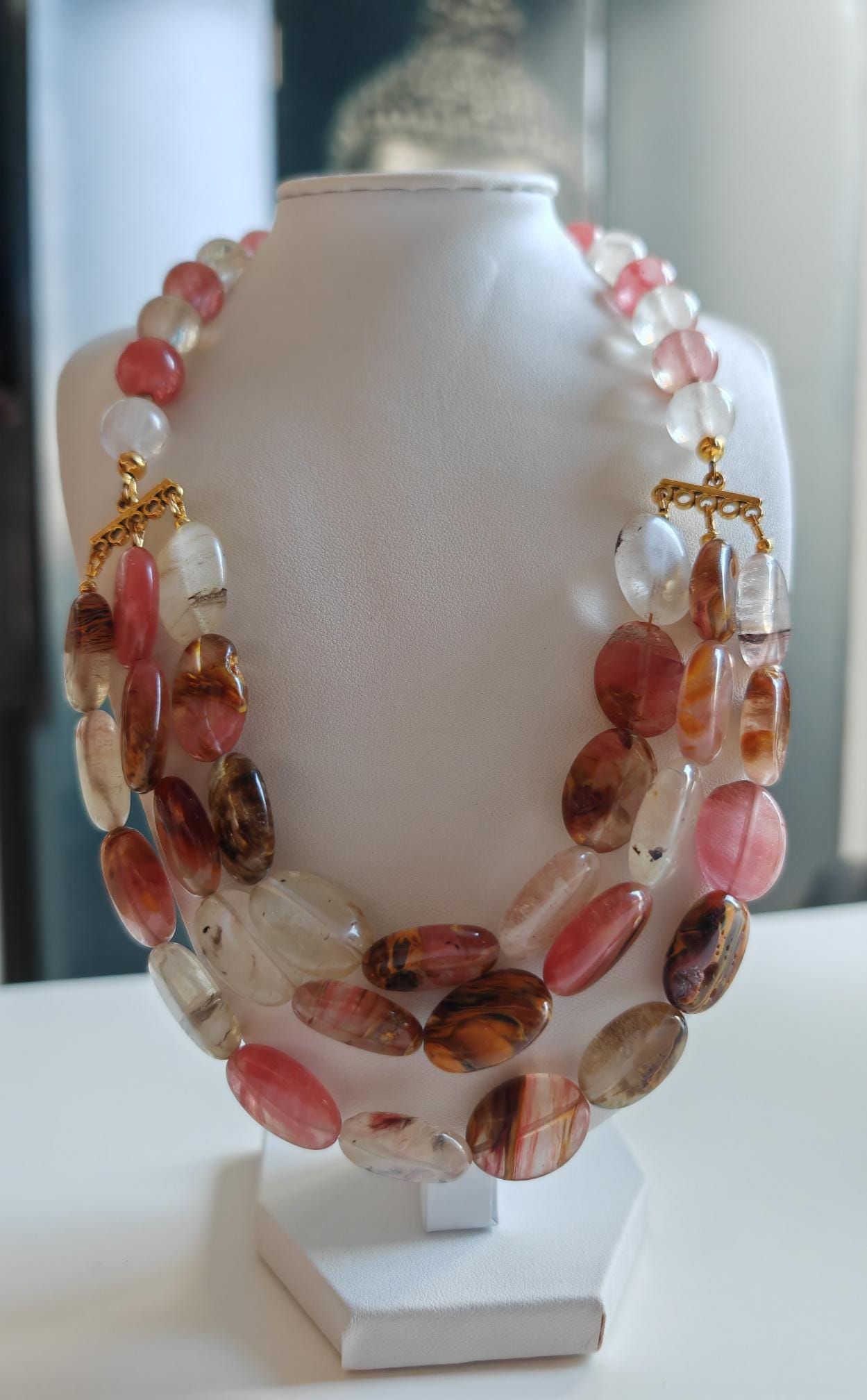 This multicolored, three-strand necklace in delicate shades (pink, beige, clear, and brown) is crafted from clear round beads (12 mm cherry quartz and 20 mm x 11 mm x 7 mm oval beads) and faceted gold-plated spinel beads (3 mm). The clasp, extension chain, bead caps, and dividers are all gold. Beautiful, soft sorbet colors. A wonderful gift.