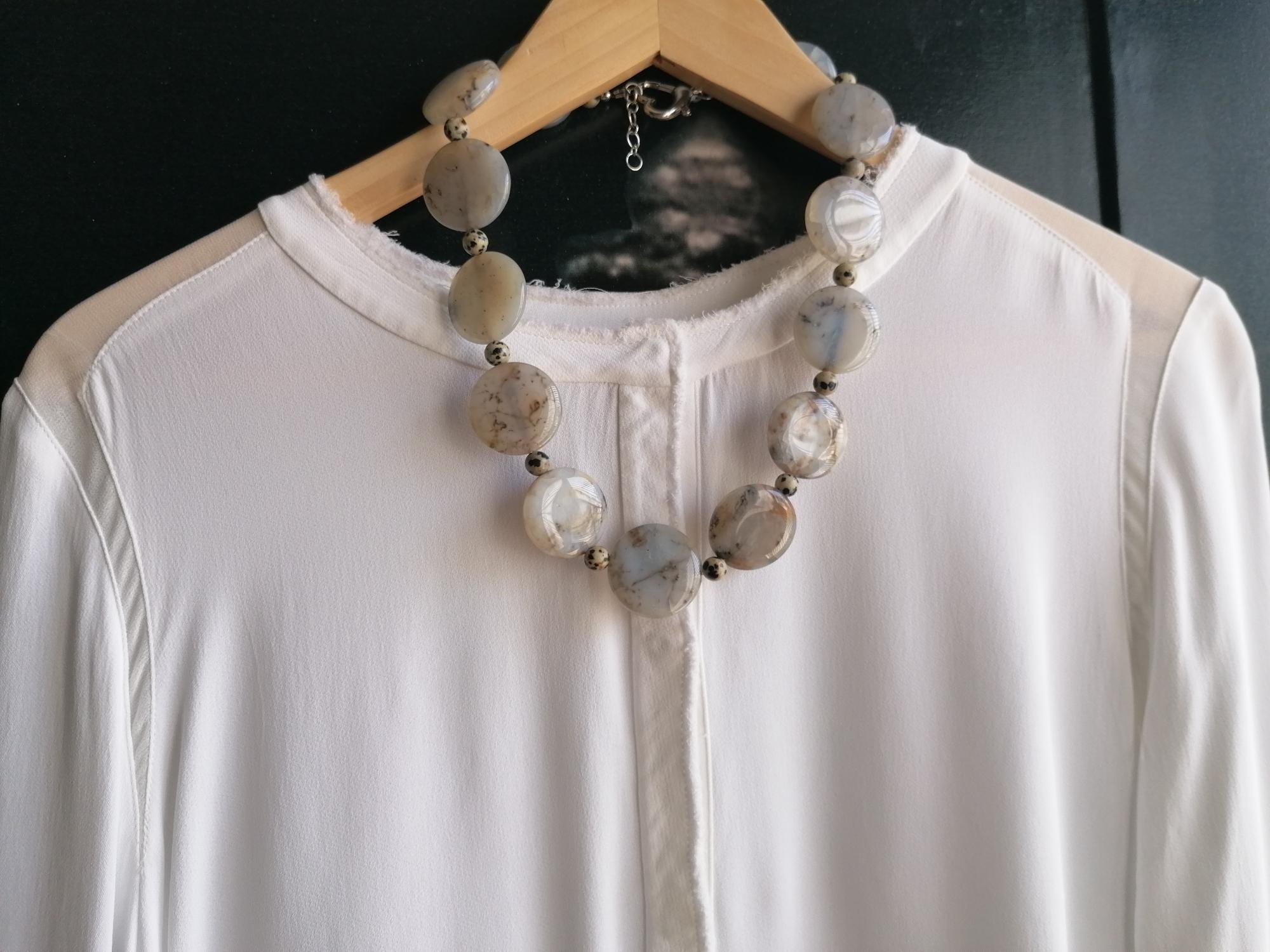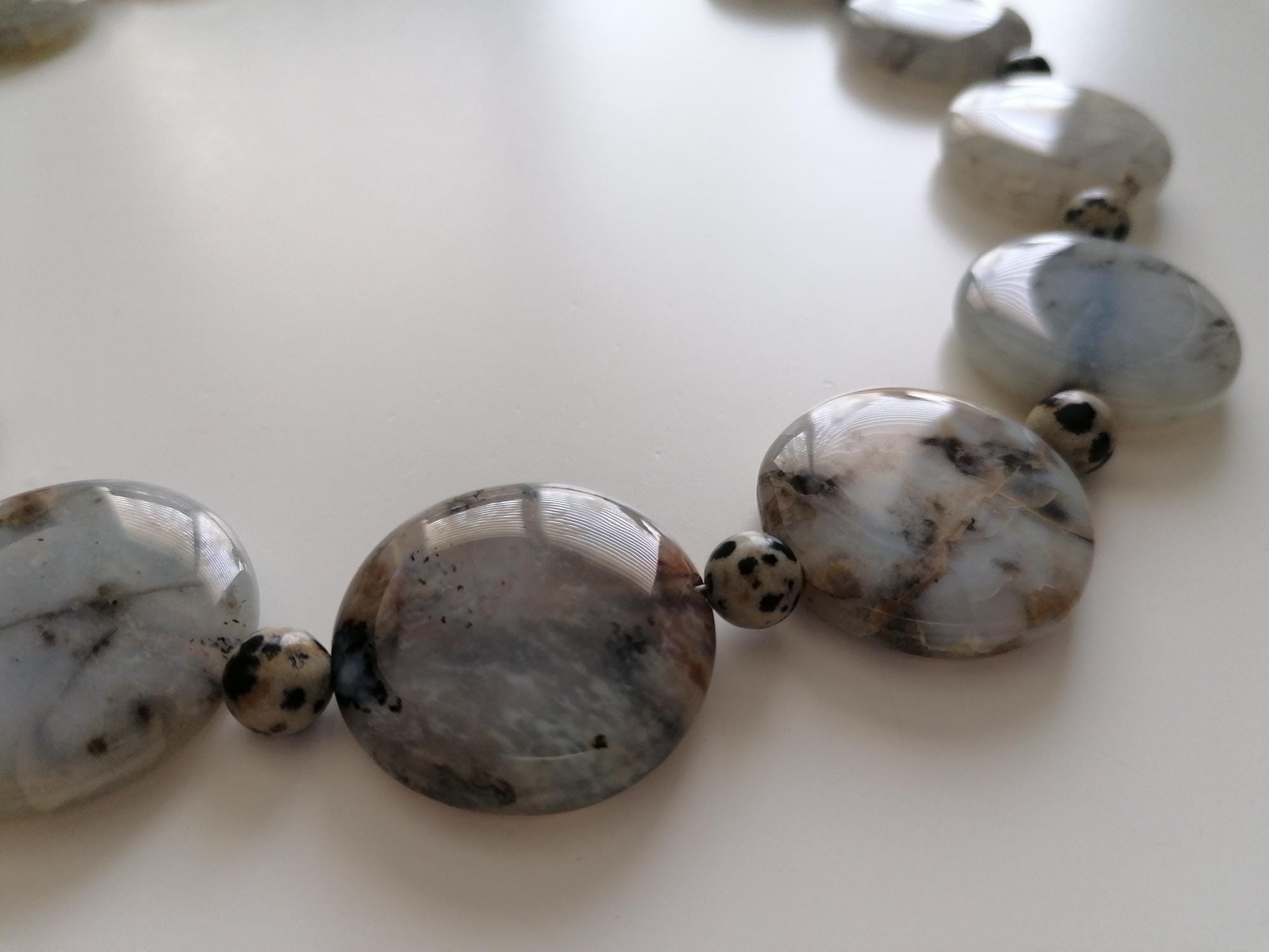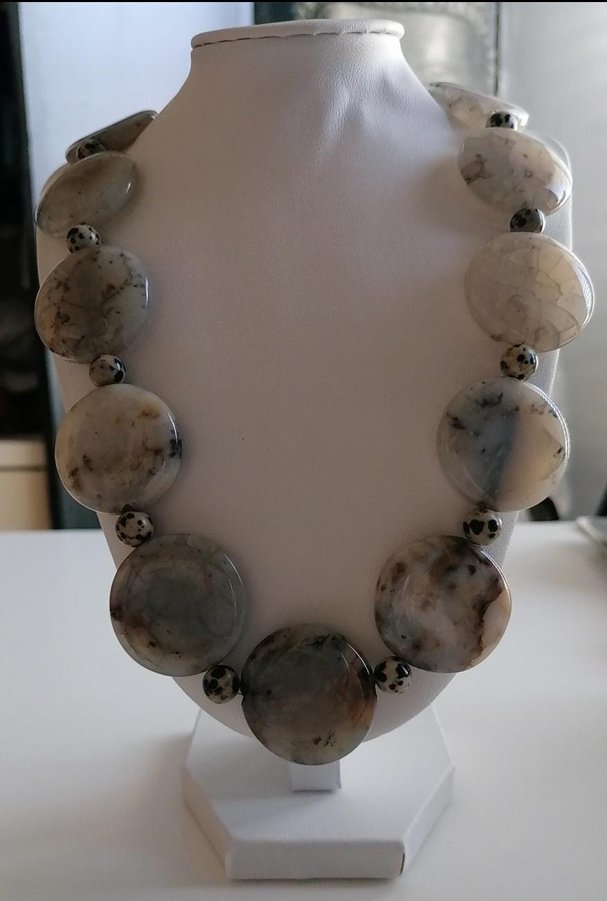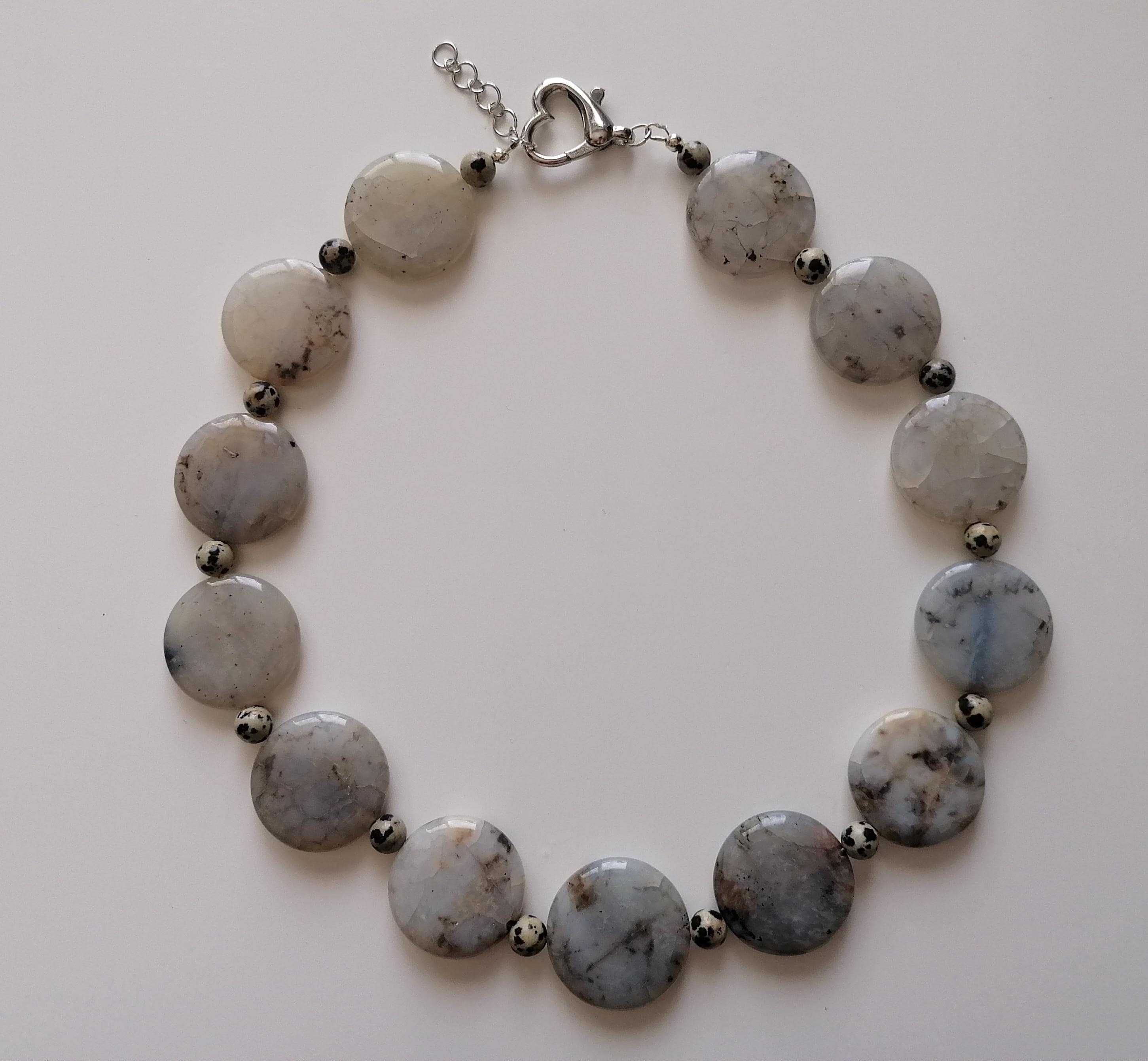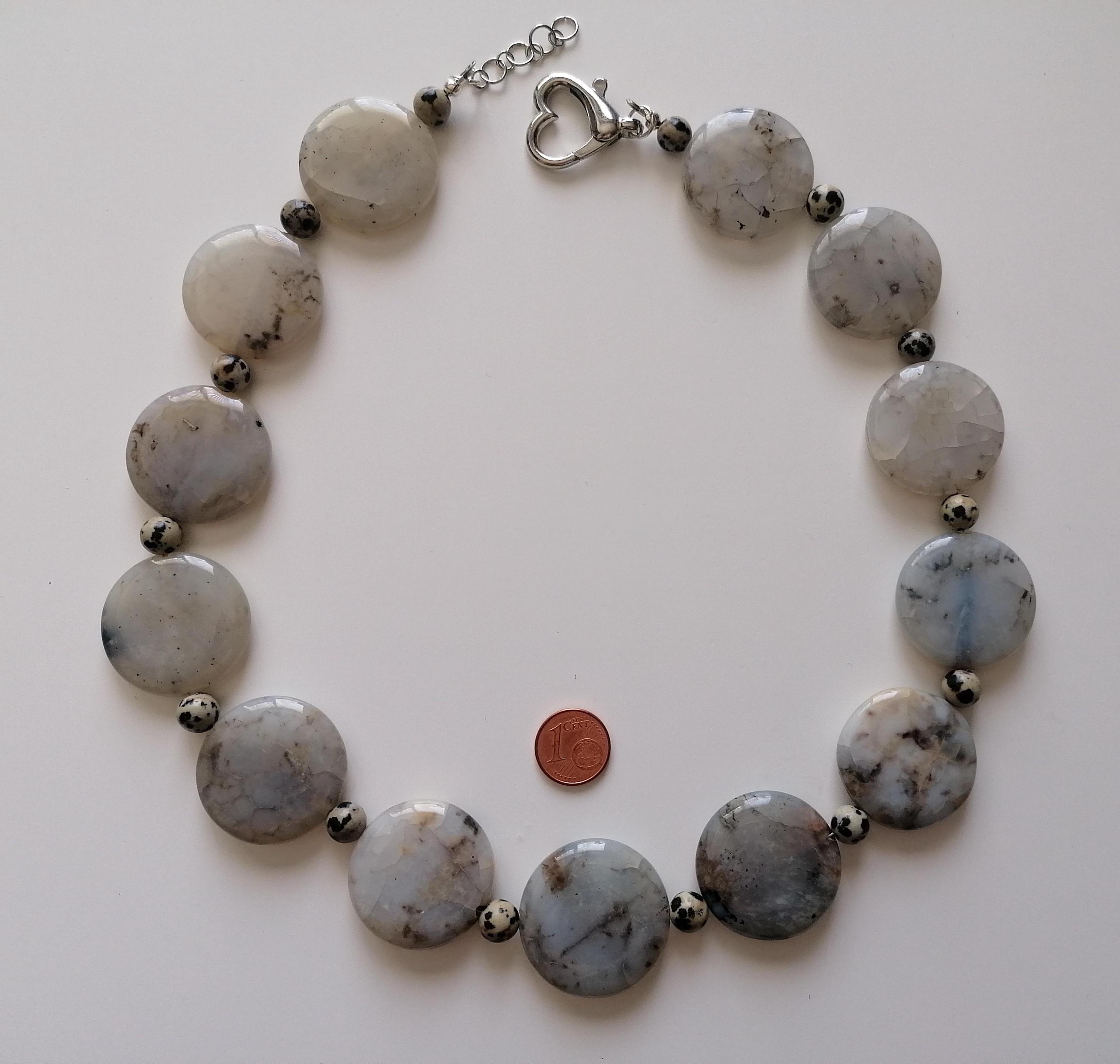 Handmade necklace made of dendritic opal and Dalmatian jasper in gray/black. This statement necklace is approximately 55.5 cm long, plus an extension chain. The piece is crafted from flat, round dendritic opal beads shaped like gold coins (approximately 30 mm x 5 mm) and round Dalmatian jasper beads (8 mm). The heart clasp and extension chain are silver-colored.