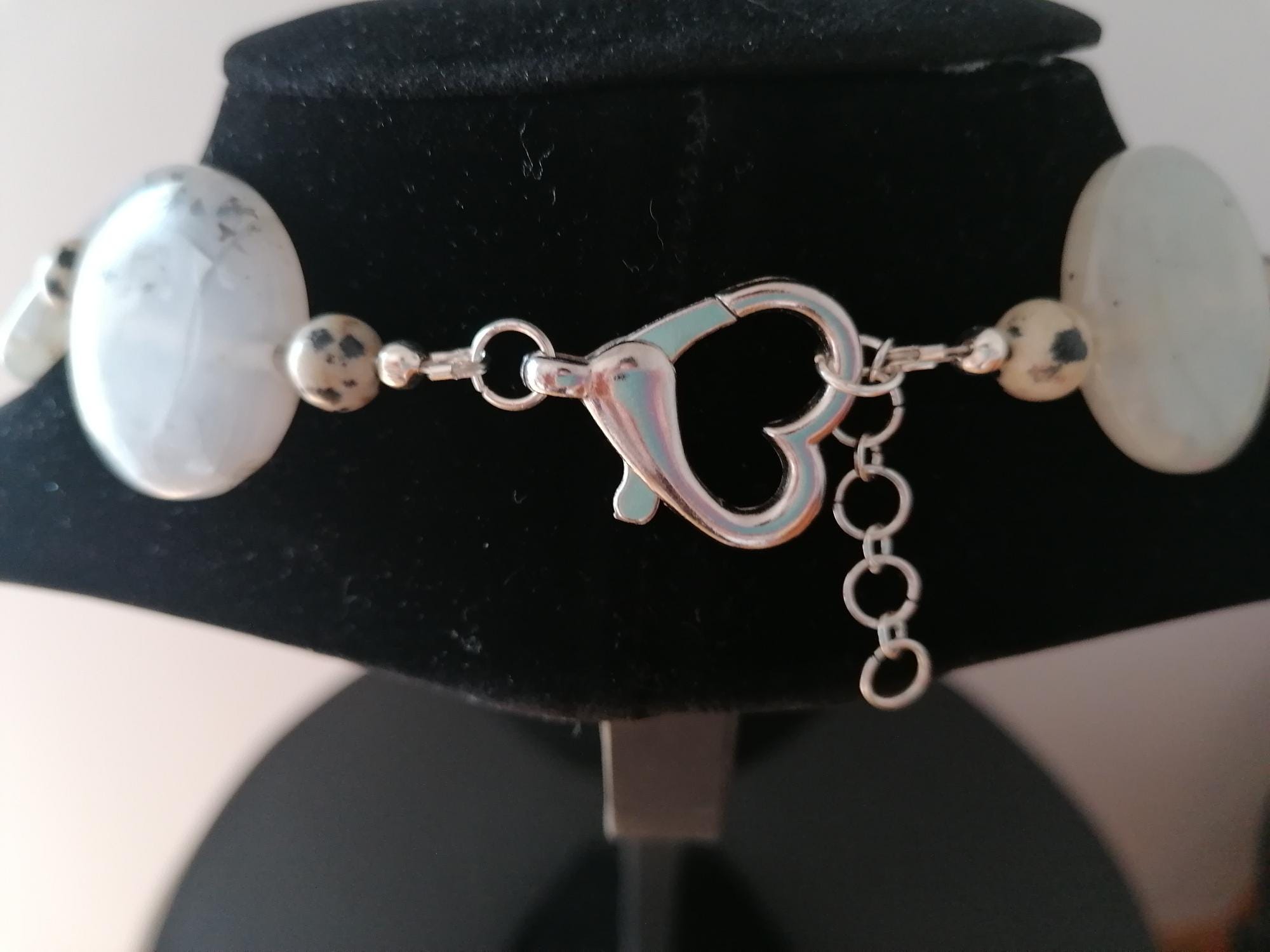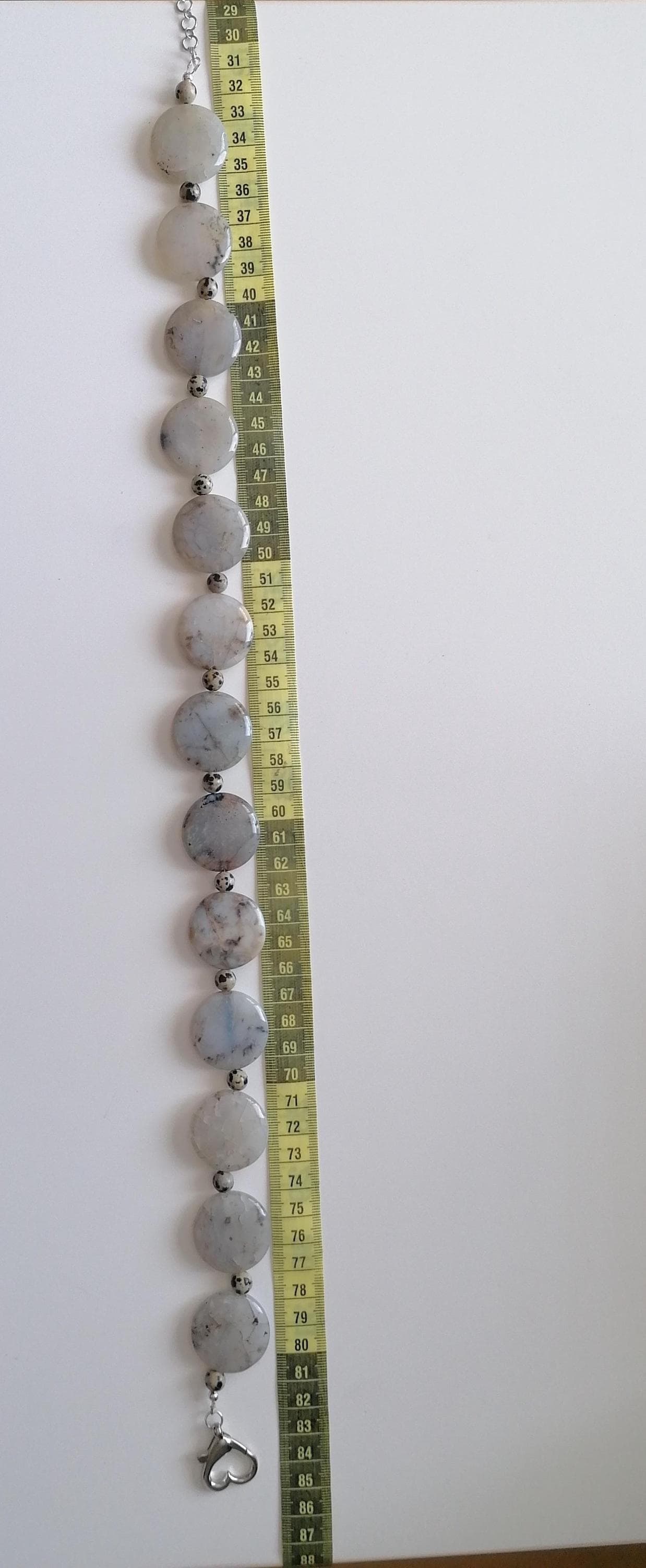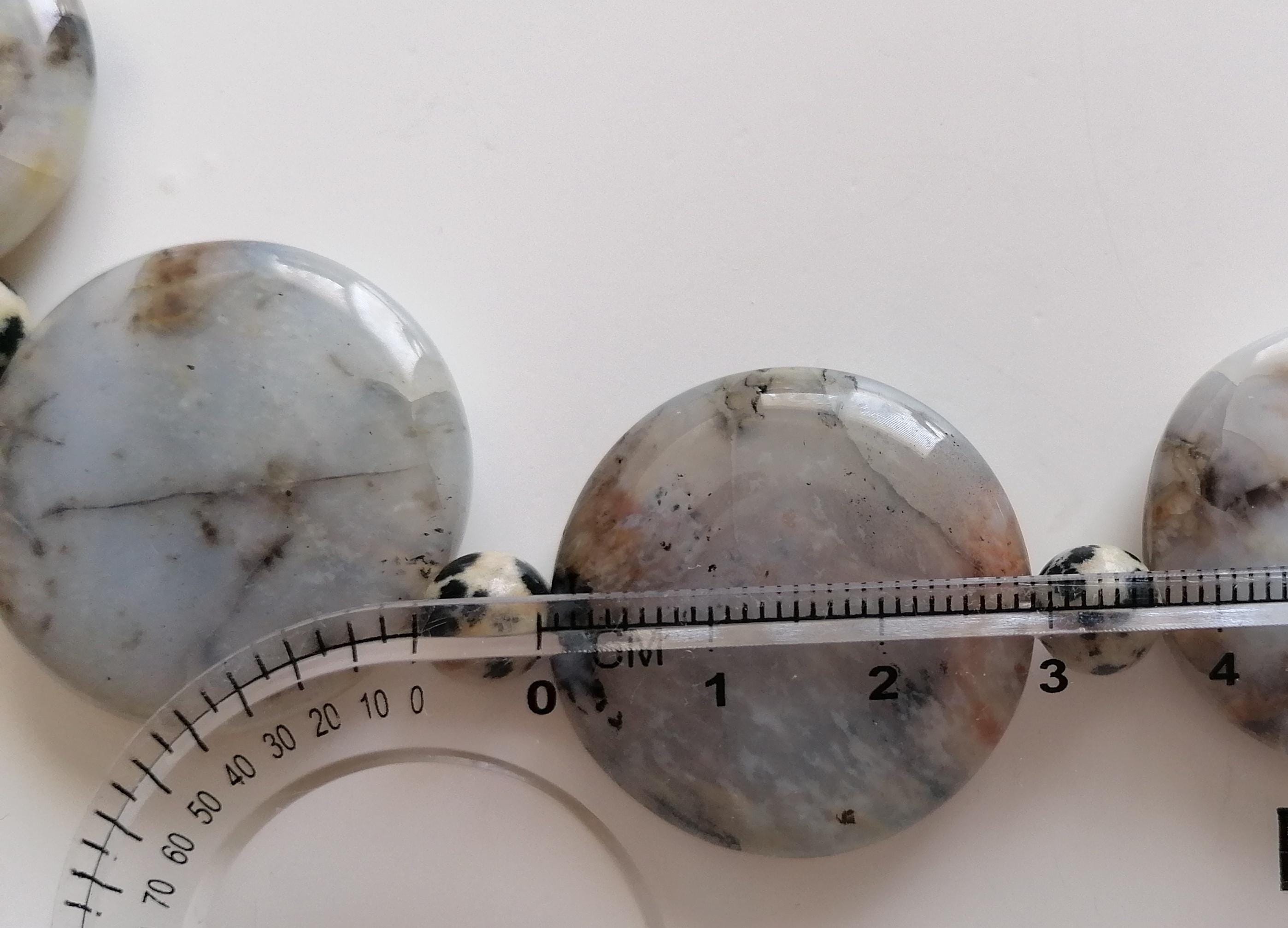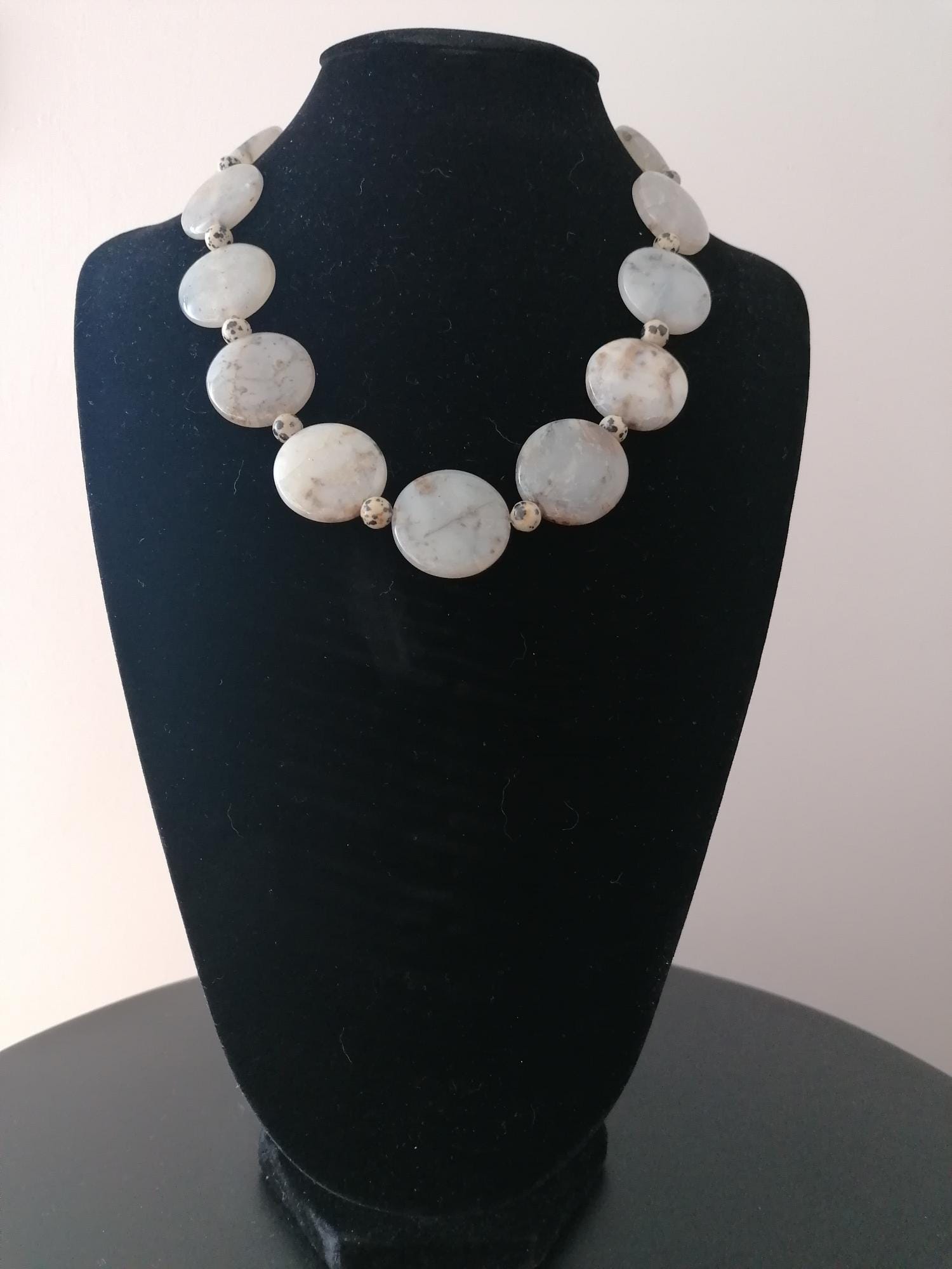 Handmade necklace made of dendritic opal and Dalmatian jasper in gray/black. This statement necklace is approximately 55.5 cm long, plus an extension chain. The piece is crafted from flat, round dendritic opal beads shaped like gold coins (approximately 30 mm x 5 mm) and round Dalmatian jasper beads (8 mm). The heart clasp and extension chain are silver-colored.