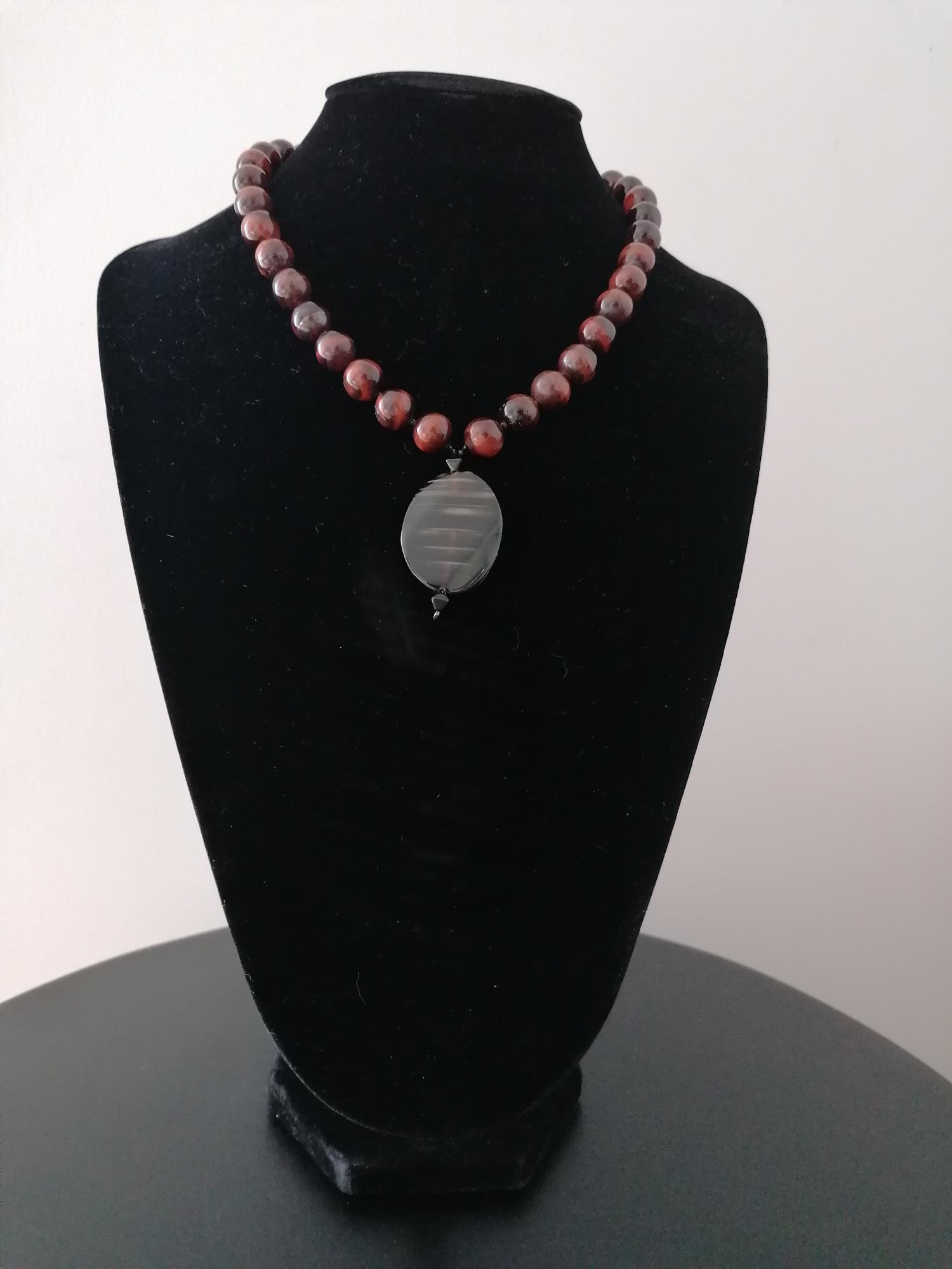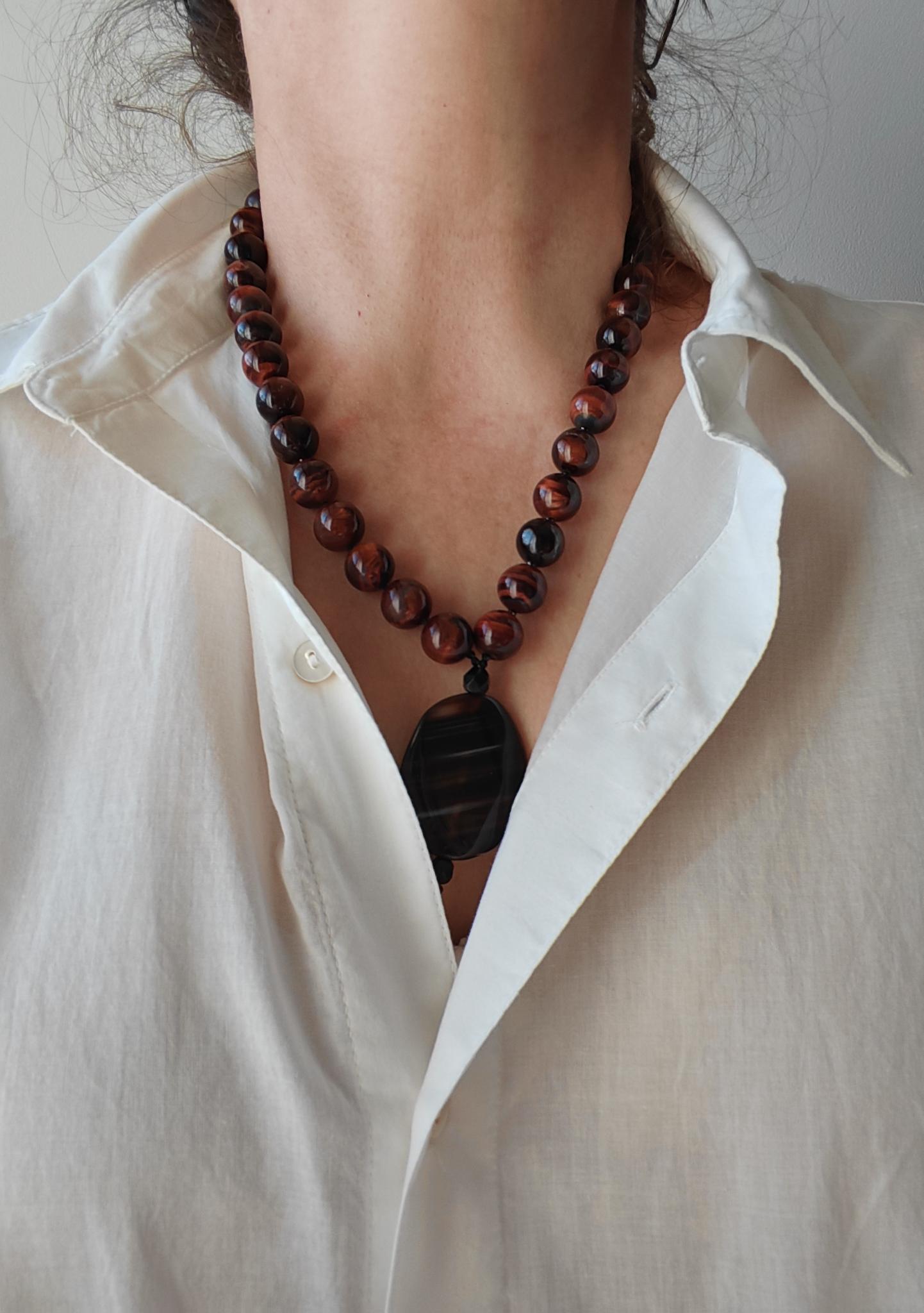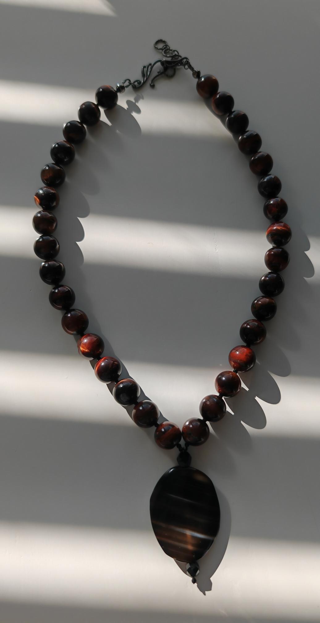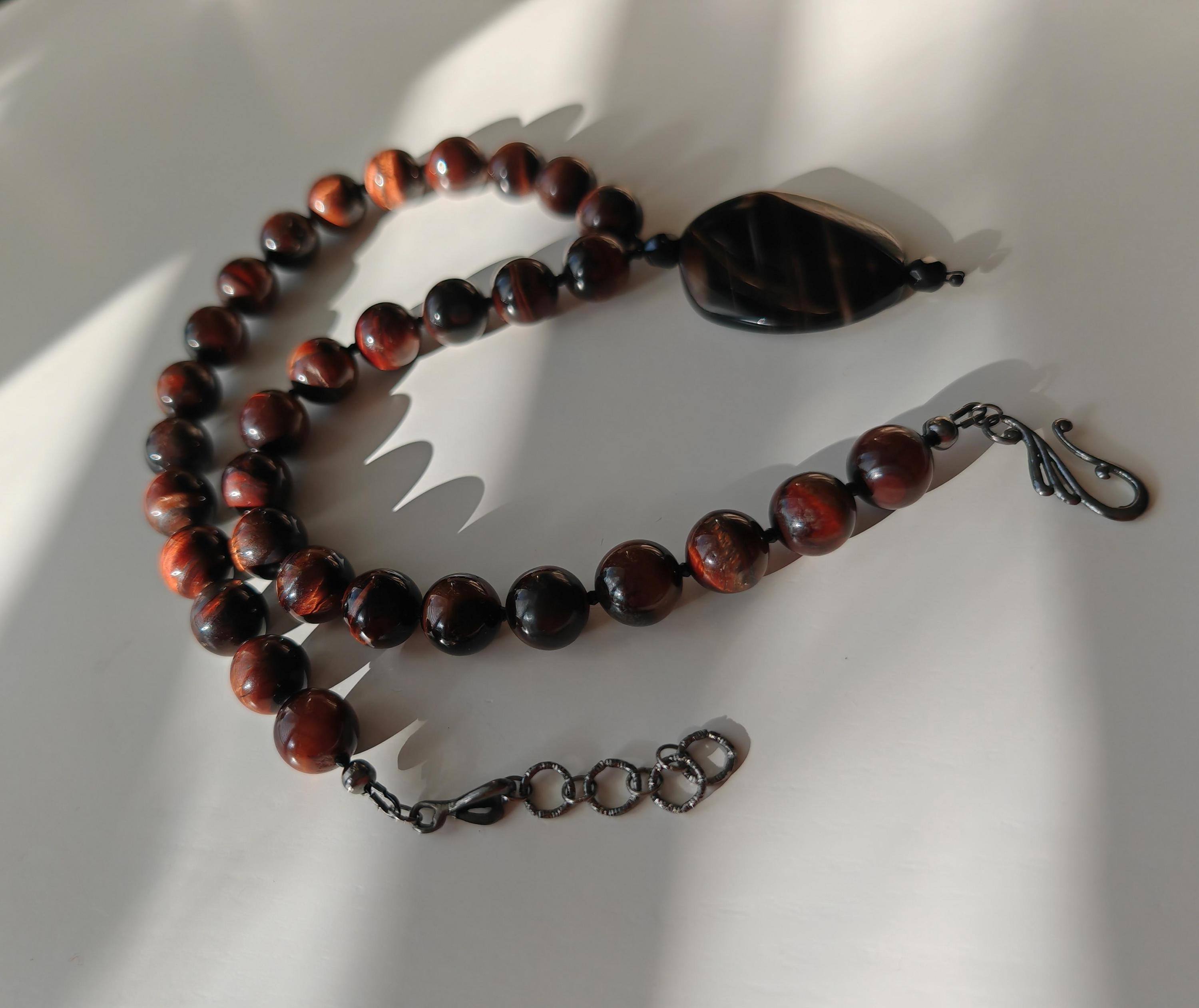 This tiger eye necklace with pendant is mahogany/black. The necklace is approximately 50 cm long plus an extension chain. The piece is made of 12 mm tiger eye beads and 2 mm faceted black spinel beads. The pendant is oval and approximately 55 mm long (the oval bead measures 40 mm x 30 mm x 6 mm). The S-shaped clasps and the extension chain are black.
