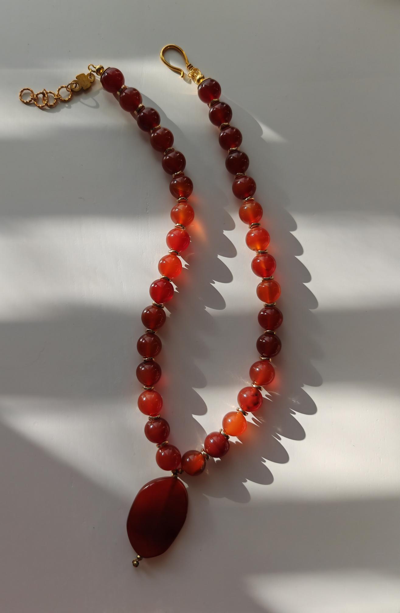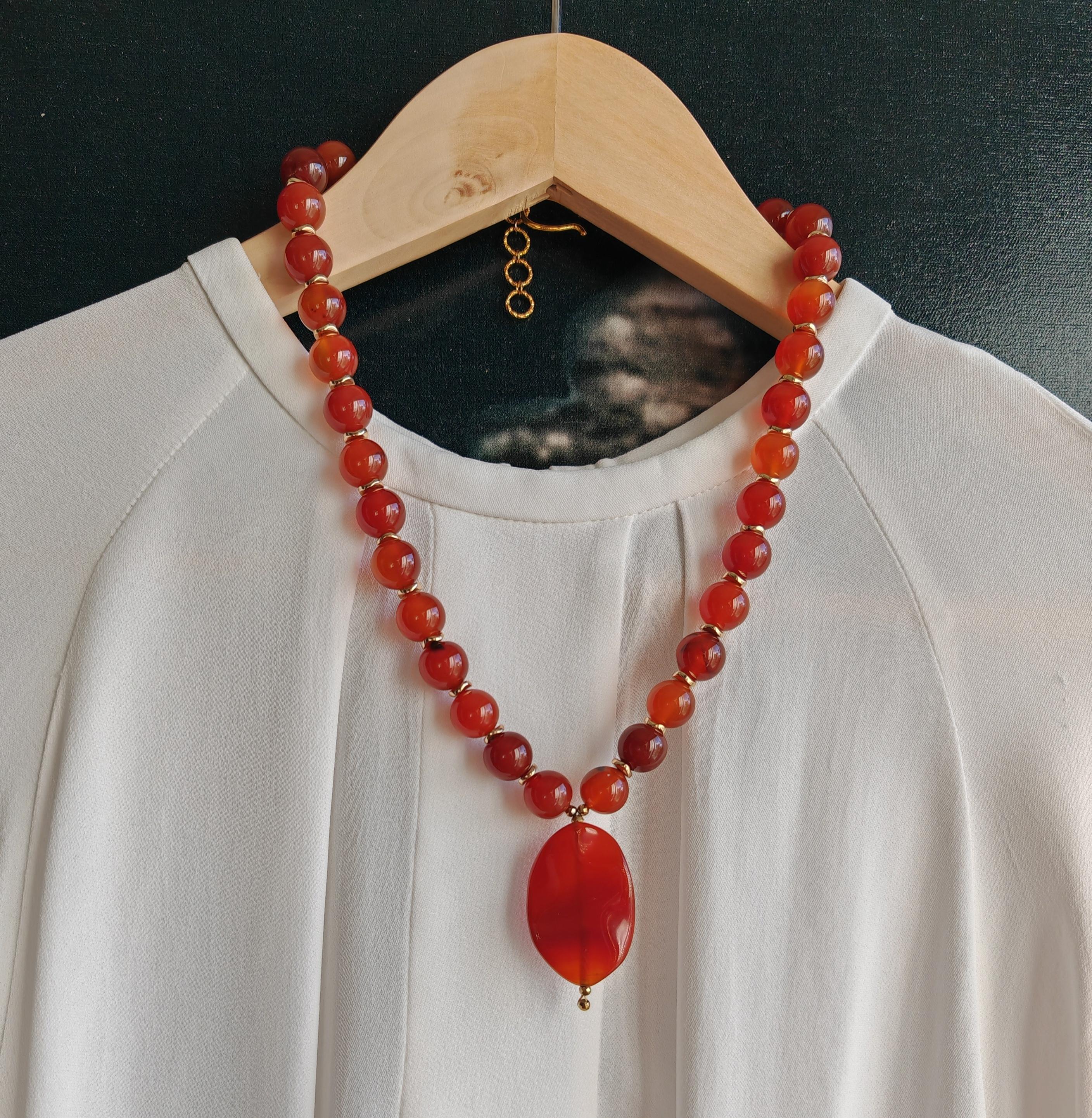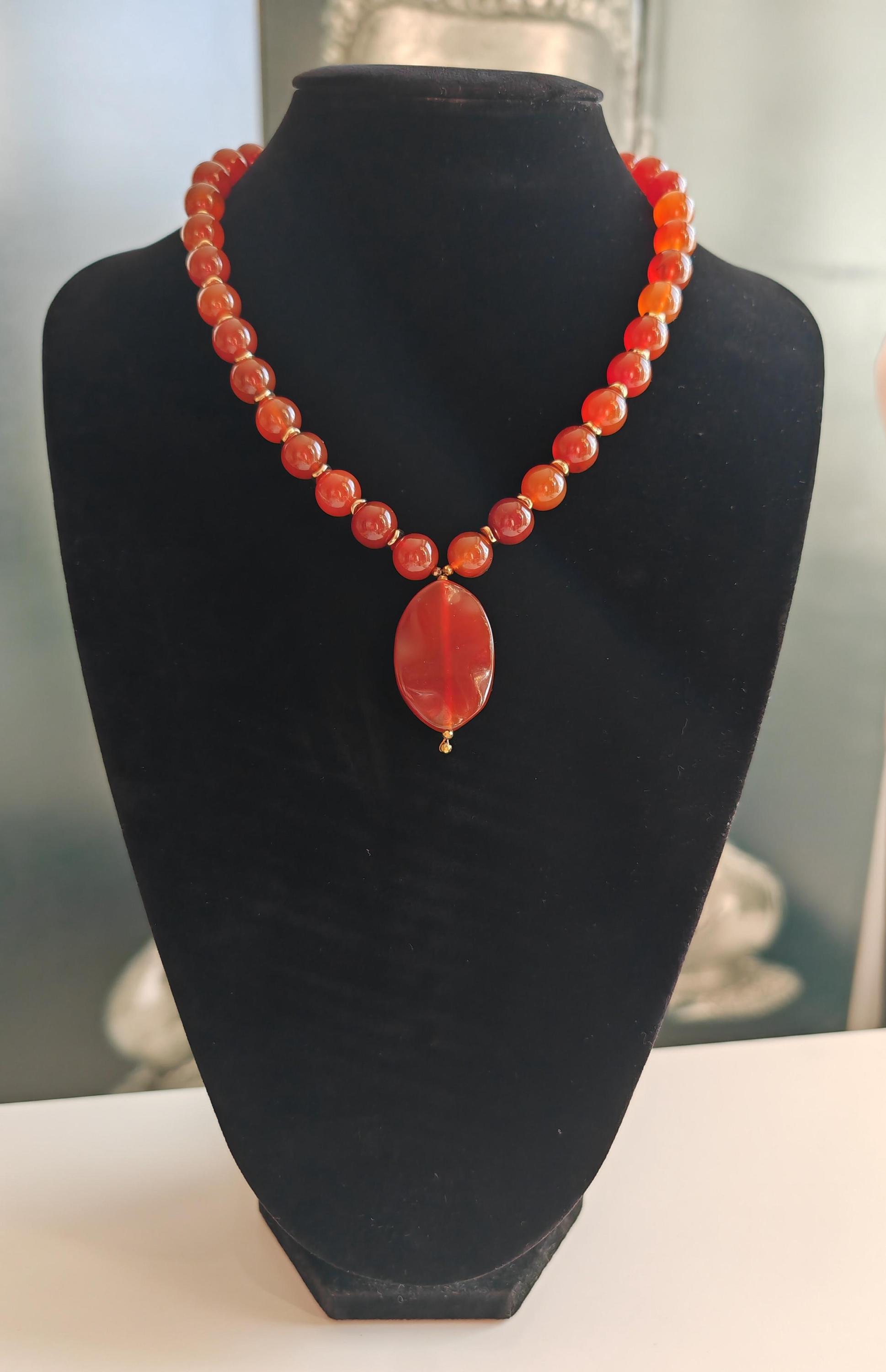 The carnelian necklace with pendant is brown/cognac. The necklace is approximately 50 cm long plus an extension chain. The piece is made of 12 mm carnelian beads and 5 mm curved hematite beads in gold. The carnelian pendant is oval (curved) and approximately 5 cm long and 2.5 cm wide. The S-shaped clasps, bead caps, and the extension chain are gold-colored.
