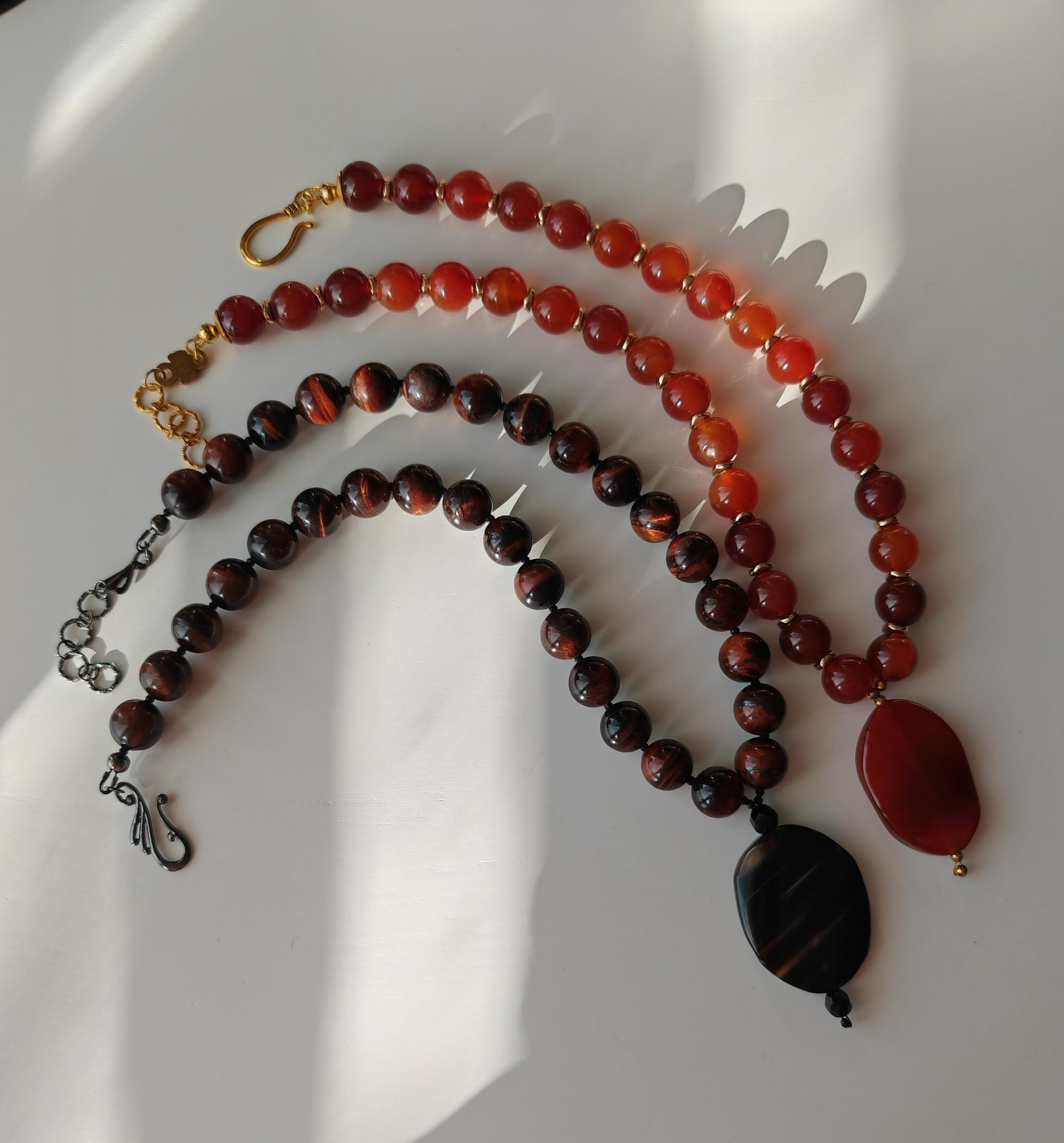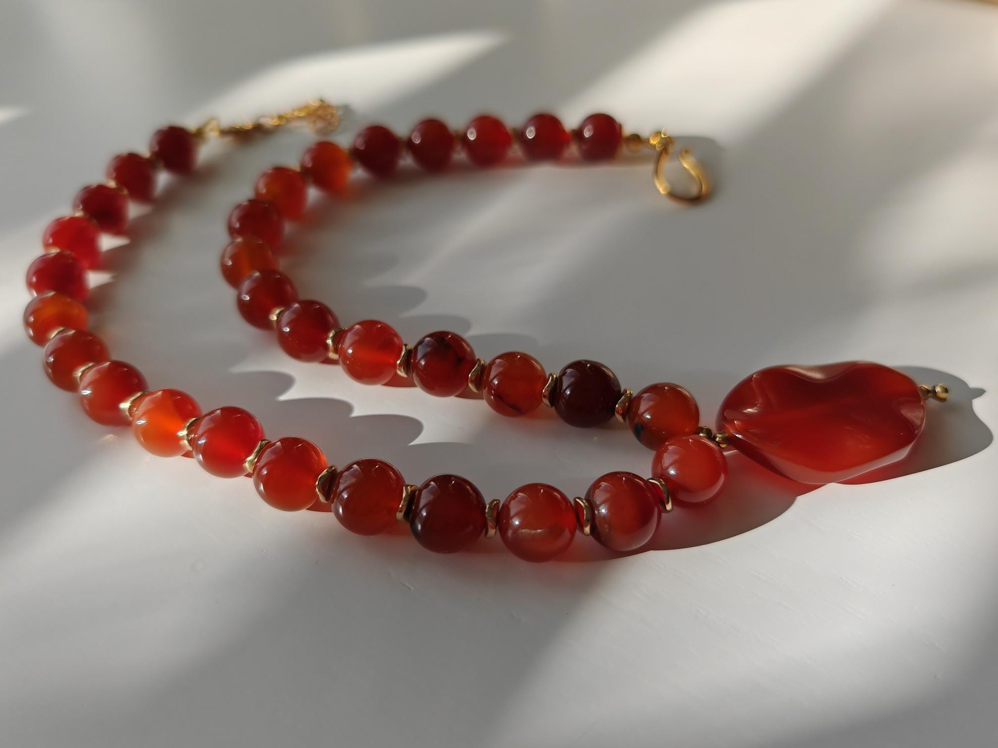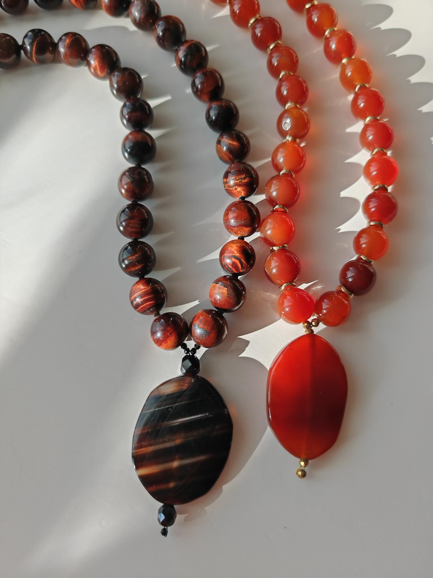 The carnelian necklace with pendant is brown/cognac. The necklace is approximately 50 cm long plus an extension chain. The piece is made of 12 mm carnelian beads and 5 mm curved hematite beads in gold. The carnelian pendant is oval (curved) and approximately 5 cm long and 2.5 cm wide. The S-shaped clasps, bead caps, and the extension chain are gold-colored.