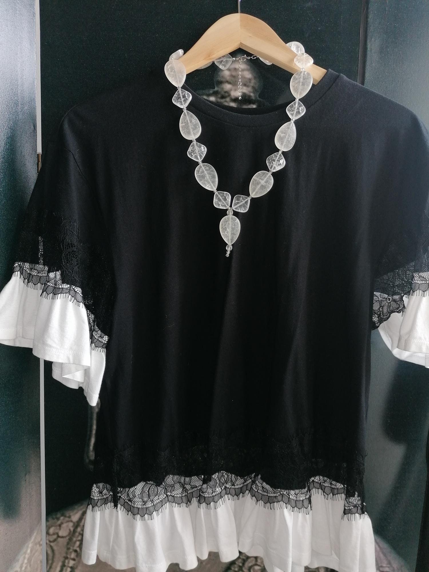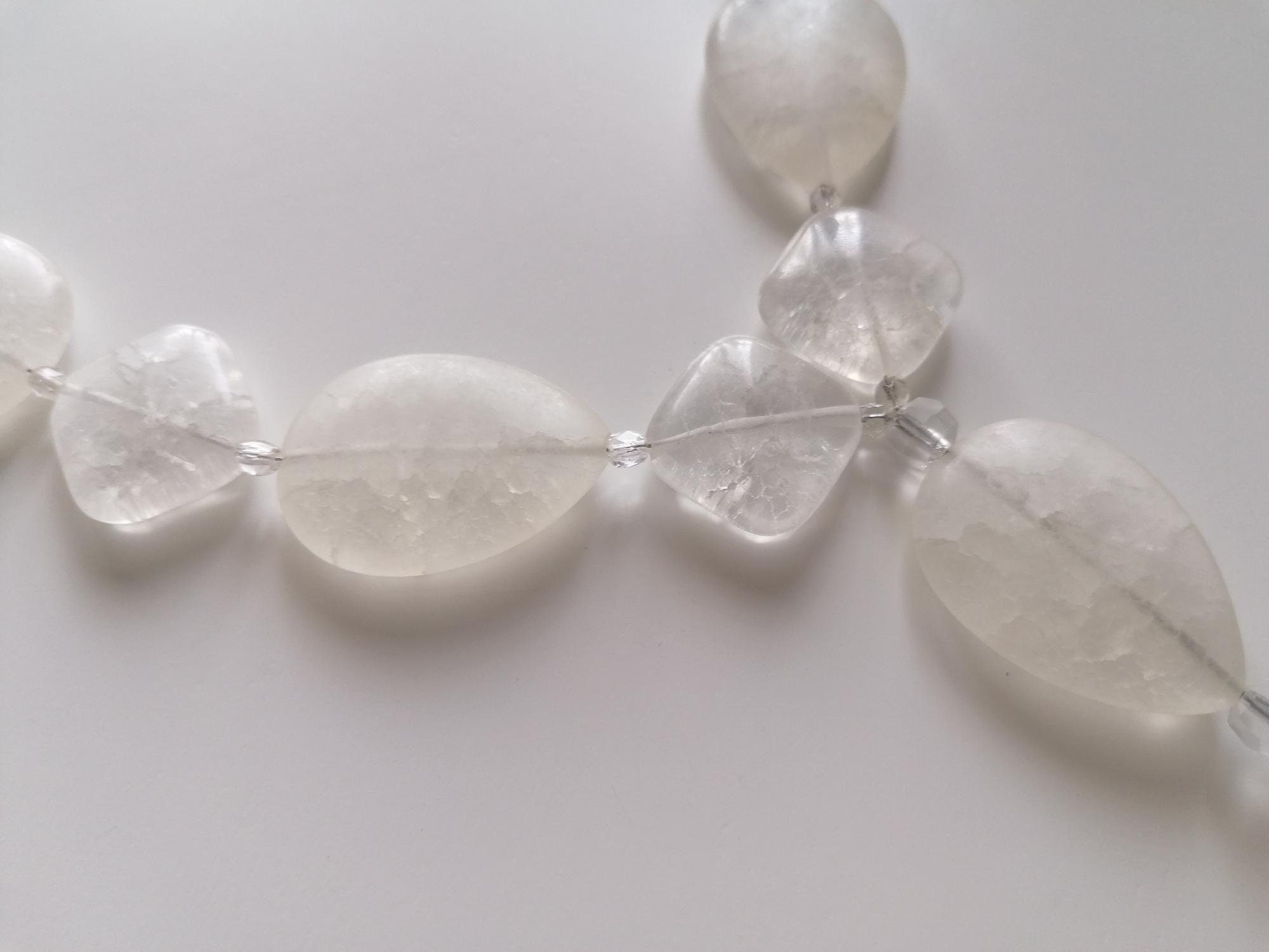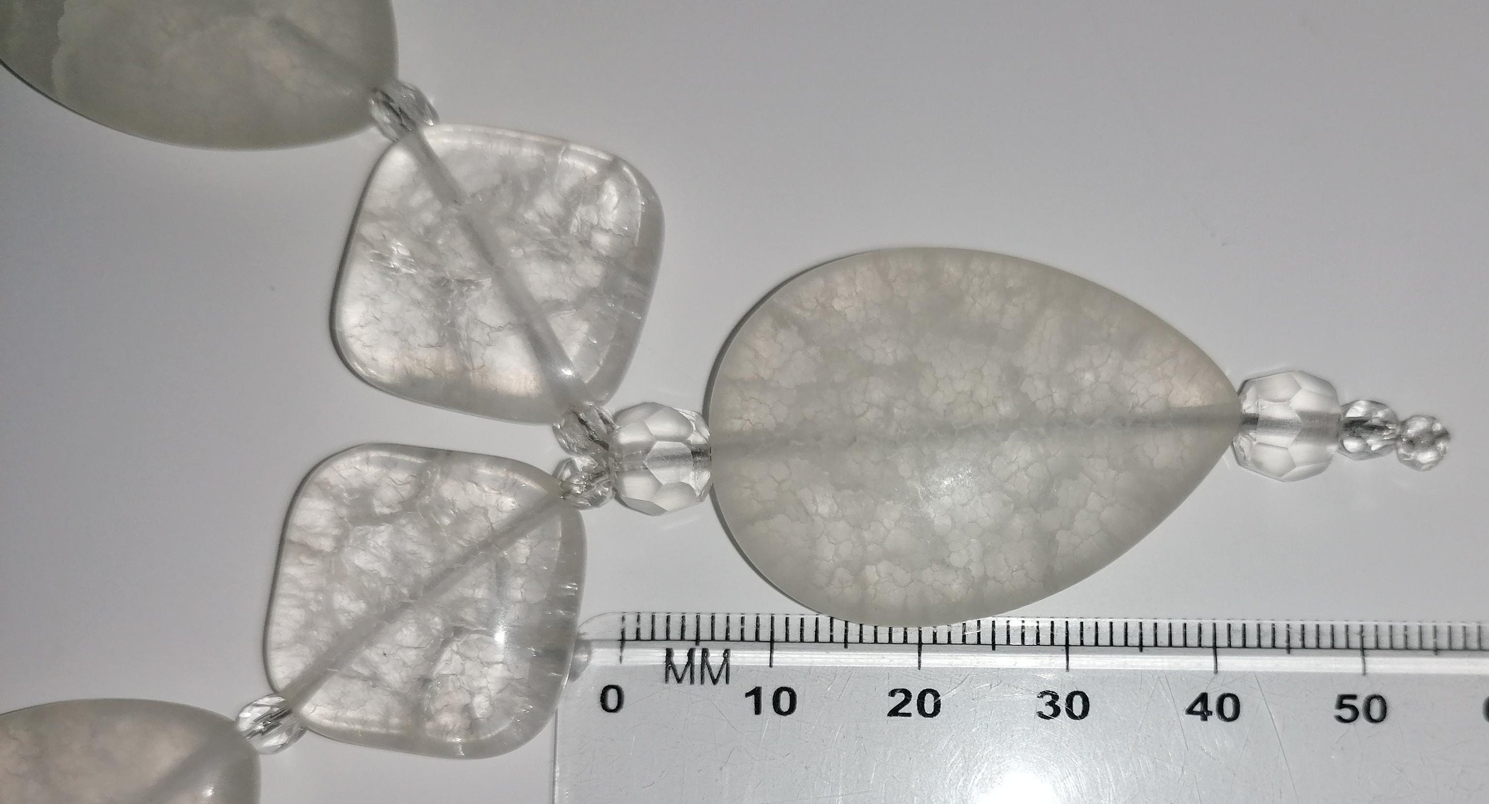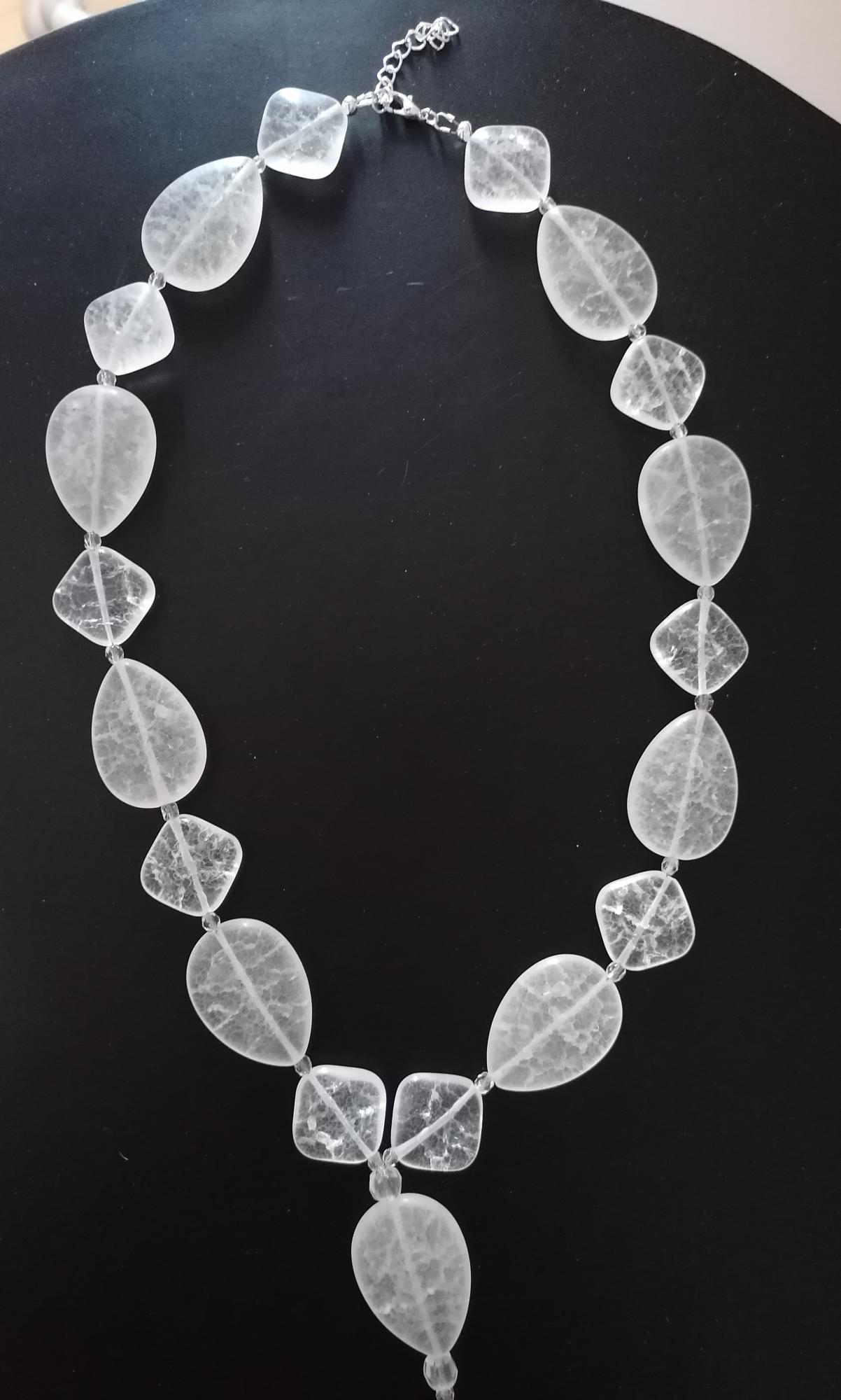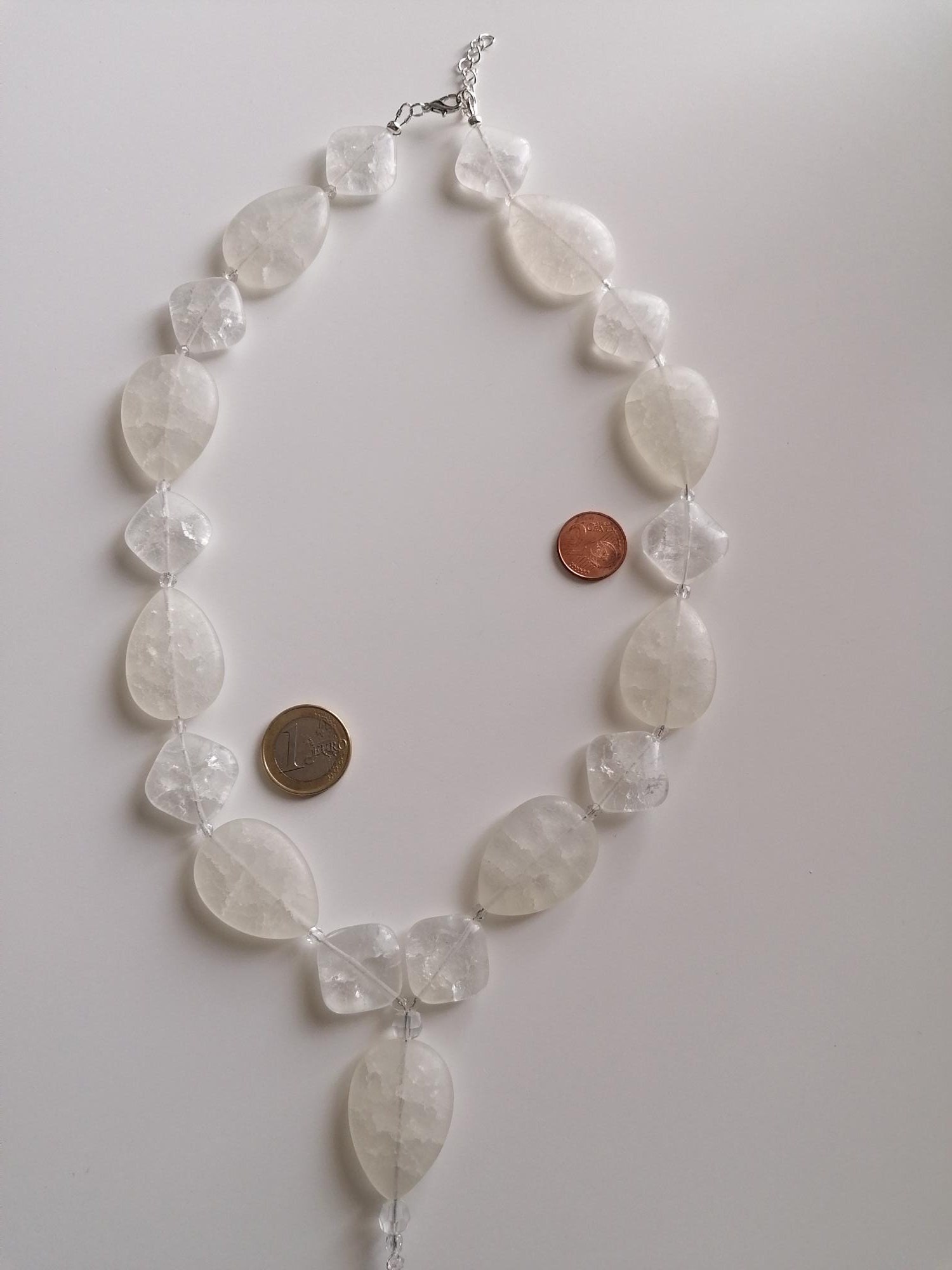 This monochrome necklace is crafted from cracked rock crystal beads in a teardrop shape (approx. 35 mm x 25 mm), square rock crystal beads (approx. 20 mm x 20 mm), and faceted Bohemian glass beads (4 mm). The necklace is approximately 59.5 cm long, plus a 4.5 cm extension chain. The clasp and extension chain are silver-colored. Wonderful gift!