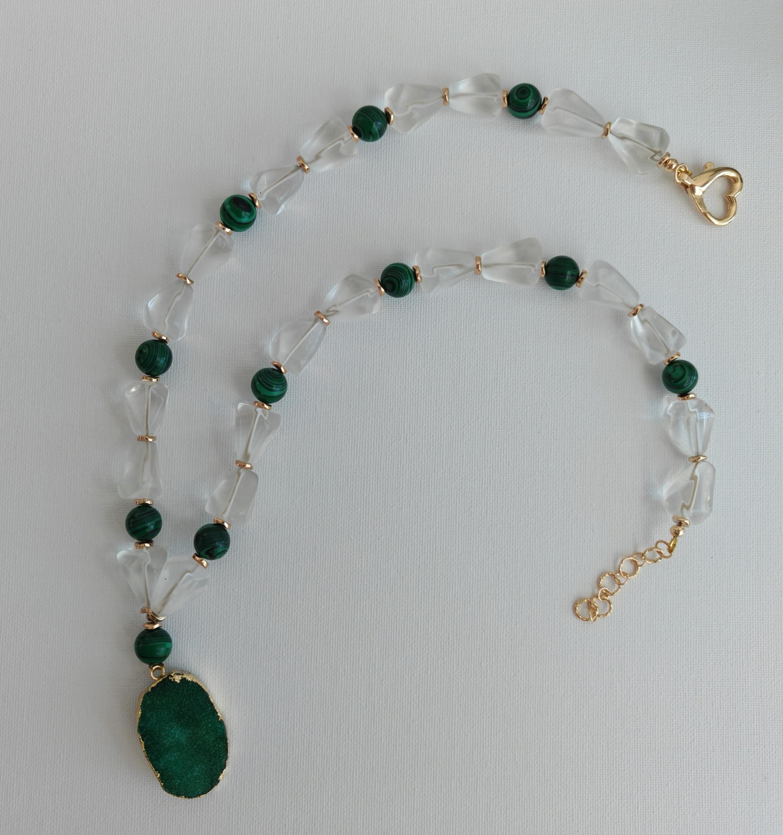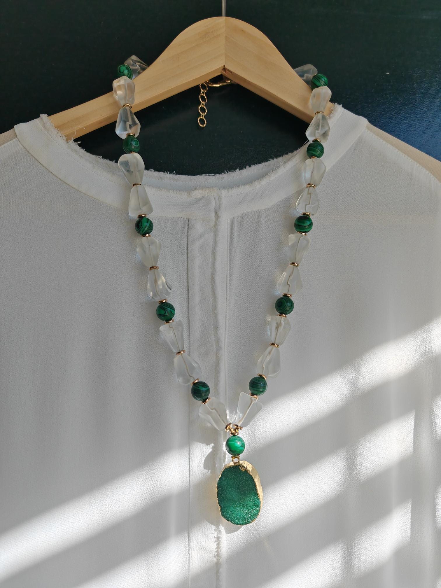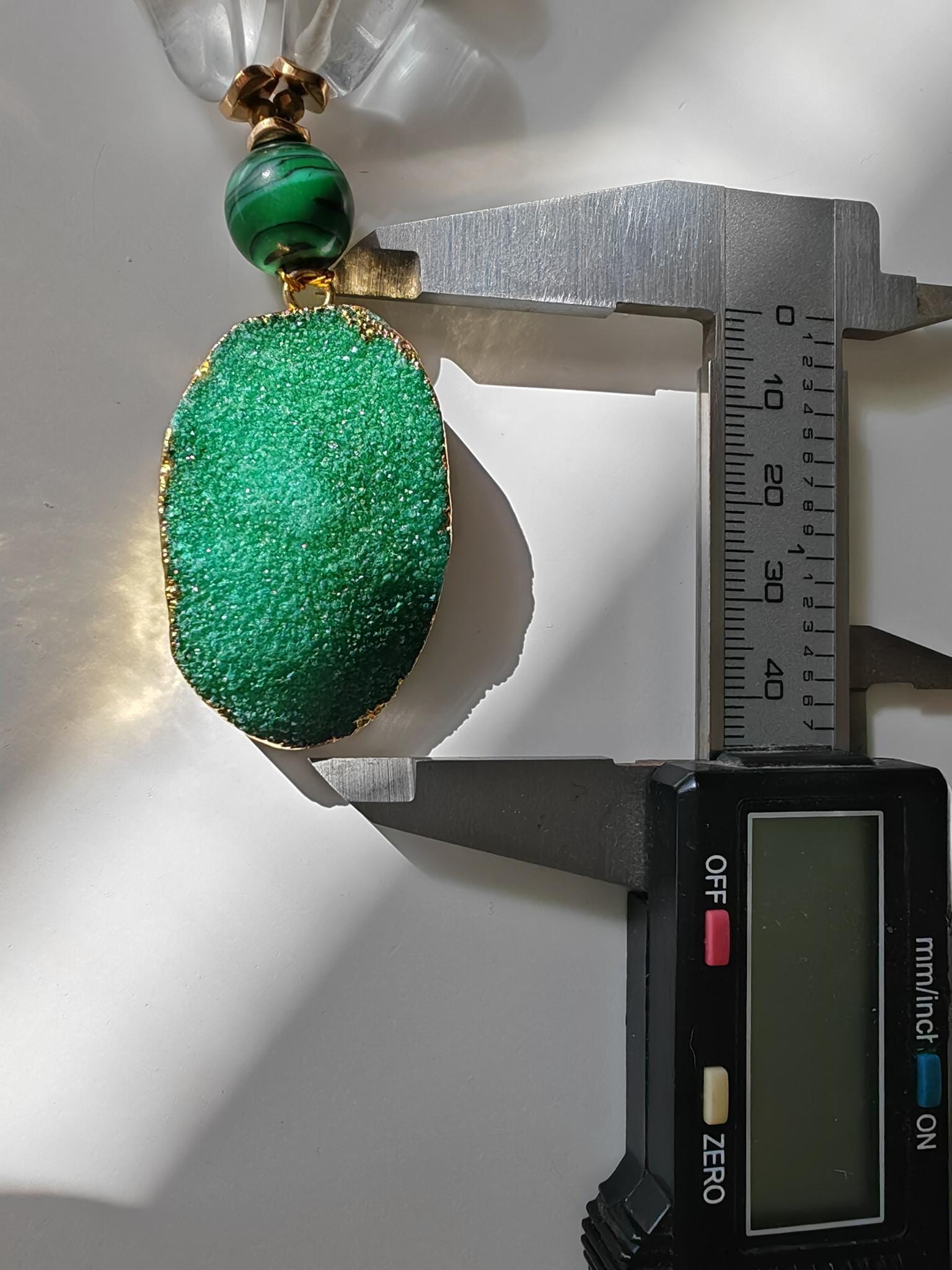 This two-tone necklace with a green pendant is 66.5 cm long, plus an extension chain. The opulent, solid chain is crafted from faceted, polygonal, matte rock crystal beads (24 mm x 15 mm), imitation malachite beads (12 mm), gold-plated spinel beads (3 mm), and gold-plated hematite discs (6 mm). The pendant is approximately 45 mm long (a geode measuring 42 mm x 35 mm x 10 mm). The heart-shaped clasp and the extension chain are gold-plated.