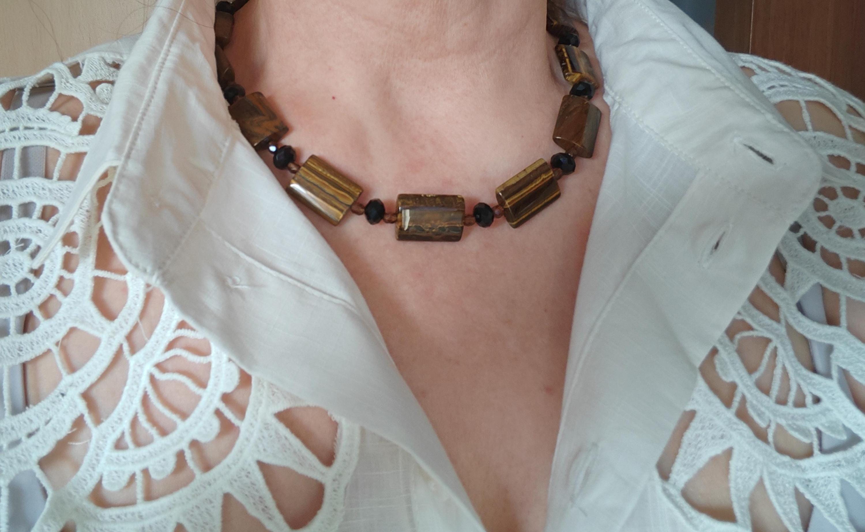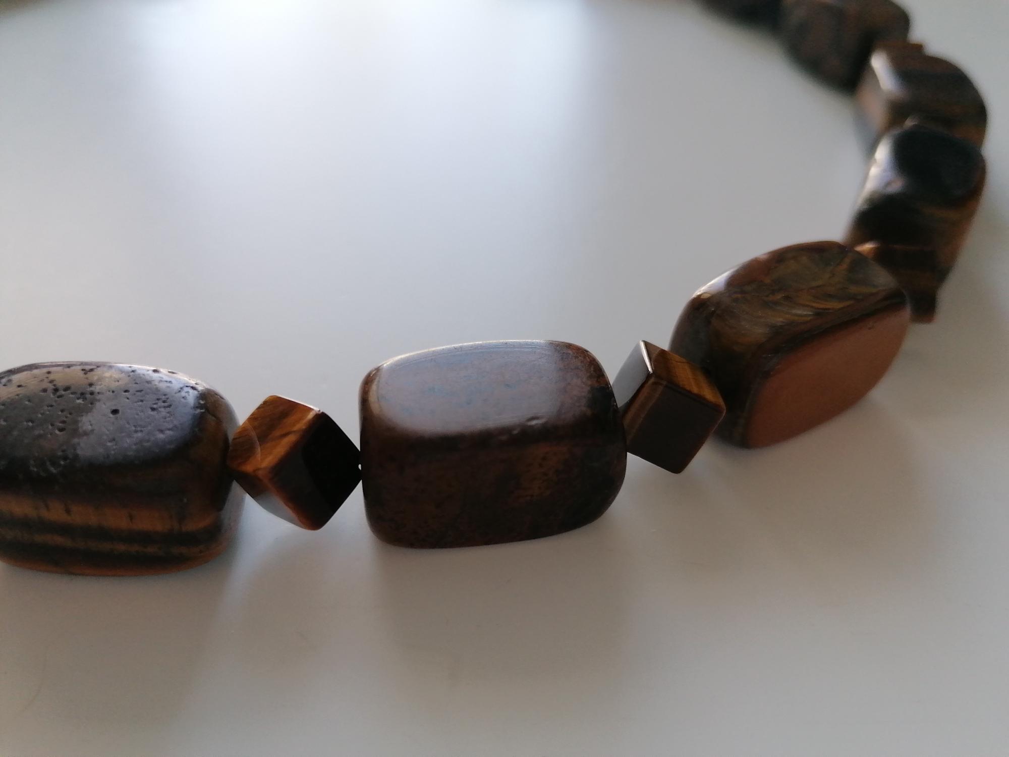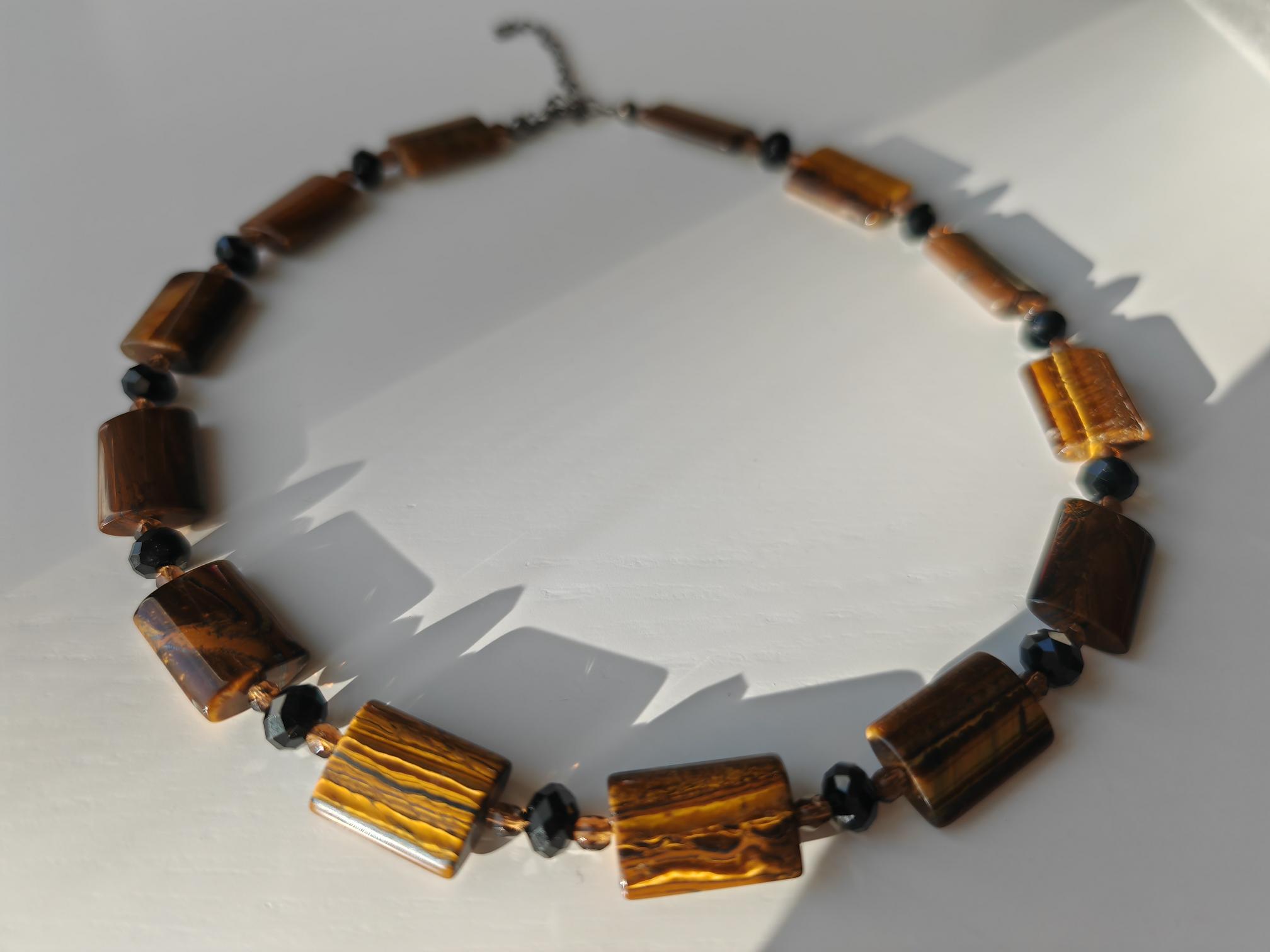 This delicate tiger's eye necklace is 47.5 cm long. The necklace is made of tiger's eye beads (20 mm x 15 mm x 5 mm) and faceted glass beads (black 8 mm x 5 mm and brown 4 mm). The clasp and extension chain are black. You can wear this necklace every day as well as for special occasions. Alone or in combination with other necklaces.
