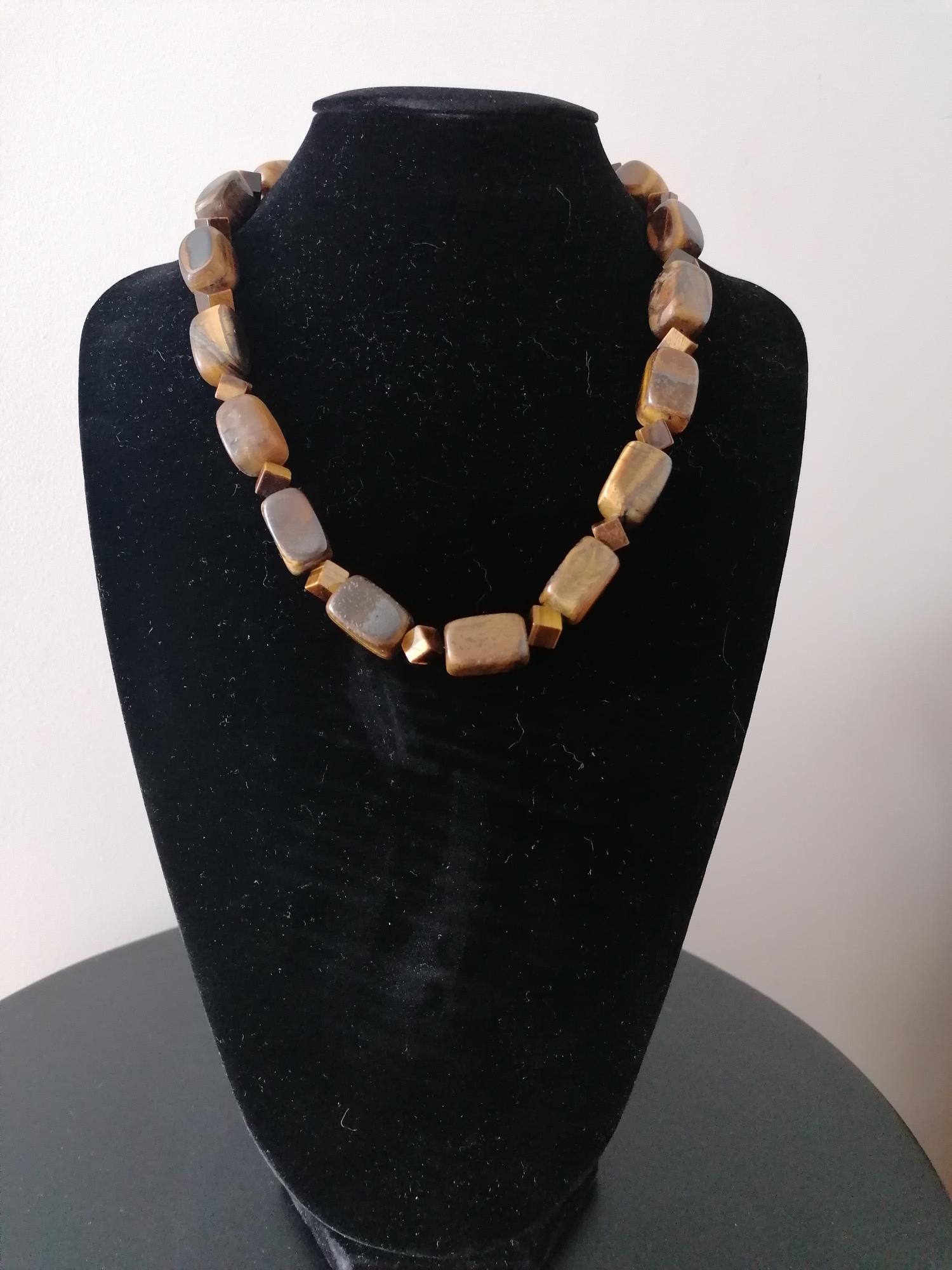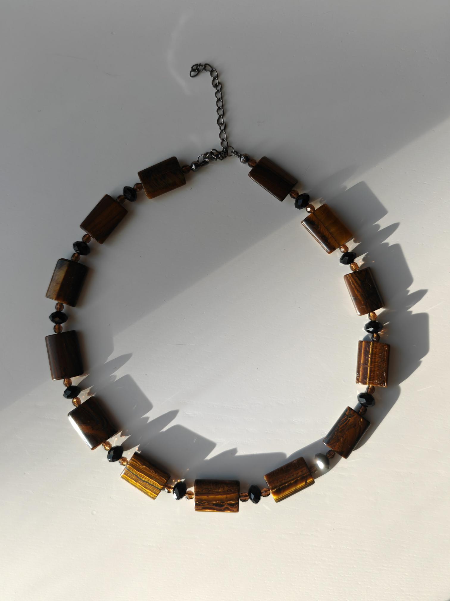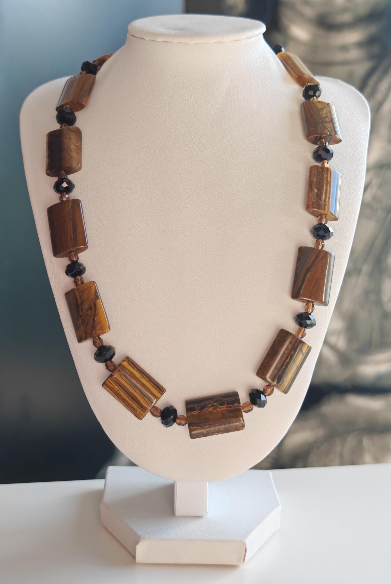 This delicate tiger's eye necklace is 47.5 cm long. The necklace is made of tiger's eye beads (20 mm x 15 mm x 5 mm) and faceted glass beads (black 8 mm x 5 mm and brown 4 mm). The clasp and extension chain are black. You can wear this necklace every day as well as for special occasions. Alone or in combination with other necklaces.