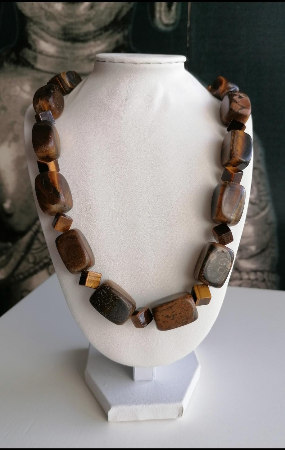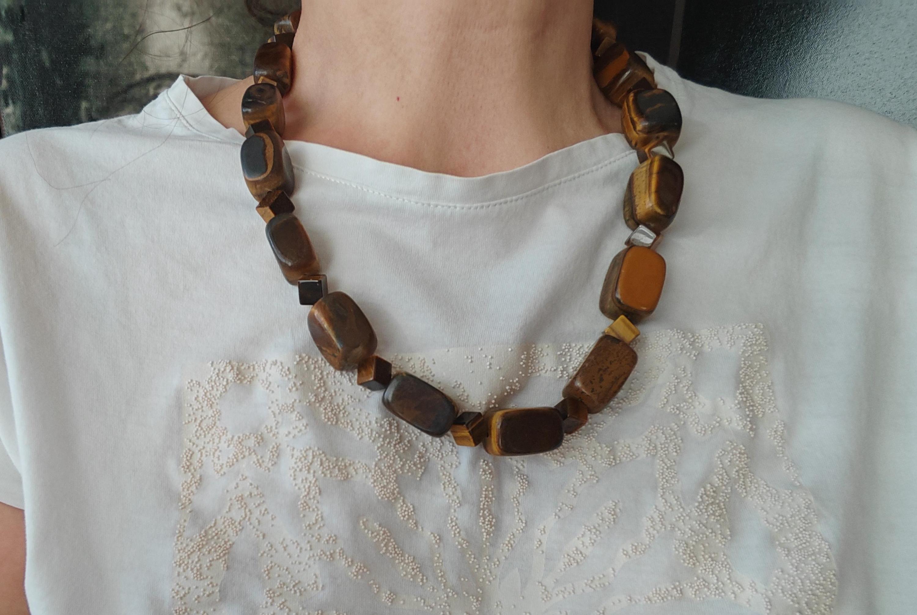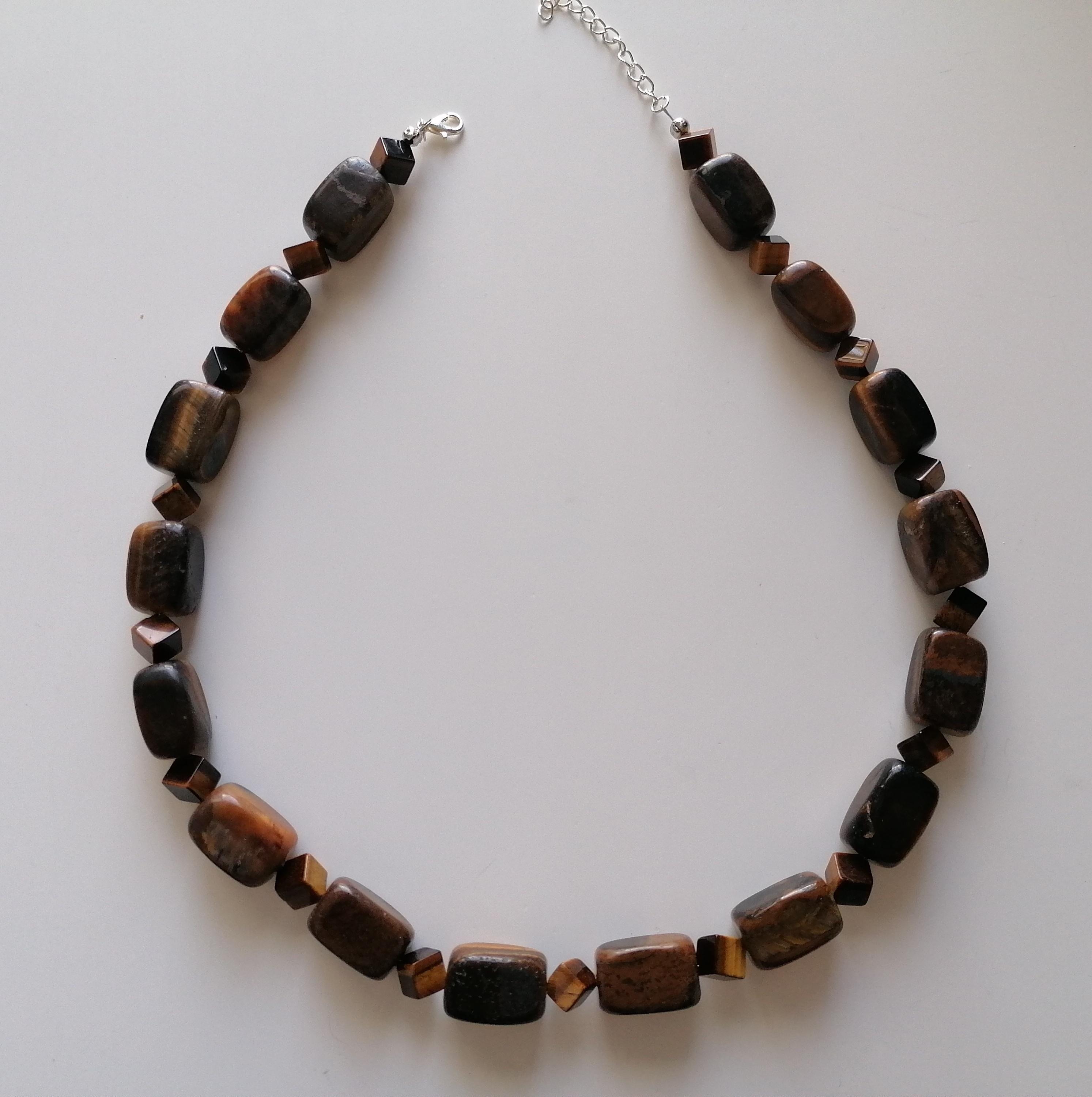 The chunky, longer chain is approximately 57.5 cm long, plus an extension chain of approximately 5 cm. The brown necklace is made from vintage tiger's eye beads (the rectangular beads are approximately 20 mm x 13 mm and the cube beads approximately 8 mm x 8 mm). The clasp and extension chain are silver-colored.