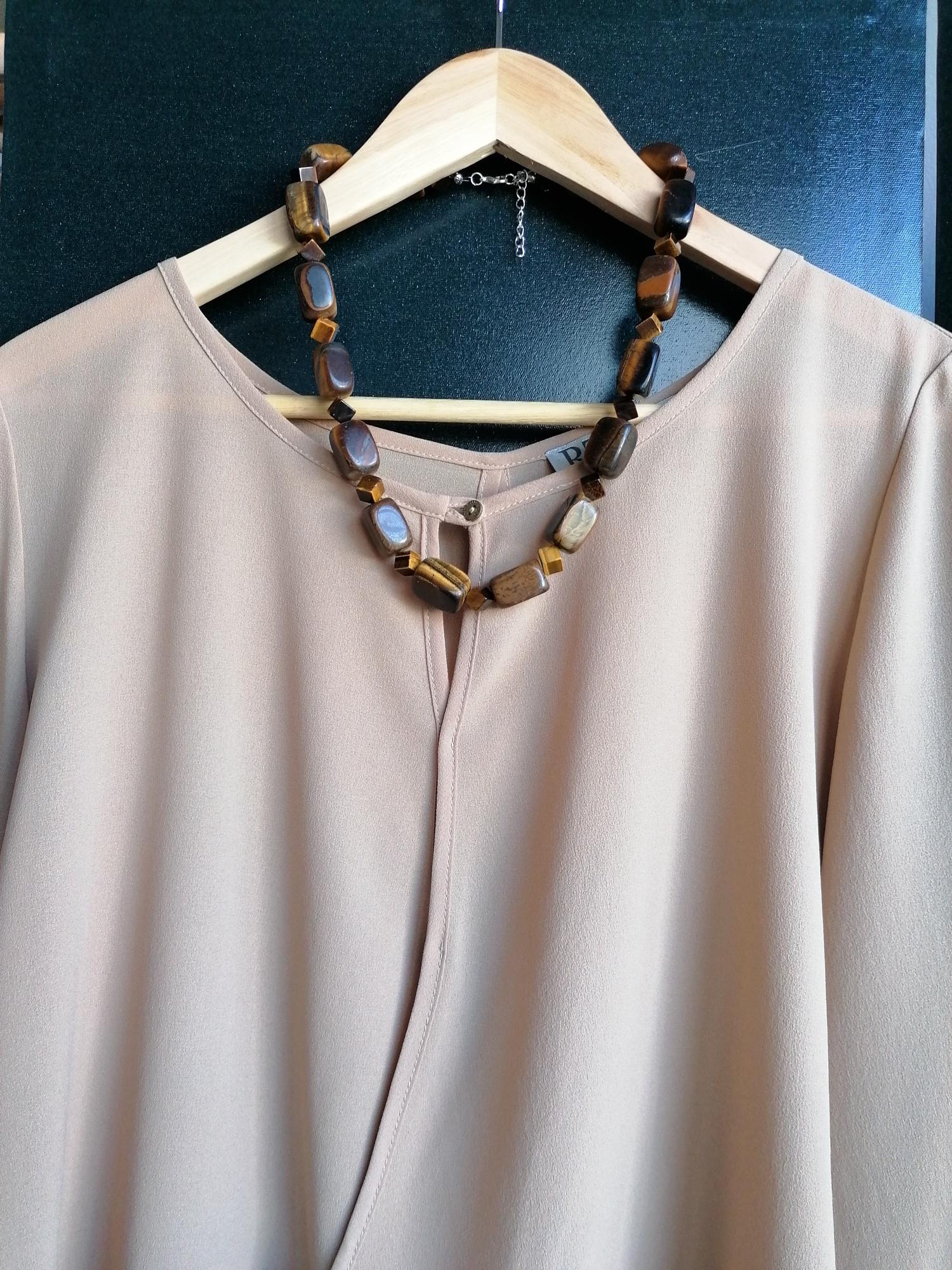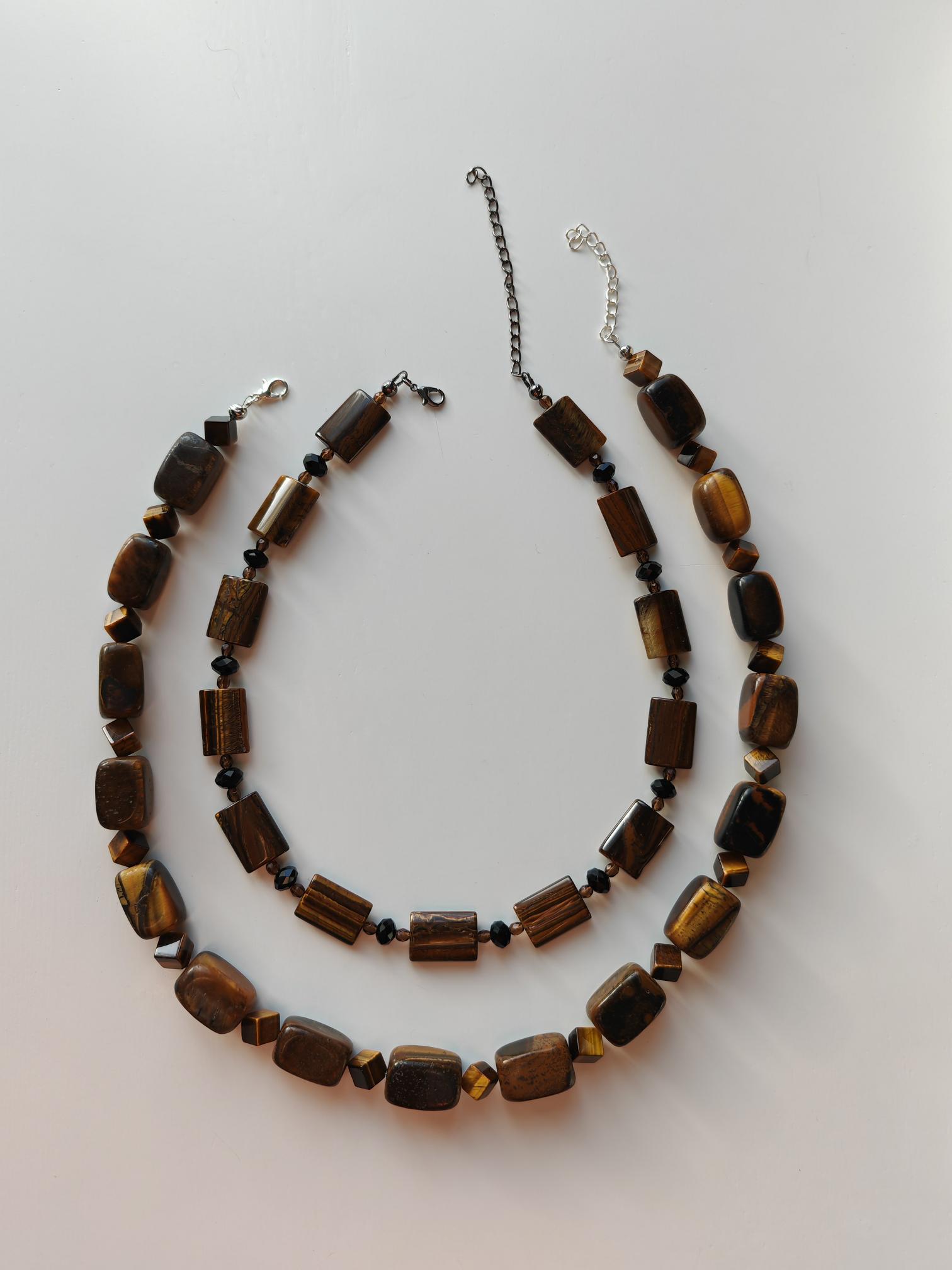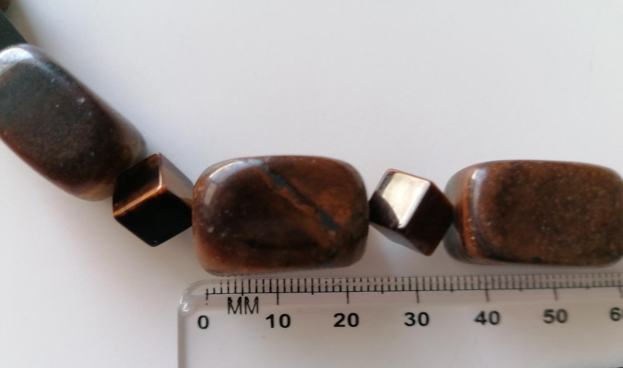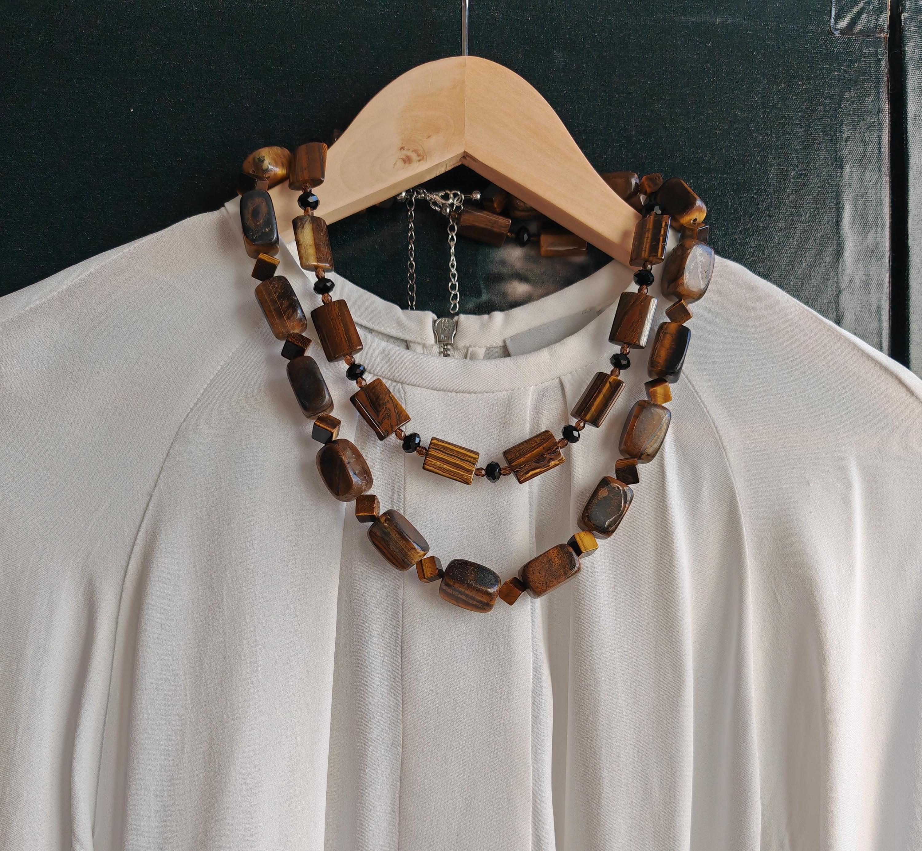 The chunky, longer chain is approximately 57.5 cm long, plus an extension chain of approximately 5 cm. The brown necklace is made from vintage tiger's eye beads (the rectangular beads are approximately 20 mm x 13 mm and the cube beads approximately 8 mm x 8 mm). The clasp and extension chain are silver-colored.