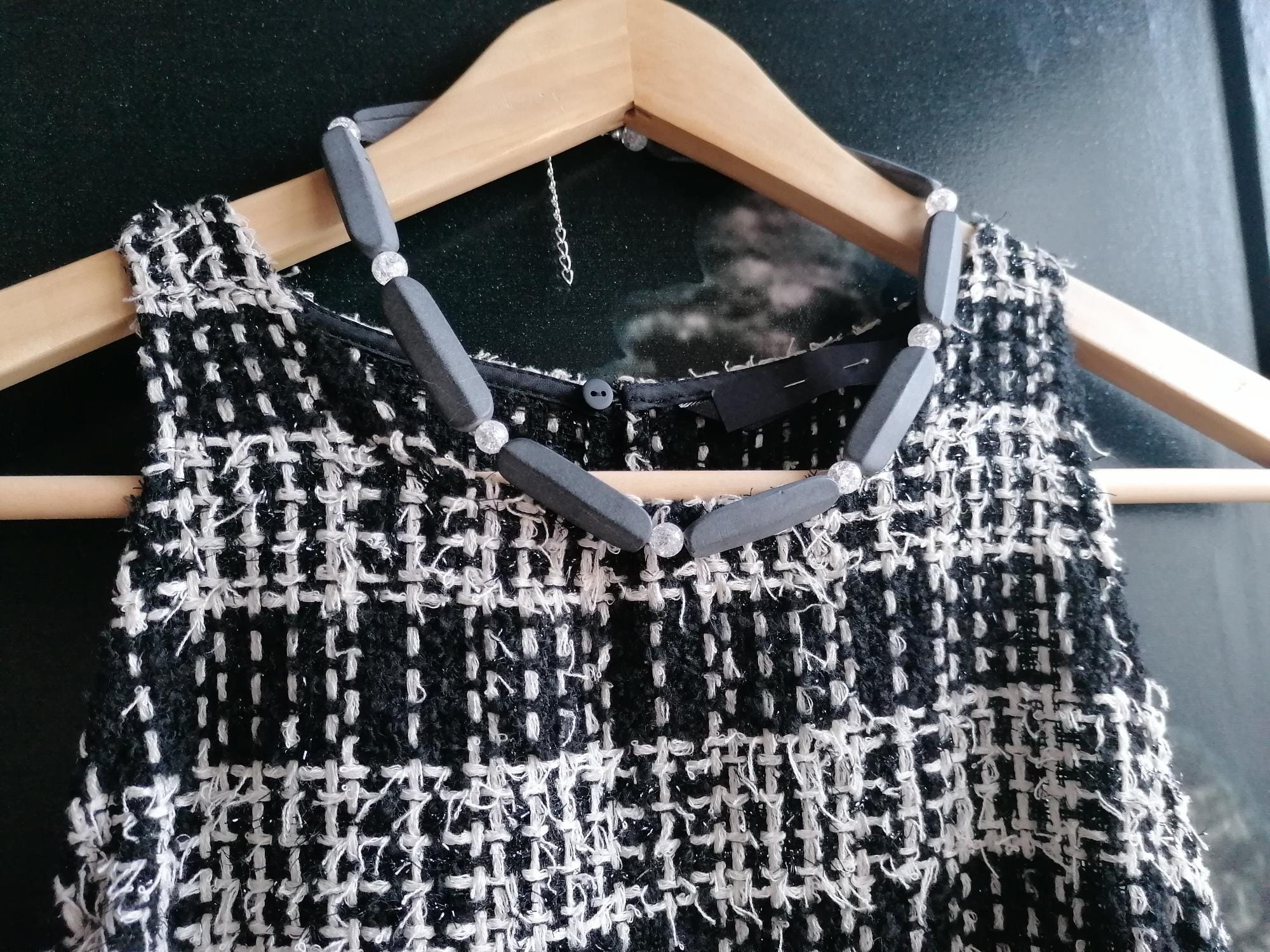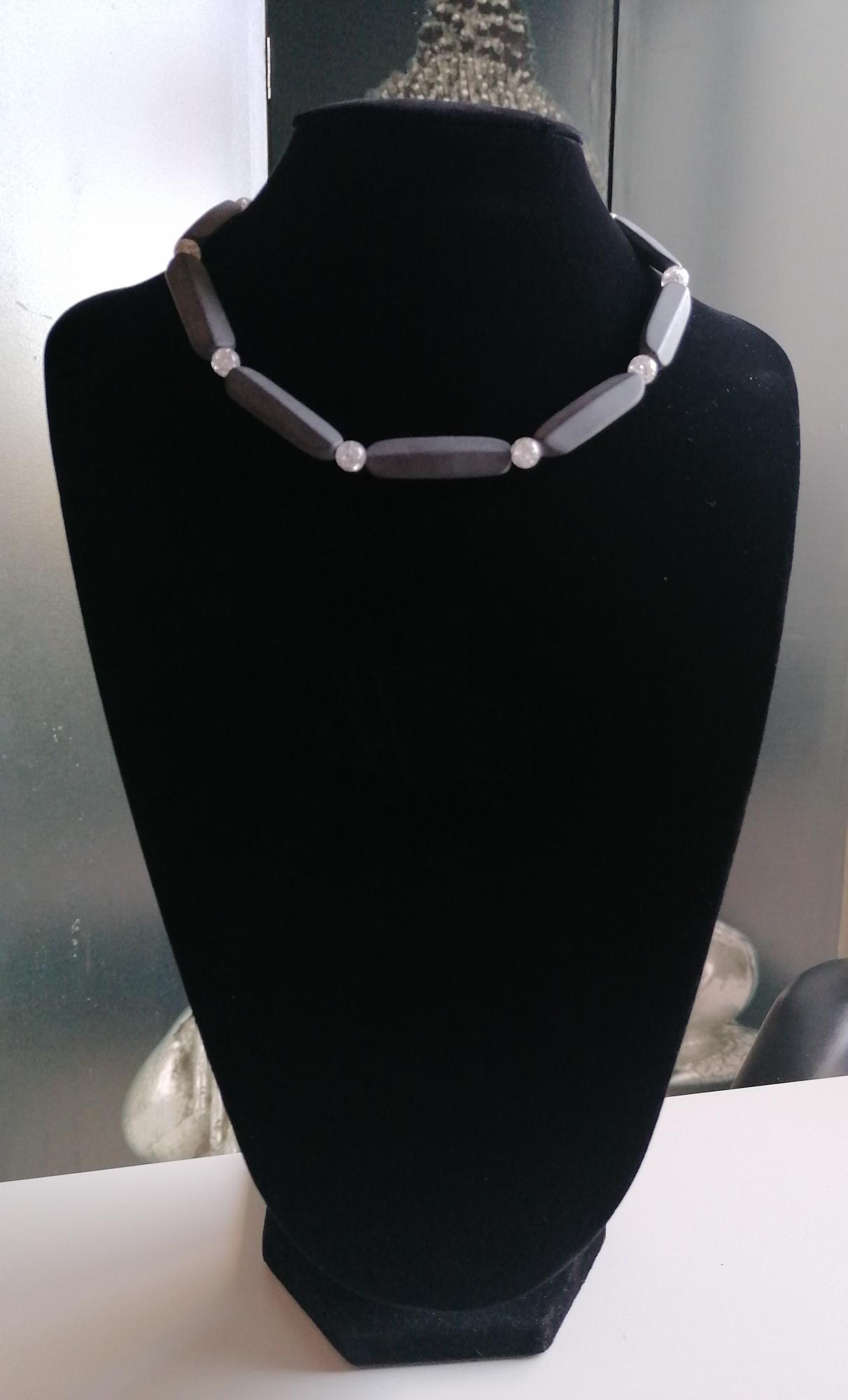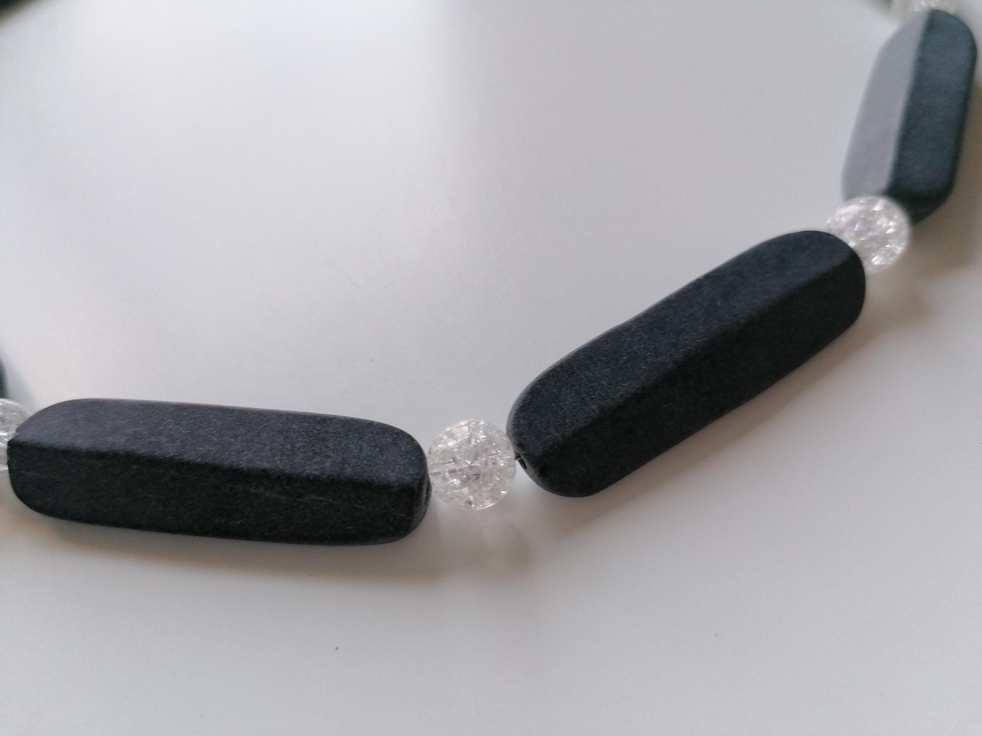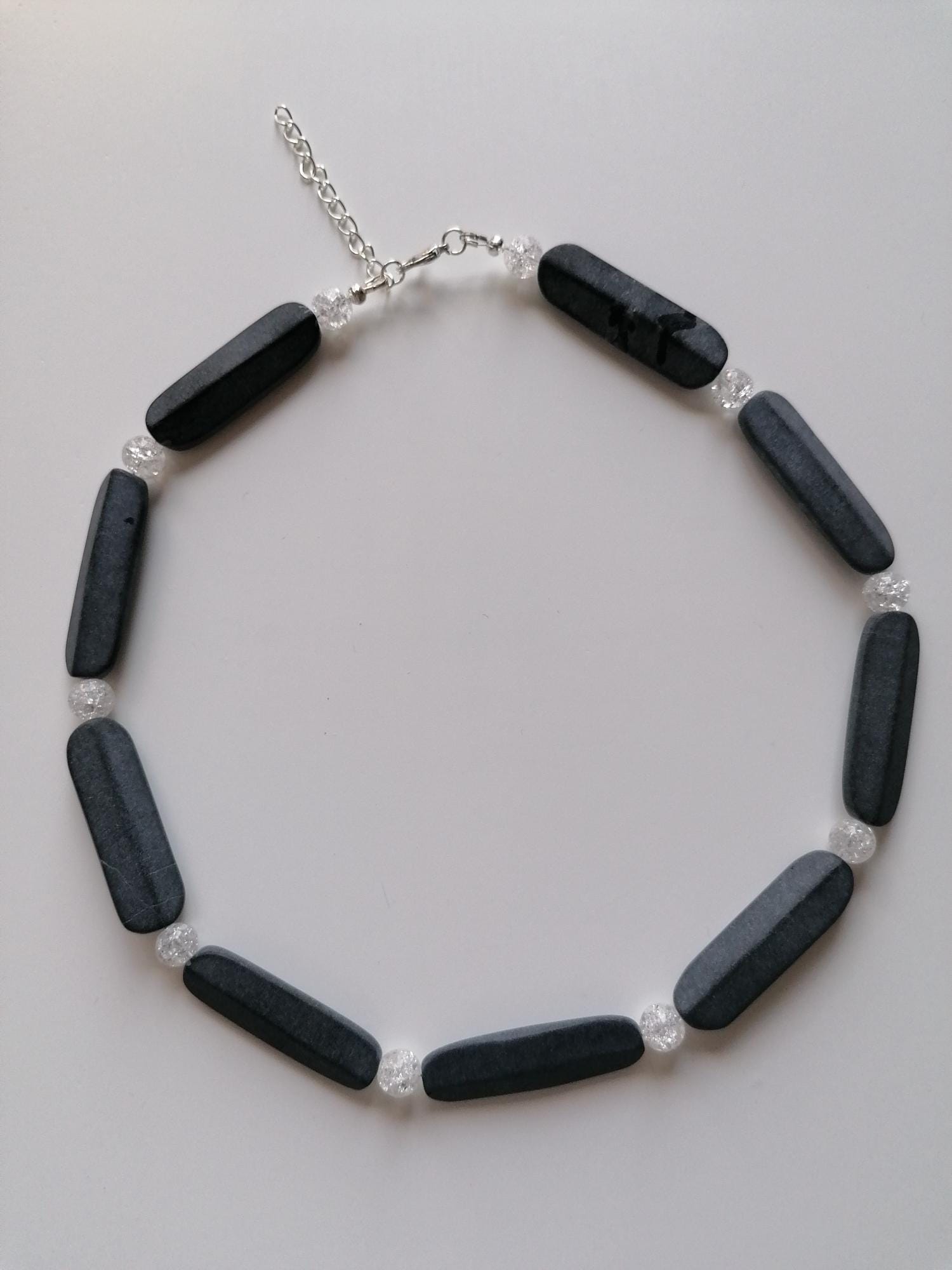 The necklace made of black/anthracite onyx with cracked rock crystal beads (8 mm) is 47.5 cm long plus an extension chain. The chain clasp and the extension chain are silver in color.