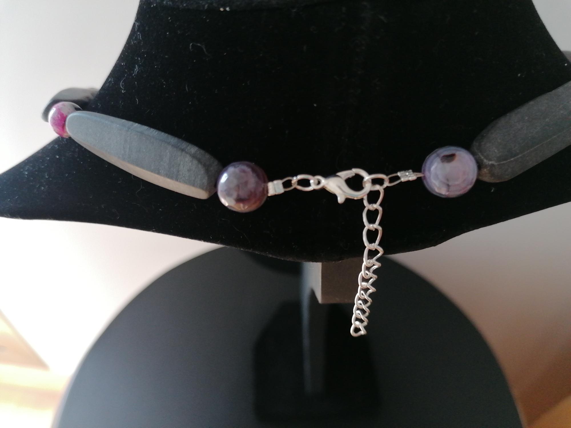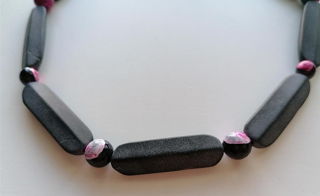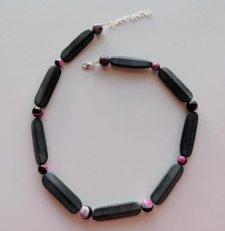 The chain is approximately 49 cm long plus an extension chain of approximately 4.5 cm. The piece of jewelry is made from matte onyx beads in black/anthracite (baguette beads are 40 mm x 13 mm x 7 mm) and round agate beads in black/pink (10 mm and 8 mm).