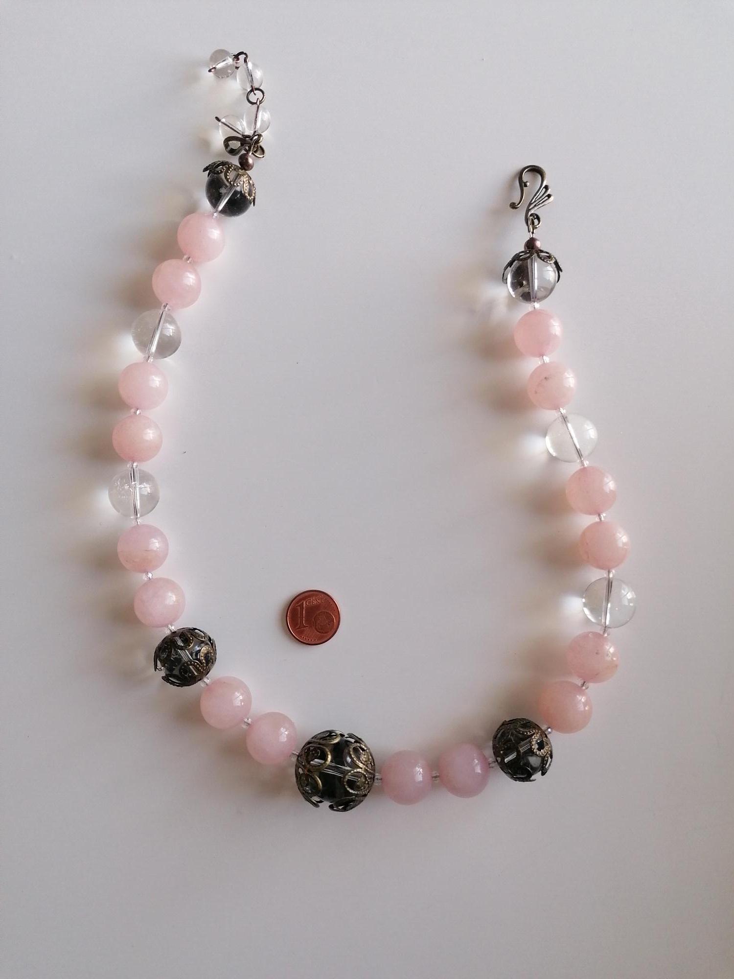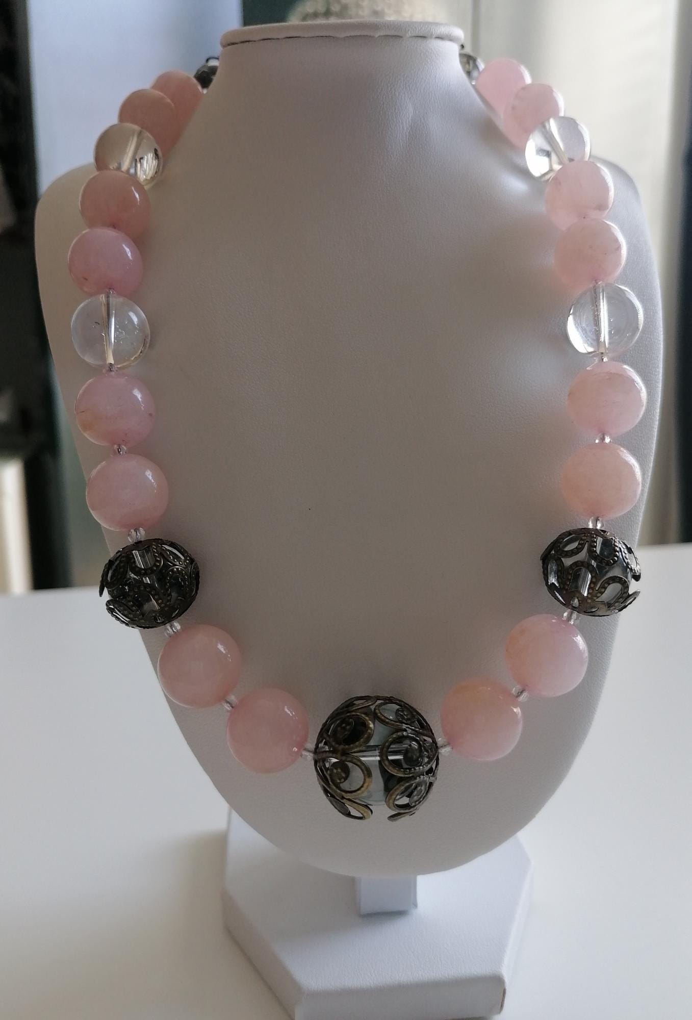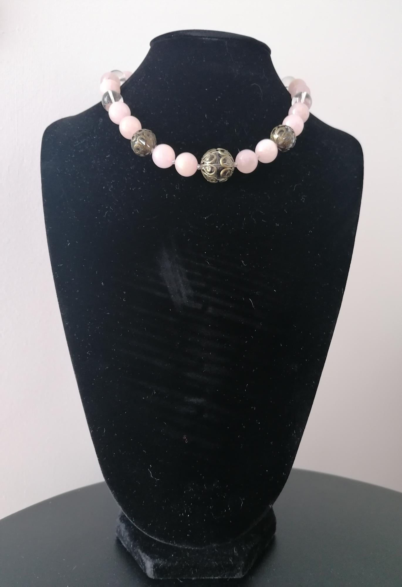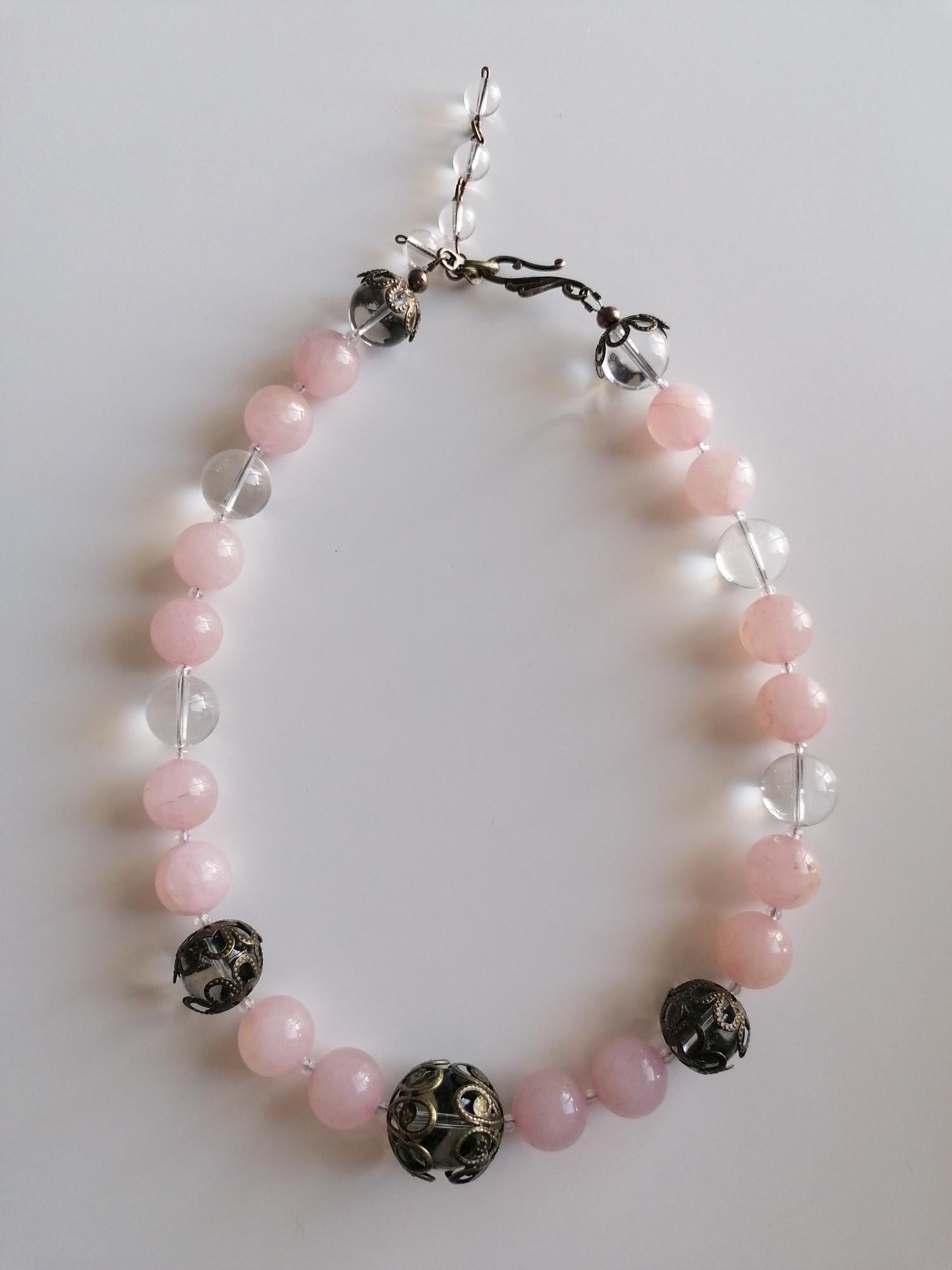 Handmade statement rose quartz necklace in a delicate rose hue. The necklace length is 47.5 cm plus an extension chain. The gemstone necklace is crafted from large round rose quartz beads (14 mm), round rock crystal beads (18 mm, 14 mm, and 8 mm), and faceted gray spinel beads (2 mm). The bead caps, clasp, and jump rings are bronze-colored.