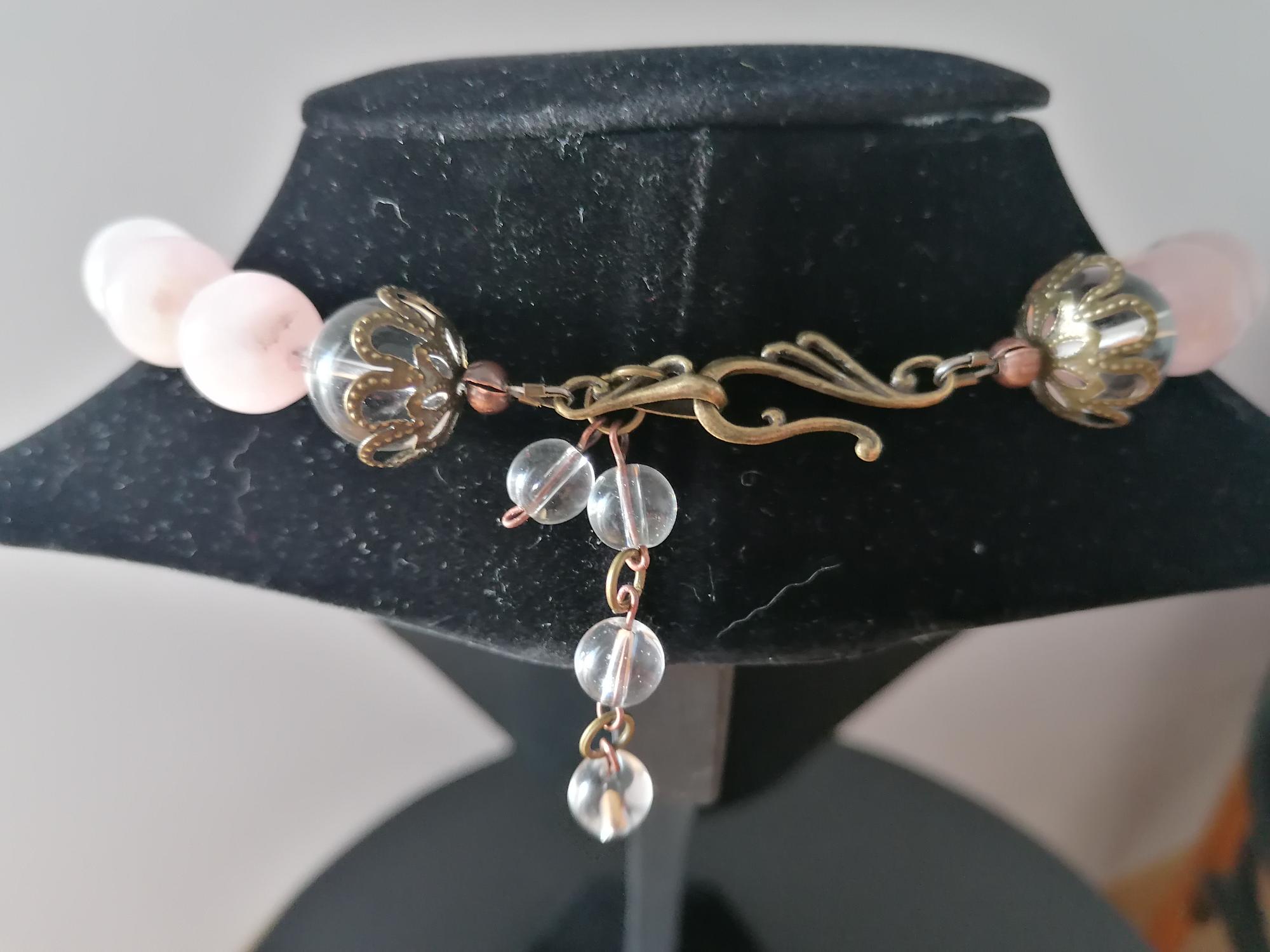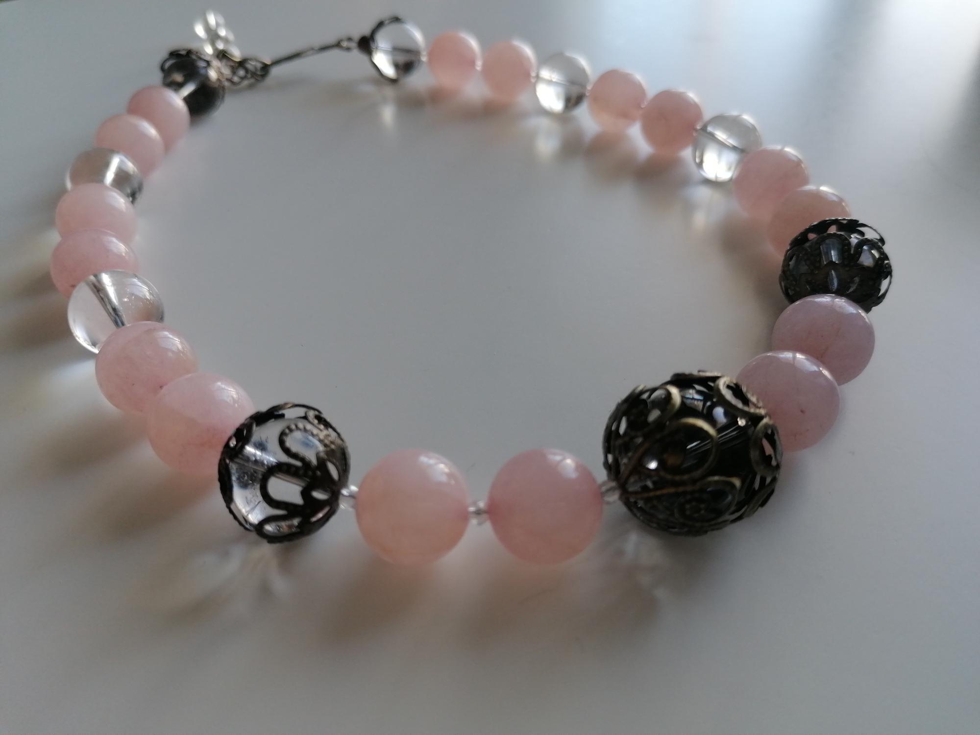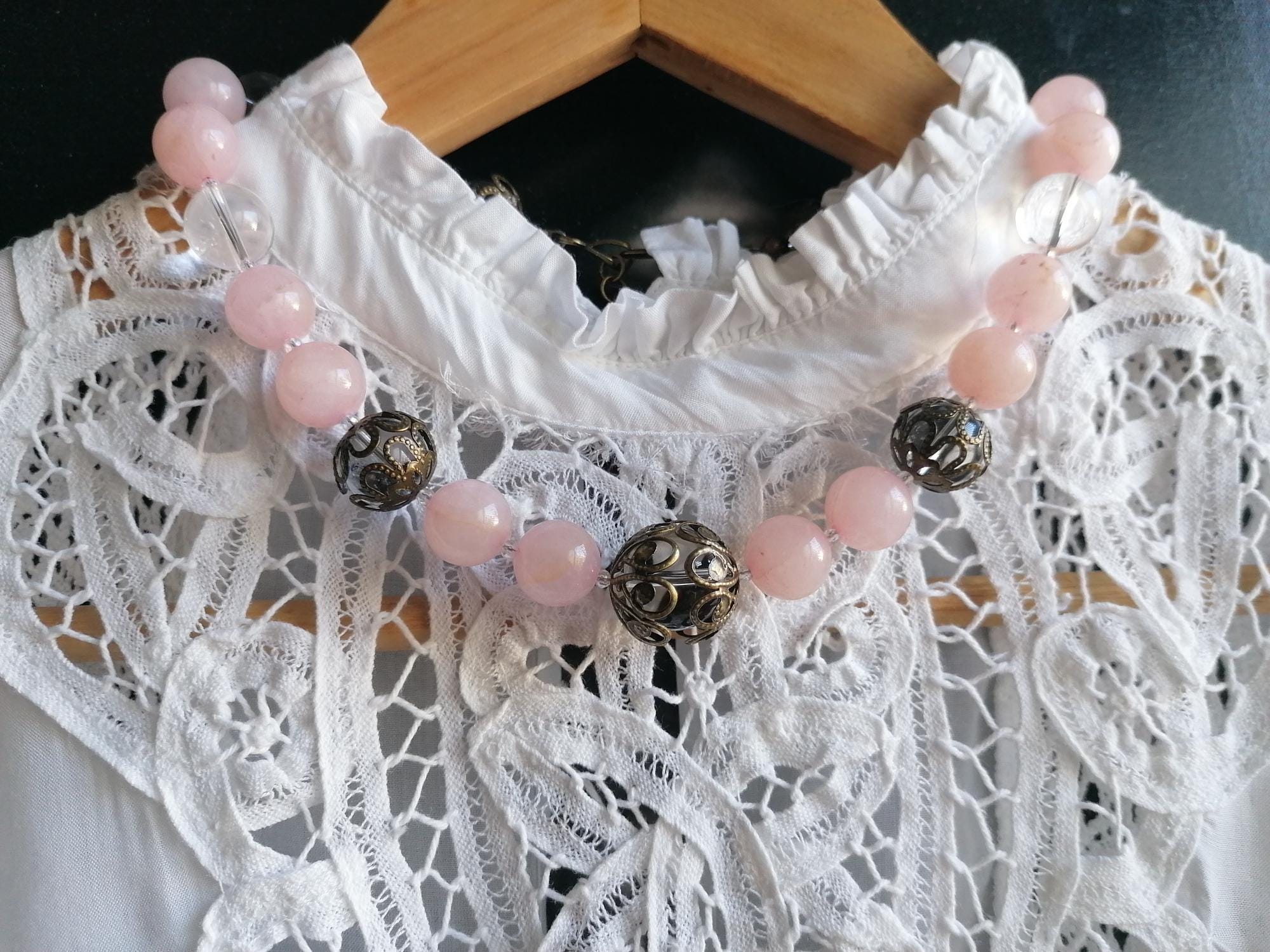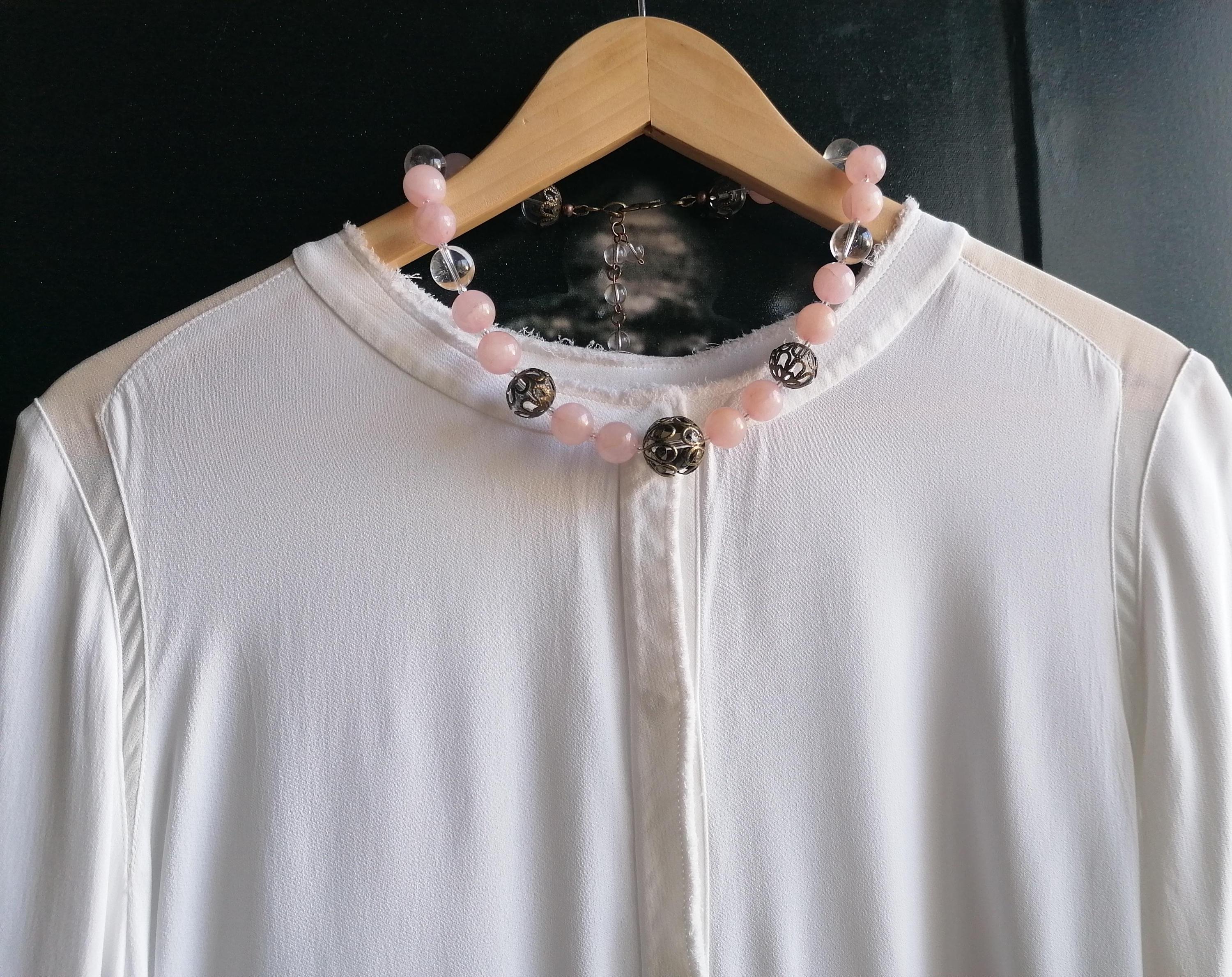 Handmade statement rose quartz necklace in a delicate rose hue. The necklace length is 47.5 cm plus an extension chain. The gemstone necklace is crafted from large round rose quartz beads (14 mm), round rock crystal beads (18 mm, 14 mm, and 8 mm), and faceted gray spinel beads (2 mm). The bead caps, clasp, and jump rings are bronze-colored.