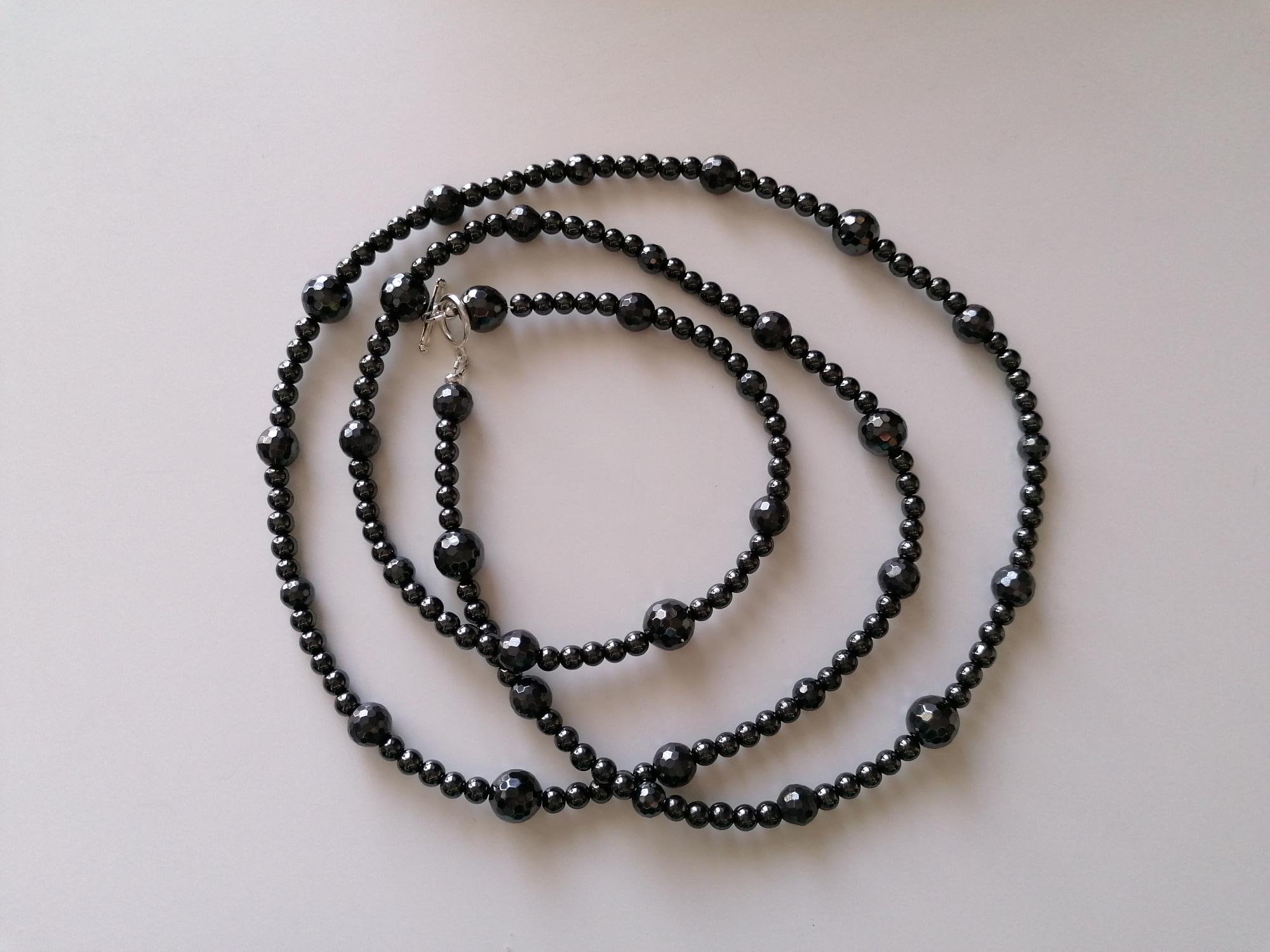 This black/anthracite hematite necklace is approximately 123 cm long. It features round, faceted hematite beads (12 mm, 10 mm, and 8 mm) and small, smooth hematite beads (6 mm). The toggle clasp is silver-colored. This delicate necklace can be worn in various ways, including as a bracelet. It's perfect for everyday wear, special occasions, or layering with other necklaces. A wonderful gift!