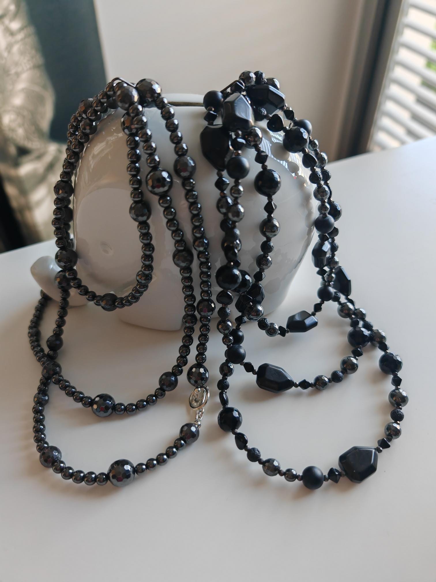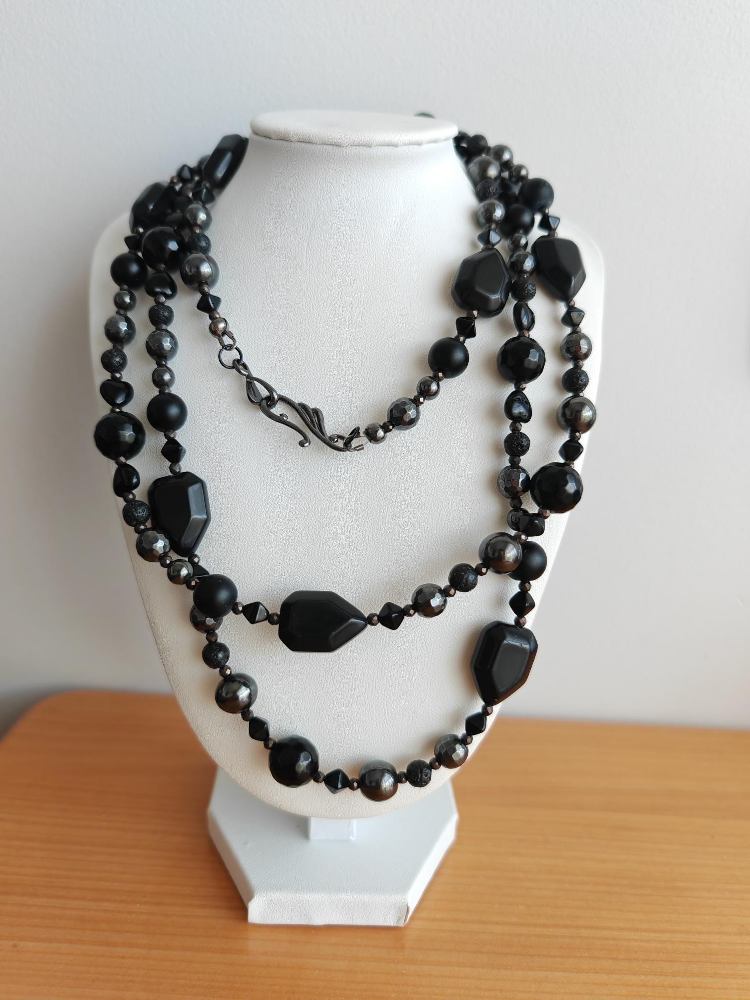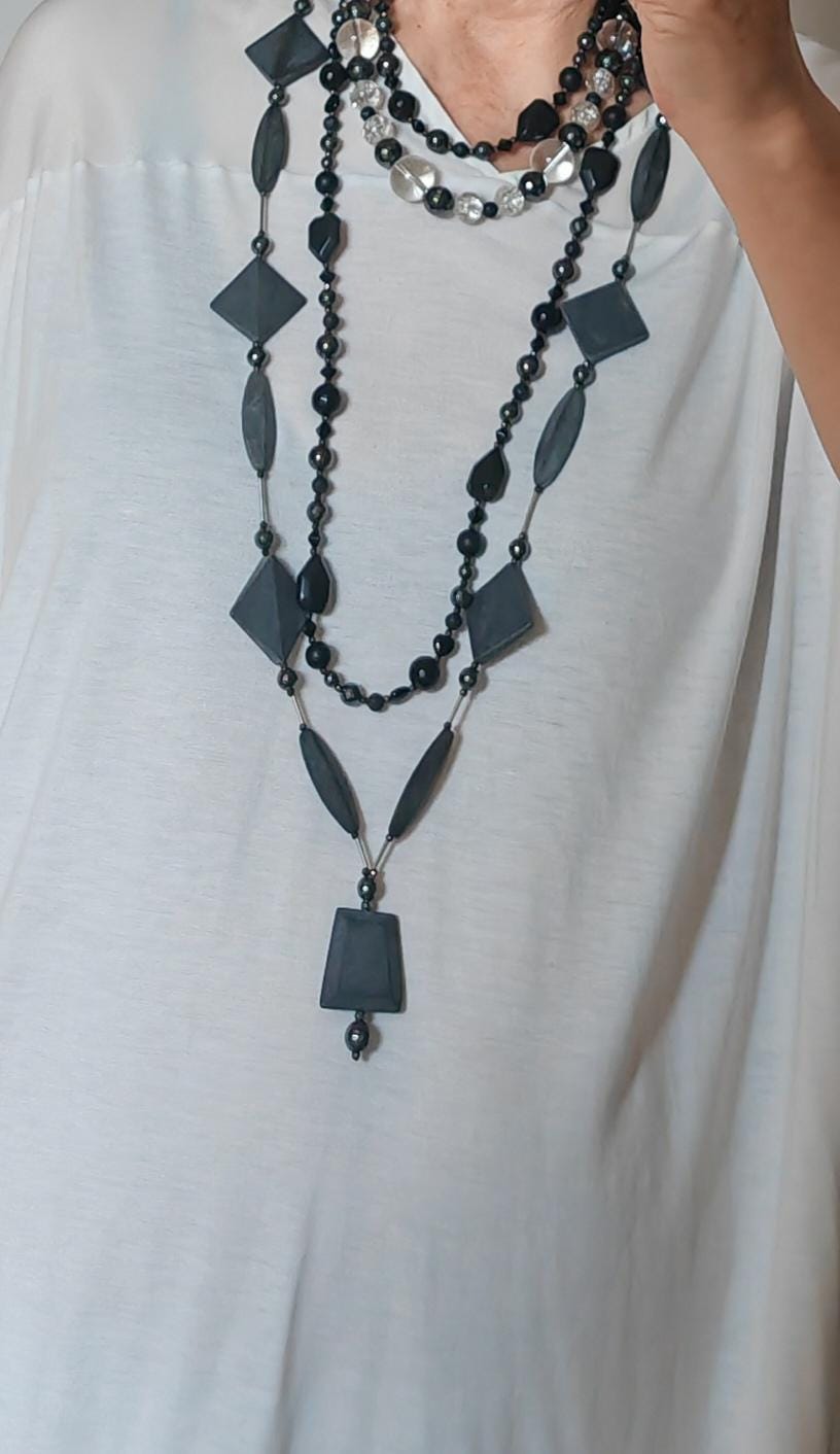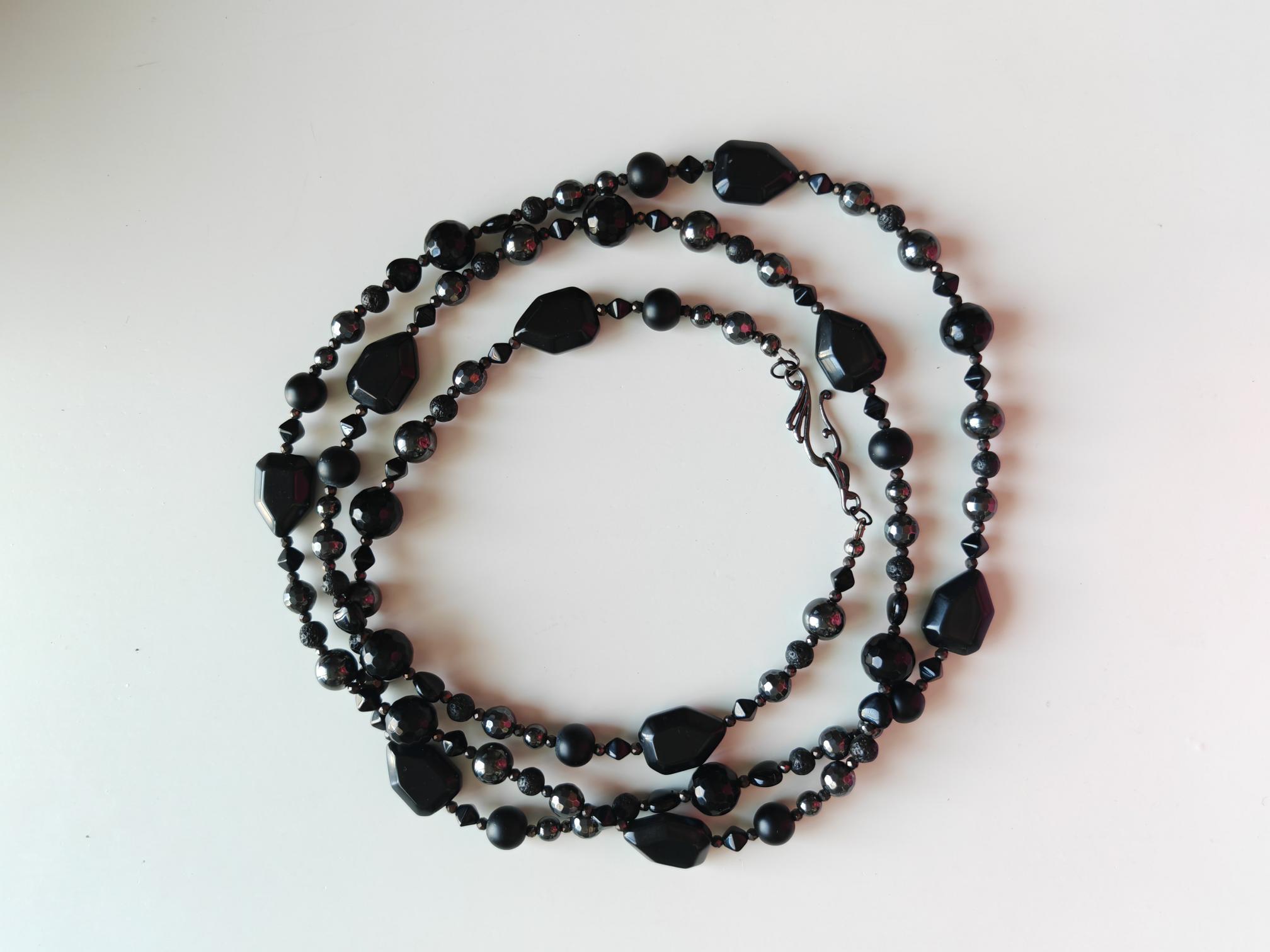 The second necklace features a monochrome design made from various black and anthracite stones. The necklace is approximately 128 cm long. It is crafted from round hematite beads (faceted beads 8 mm, high-gloss beads 10 mm, and 6 mm), small lava stone beads (6 mm), onyx beads (faceted beads 12 mm, round matte beads 10 mm, and square beads 22 mm x 15 mm x 9 mm), faceted spinel beads in black and anthracite (3 mm), and black Bohemian glass beads (small pyramids approx. 5 mm and hex beads approx. 8 mm). The S-shaped clasp is black. This delicate necklace can be worn in various ways, including as a bracelet. It is suitable for everyday wear as well as for special occasions, in summer or winter, and can be combined with other necklaces. A wonderful piece of jewelry to give as a gift!