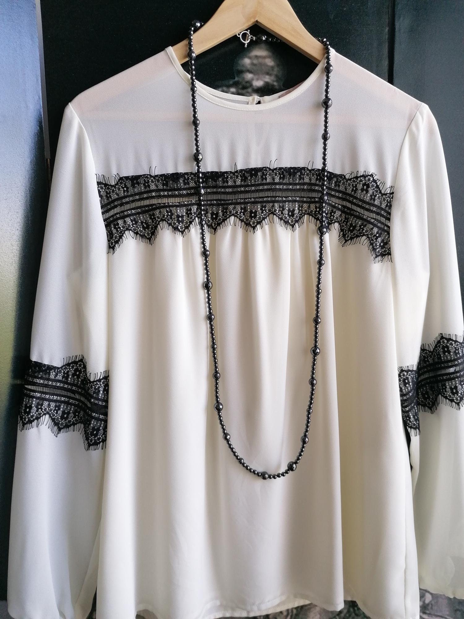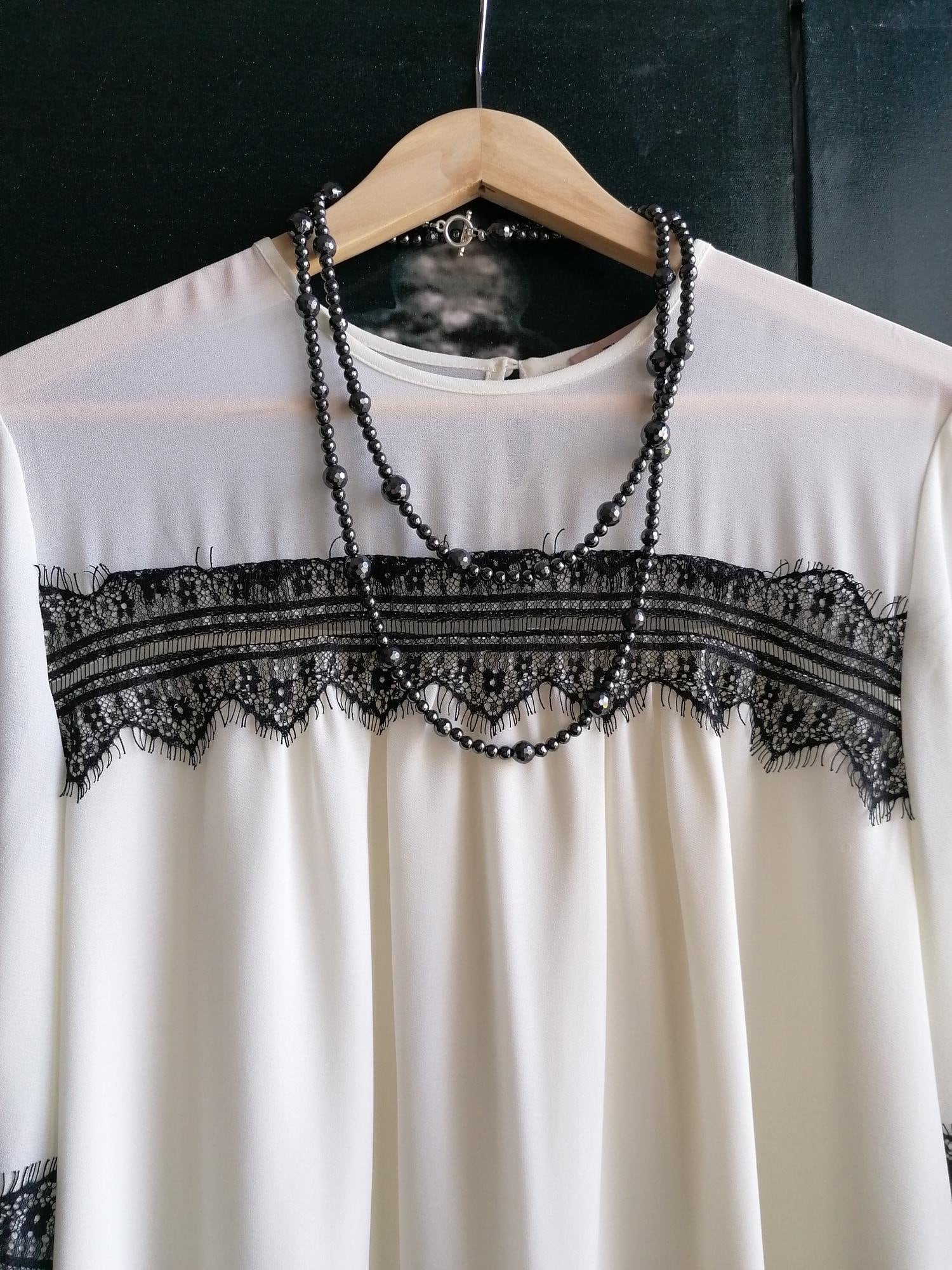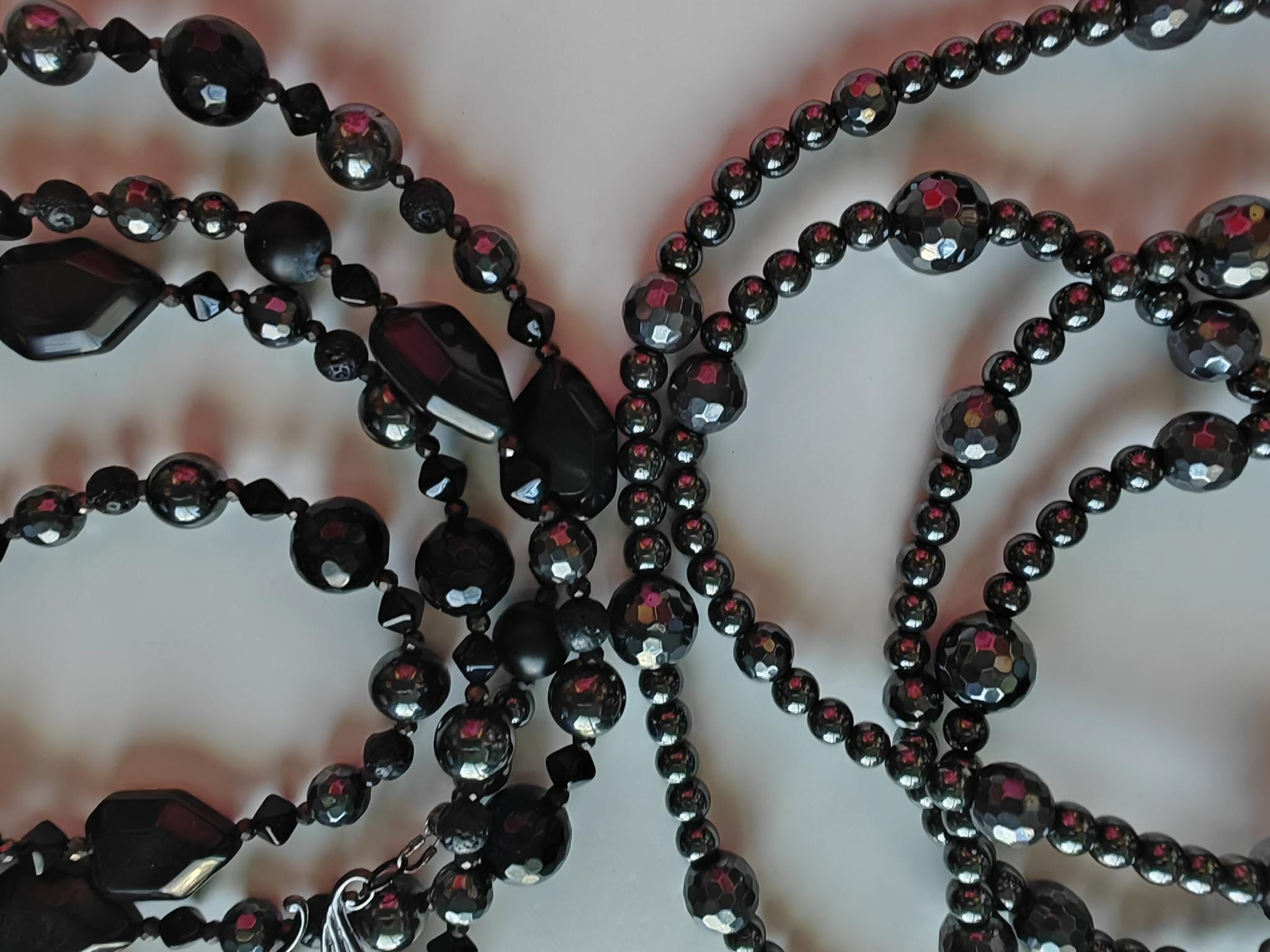 The second necklace features a monochrome design made from various black and anthracite stones. The necklace is approximately 128 cm long. It is crafted from round hematite beads (faceted beads 8 mm, high-gloss beads 10 mm, and 6 mm), small lava stone beads (6 mm), onyx beads (faceted beads 12 mm, round matte beads 10 mm, and square beads 22 mm x 15 mm x 9 mm), faceted spinel beads in black and anthracite (3 mm), and black Bohemian glass beads (small pyramids approx. 5 mm and hex beads approx. 8 mm). The S-shaped clasp is black. This delicate necklace can be worn in various ways, including as a bracelet. It is suitable for everyday wear as well as for special occasions, in summer or winter, and can be combined with other necklaces. A wonderful piece of jewelry to give as a gift!