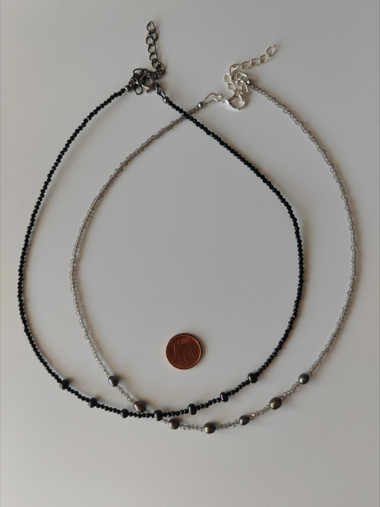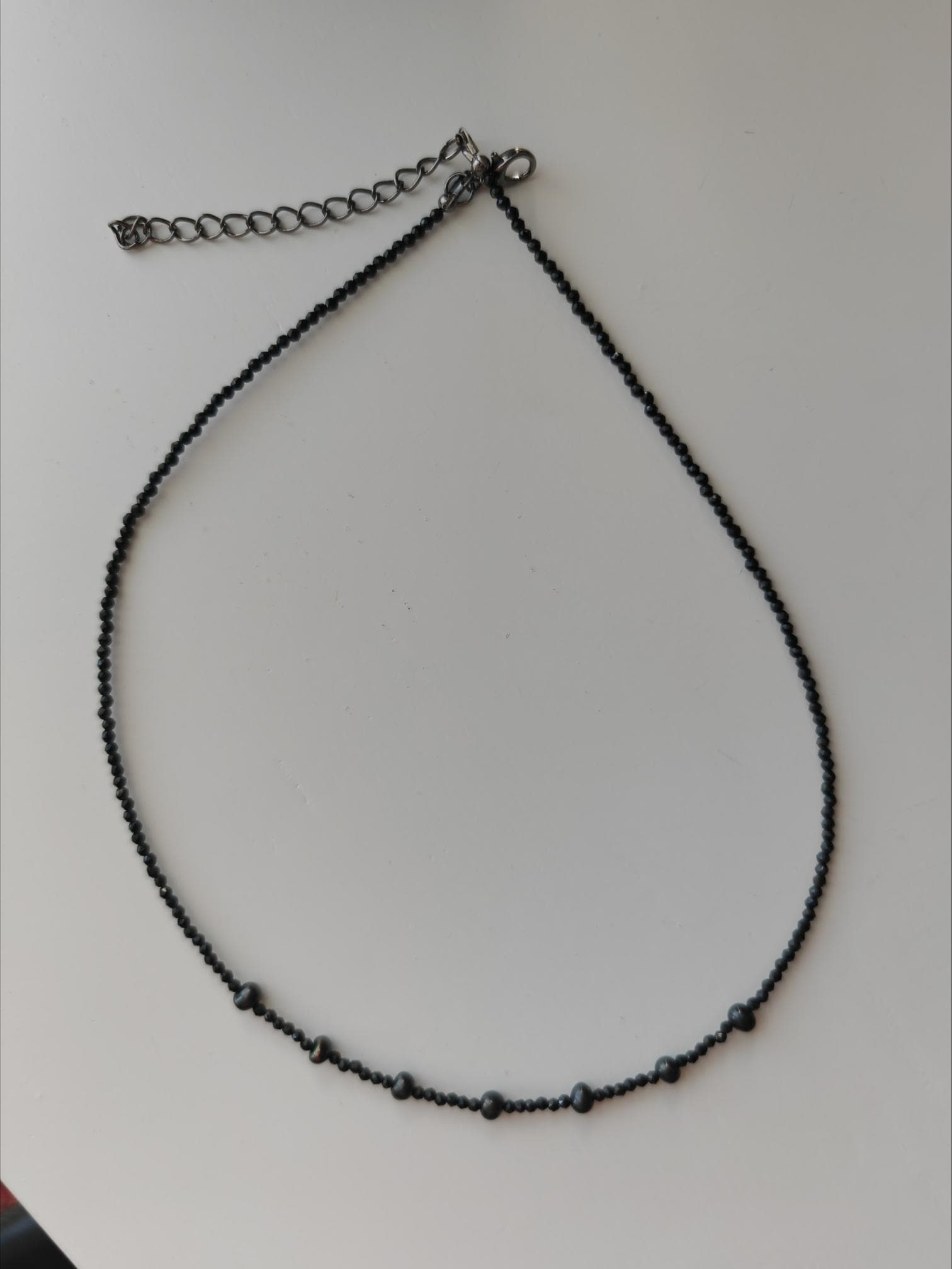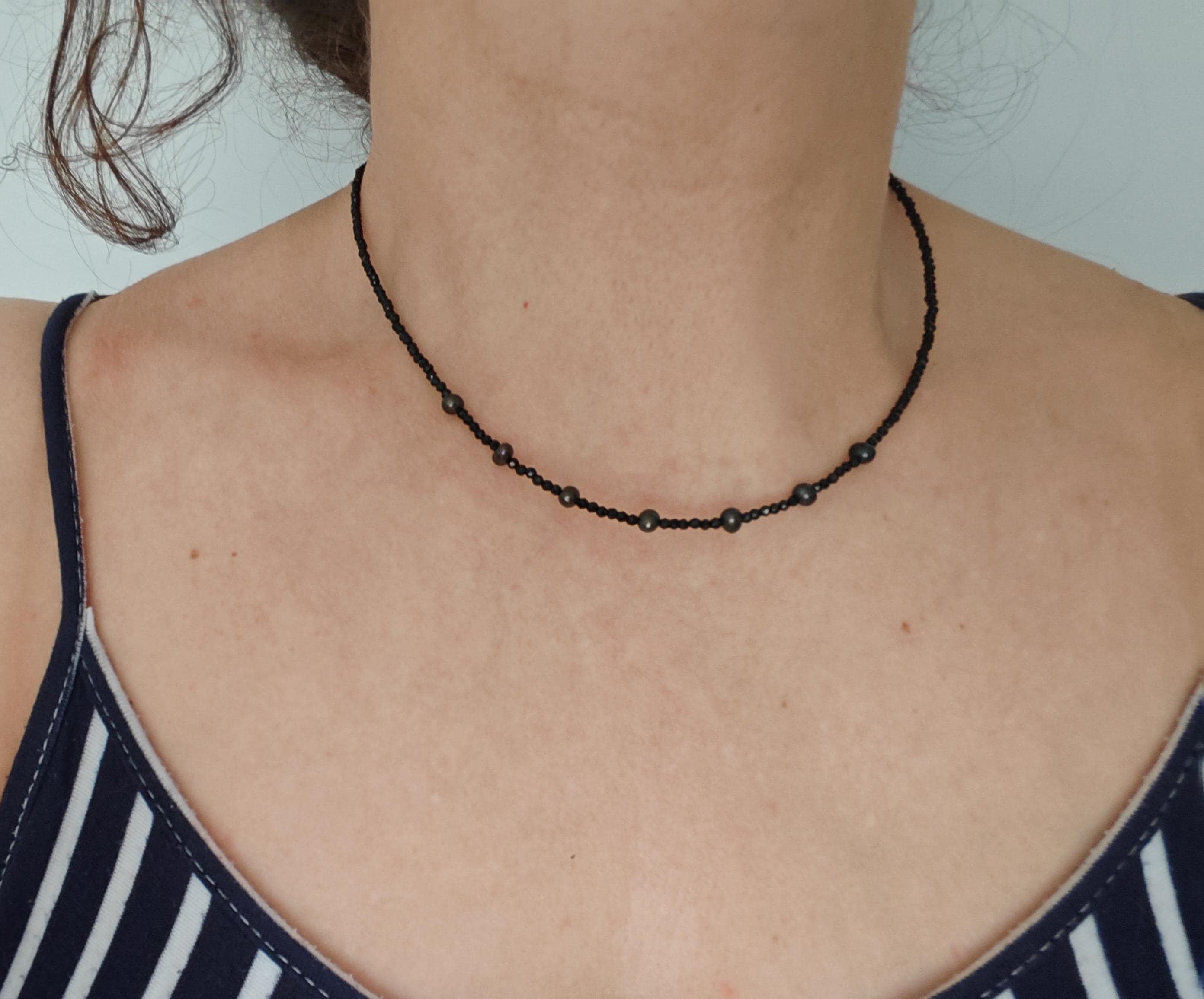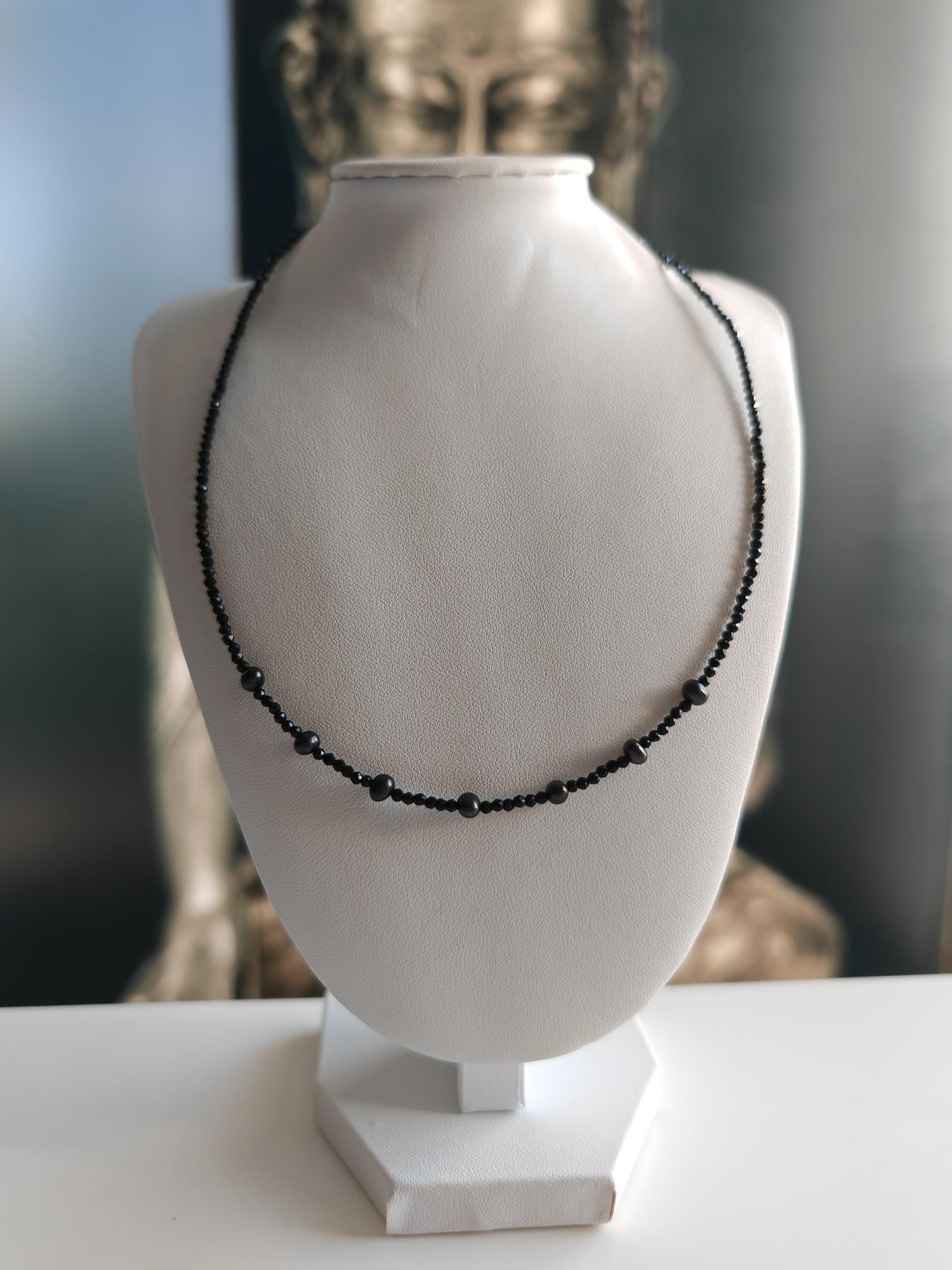 This delicate black necklace is crafted from faceted black spinel beads (2 mm) and black freshwater pearls (approx. 4 mm). The necklace is approximately 44 cm long, plus an extension chain. The clasp and extension chain are black.