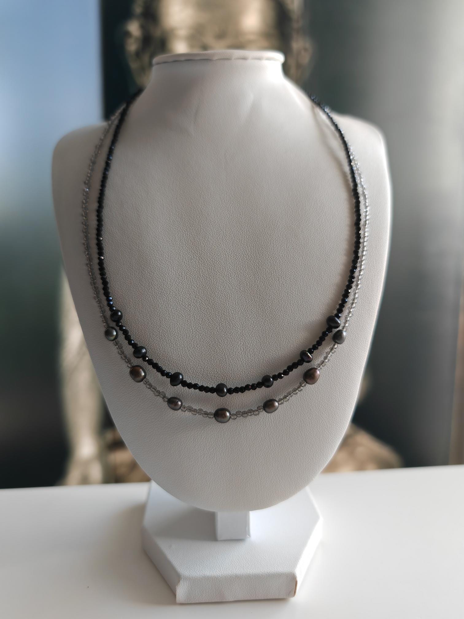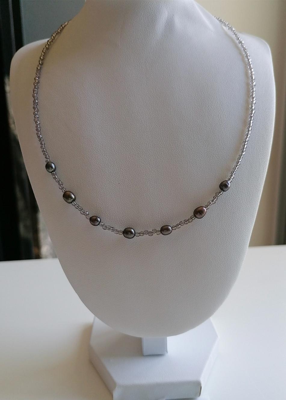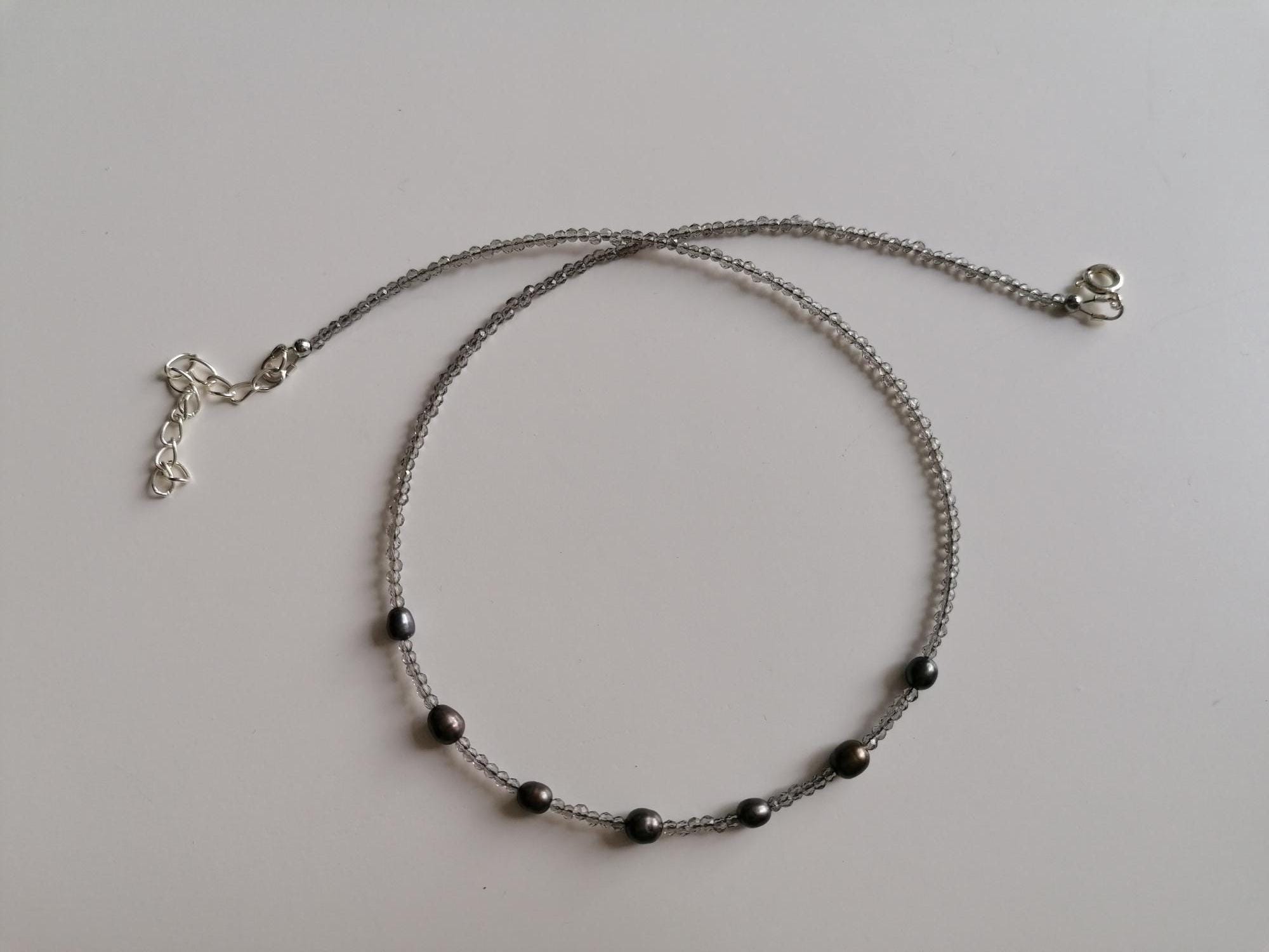 This delicate grey necklace is crafted from faceted grey spinel beads (2 mm) and grey freshwater pearls (4-5 mm). The necklace is approximately 44 cm long, plus an extension chain. The clasp and extension chain are silver-colored.