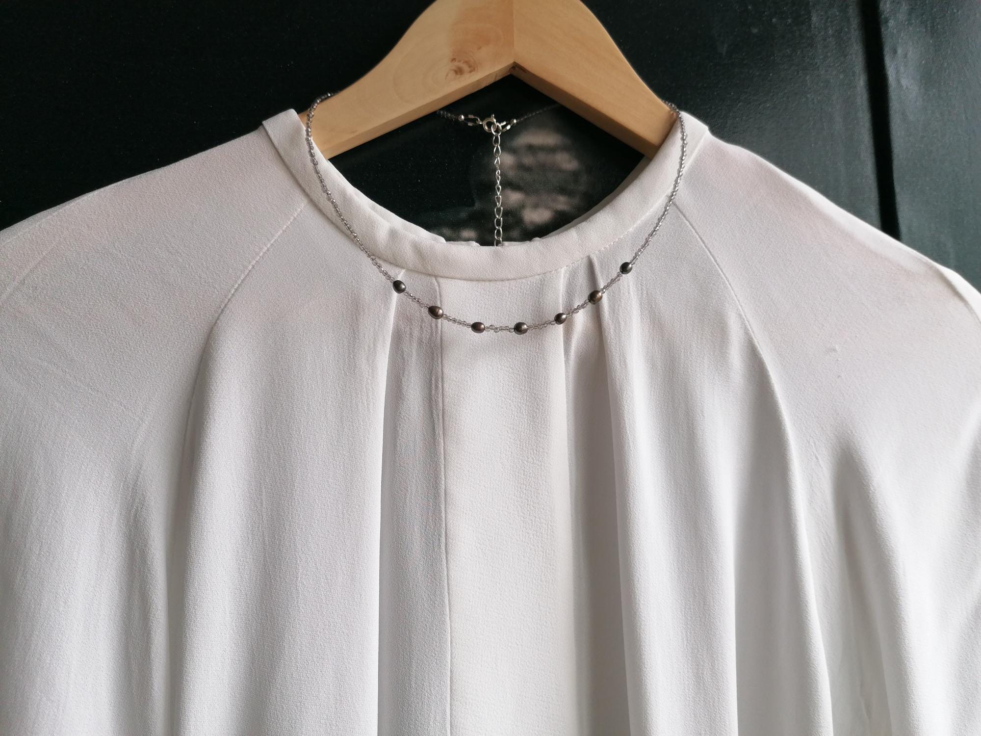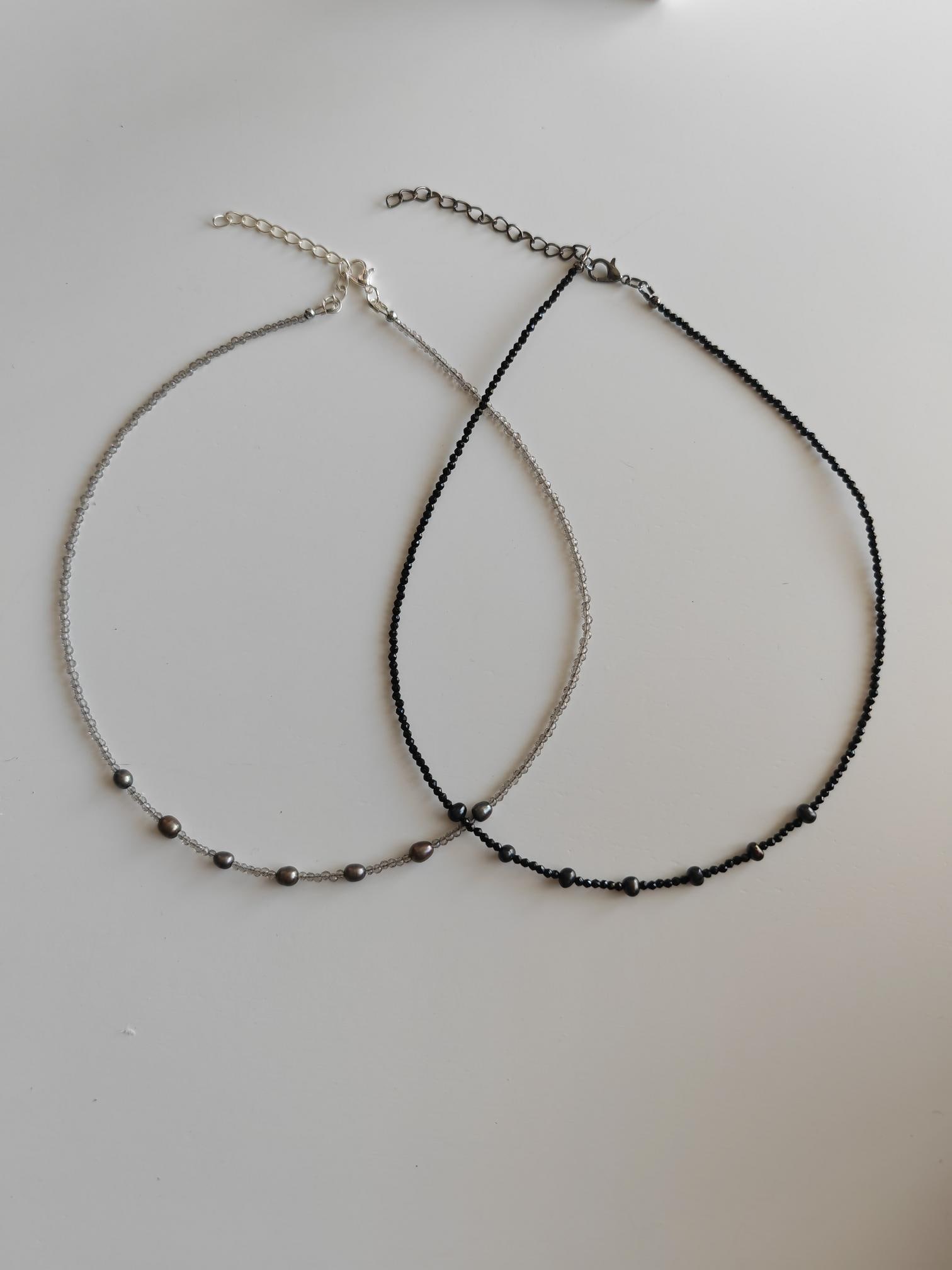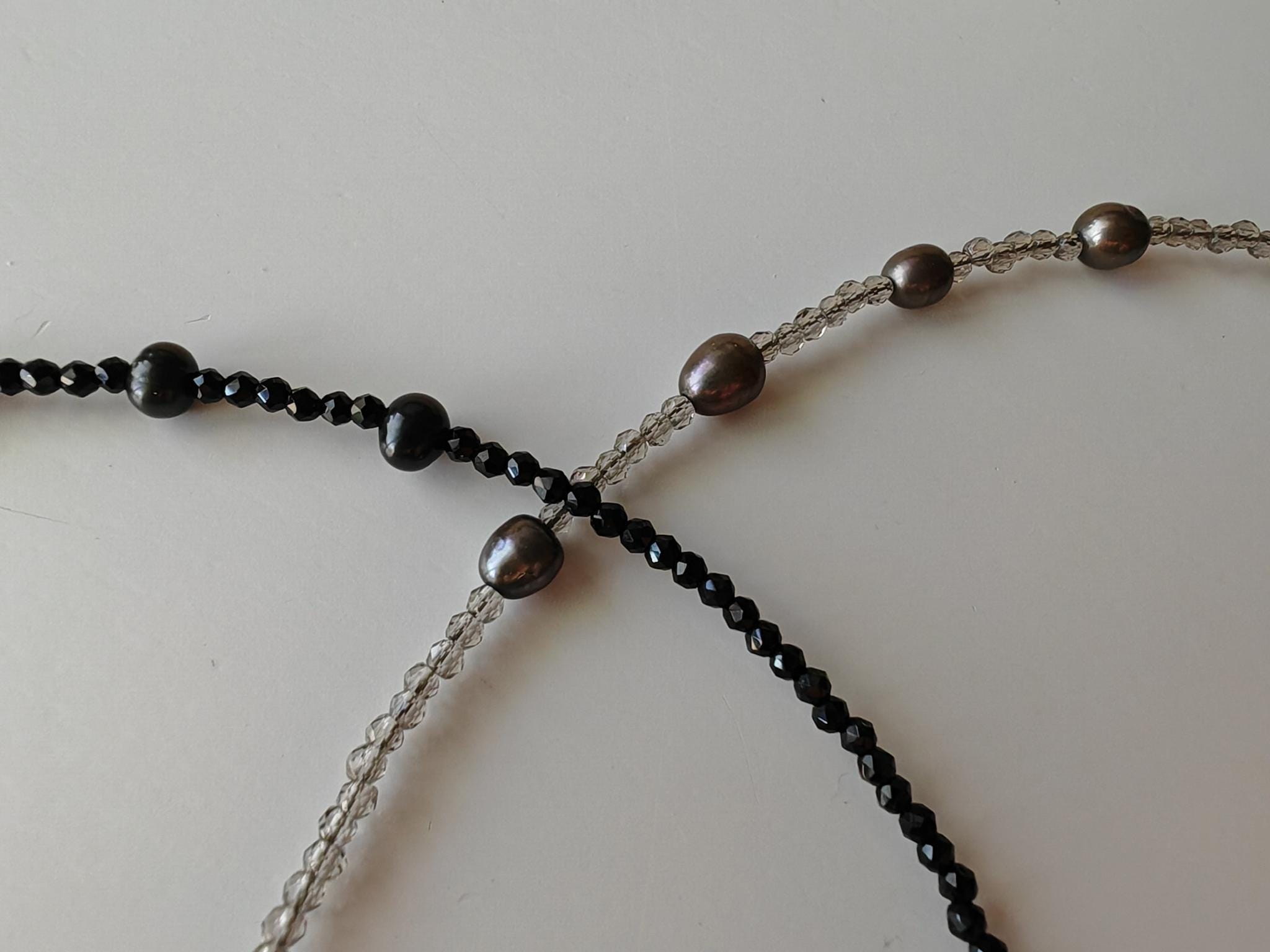 This delicate grey necklace is crafted from faceted grey spinel beads (2 mm) and grey freshwater pearls (4-5 mm). The necklace is approximately 44 cm long, plus an extension chain. The clasp and extension chain are silver-colored.