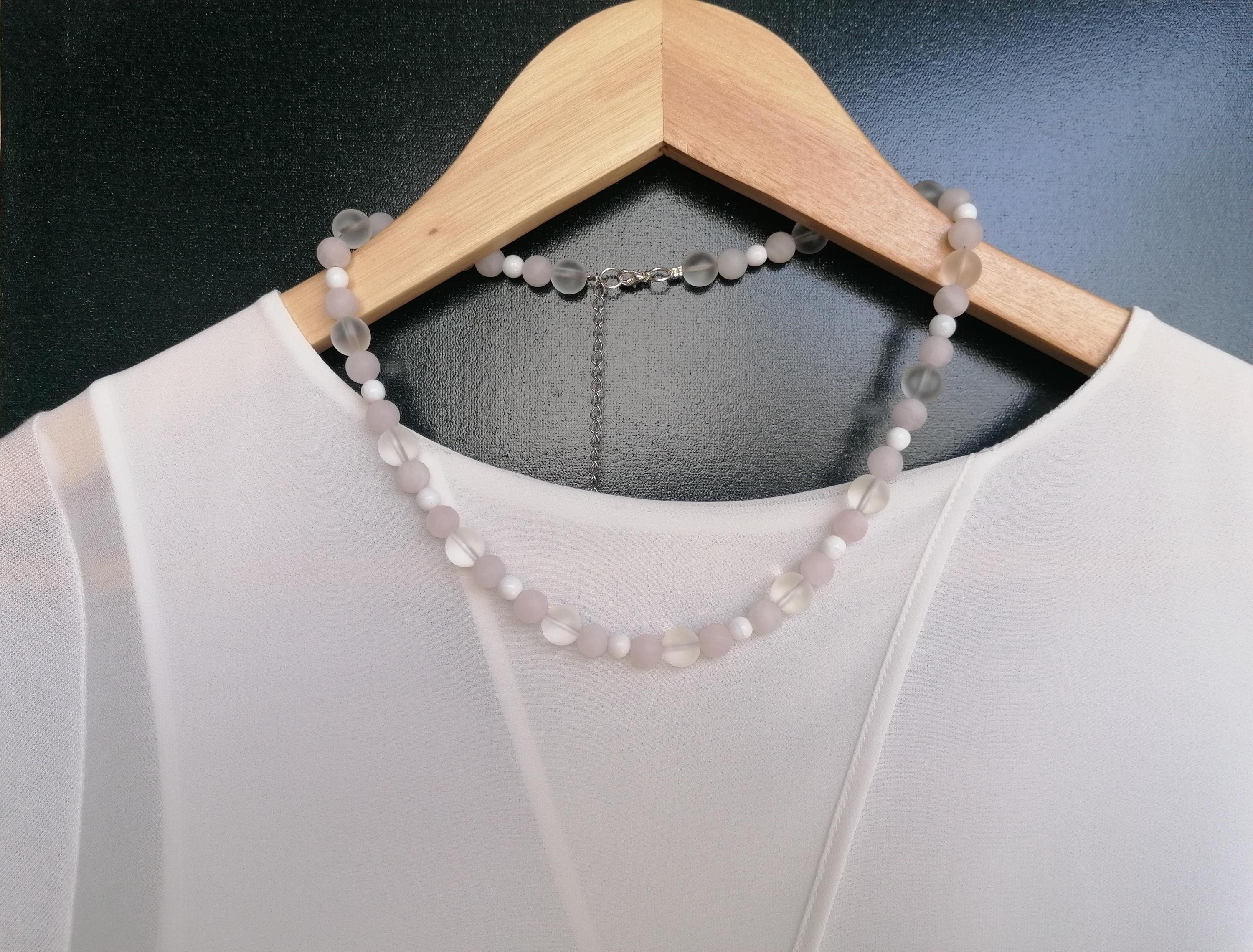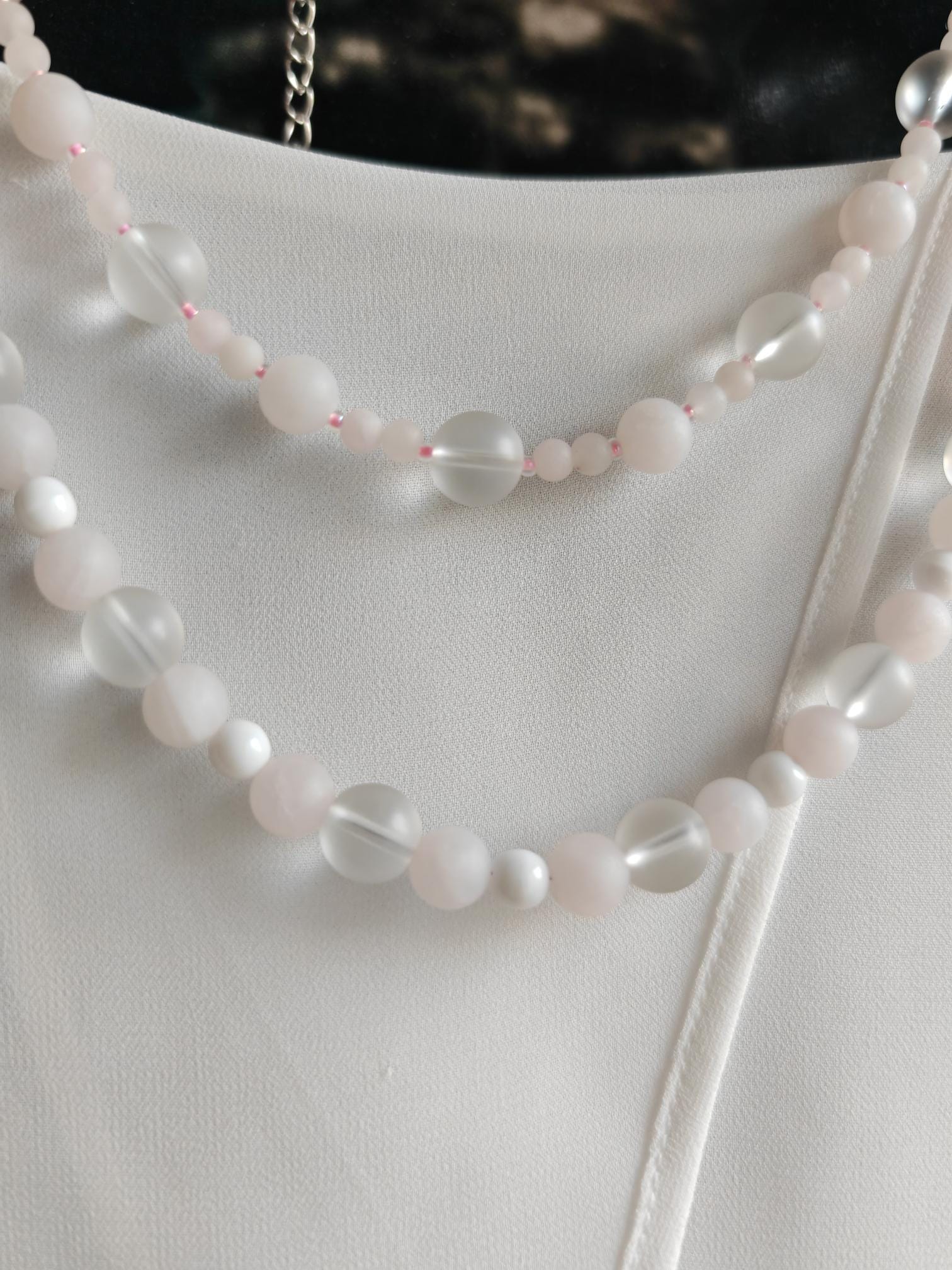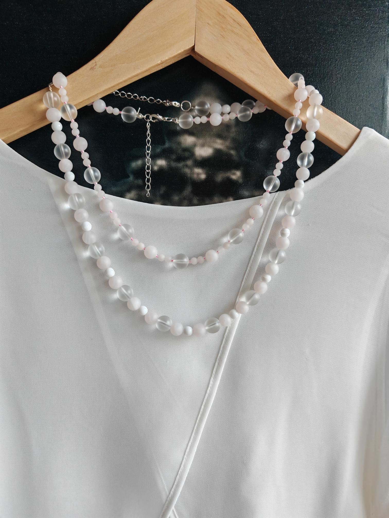 The first necklace (with white pearls) is made of matte rose quartz beads (8 mm), matte rock crystal beads (10 mm), and white high-luster beads (Bohemian glass beads, 6 mm). The 48 cm long necklace has a 7 cm extender. The clasp and extender are silver.