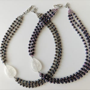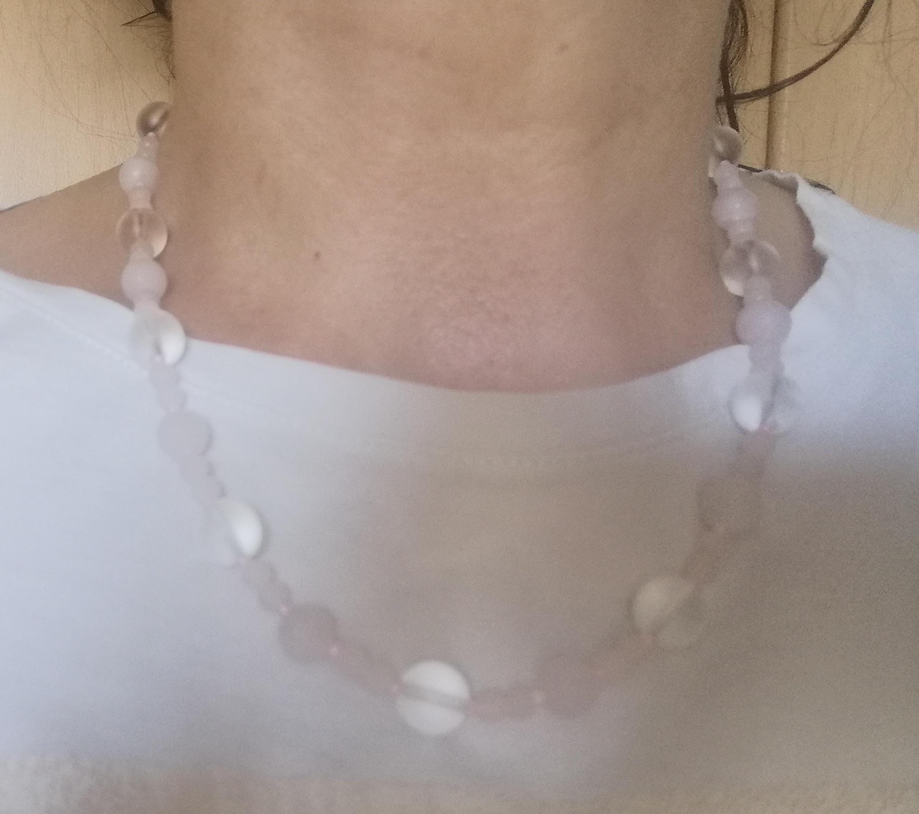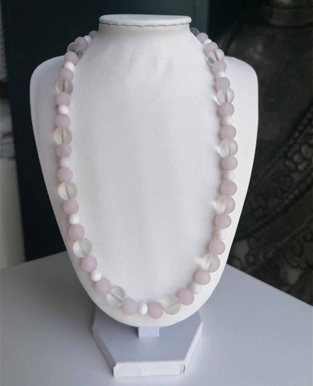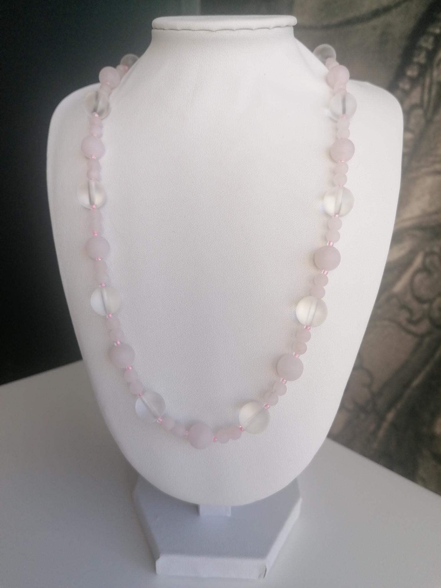 The first necklace (with white pearls) is made of matte rose quartz beads (8 mm), matte rock crystal beads (10 mm), and white high-luster beads (Bohemian glass beads, 6 mm). The 48 cm long necklace has a 7 cm extender. The clasp and extender are silver.