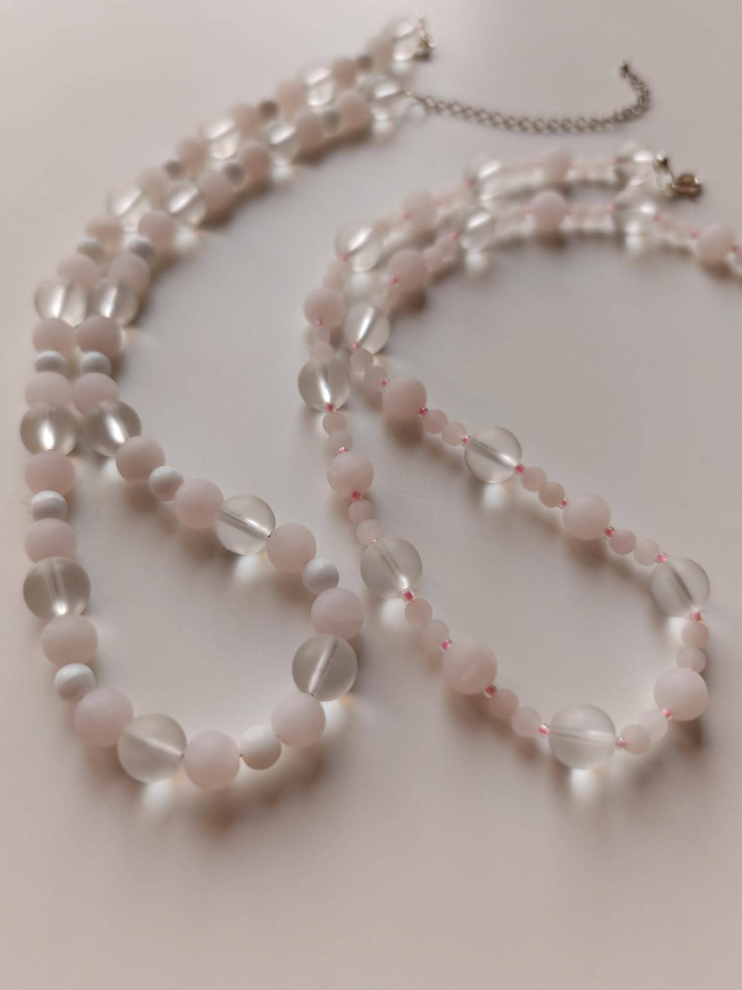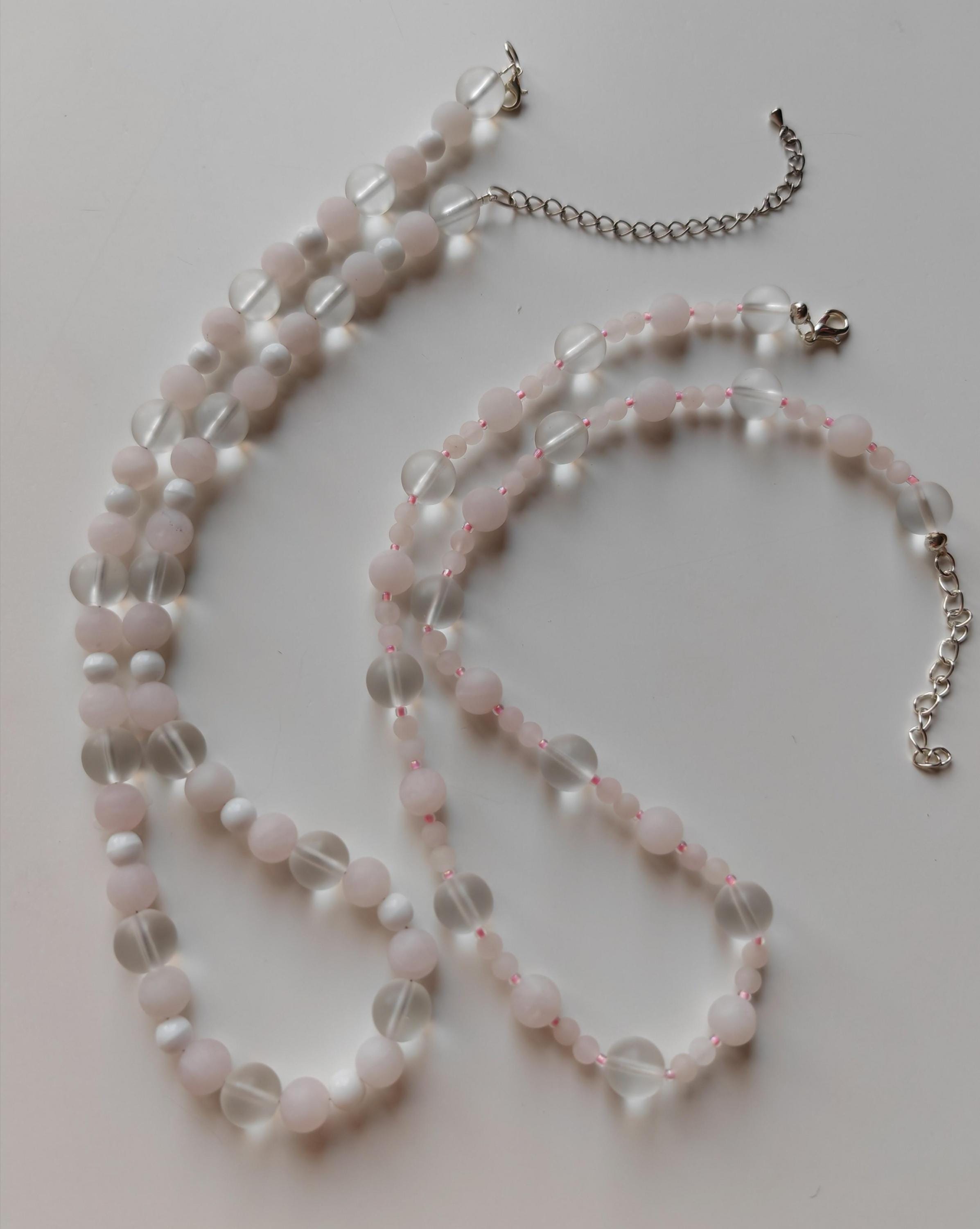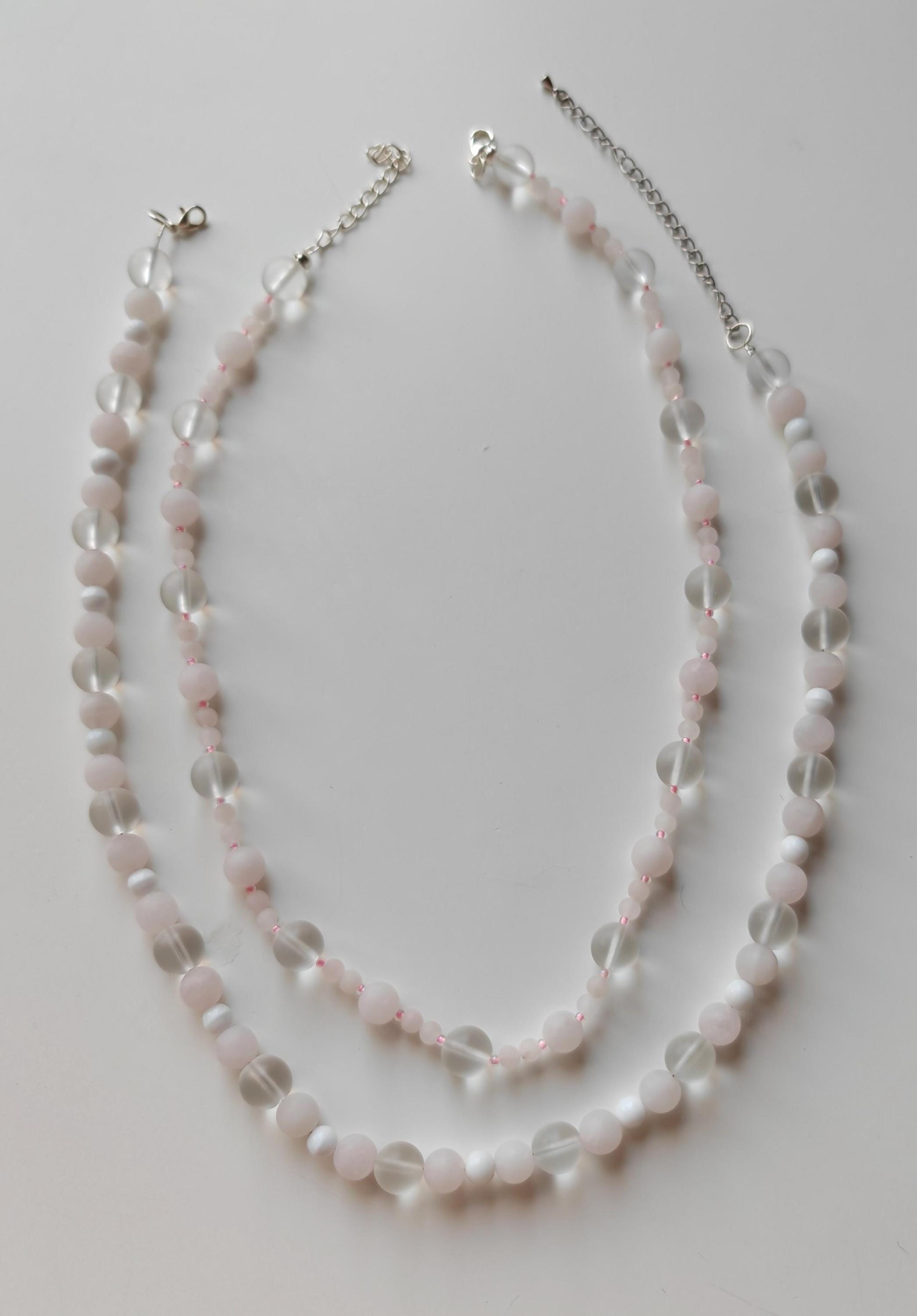 Handmade gemstone necklaces made of rose quartz and rock crystal in rose/white. Two chain options are available.