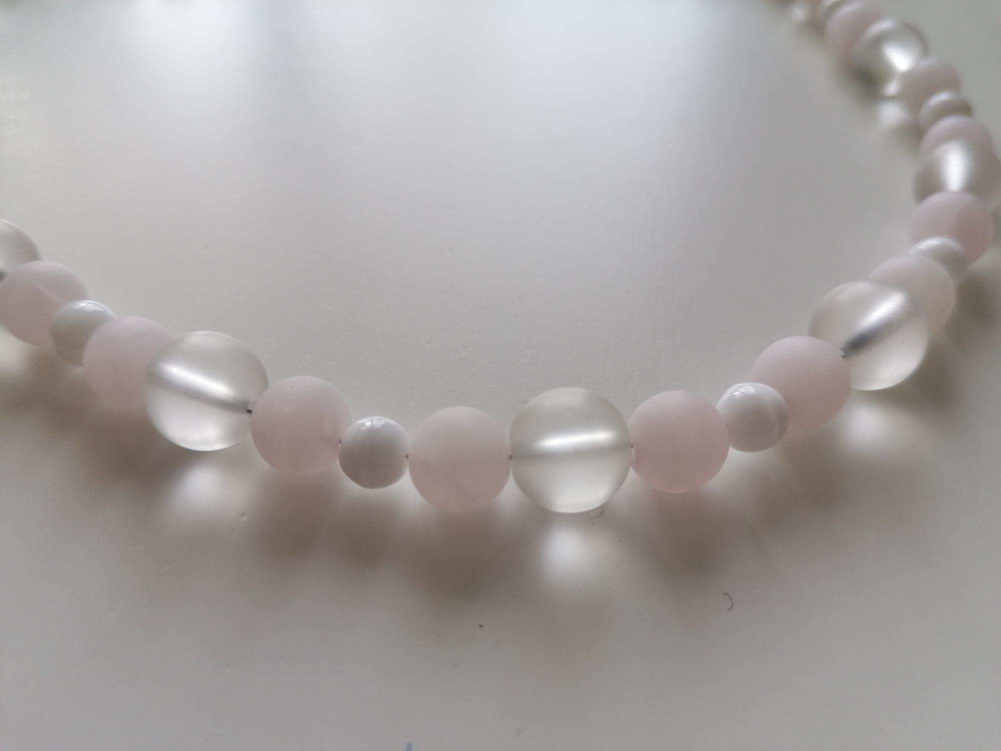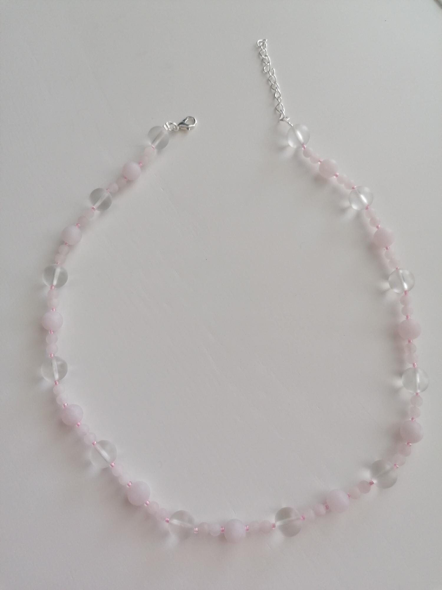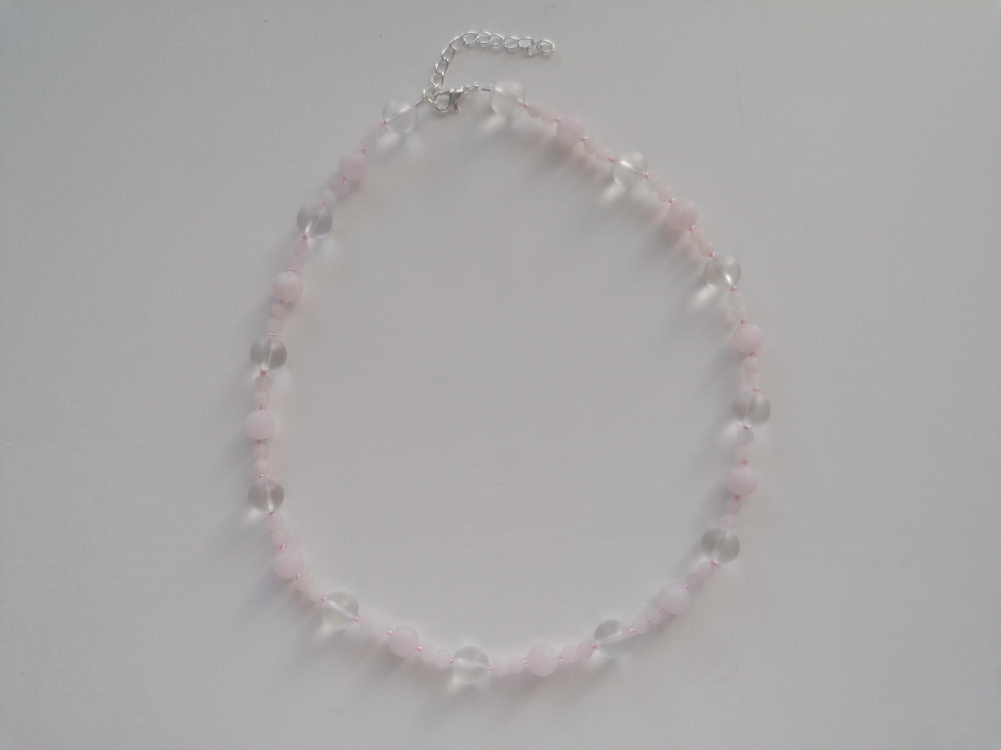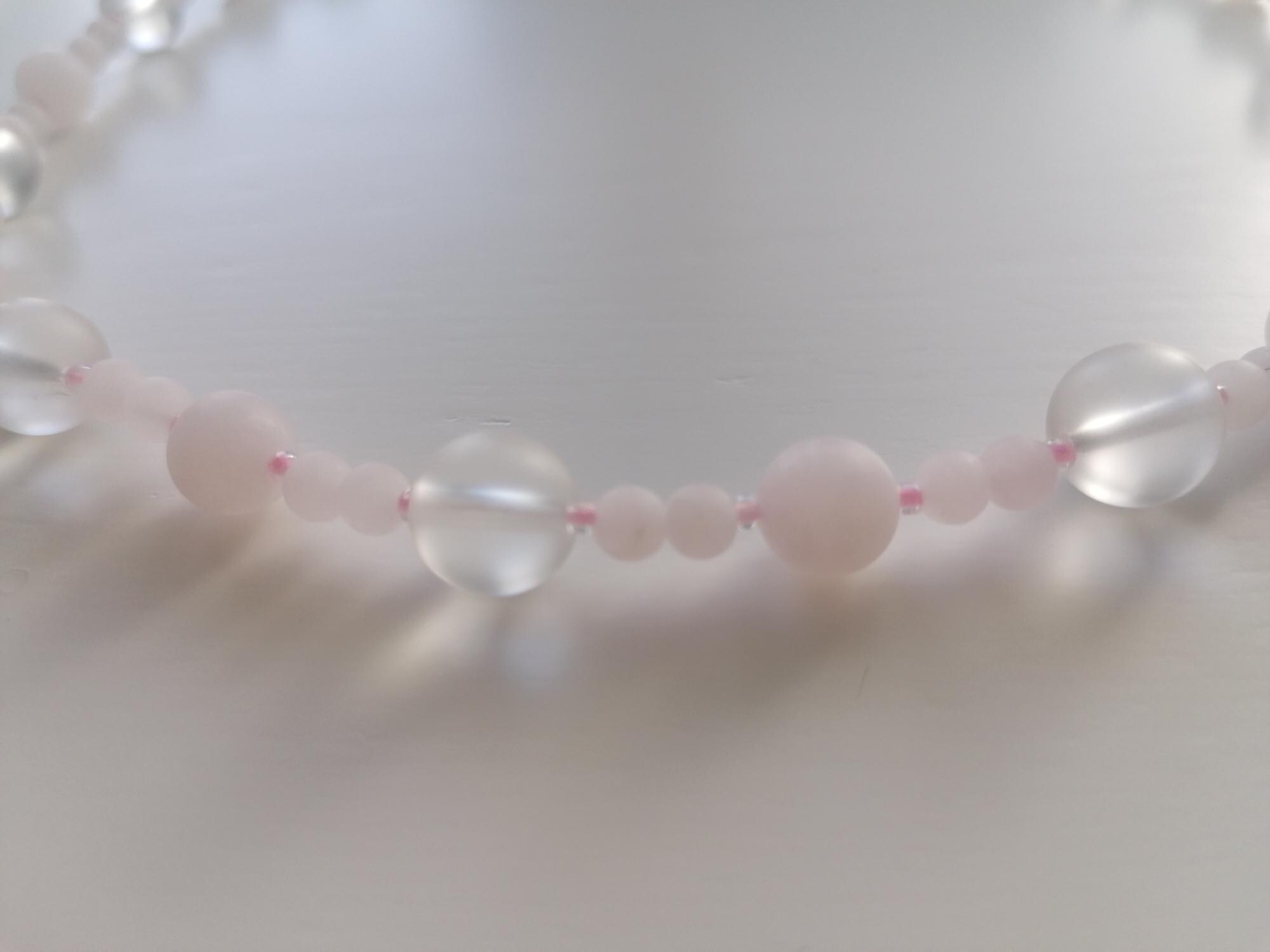 Handmade gemstone necklaces made of rose quartz and rock crystal in rose/white. Two chain options are available.