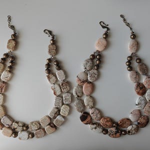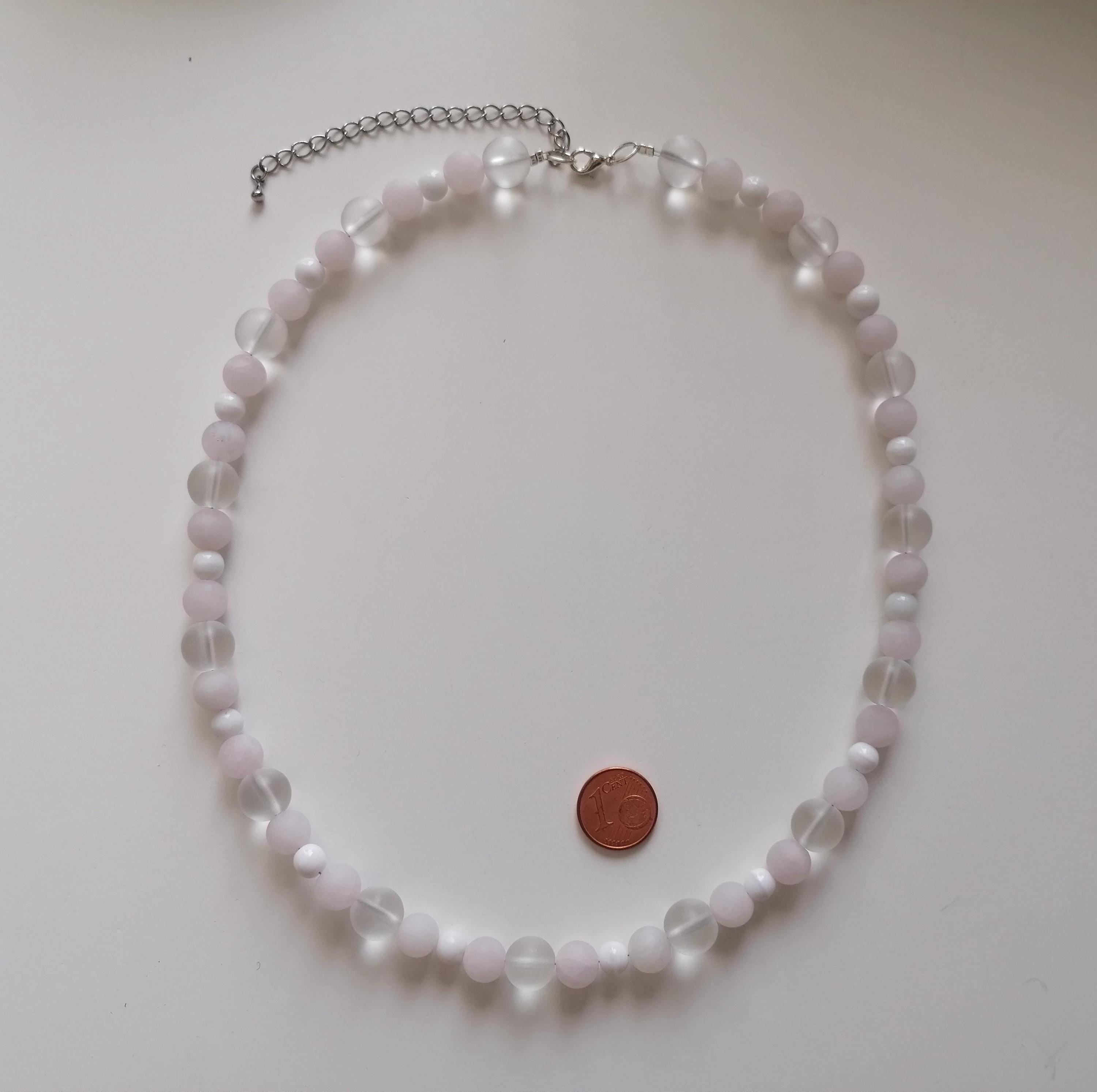 The second necklace is approximately 48.5 cm long, plus a 4.5 cm extension chain. This delicate gemstone necklace is made of matte rose quartz beads (8 mm and 4 mm) and matte rock crystal beads (10 mm). This piece of jewelry is very delicate and feminine. The necklace clasp and the extension chain are silver. You can wear this necklace for everyday wear as well as for special occasions. Or combine it with other necklaces.