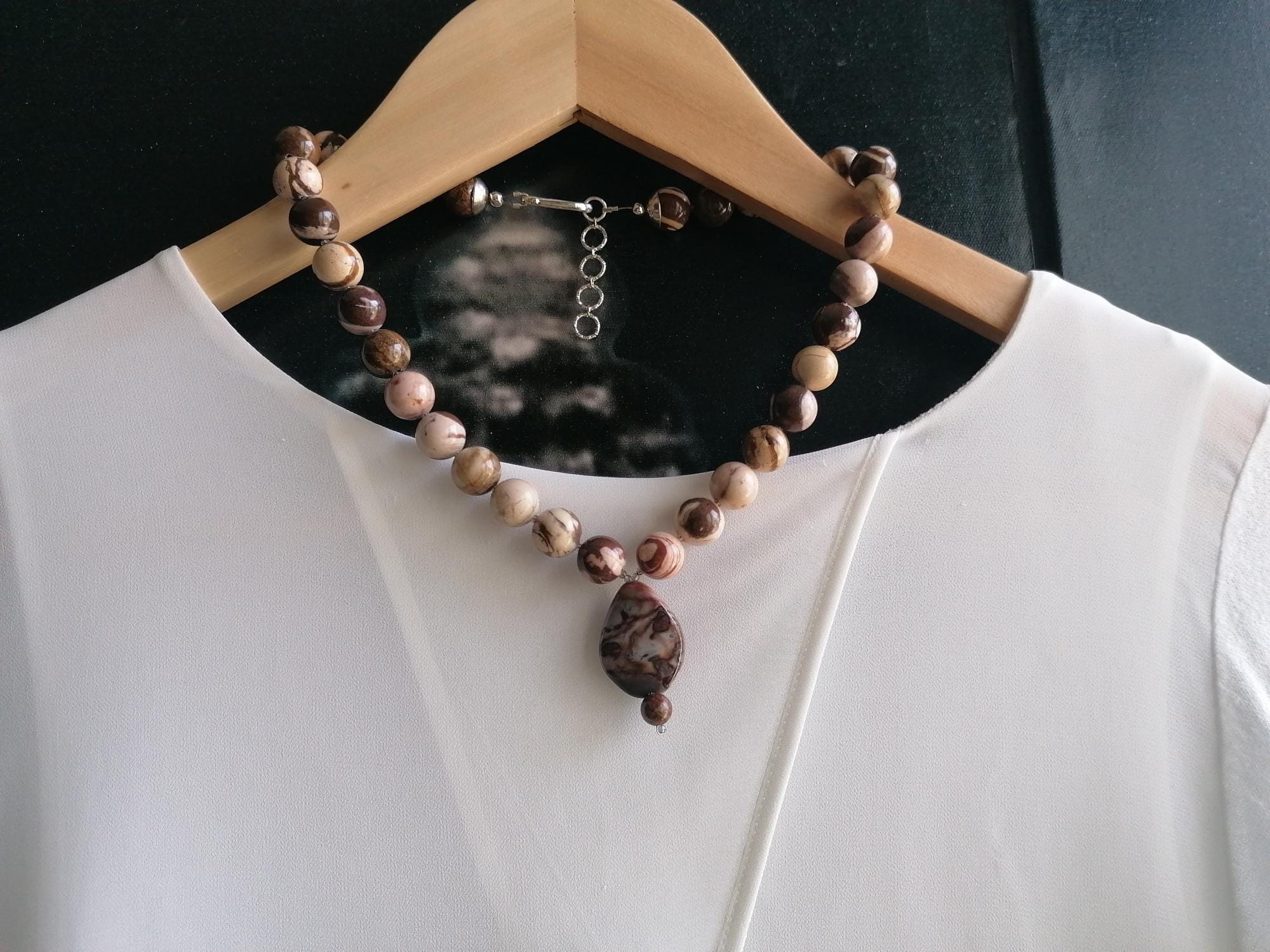 Die Cappuccino Jaspis Halskette ist ca 47 cm lang plus ein Verlängerungskettchen. Farbspektrum Cappuccino Jaspis Perlen reicht von Creme über Braun bis hin zu Dunkelbraun. Die Halskette wurde aus runden Jaspis Perlen in den Farben Braun/Beige (12 mm, 8 mm) und facettierten Spinell Perlen in Grau (2 mm) gefertigt.. Der Kettenanhänger ist ca 40 mm x 22 mm. S-Kettenverschluß, Perlenkappen und Verlängerungskettchen sind in der Farbe Silber.