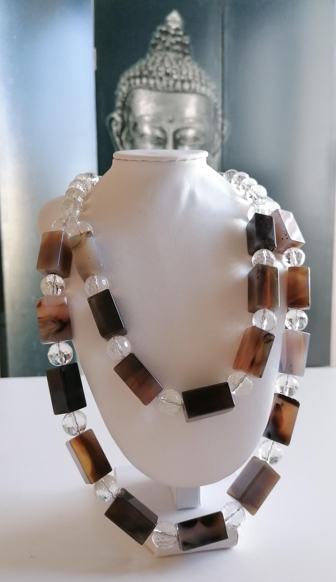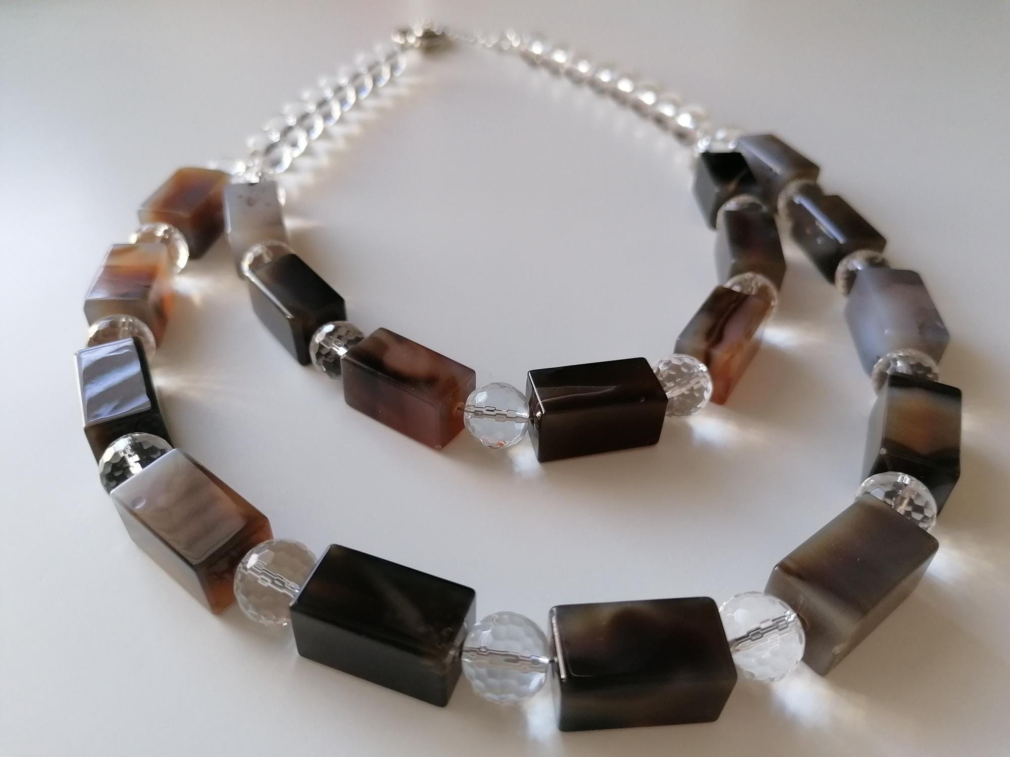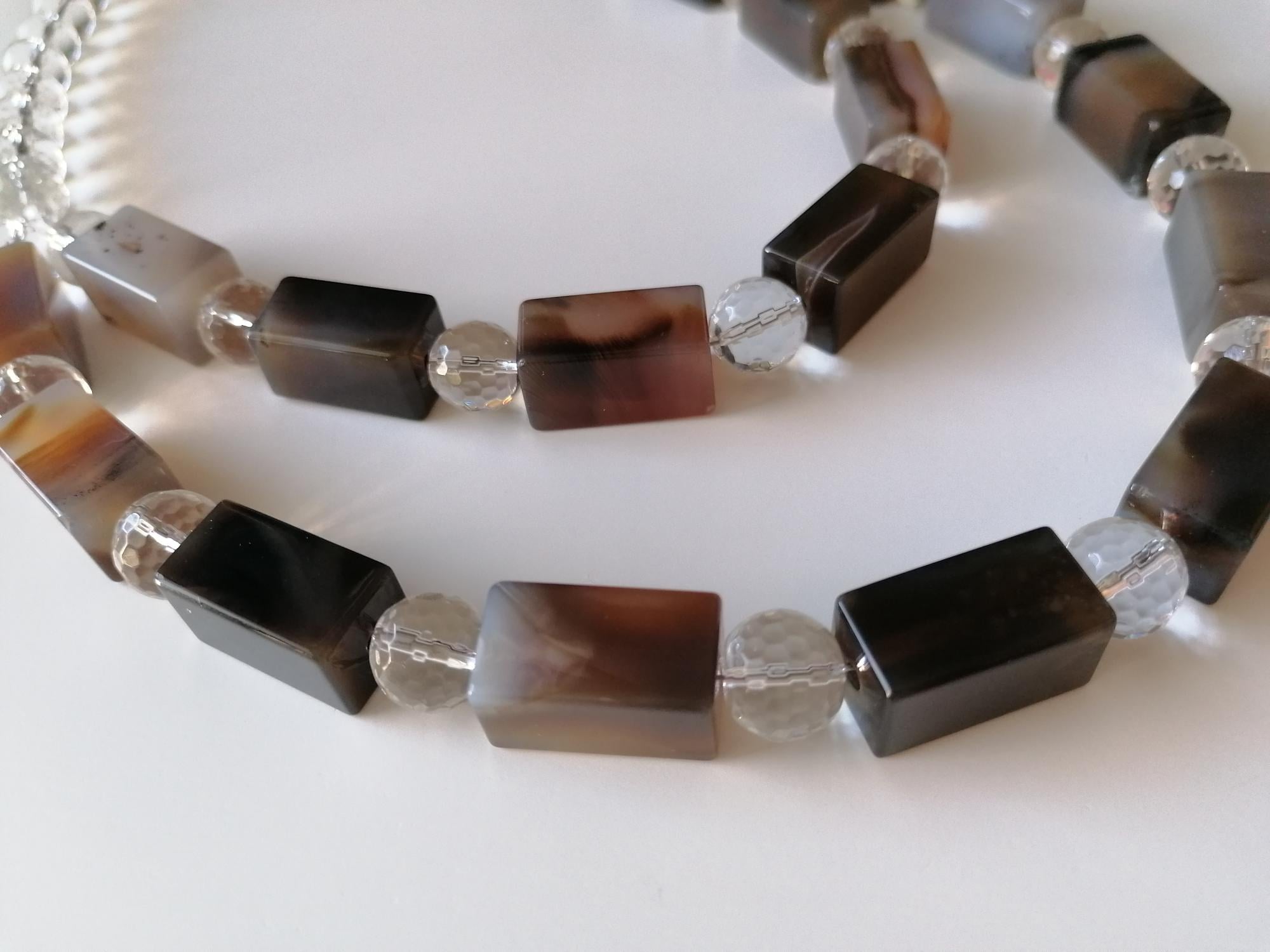 Handmade double-strand necklace made of agate and rock crystal. This statement necklace is crafted from brown-toned agate blocks (approx. 22 mm x 12 mm x 12 mm) and faceted 12 mm rock crystal beads. The necklace is approximately 49.5 cm long, plus a 4 cm extension chain. The heart-shaped clasp and the extension chain are silver-colored.