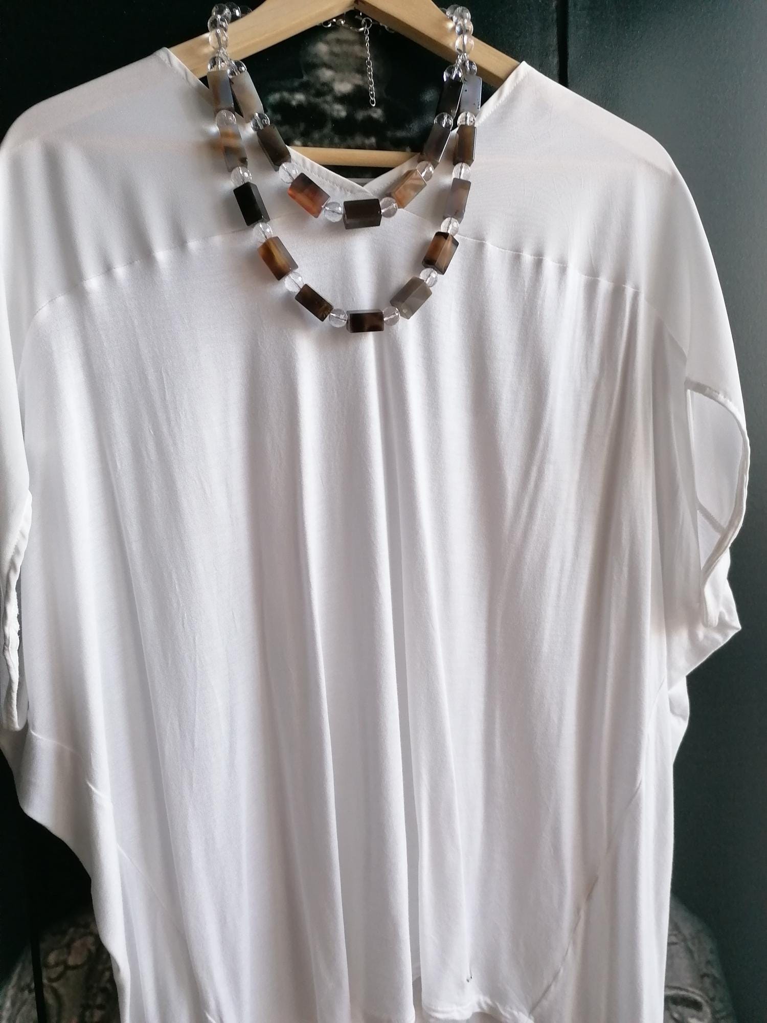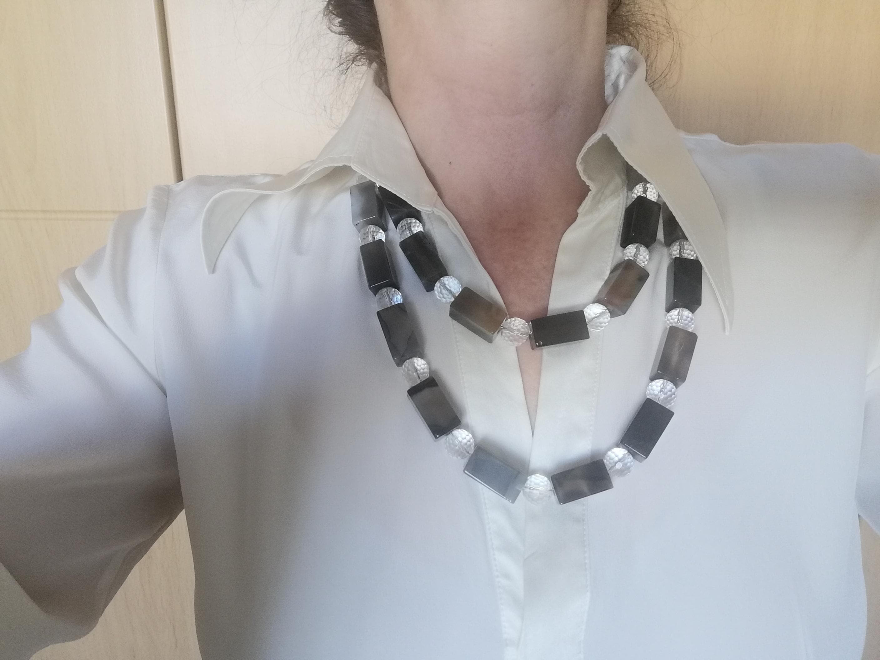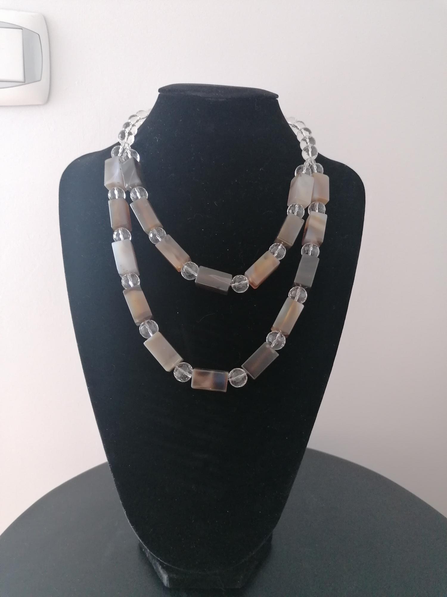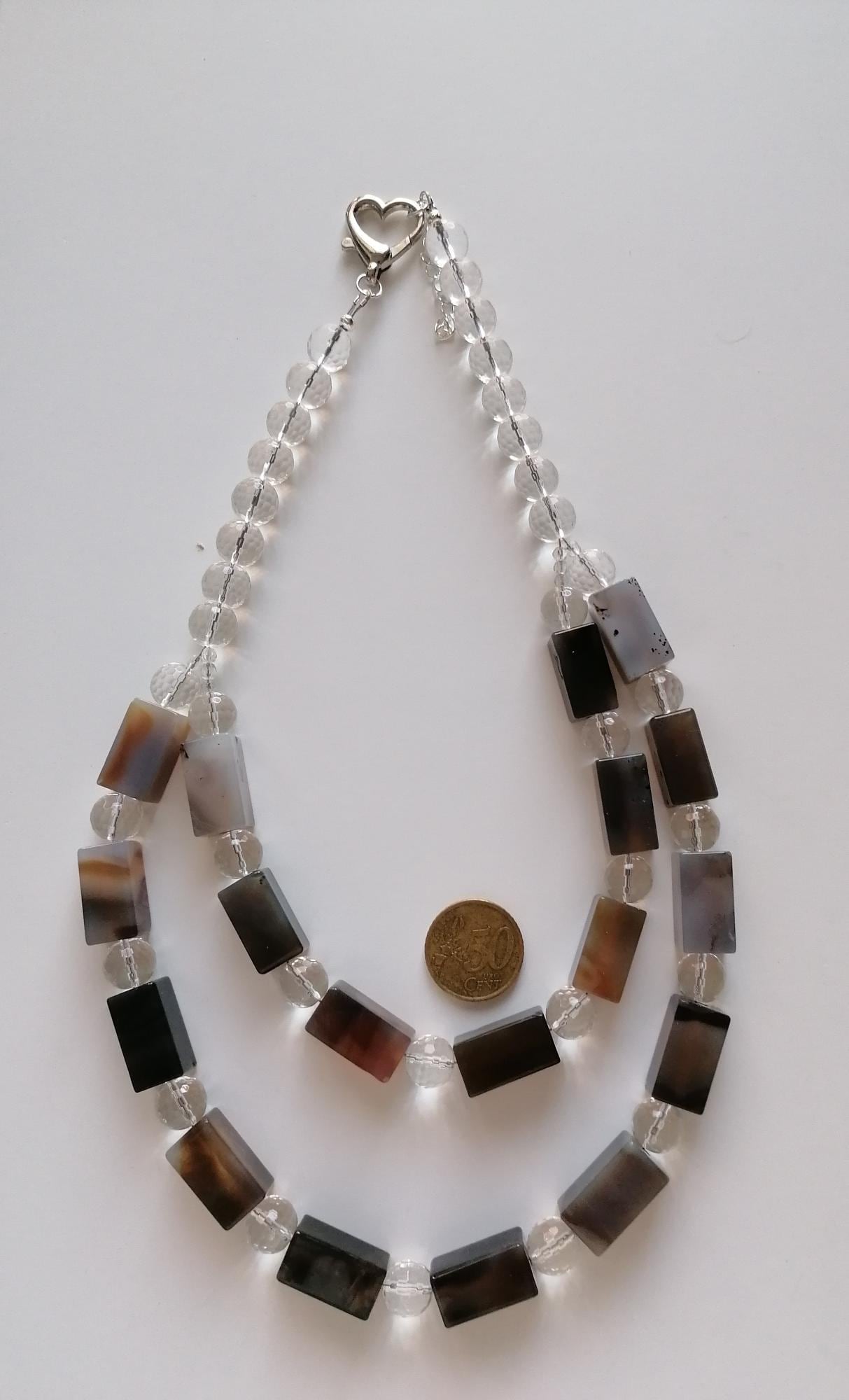 Handmade double-strand necklace made of agate and rock crystal. This statement necklace is crafted from brown-toned agate blocks (approx. 22 mm x 12 mm x 12 mm) and faceted 12 mm rock crystal beads. The necklace is approximately 49.5 cm long, plus a 4 cm extension chain. The heart-shaped clasp and the extension chain are silver-colored.