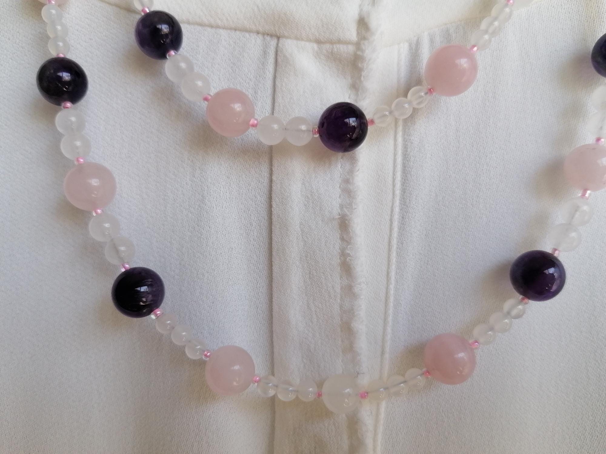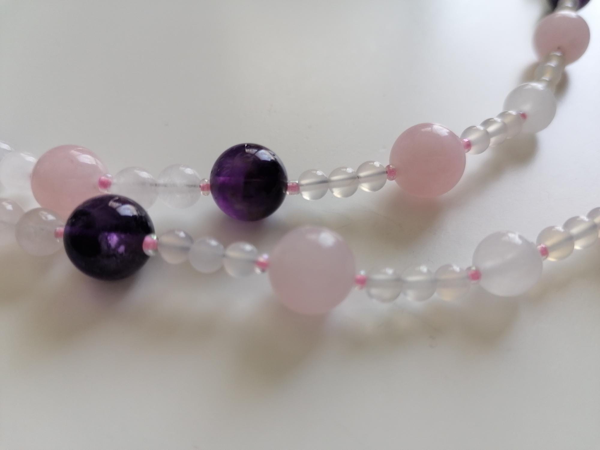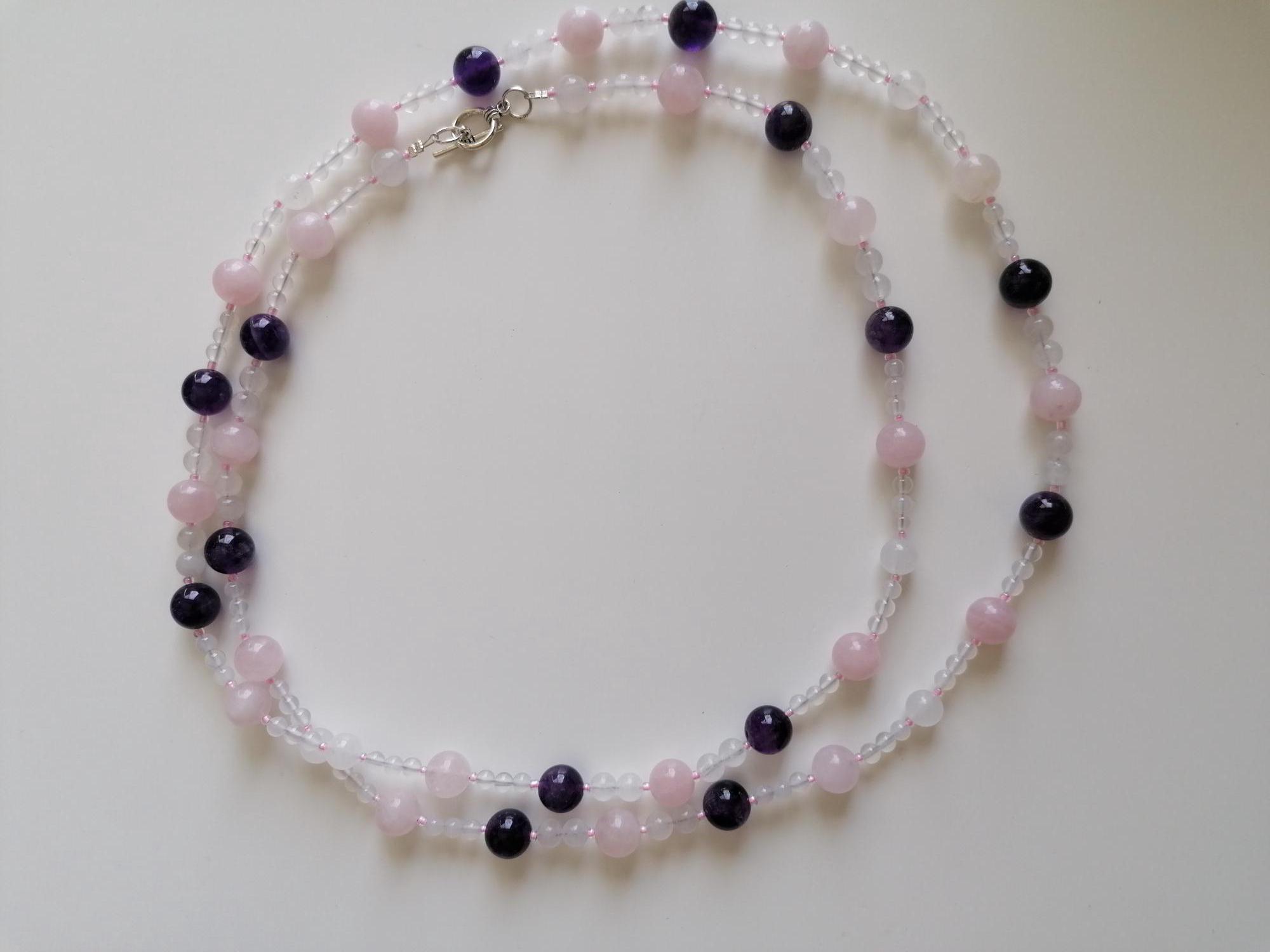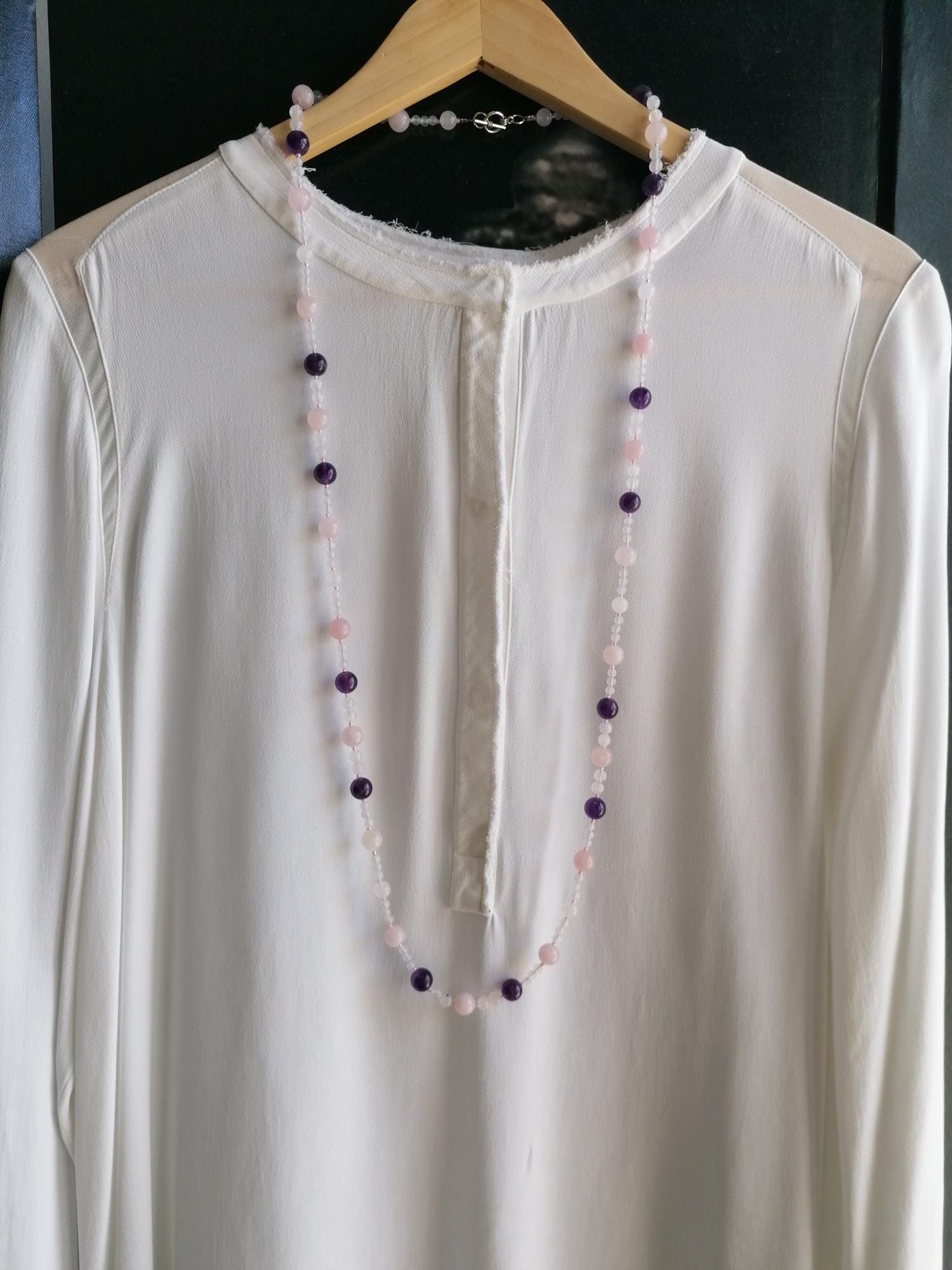 Handmade, approximately 104 cm long gemstone necklace in delicate colors. This long necklace is made of amethyst beads (10 mm), rose quartz beads (10 mm), and white jade beads (8 mm and 4 mm). You can wear this delicate necklace in a variety of ways.
