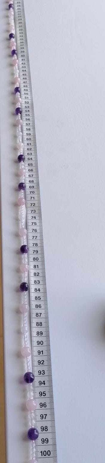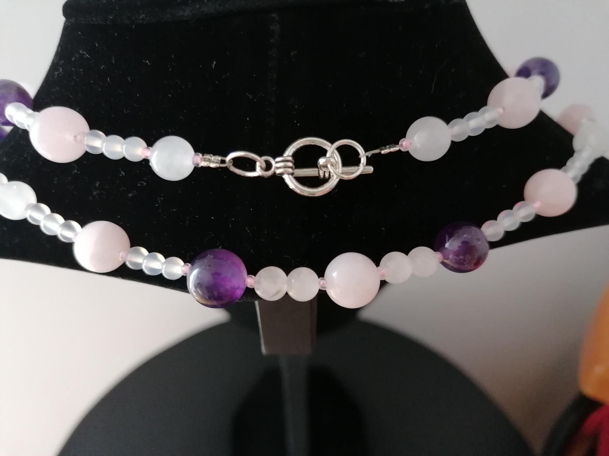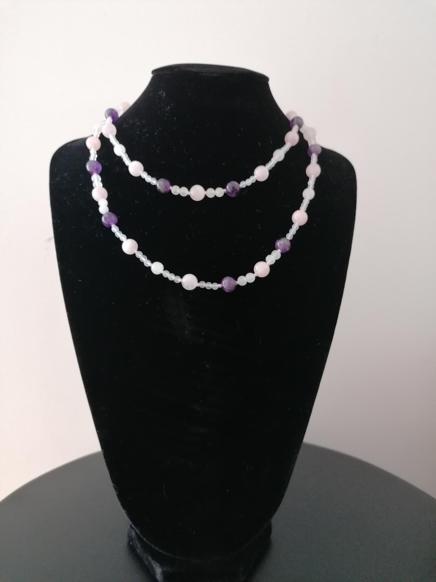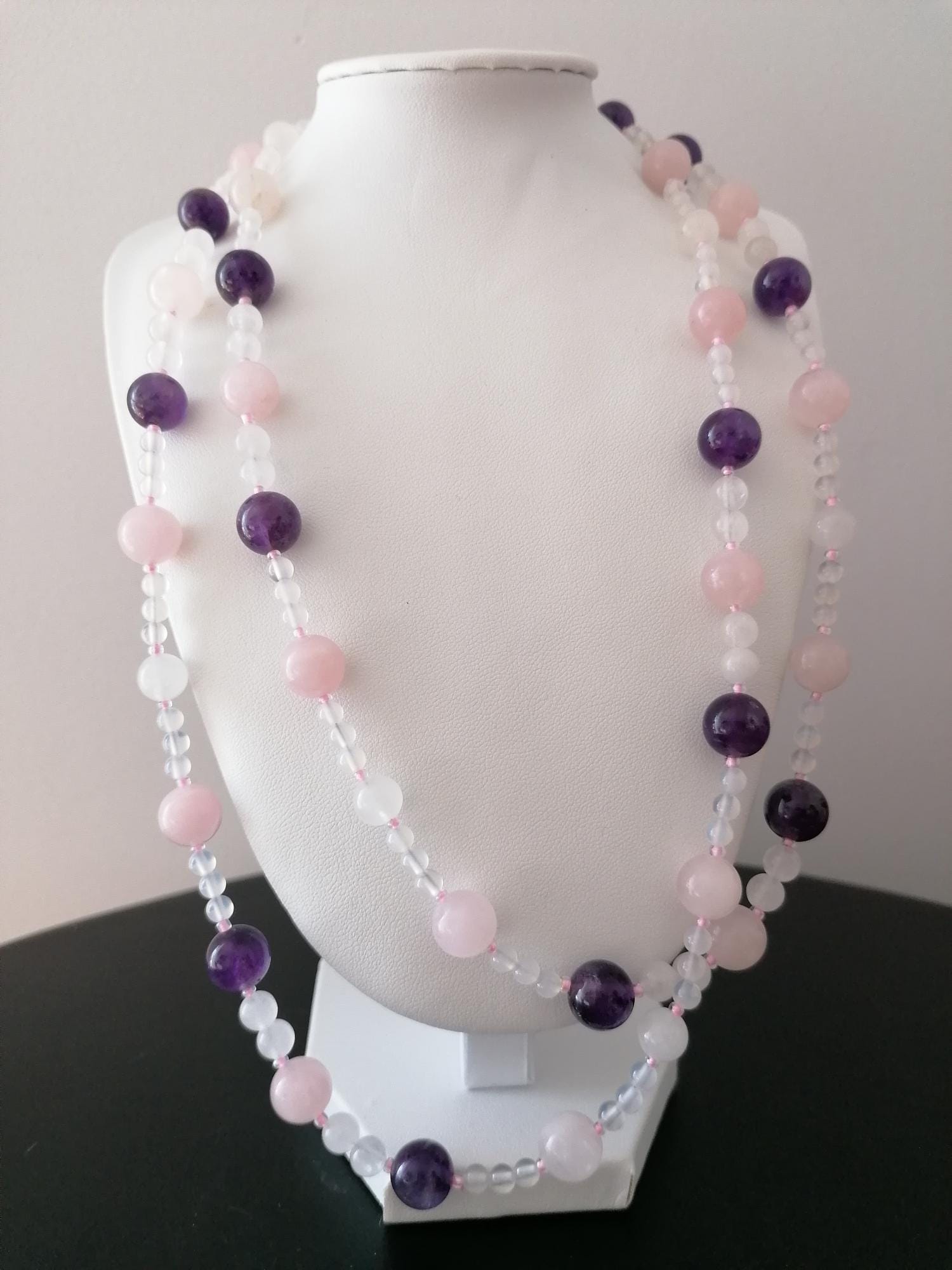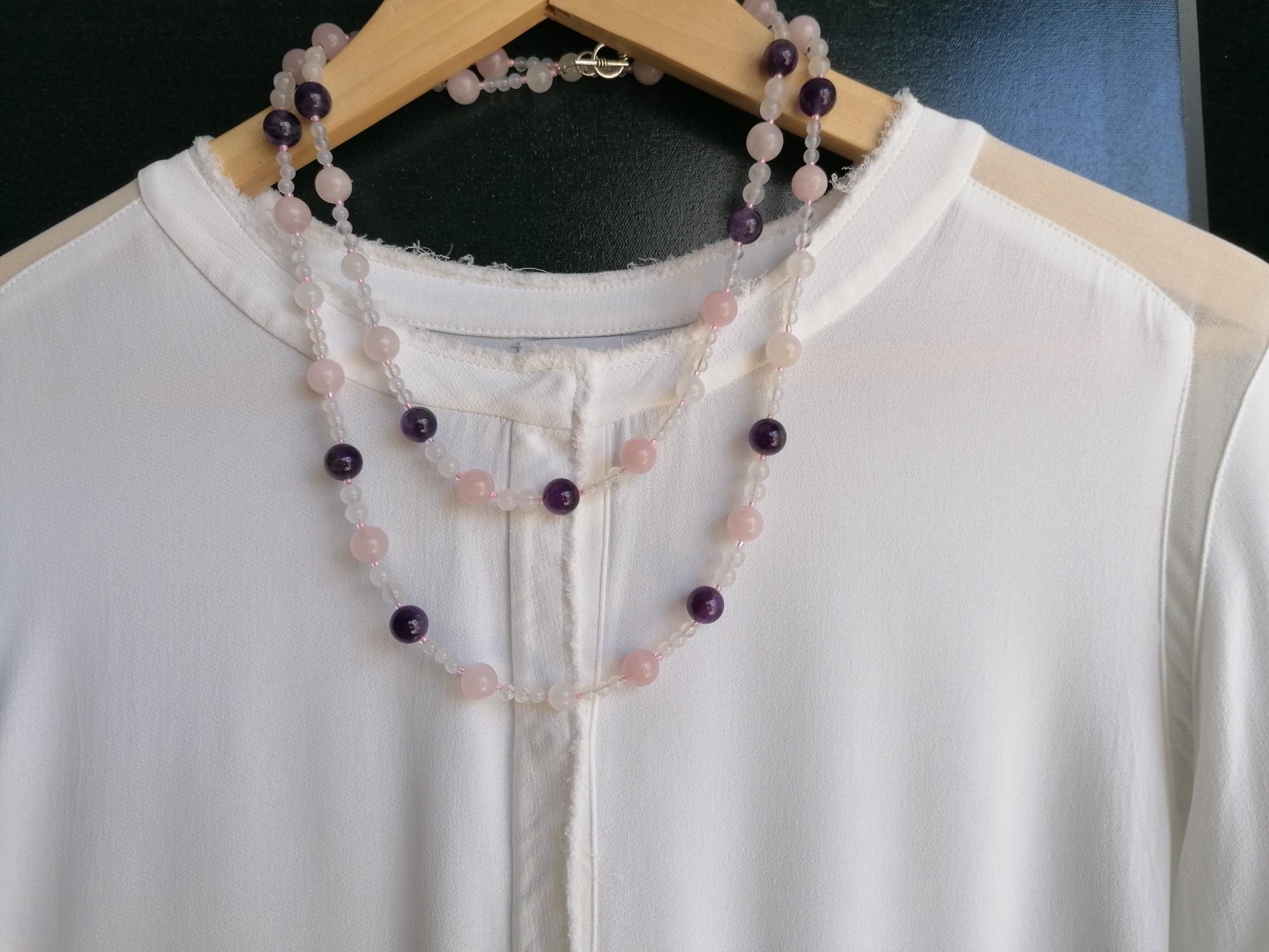Handmade, approximately 104 cm long gemstone necklace in delicate colors. This long necklace is made of amethyst beads (10 mm), rose quartz beads (10 mm), and white jade beads (8 mm and 4 mm). You can wear this delicate necklace in a variety of ways.
