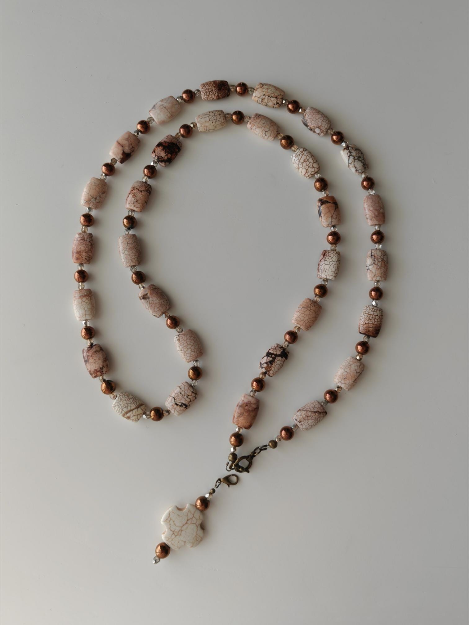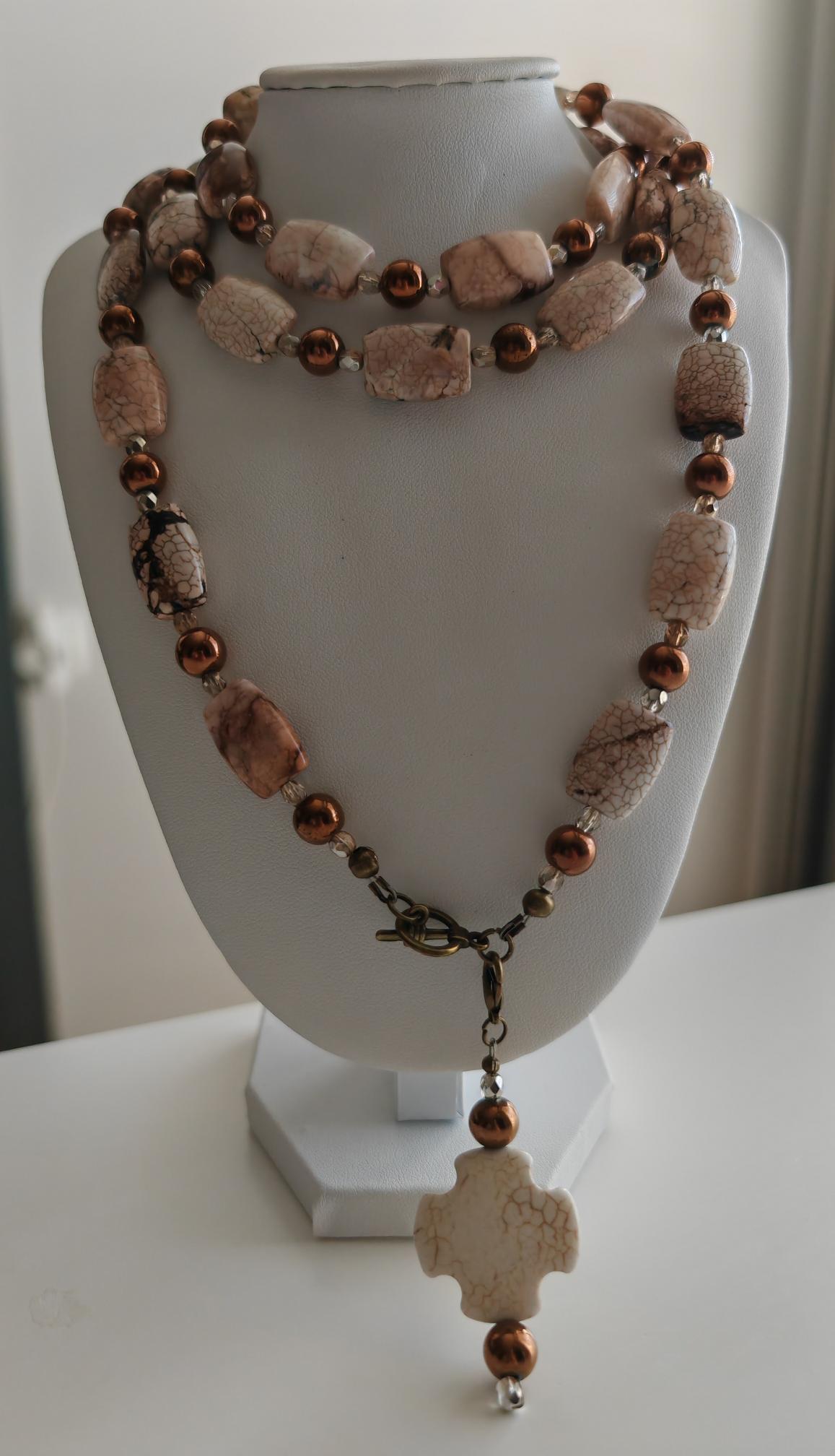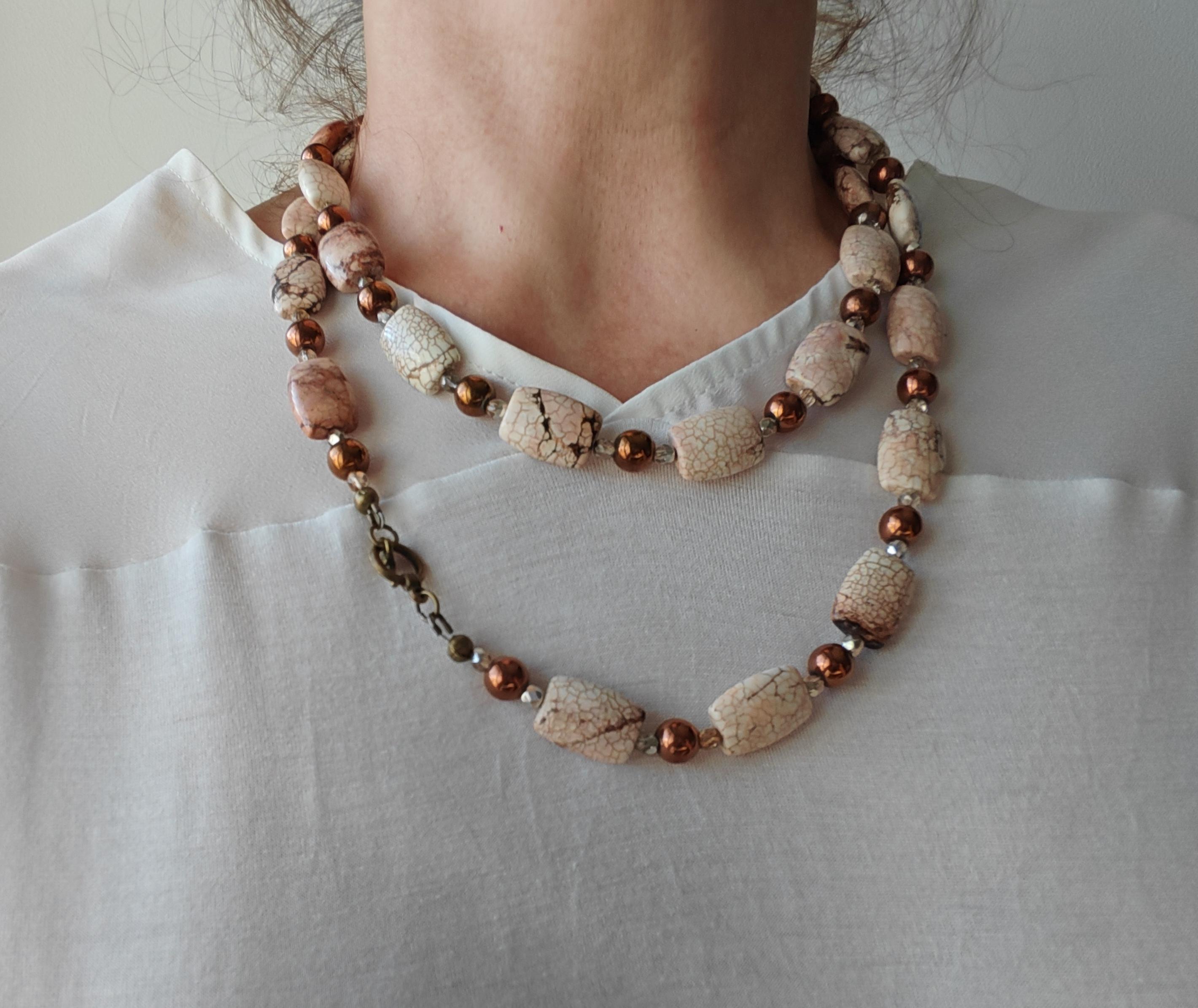 The long chrysopas necklace in beige/brown/rose with a removable pendant is approximately 104 cm long. The necklace is made of chrysopas beads (18 mm x 13 mm x 7 mm), round copper-colored hematite beads (8 mm), and faceted Bohemian glass beads (4 mm). The removable pendant is
