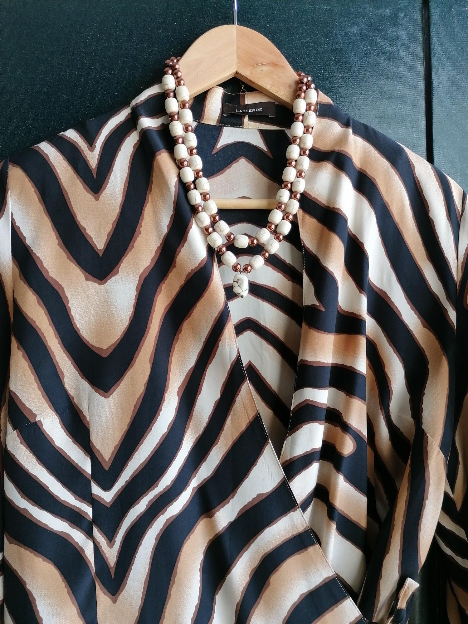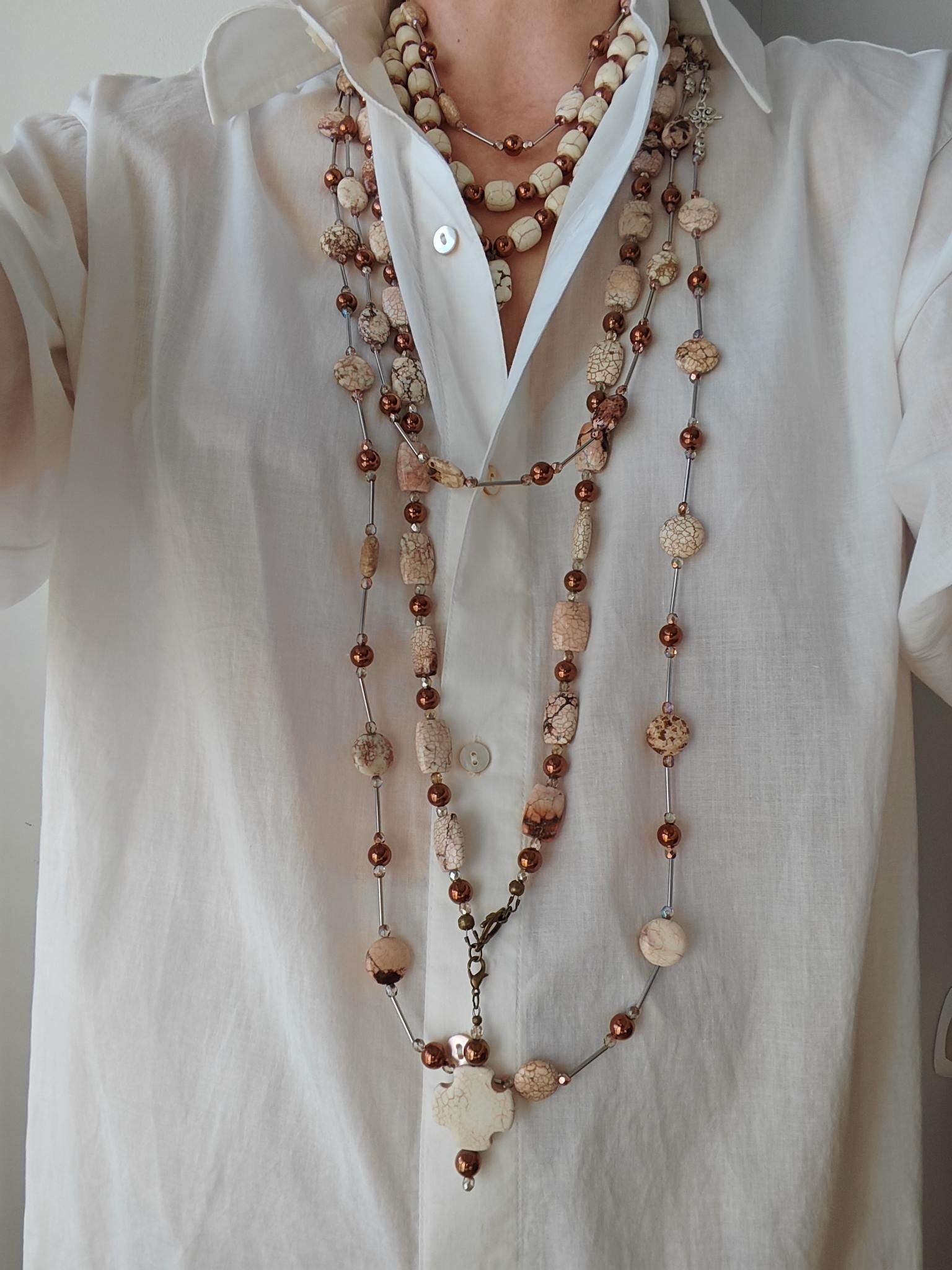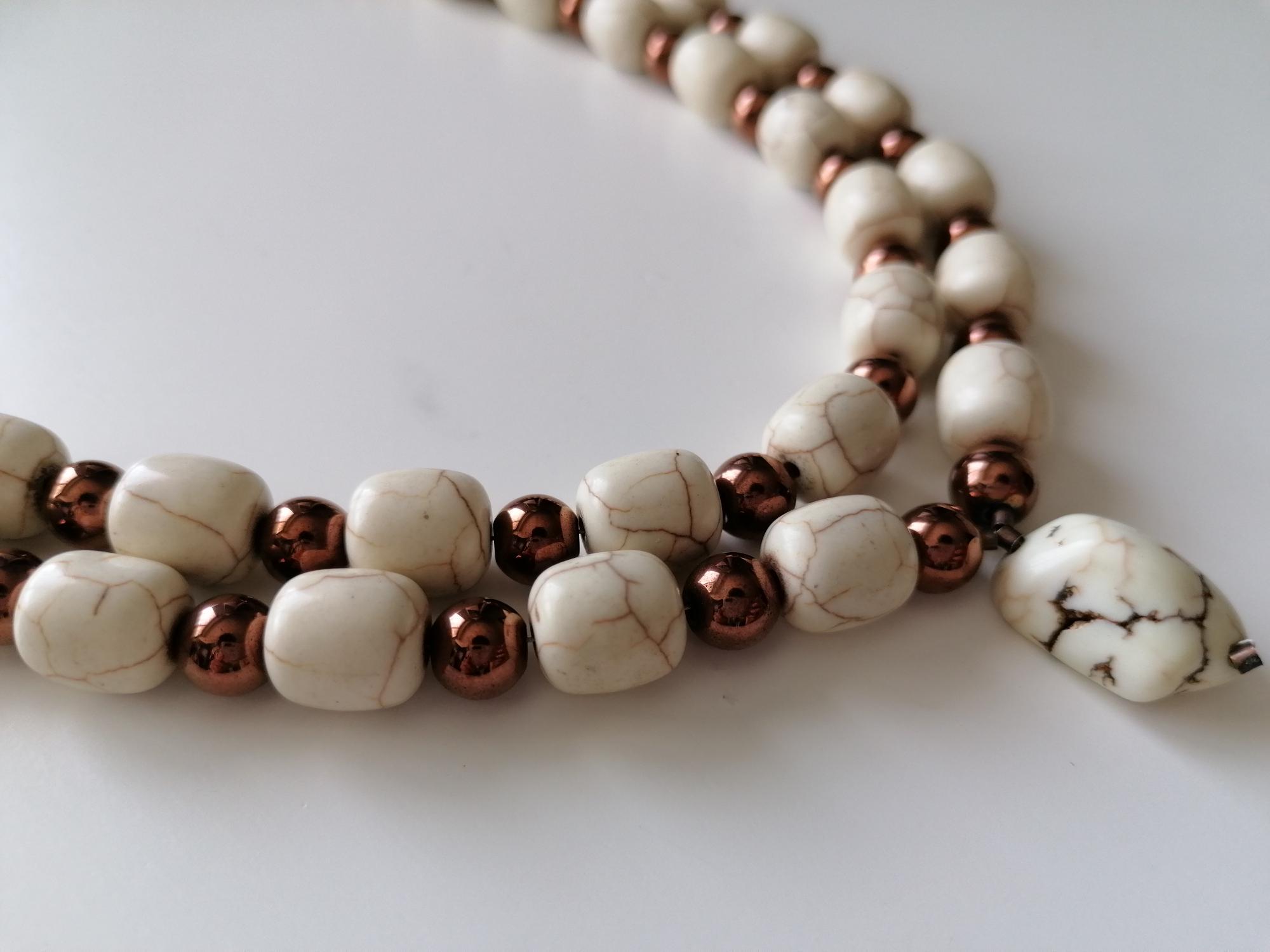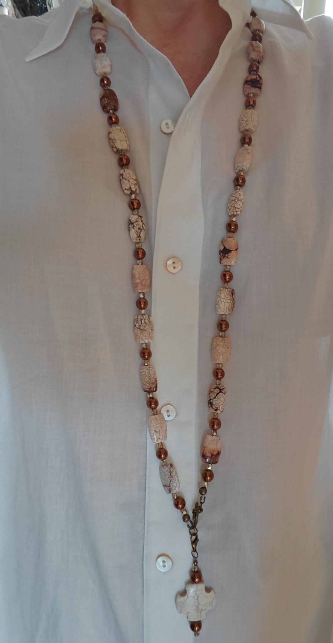 The long chrysopas necklace in beige/brown/rose with a removable pendant is approximately 104 cm long. The necklace is made of chrysopas beads (18 mm x 13 mm x 7 mm), round copper-colored hematite beads (8 mm), and faceted Bohemian glass beads (4 mm). The removable pendant is