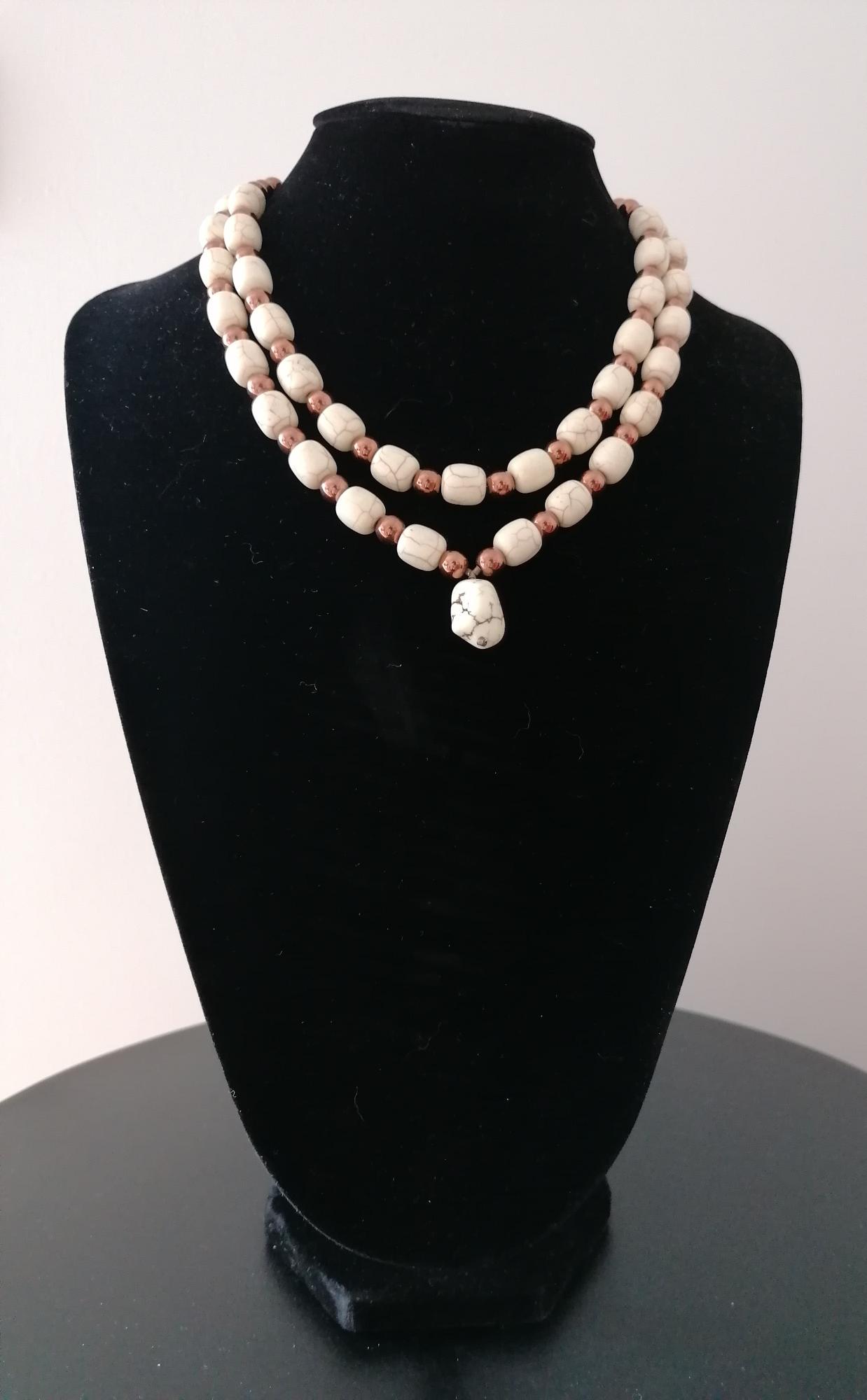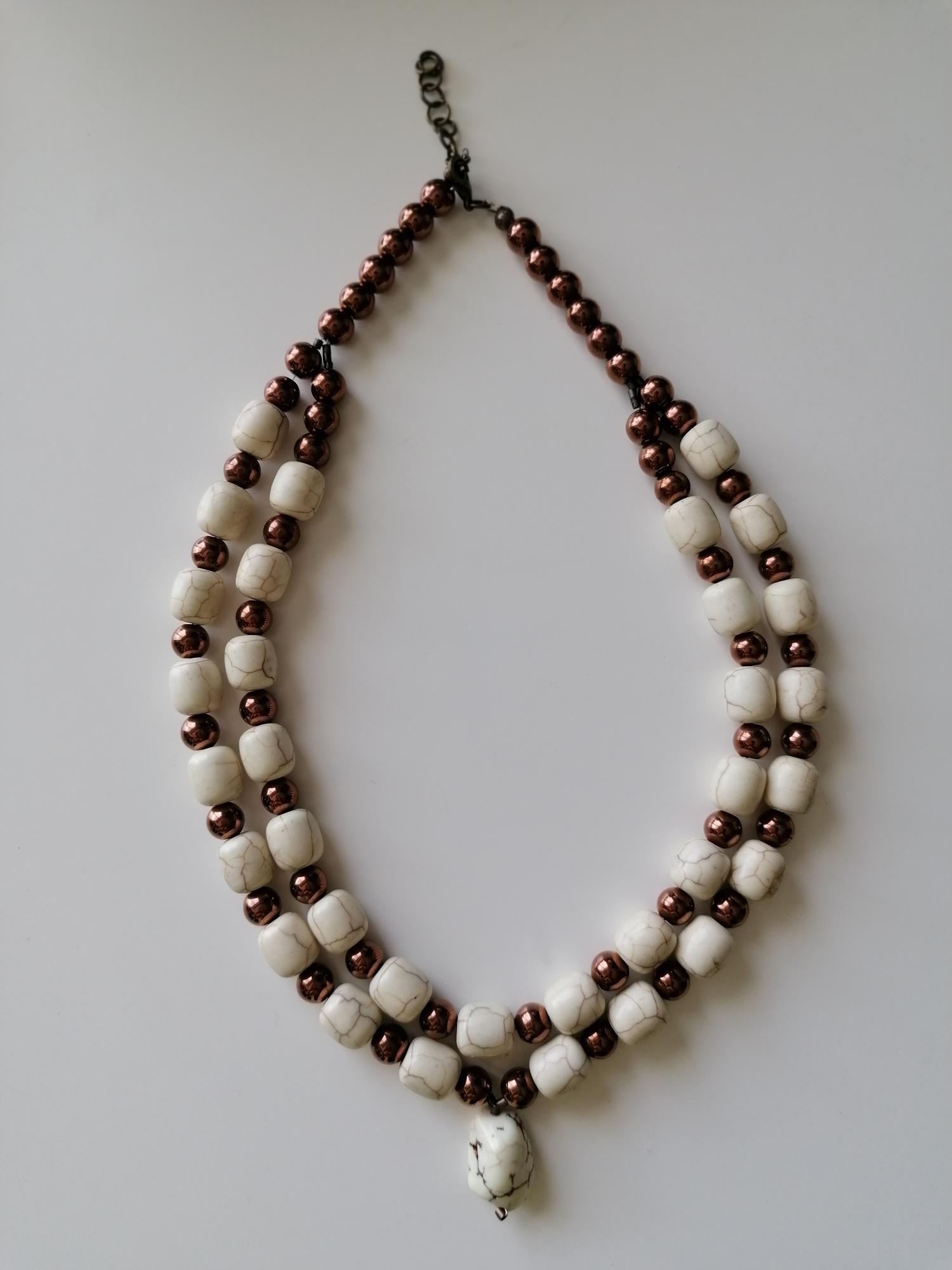 This two-strand chrysopa necklace with pendant is approximately 47.5 cm long, plus an extension chain. The beige/copper-colored necklace is made of beige/brown barrel-shaped chrysopa beads (12 mm x 10 mm) and round copper-colored hematite beads (8 mm). The pendant is approximately 20 mm long. The necklace clasp, extension chain, and metal beads are bronze.