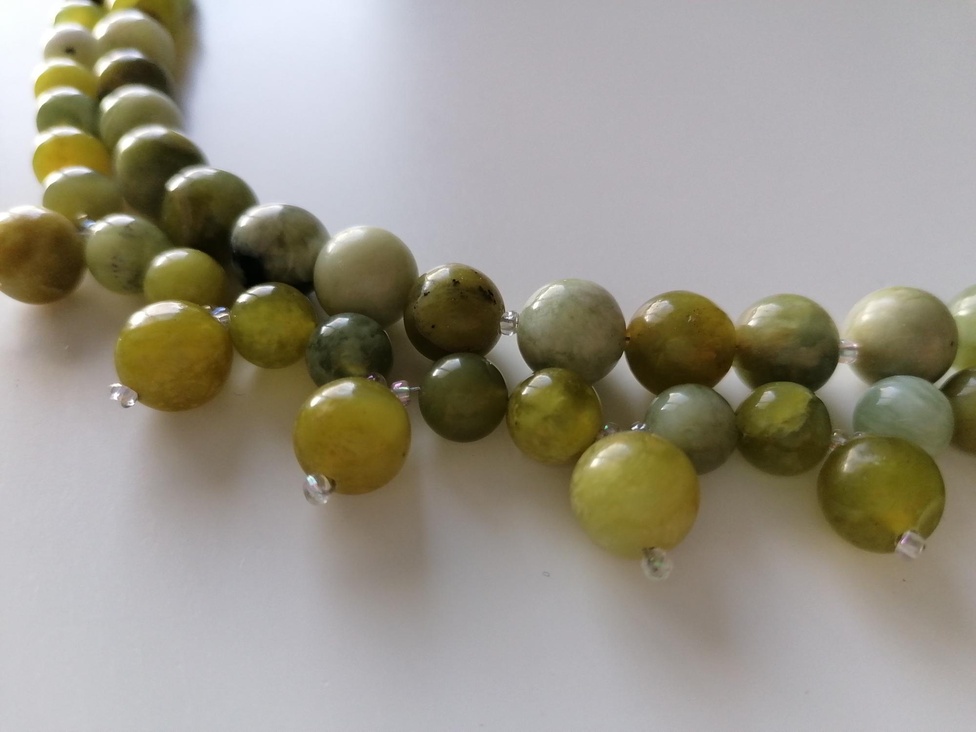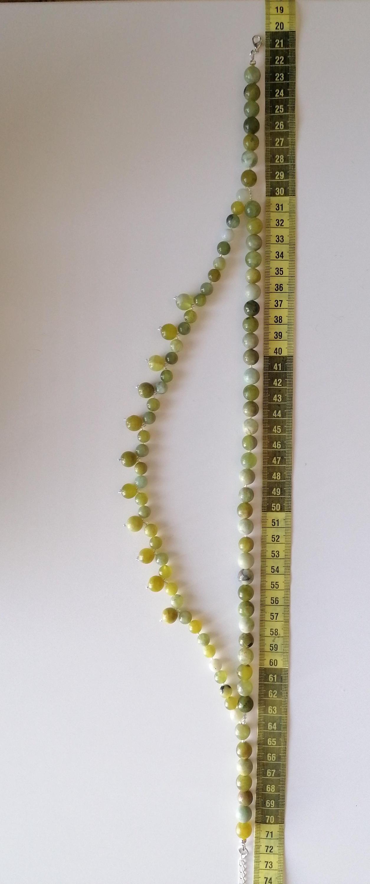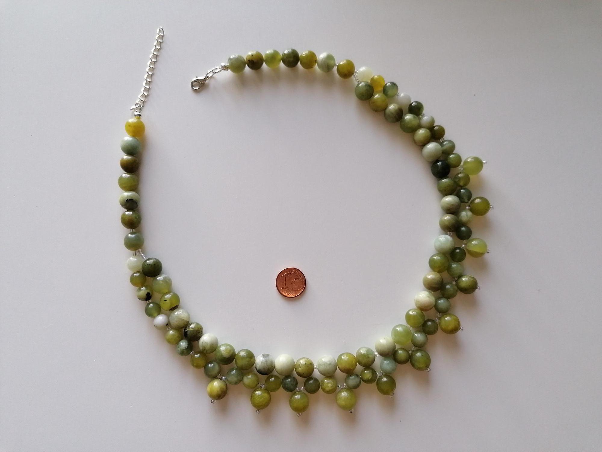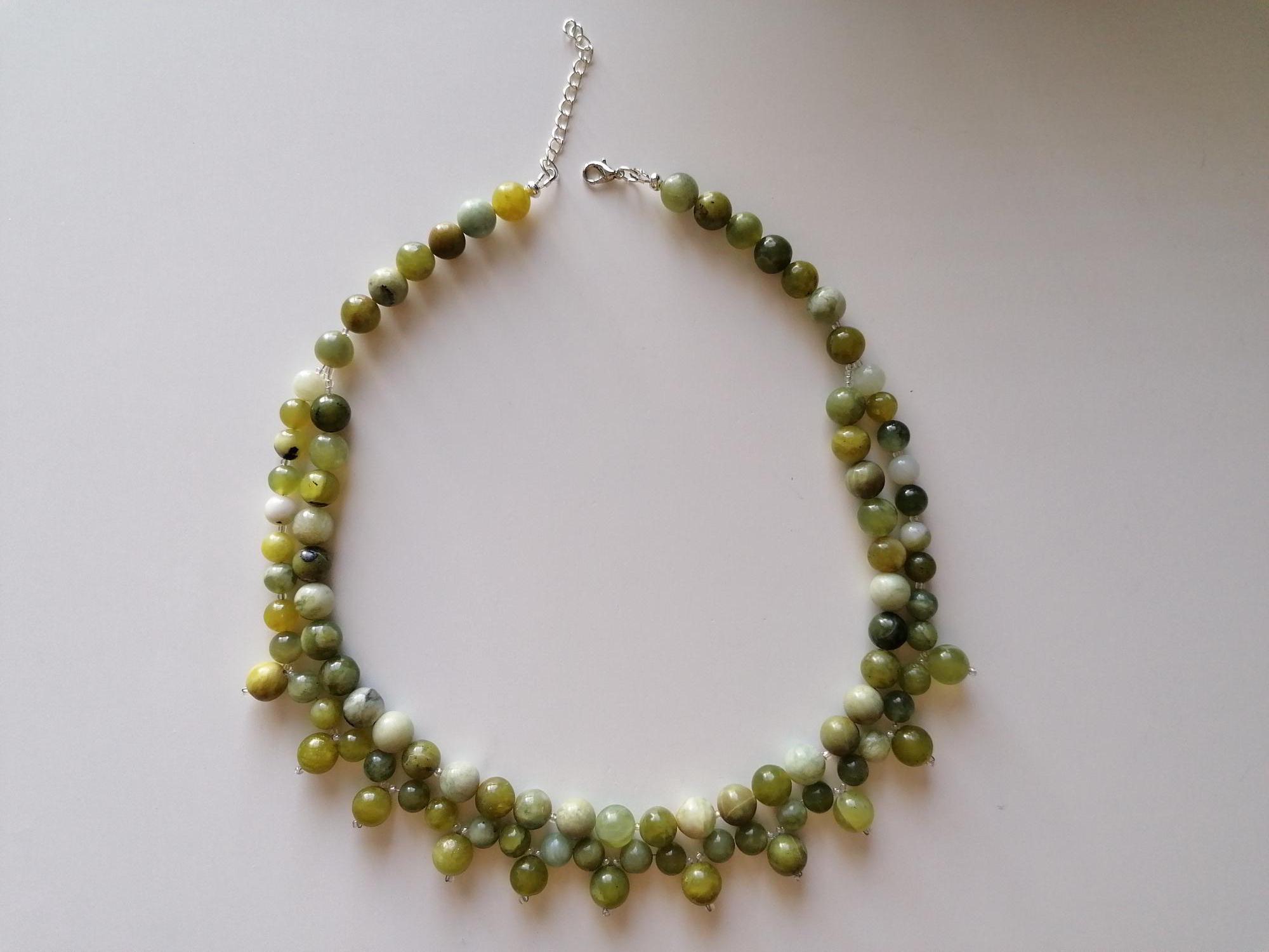This handmade green jade necklace is approximately 52 cm long, plus a 4.5 cm extension chain. The necklace is handcrafted from jadeite beads (8 mm and 10 mm) in various shades of green. The clasp and extension chain are silver-colored.