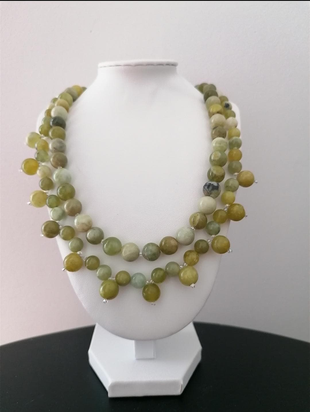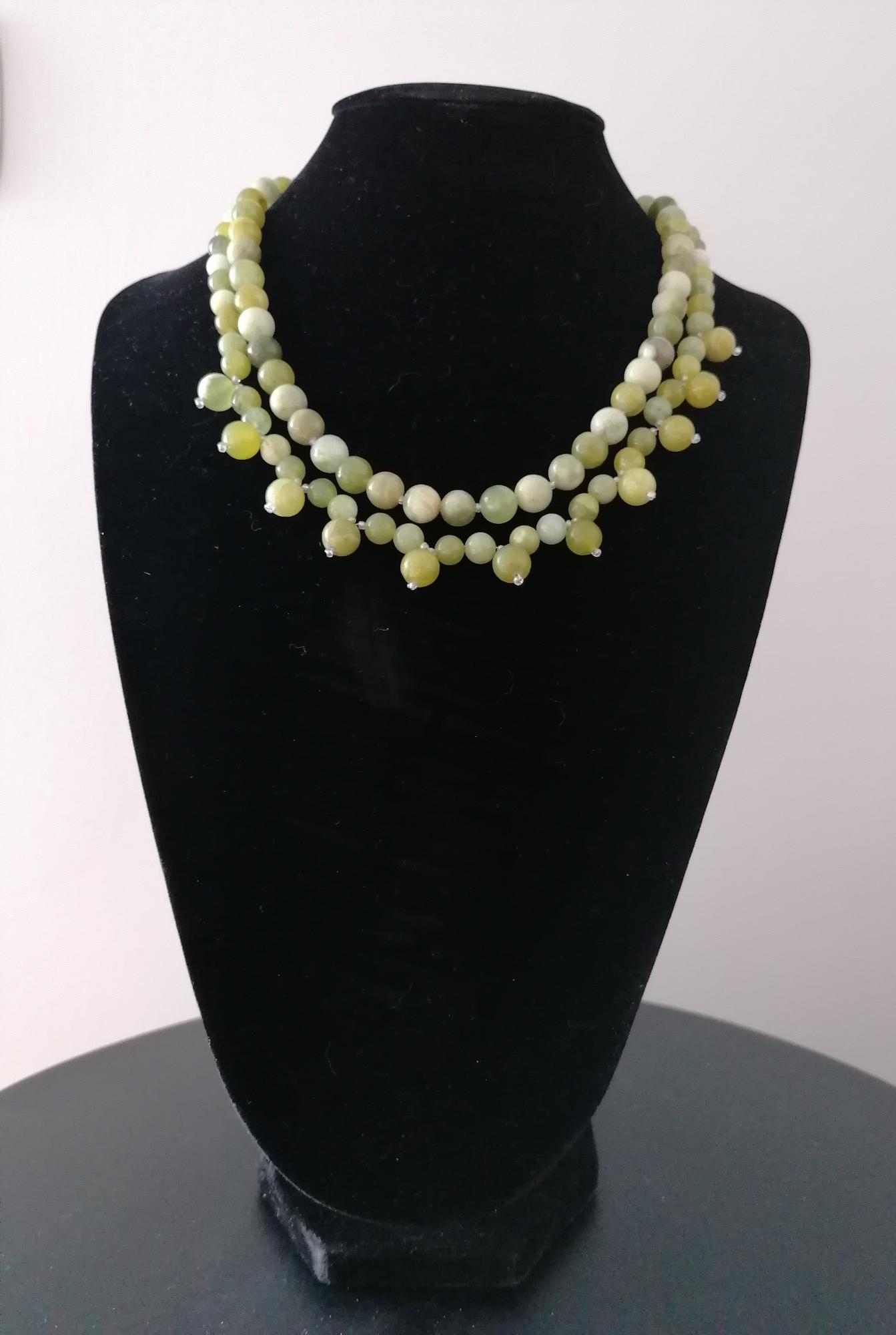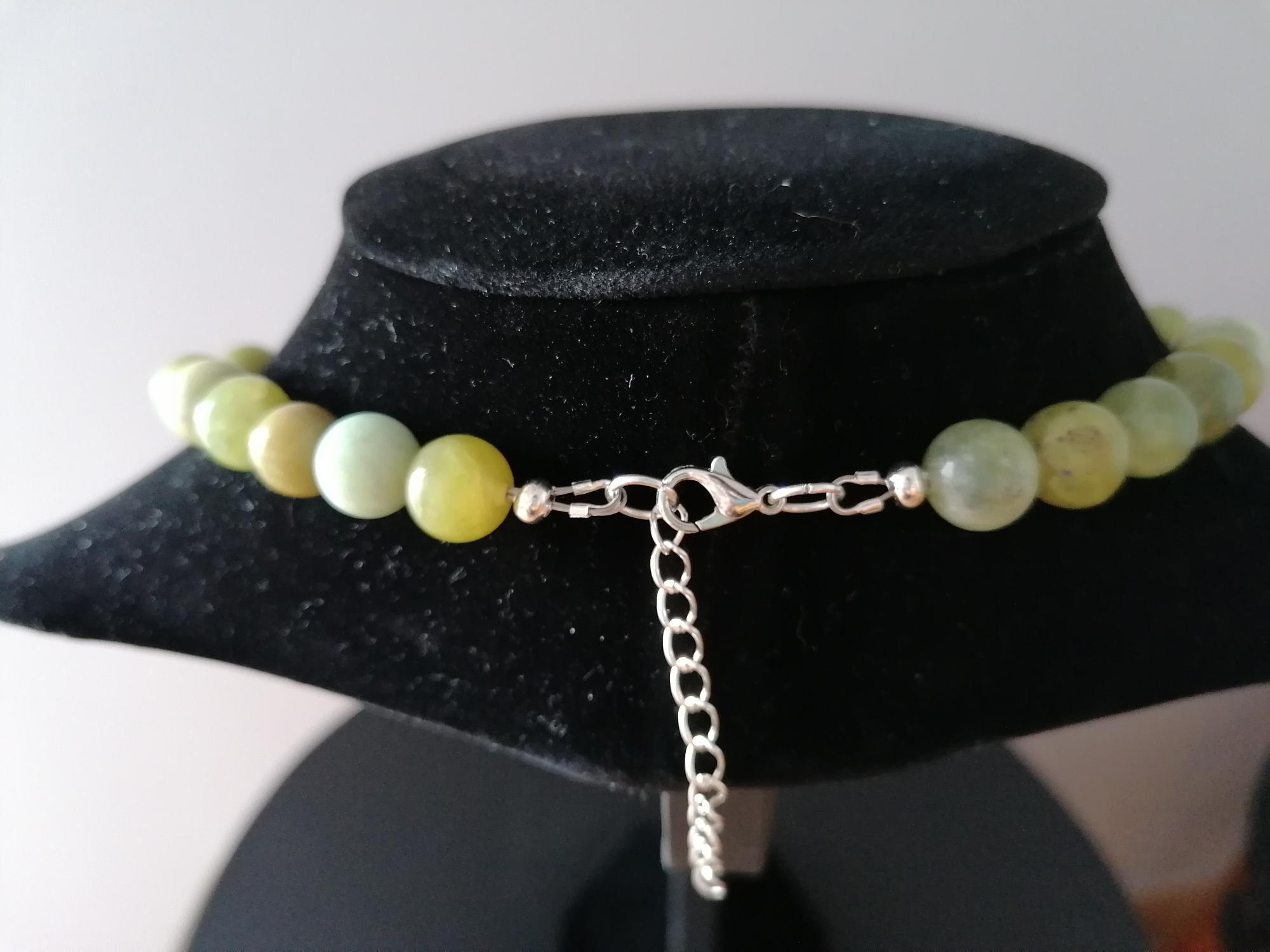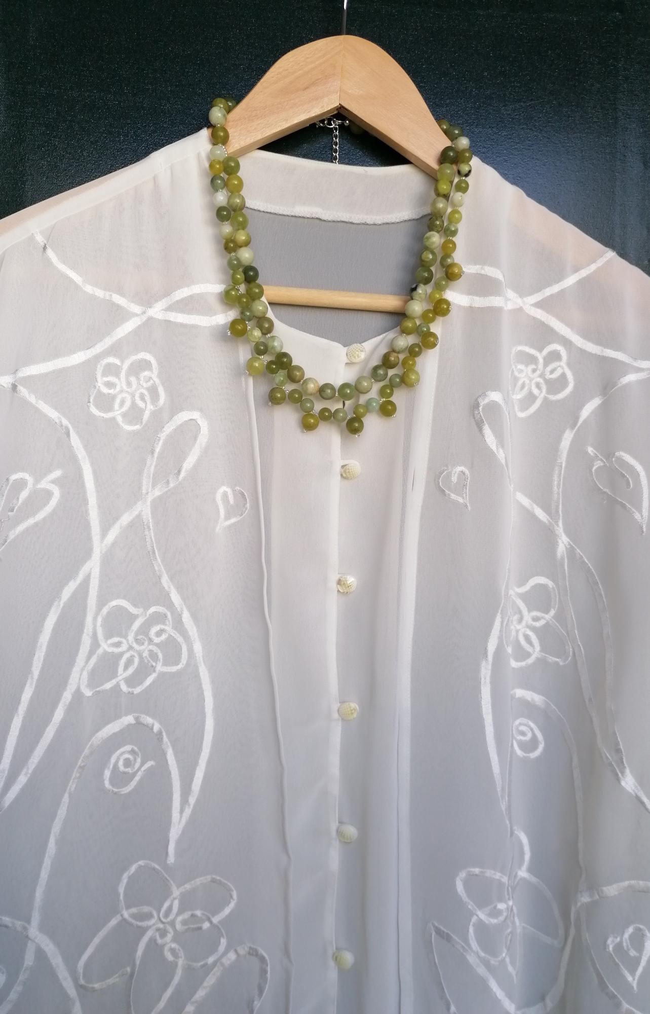 This handmade green jade necklace is approximately 52 cm long, plus a 4.5 cm extension chain. The necklace is handcrafted from jadeite beads (8 mm and 10 mm) in various shades of green. The clasp and extension chain are silver-colored.