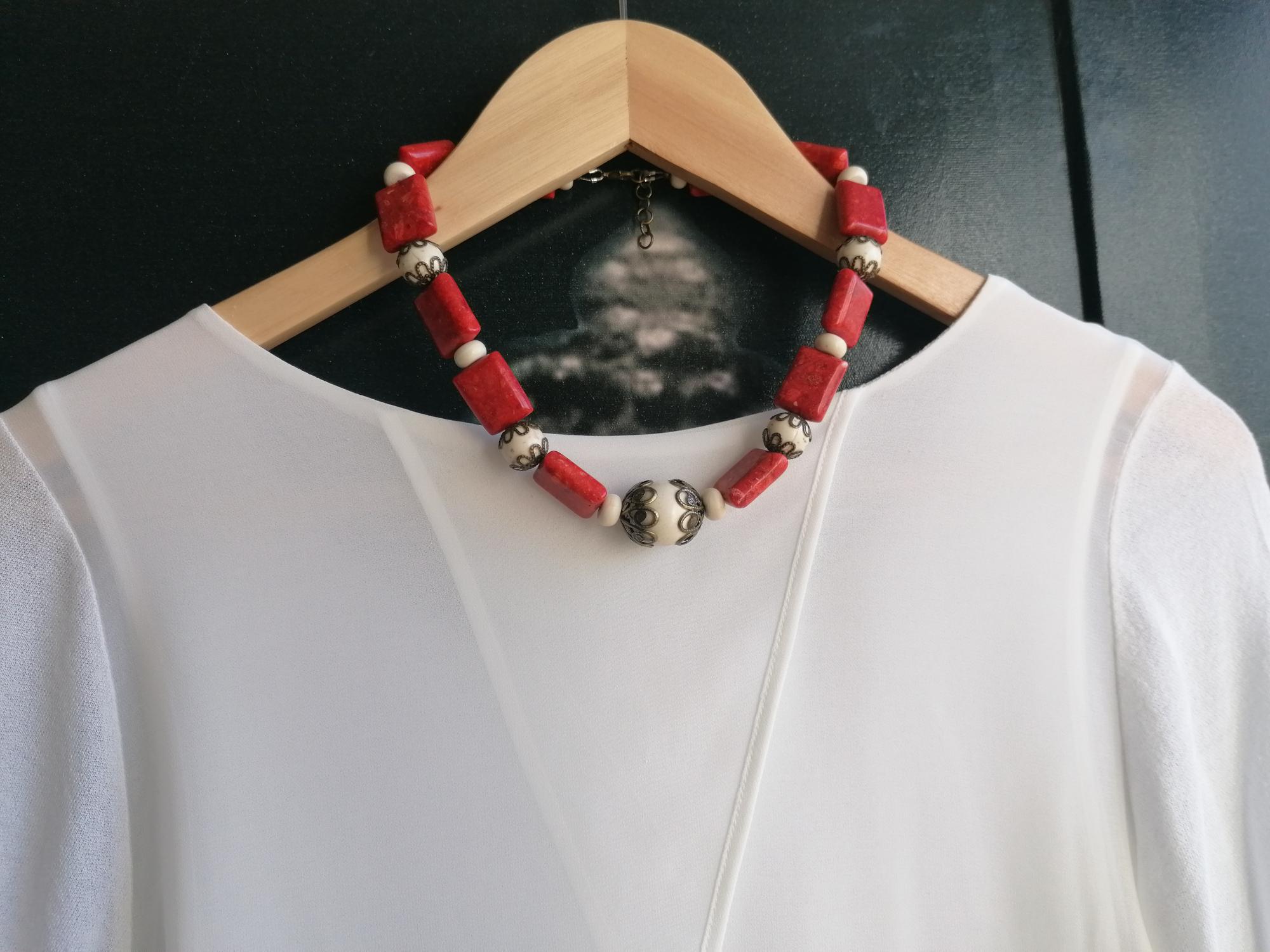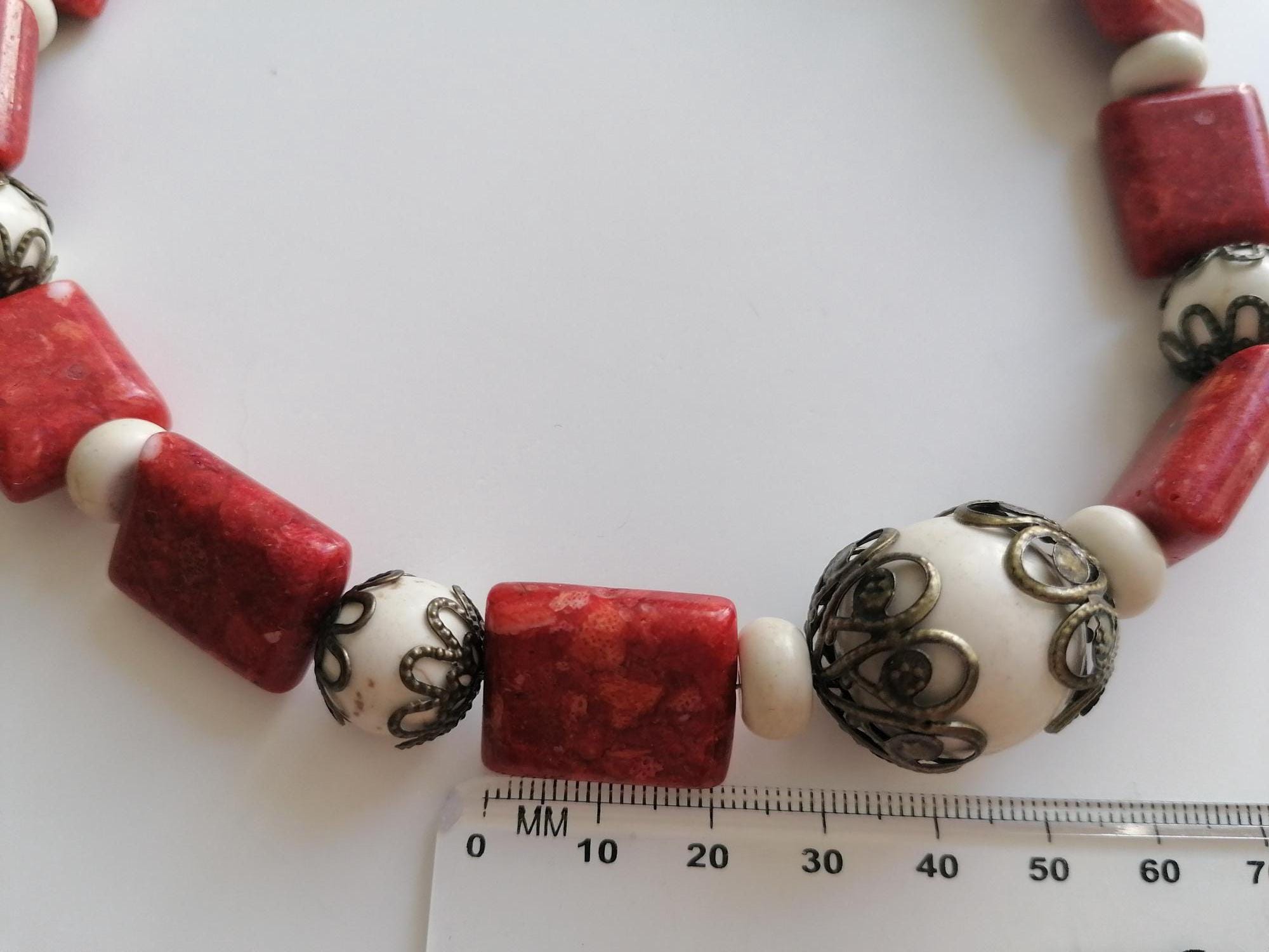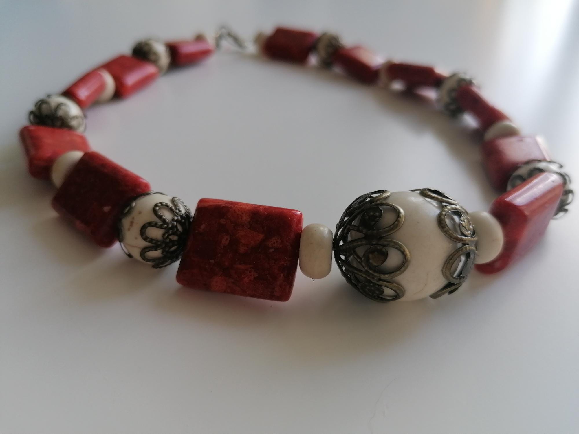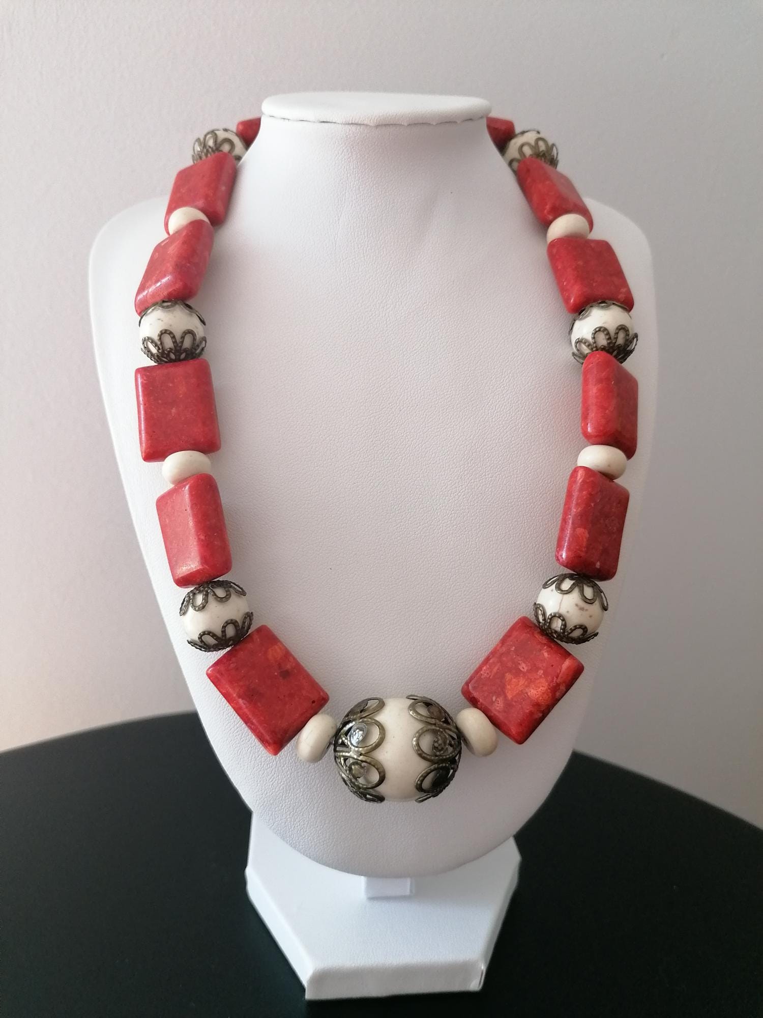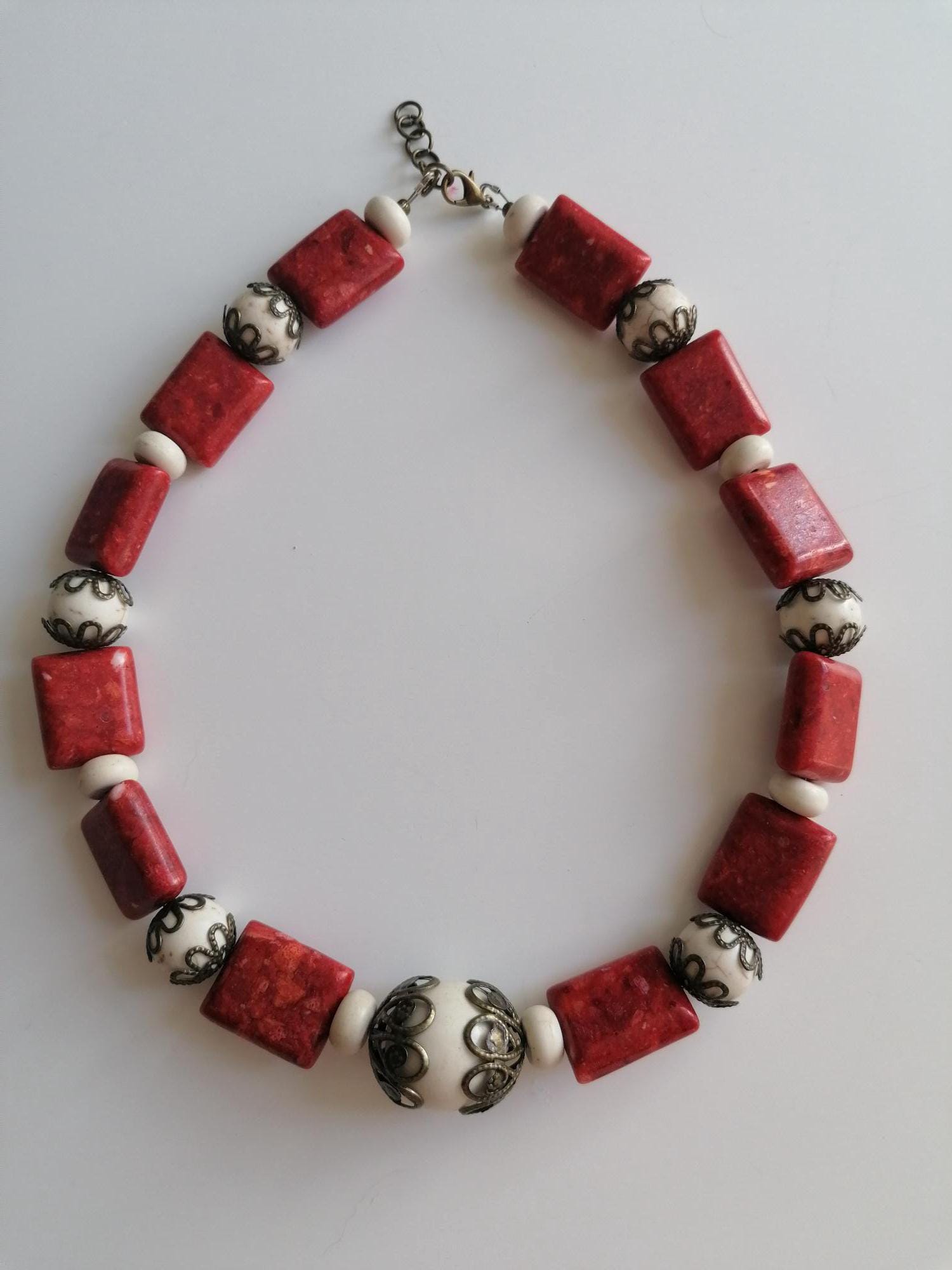 Handmade two-tone coral necklace. The necklace length is 45.5 cm plus an extension chain. The two-tone necklace is made from square-shaped coral beads in red (22 mm x 18 mm x 8 mm) and off-white chrysop beads (20 mm and 14 mm in diameter, 10 mm x 6 mm beads). The clasp, extension chain, and metal caps are bronze-colored.