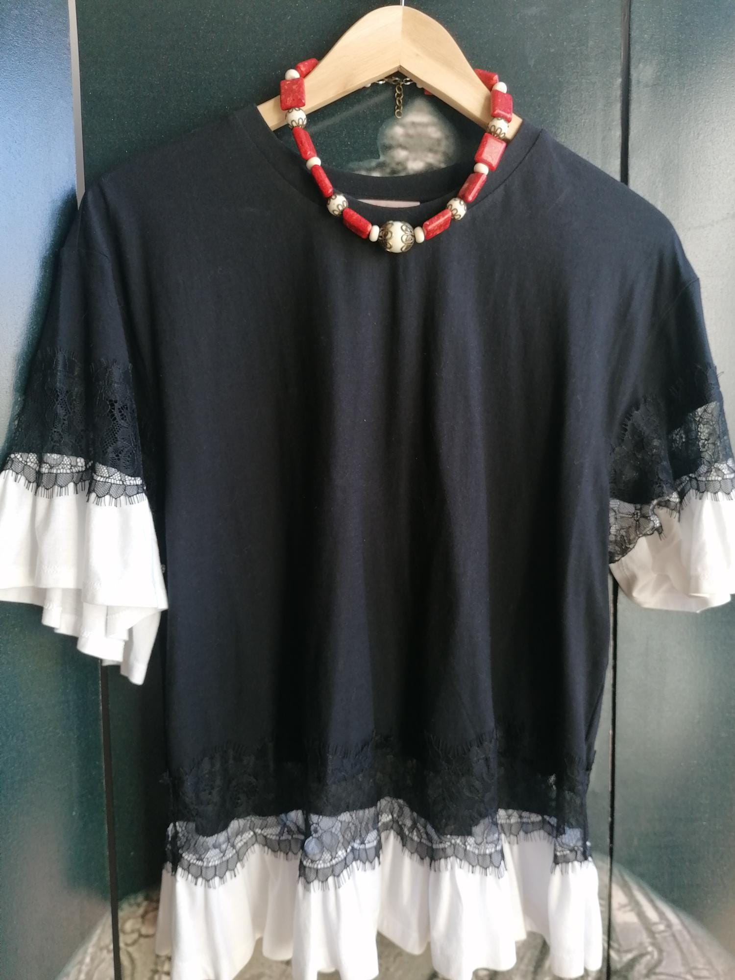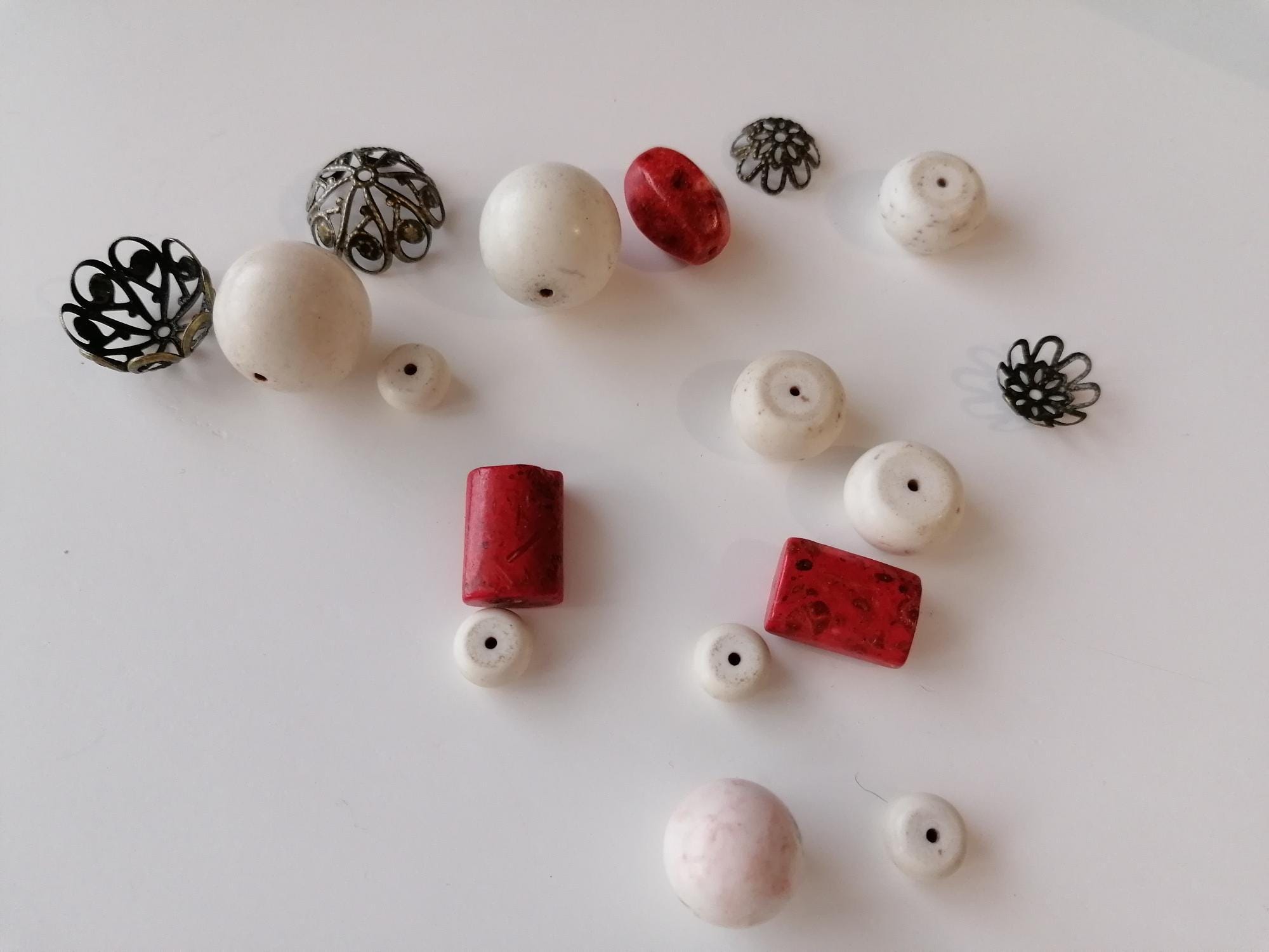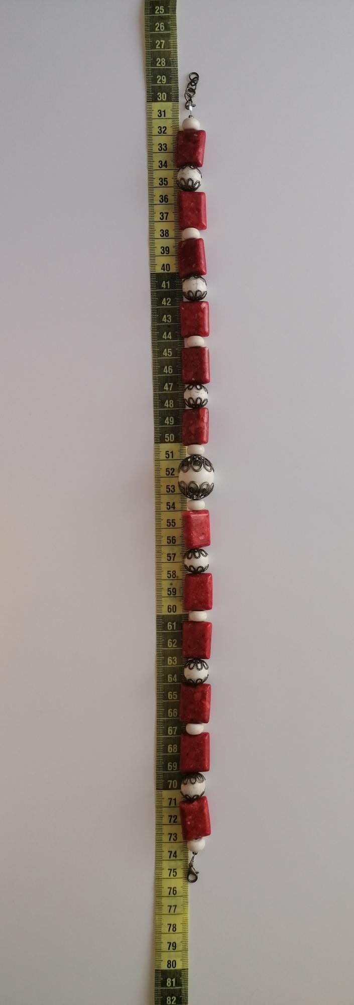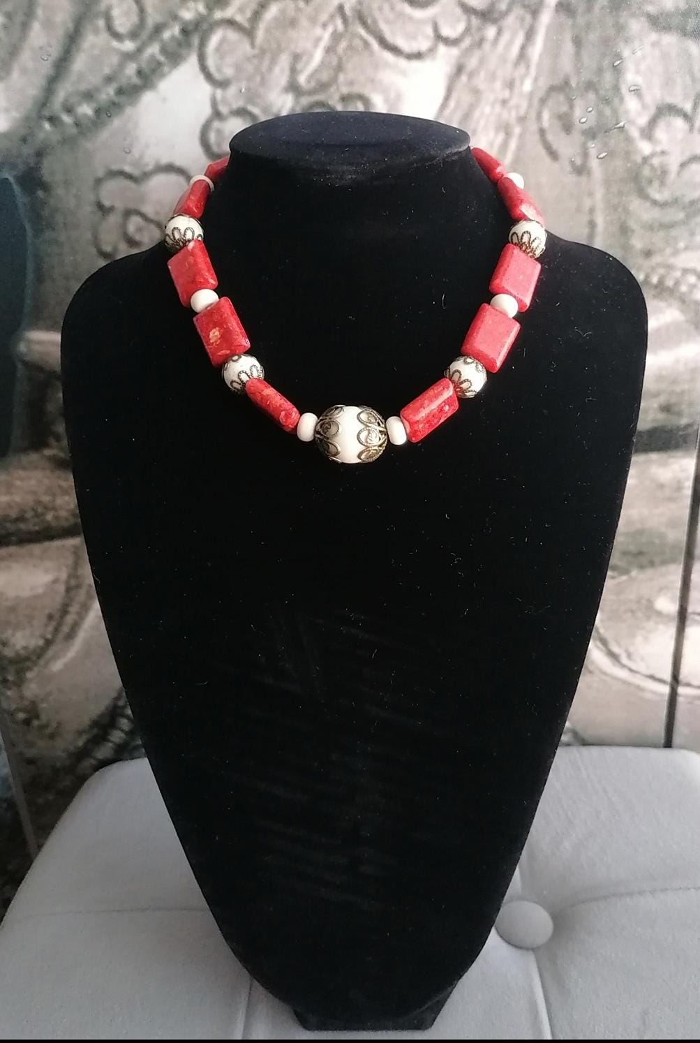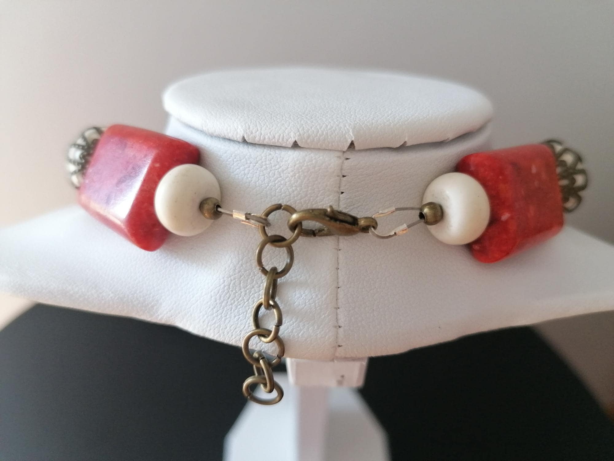 Handmade two-tone coral necklace. The necklace length is 45.5 cm plus an extension chain. The two-tone necklace is made from square-shaped coral beads in red (22 mm x 18 mm x 8 mm) and off-white chrysop beads (20 mm and 14 mm in diameter, 10 mm x 6 mm beads). The clasp, extension chain, and metal caps are bronze-colored.