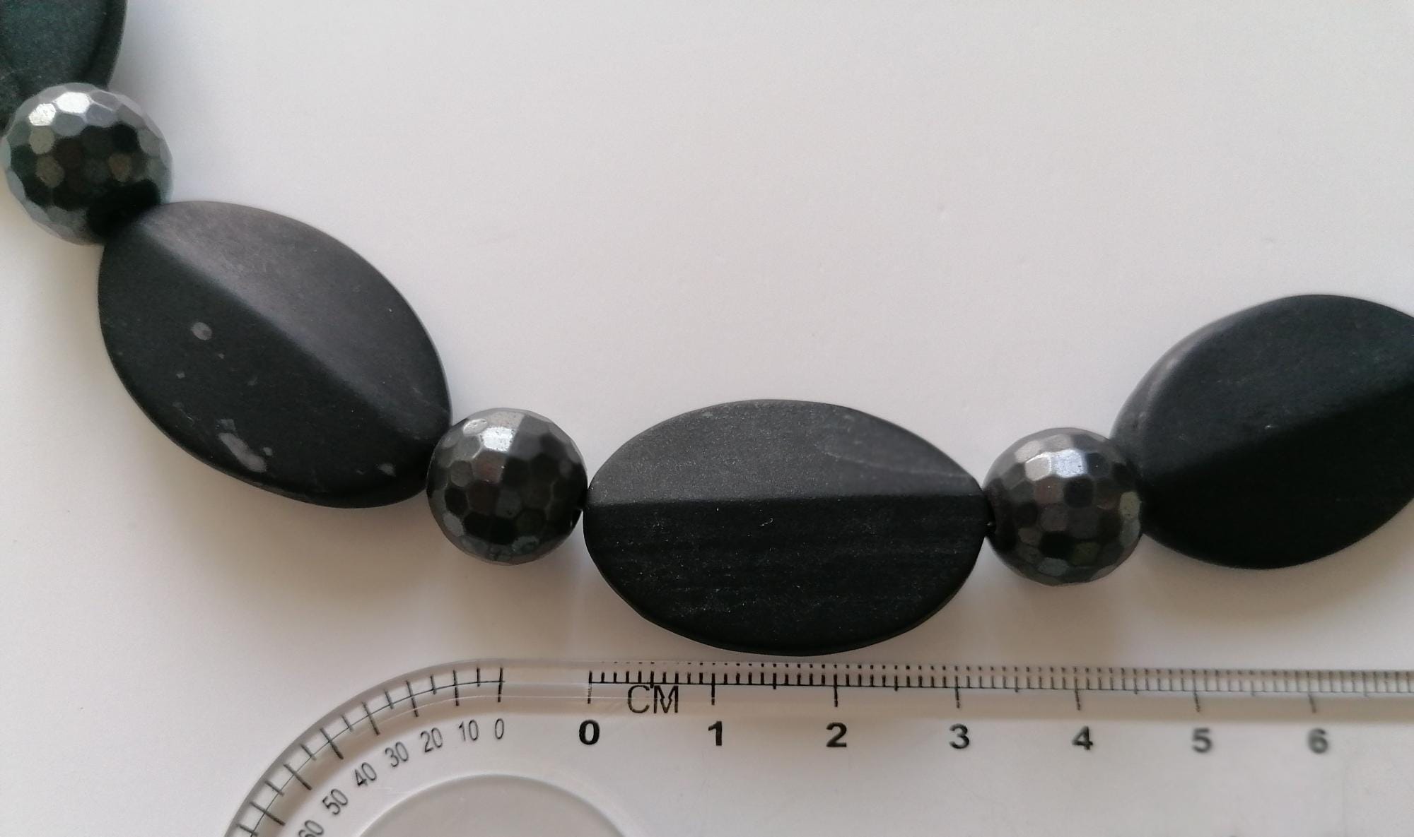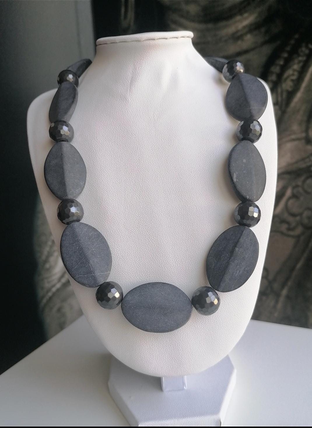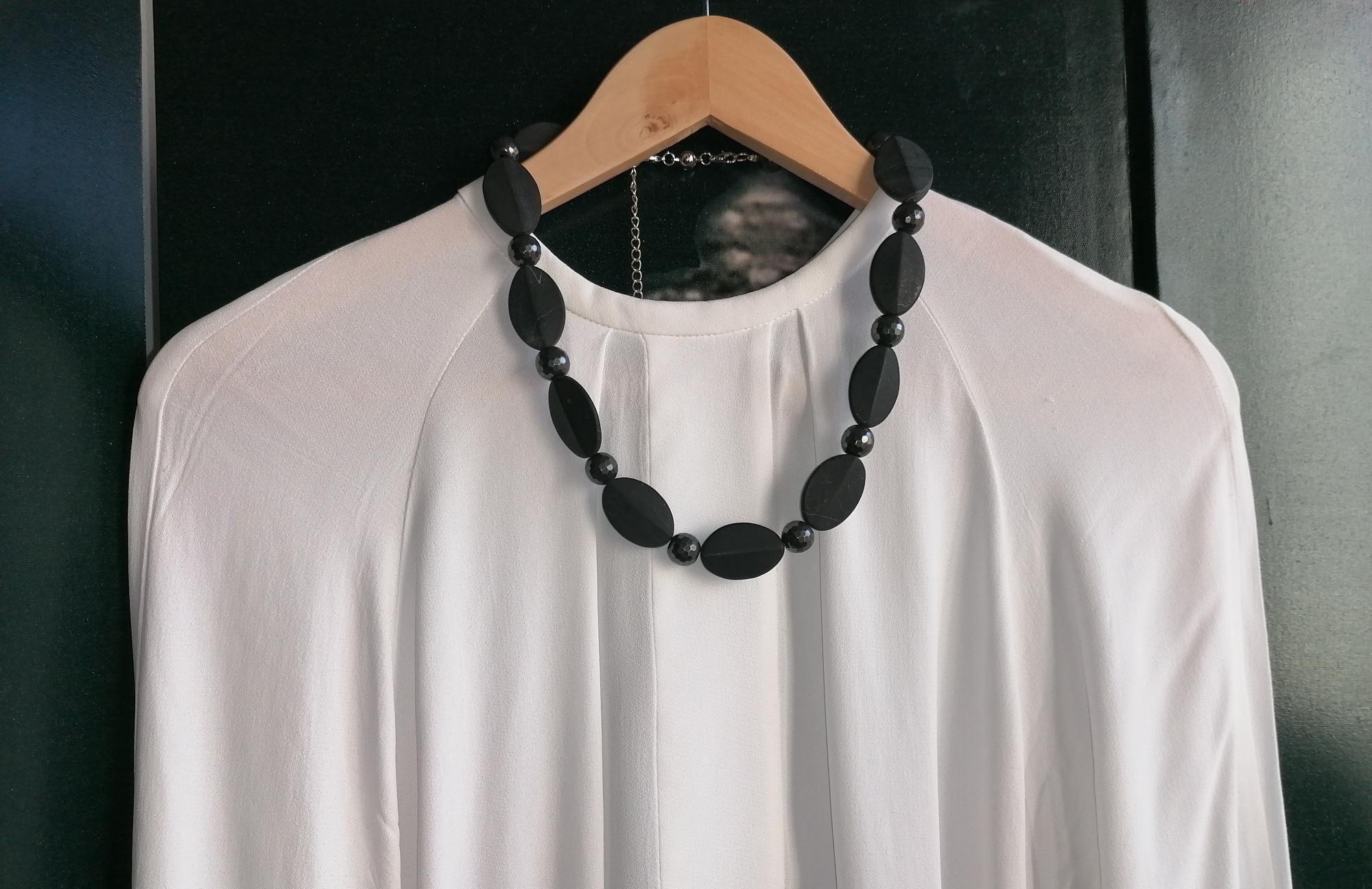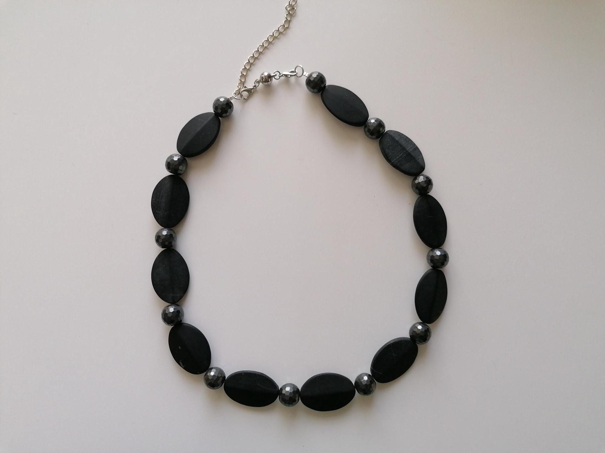 Handmade necklaces made of matte onyx. Two chain options available. The necklace is made of onyx and hematite in a monochrome design. The length of the black/anthracite chain is approximately 55 cm, plus a 7 cm extender. The necklace is made of matte 3D onyx beads (5 mm x 22 mm x 32 mm) and faceted hematite beads (12 mm). The magnetic clasp and the extender chain are silver.
