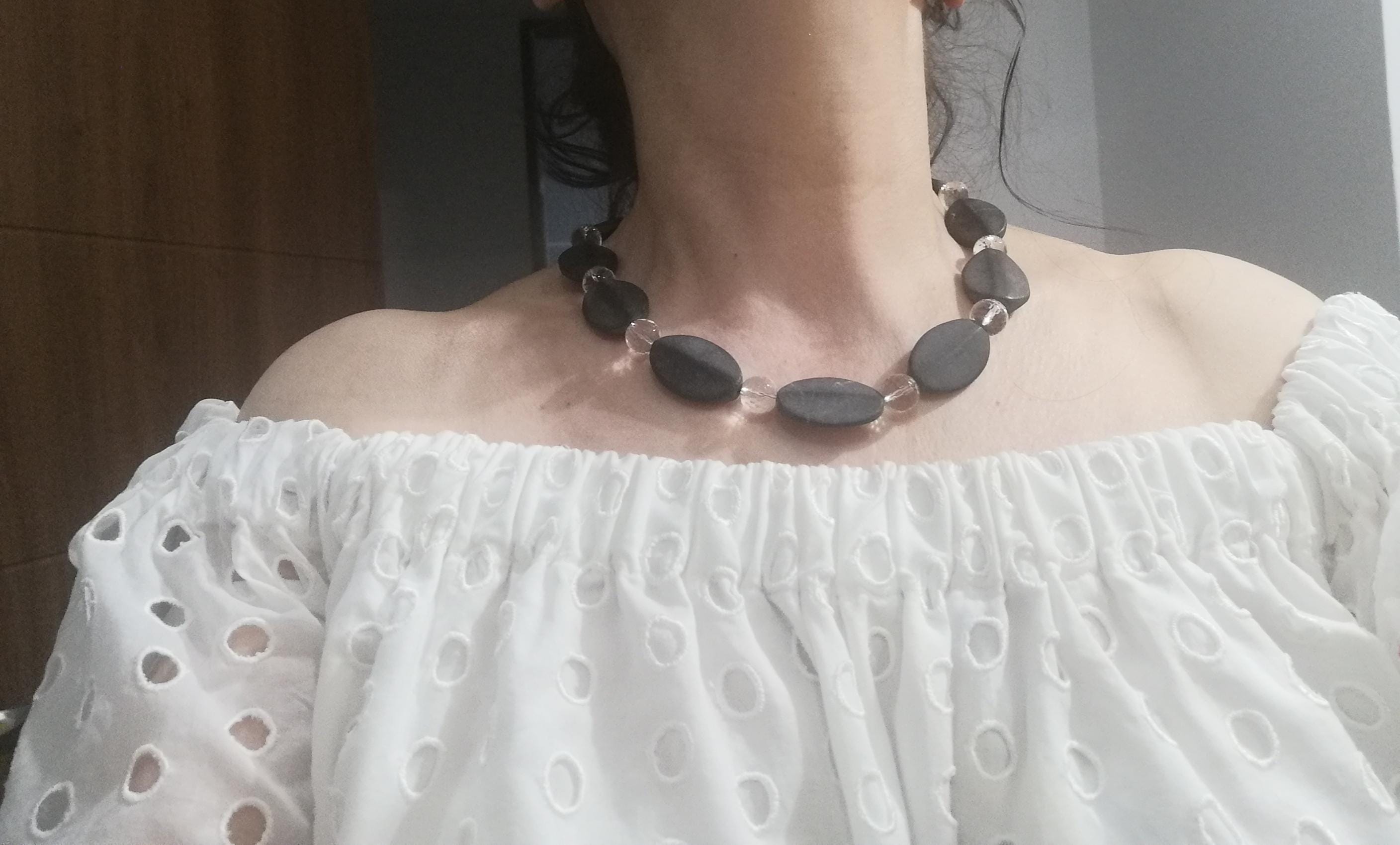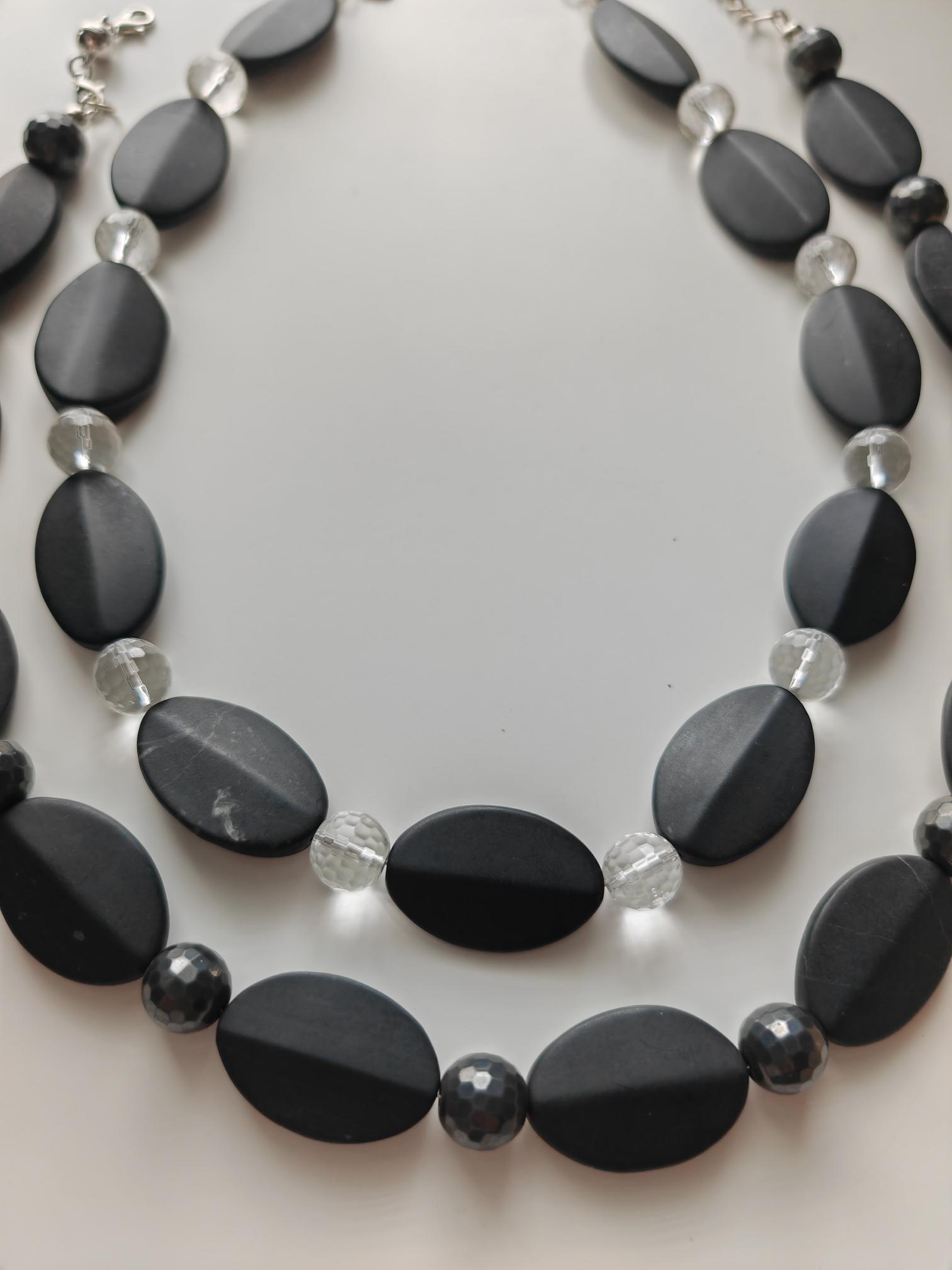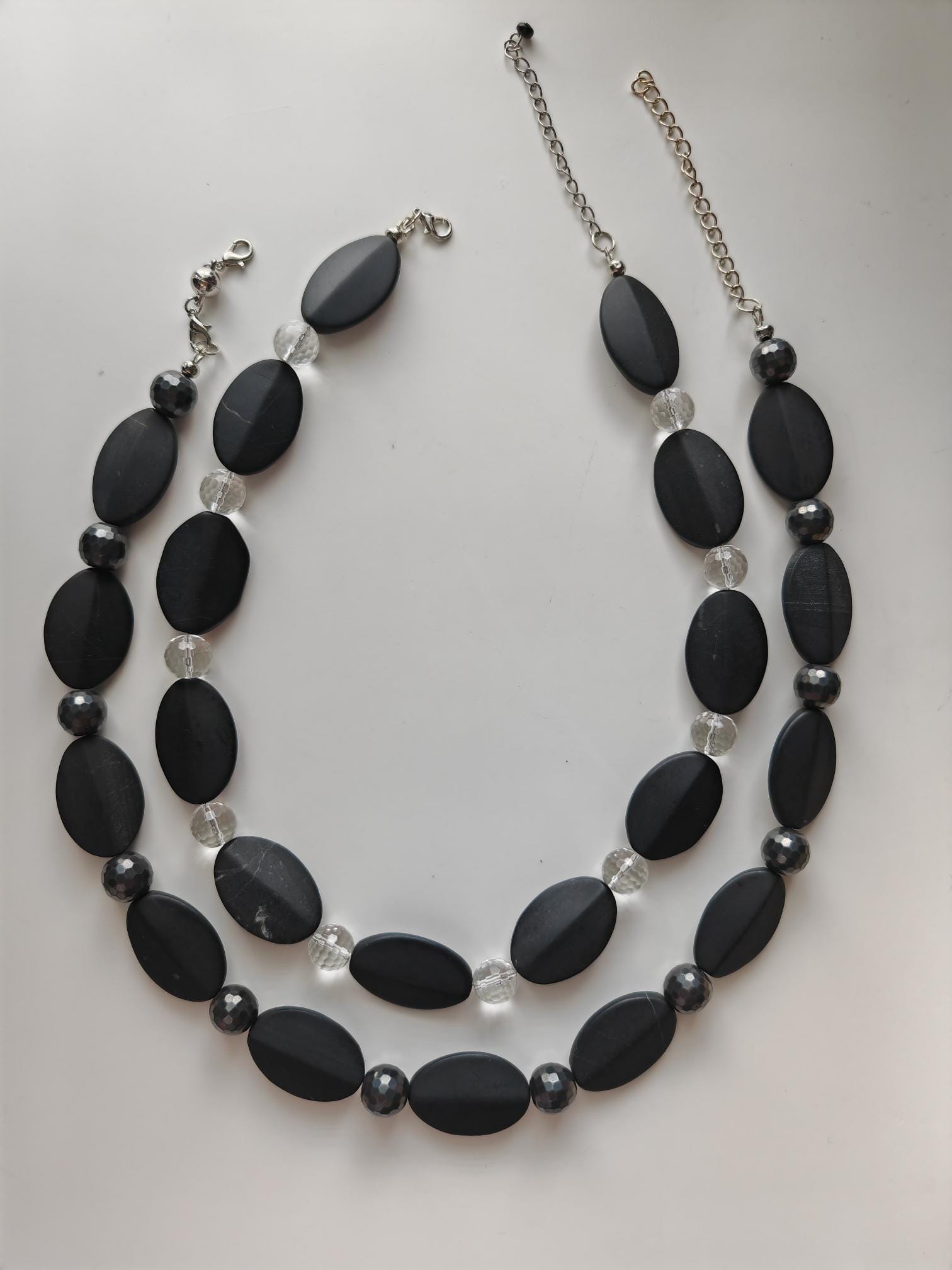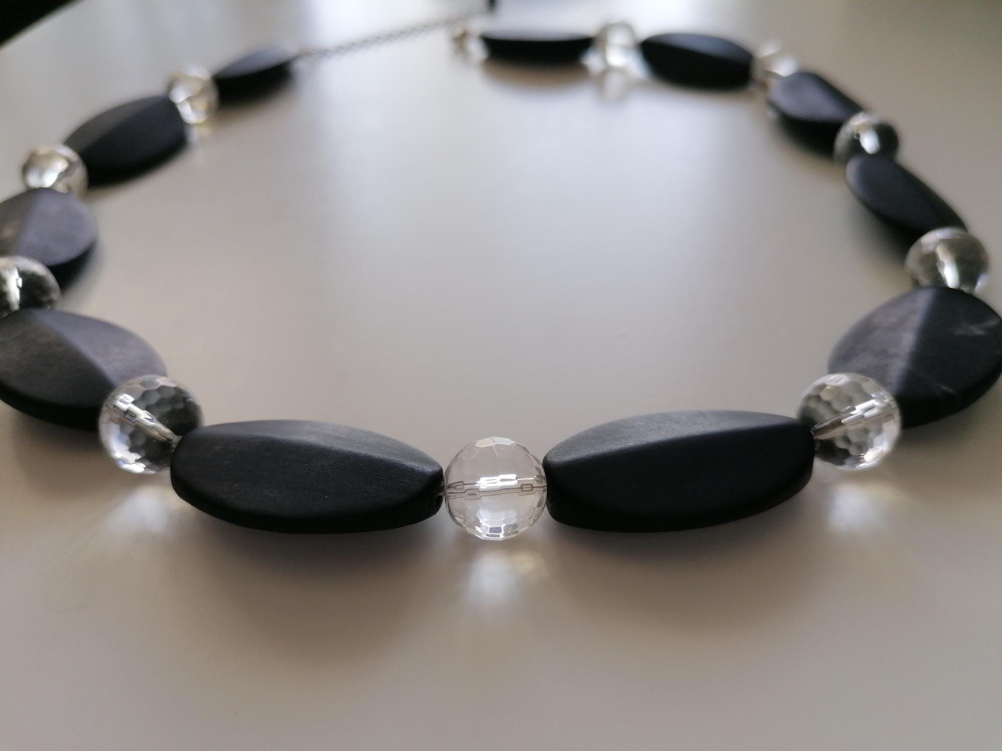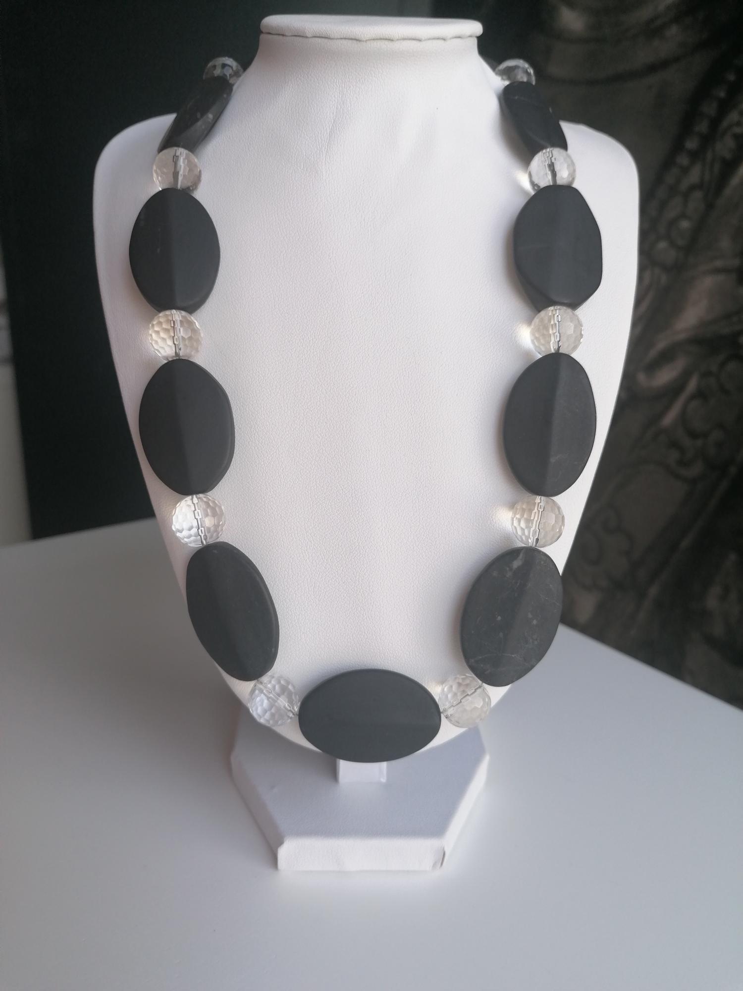The other handmade two-tone gemstone necklace is made of anthracite/black onyx and rock crystal. The necklace is approximately 50 cm long, plus a 65 mm extender. This elegant necklace is made of matte oval onyx beads (32 mm x 22 mm) and round, faceted rock crystal beads (12 mm). The extender and clasp are silver. A lovely gift!