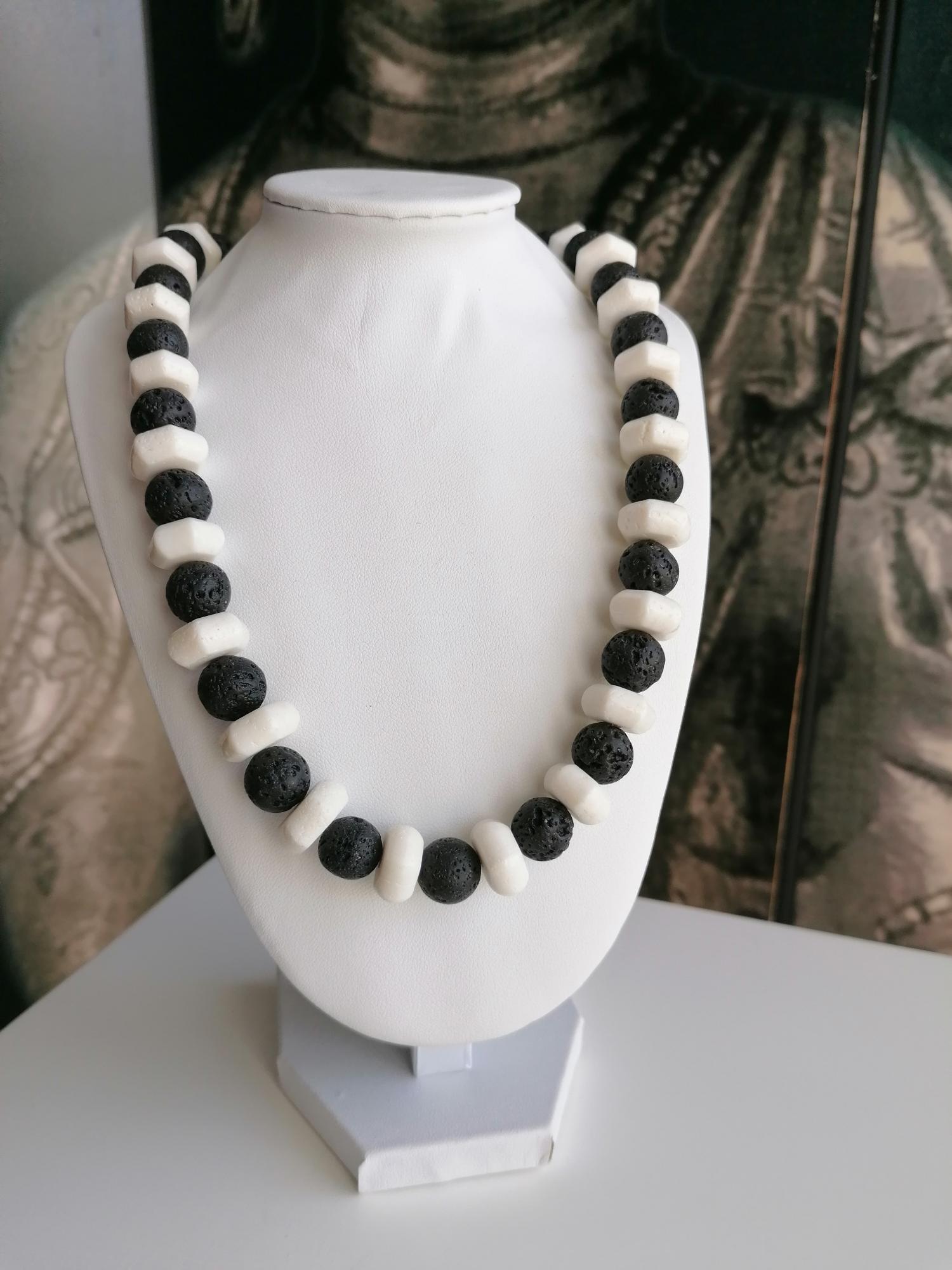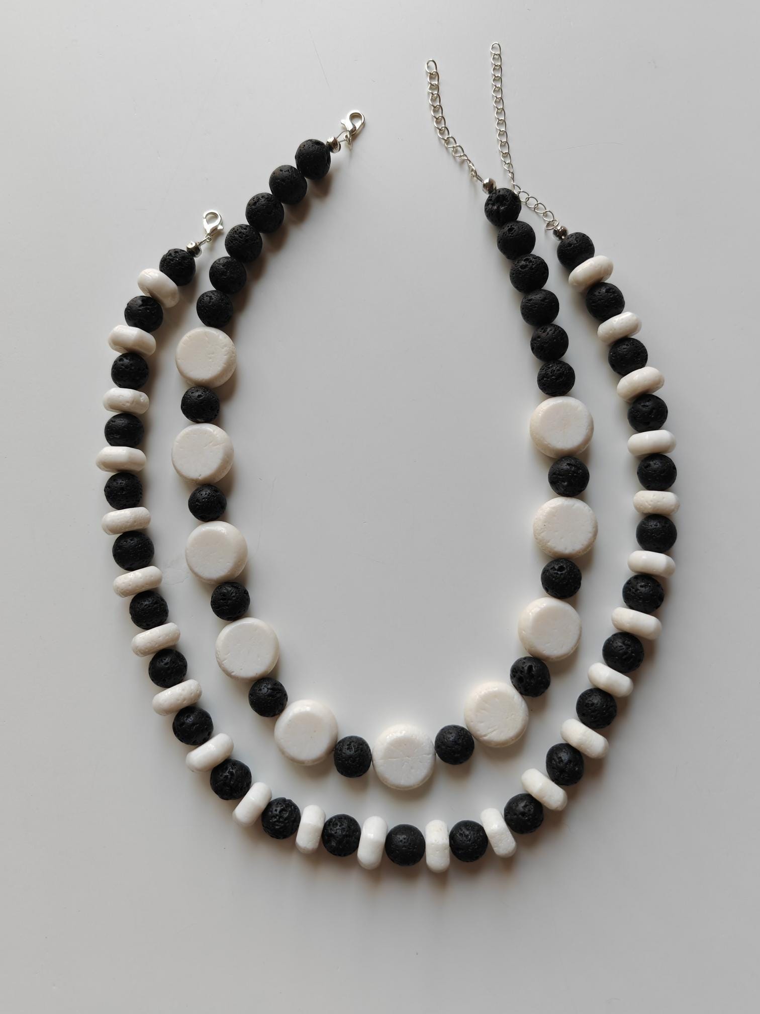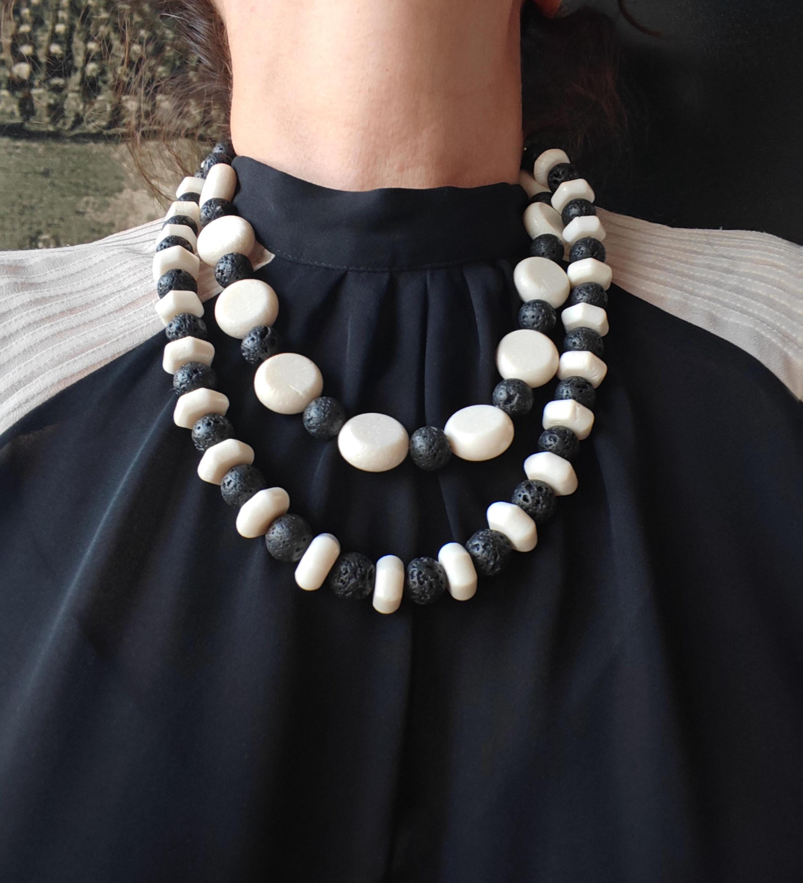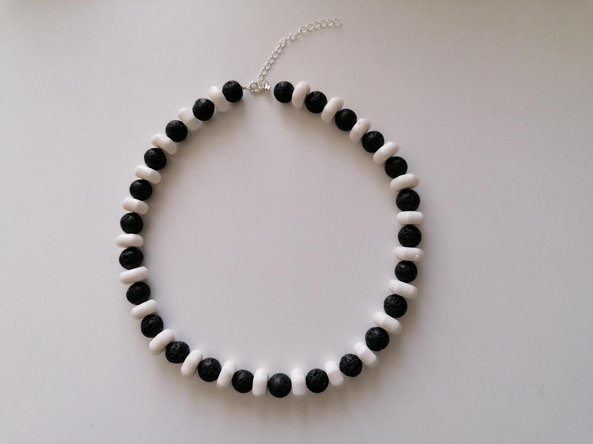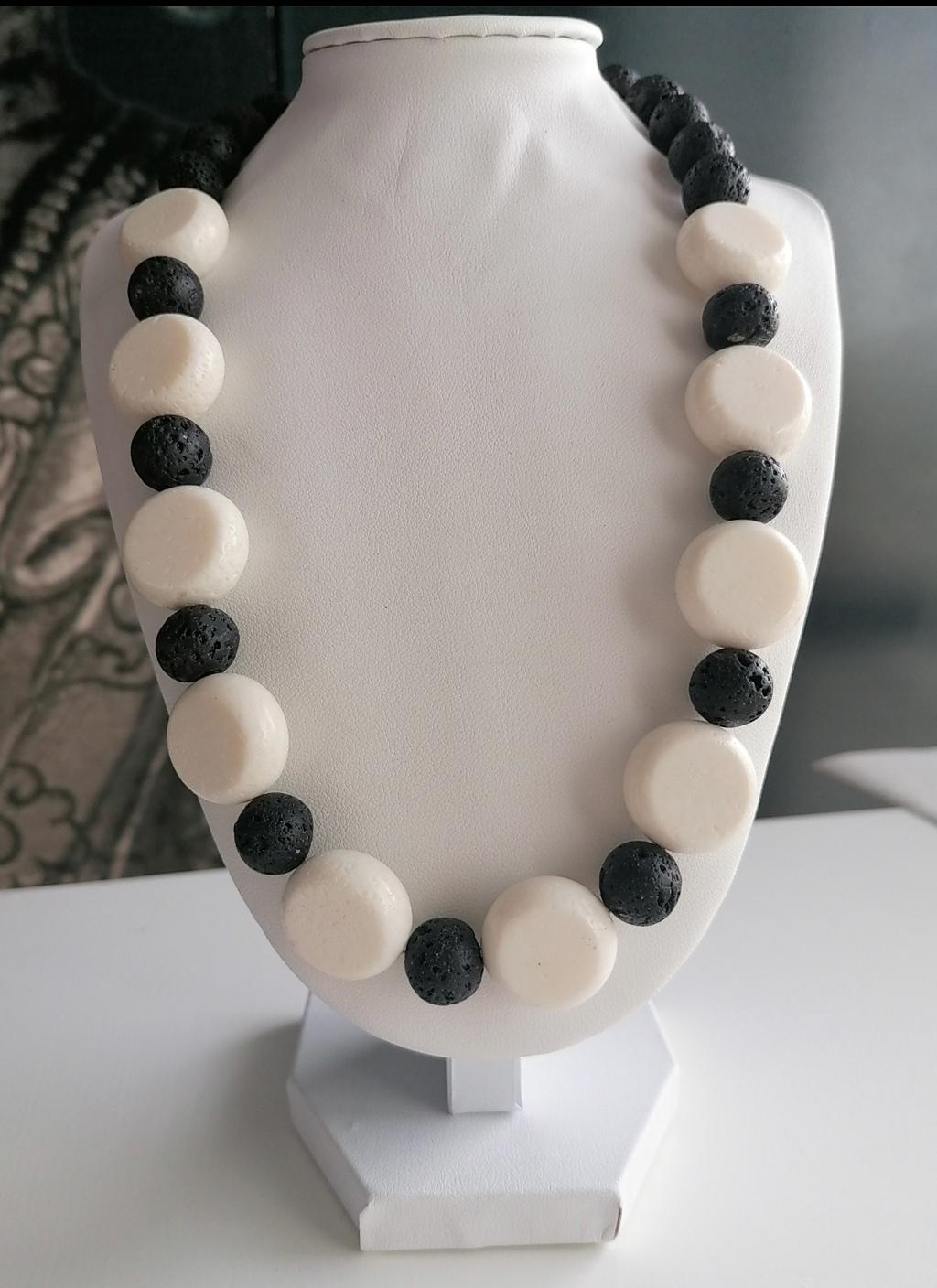 Handmade black and white necklaces made of coral and lava stone. Two chain options available.